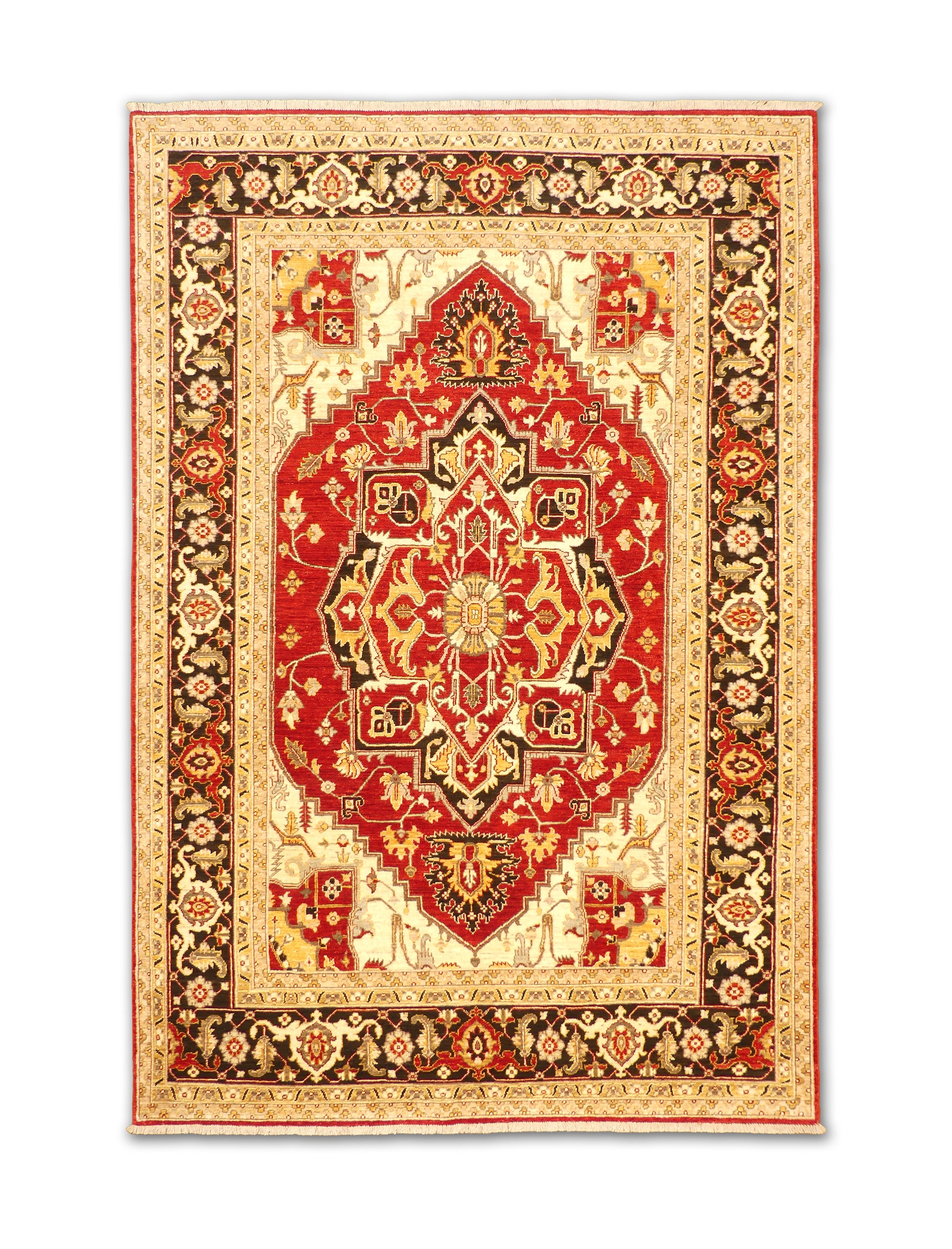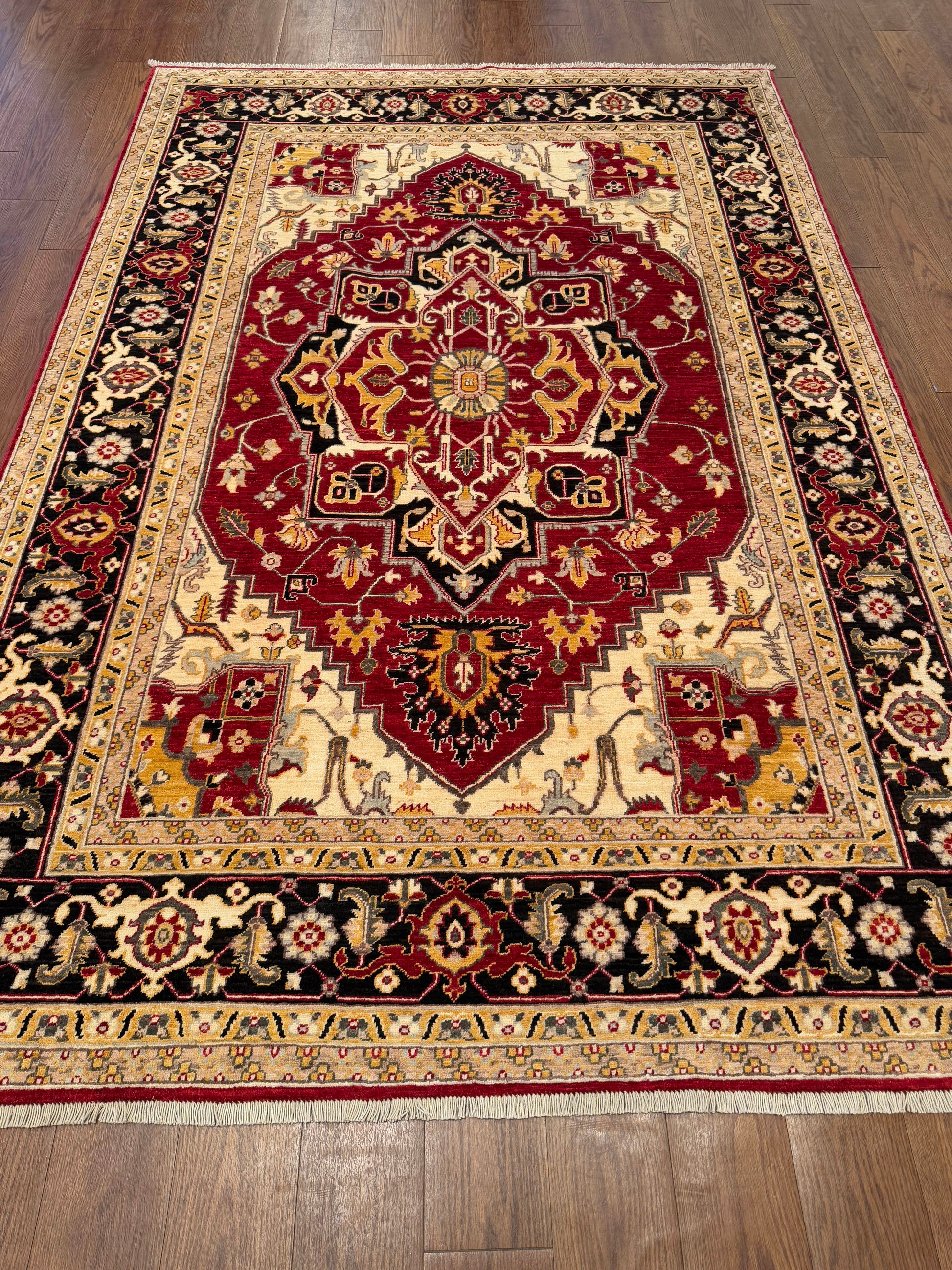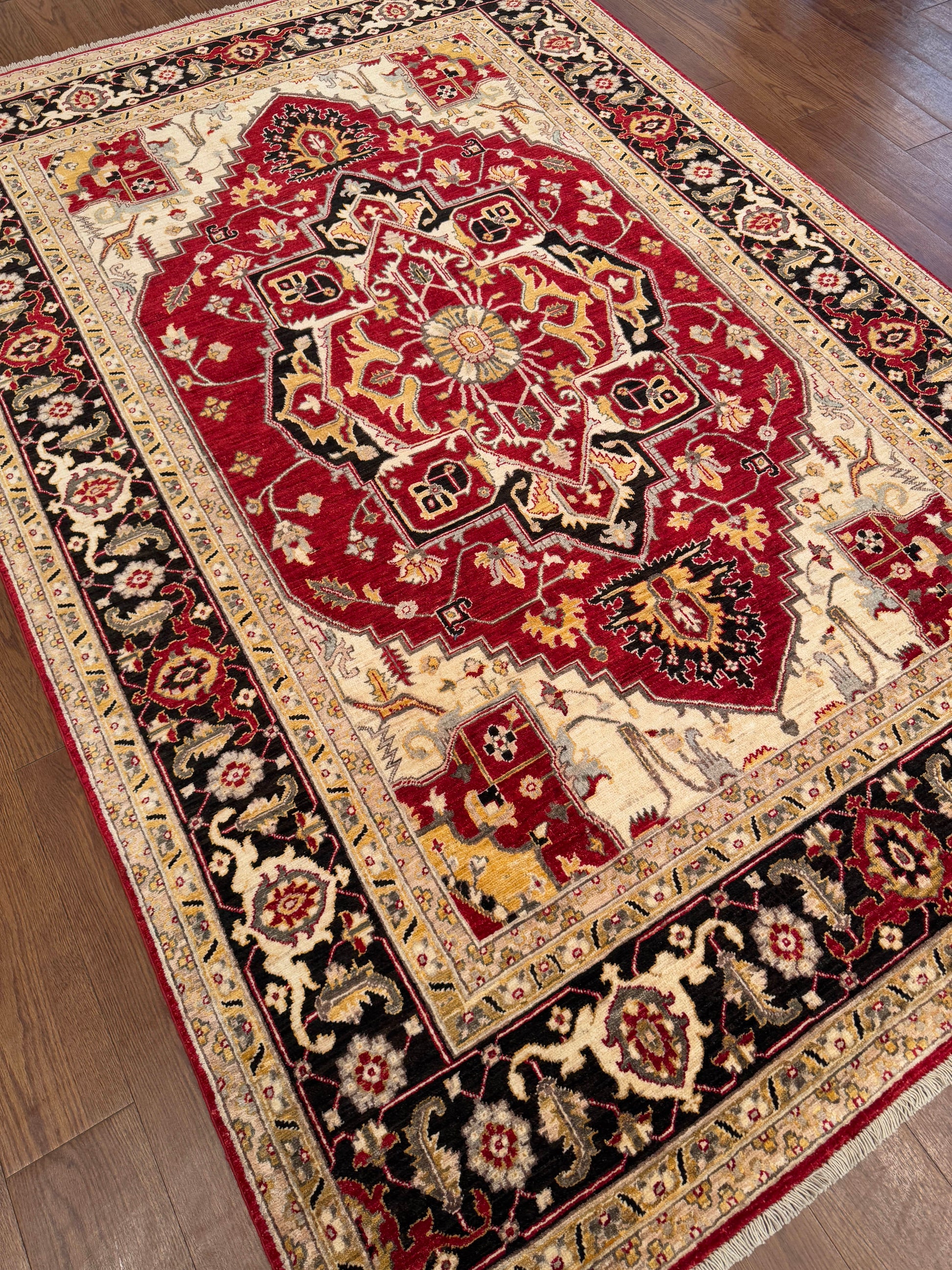 This striking handwoven wool rug showcases a bold use of color and traditional craftsmanship. The deep red field is anchored by an ornate central medallion, framed by intricate floral motifs and a contrasting ivory and black border. A timeless piece, it adds warmth and elegance to any interior.