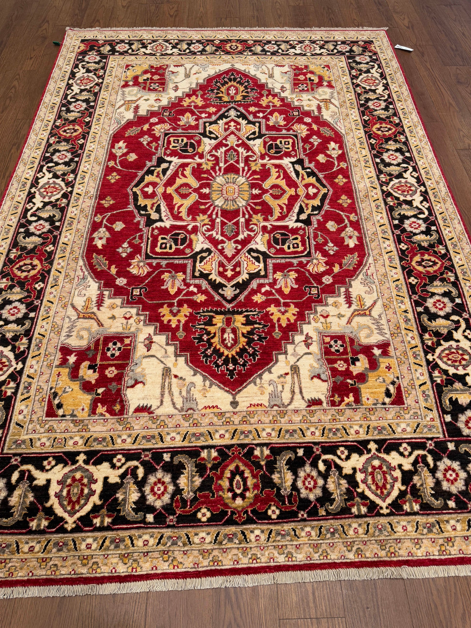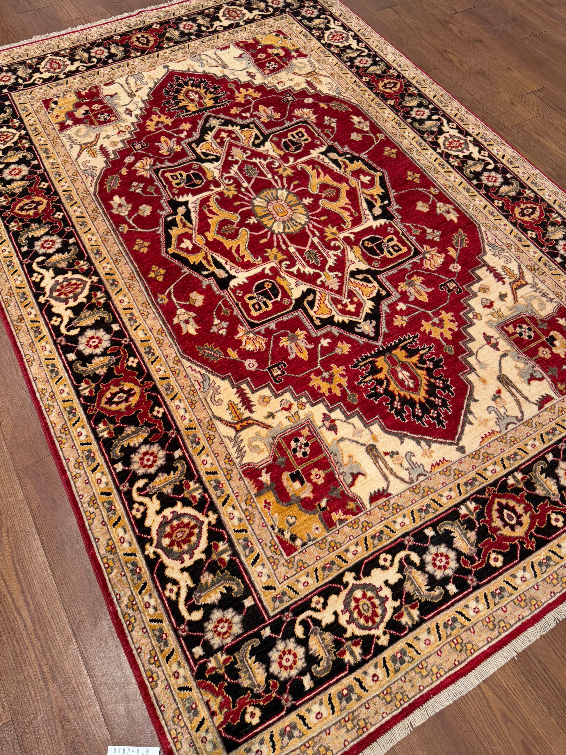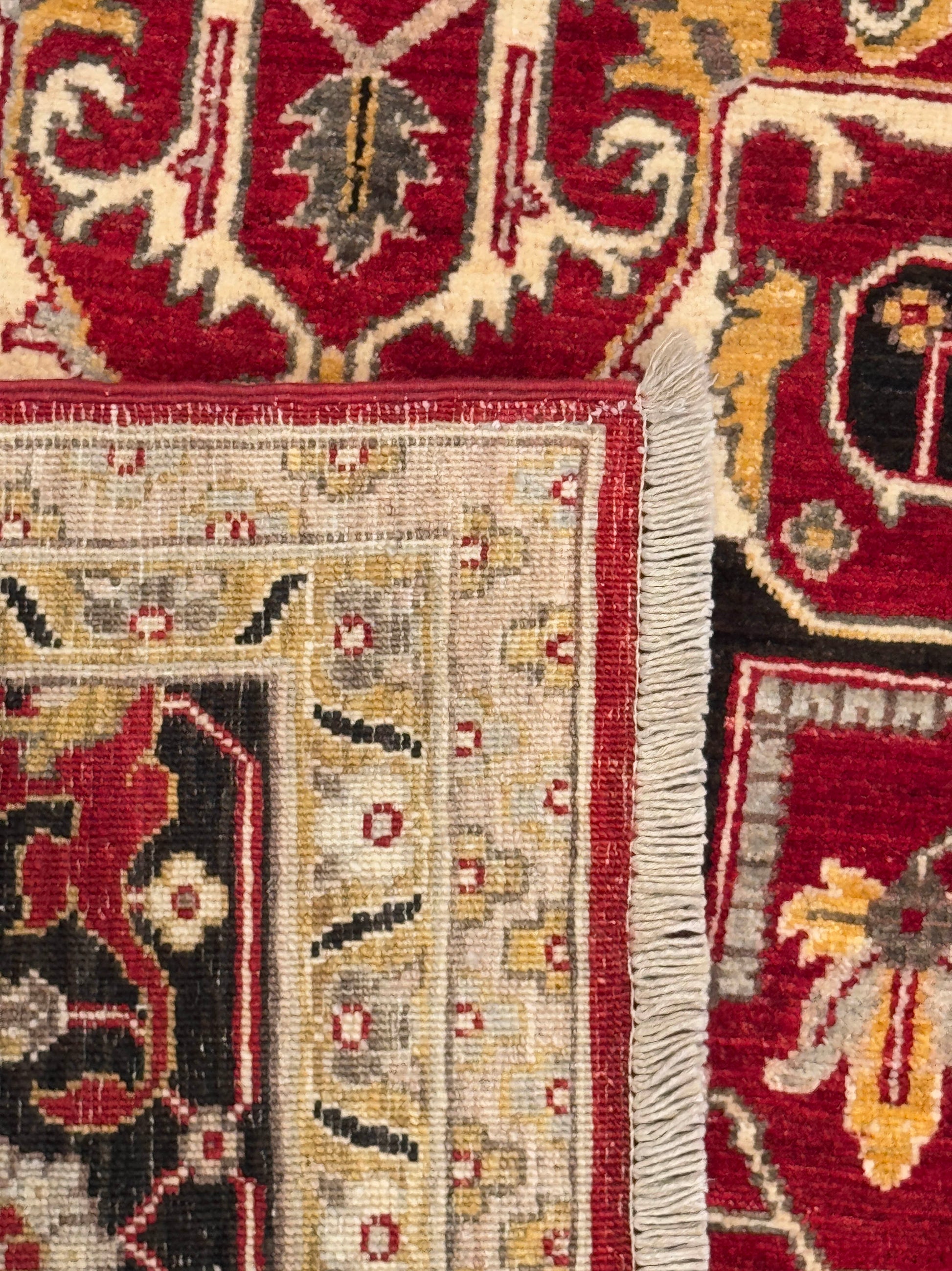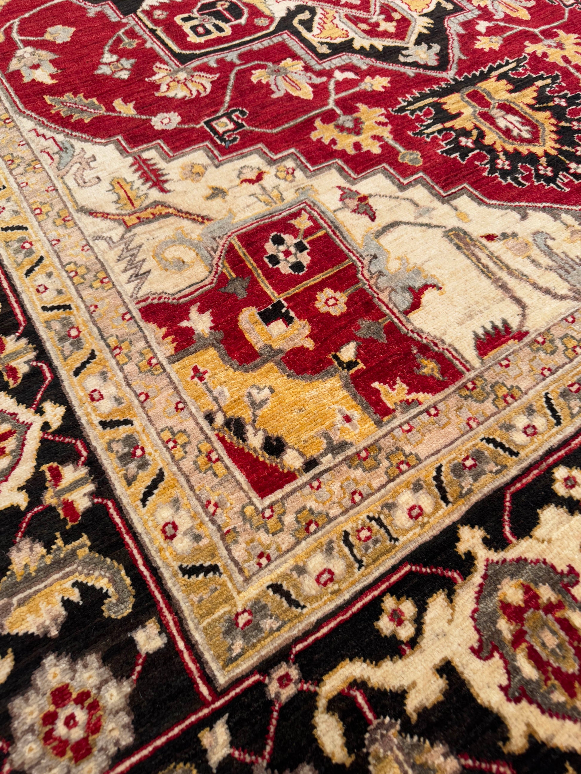 This striking handwoven wool rug showcases a bold use of color and traditional craftsmanship. The deep red field is anchored by an ornate central medallion, framed by intricate floral motifs and a contrasting ivory and black border. A timeless piece, it adds warmth and elegance to any interior.
