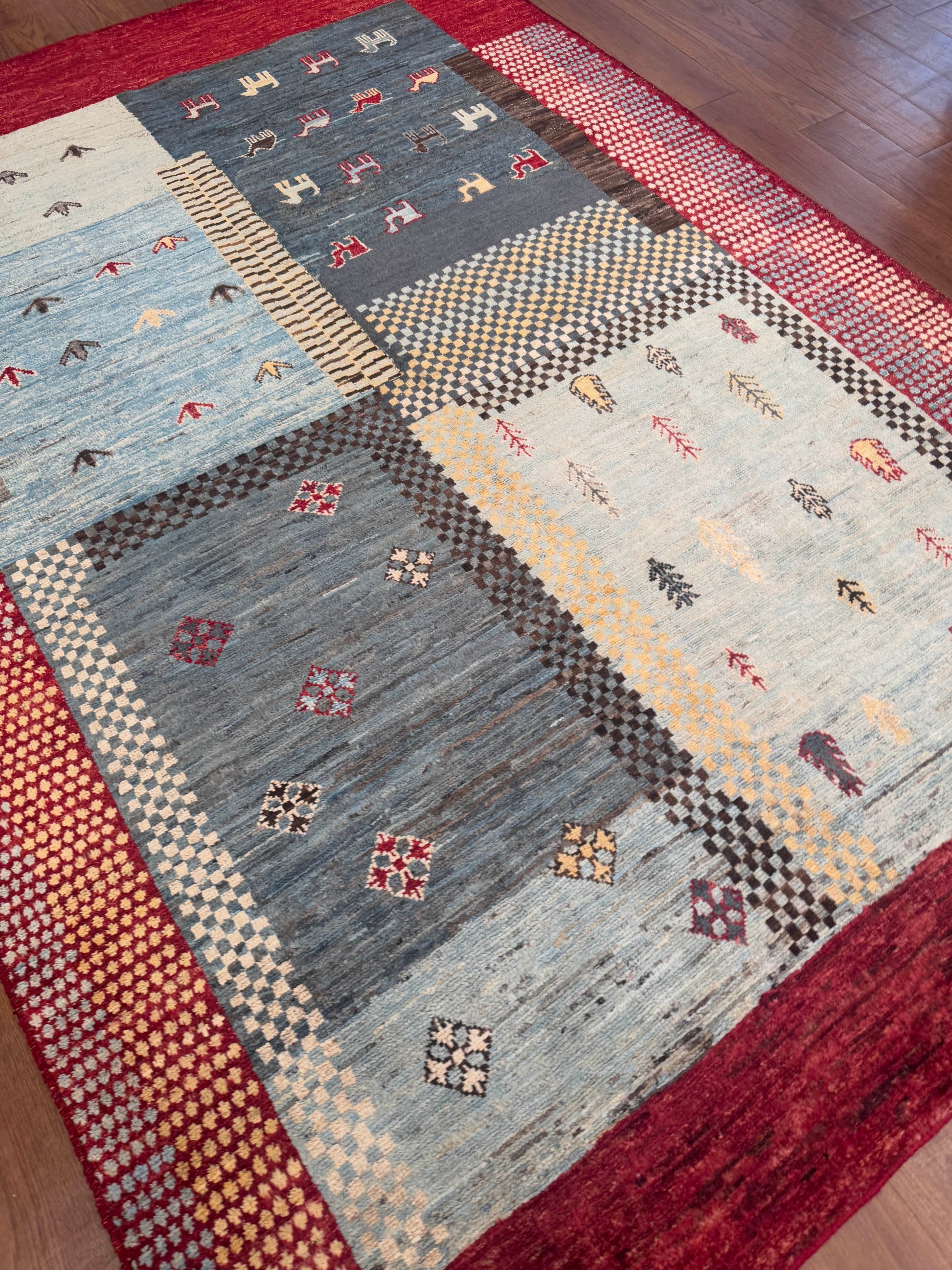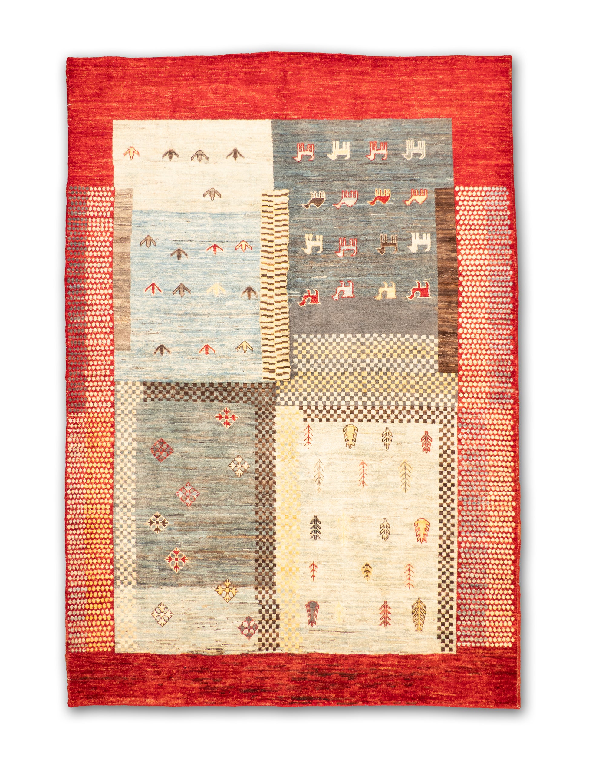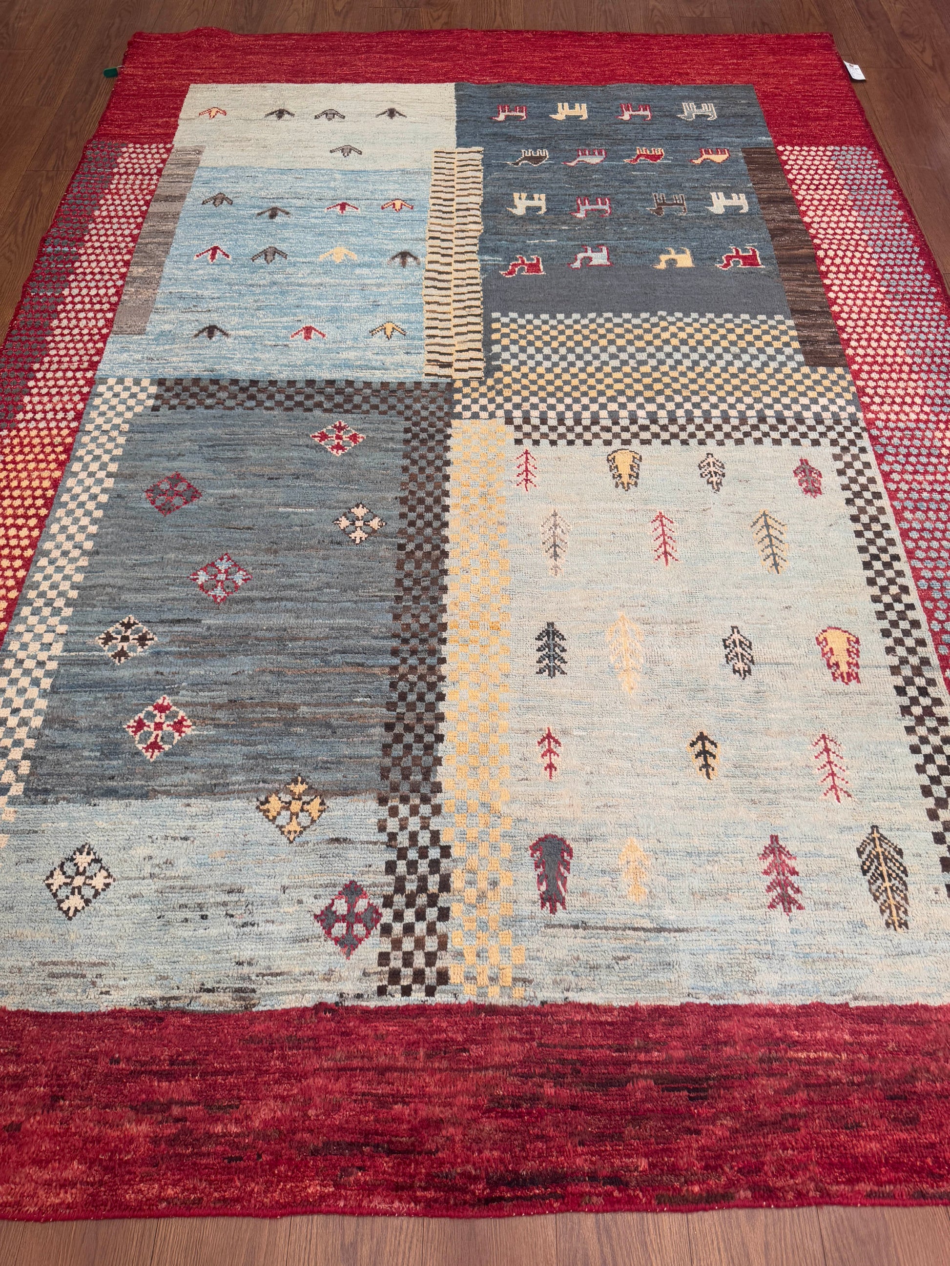This handwoven wool rug showcases a playful patchwork of geometric and symbolic motifs, blending tradition with modern creativity. Its sections of soft blues, ivory, and gray are framed by a bold red border, with accents of gold, brown, and black adding depth. With its mix of checkered patterns, small medallions, and stylized tree and animal forms, this rug offers a distinctive, eclectic charm.