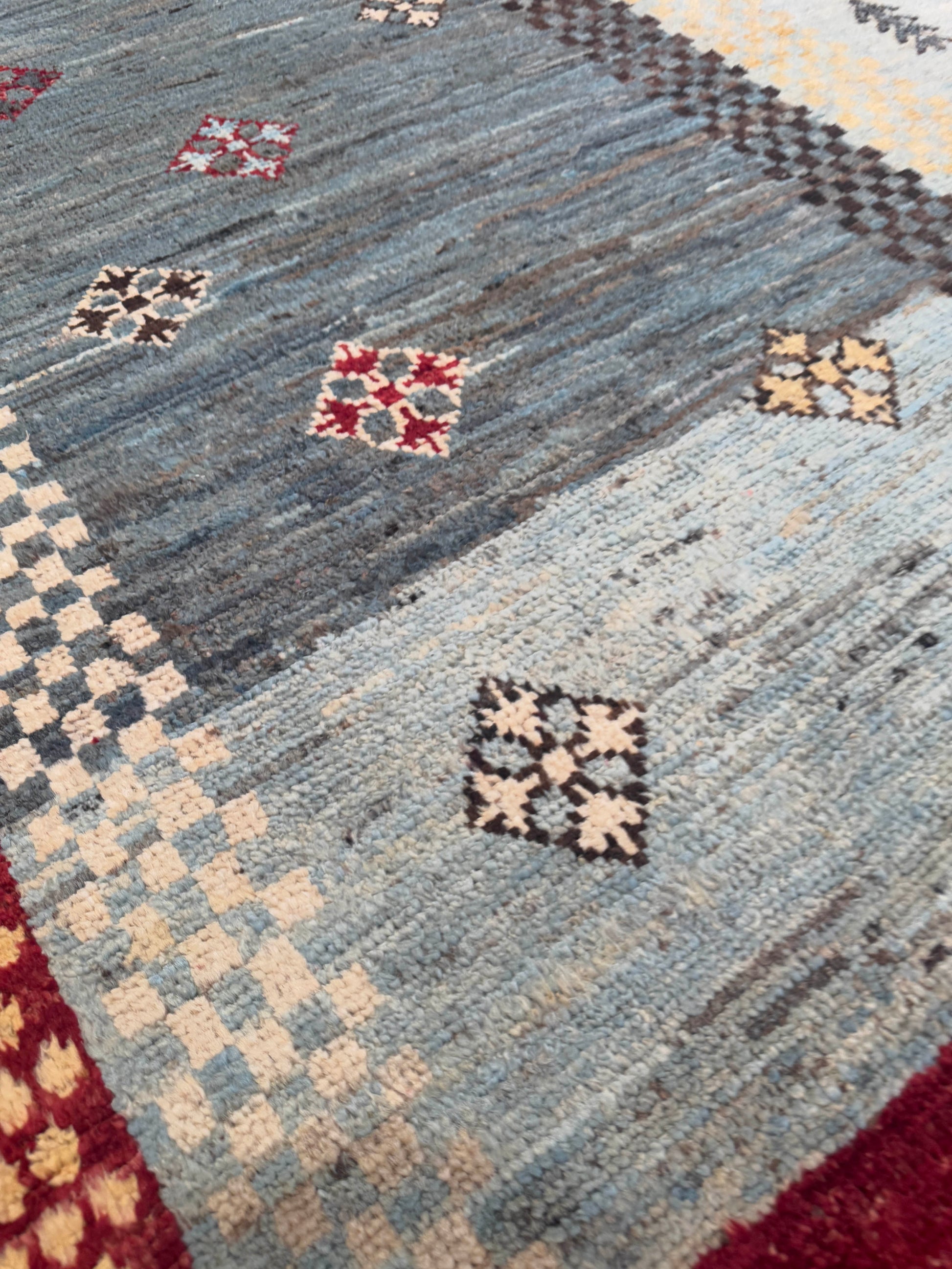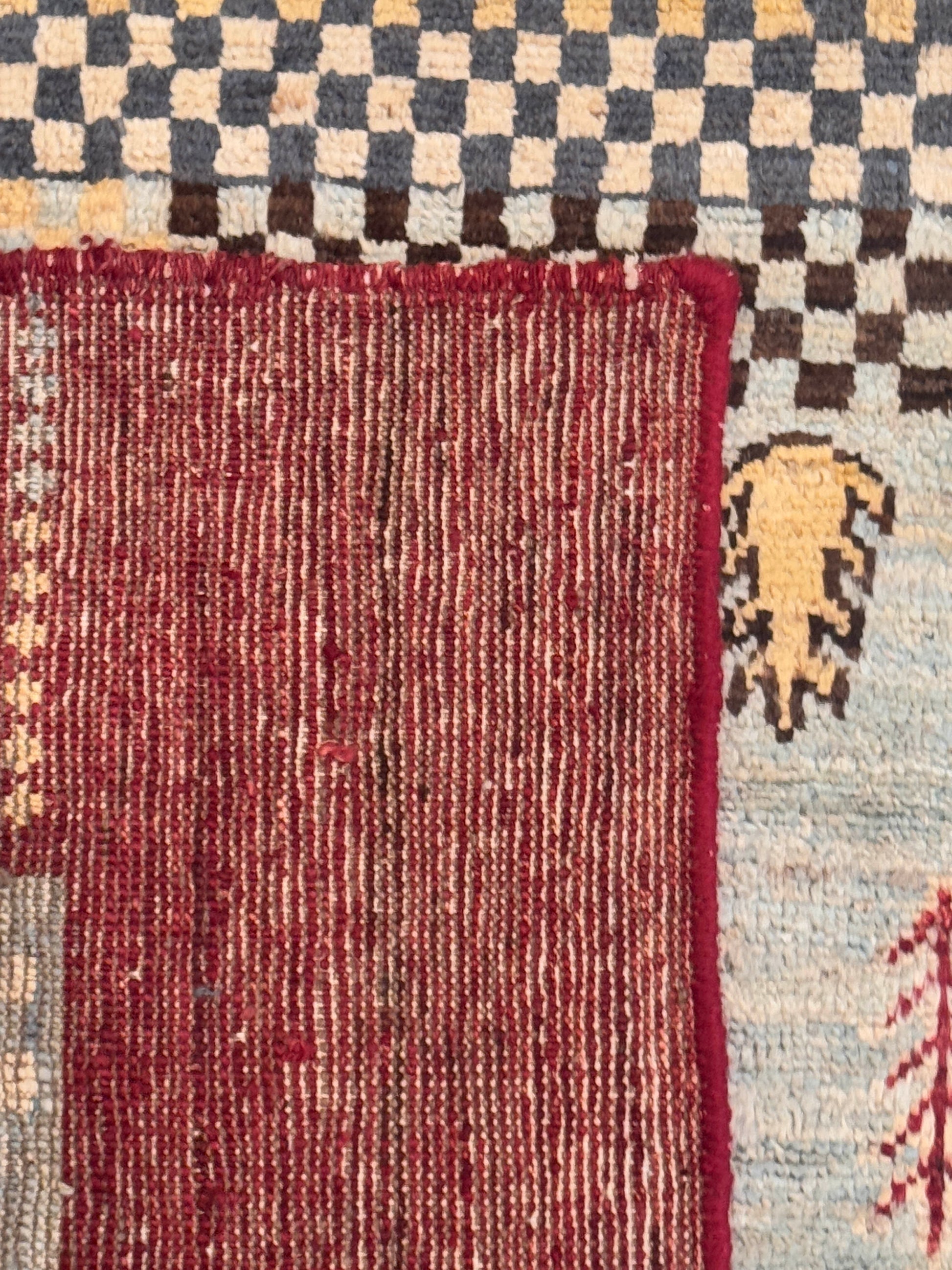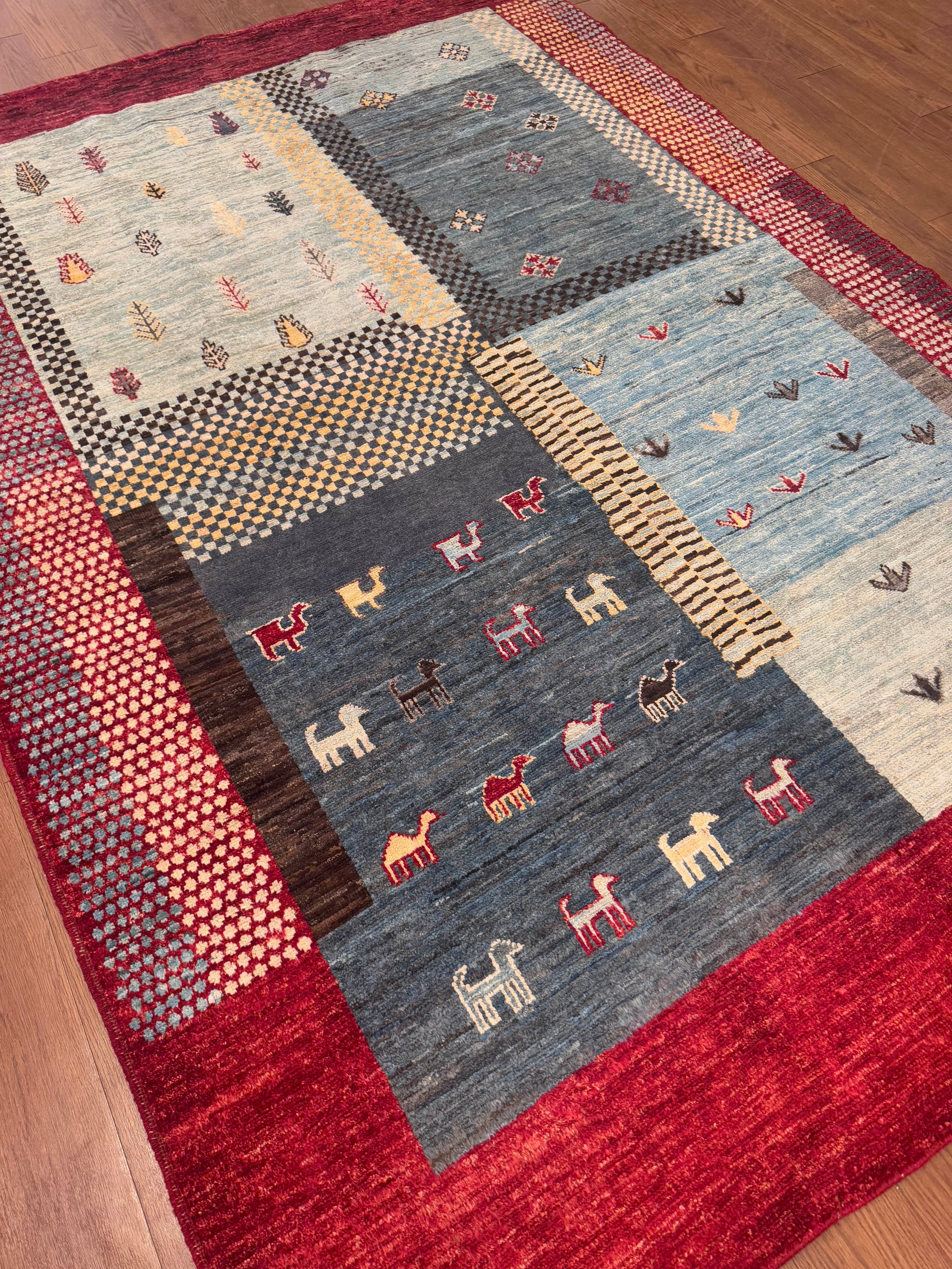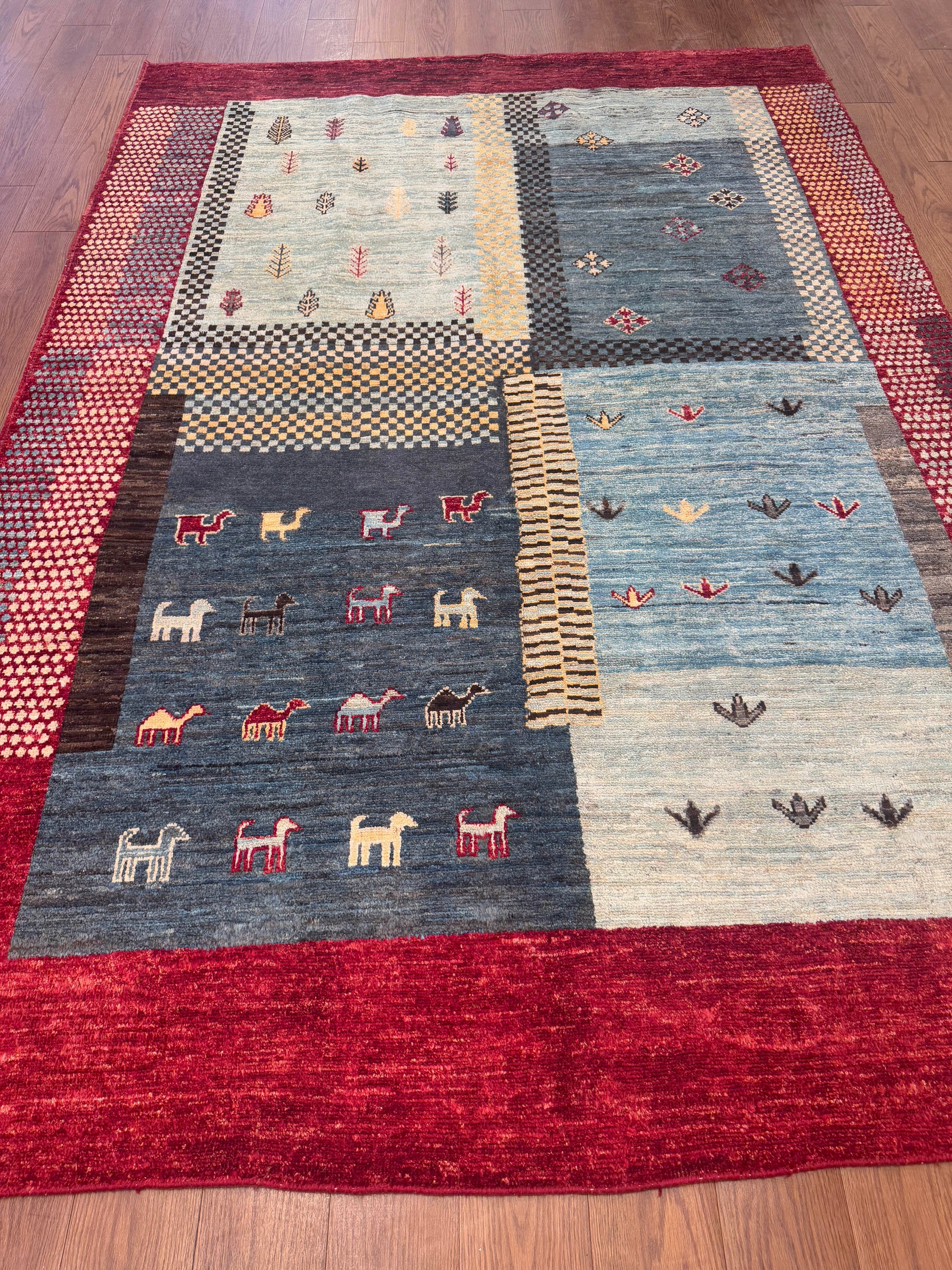 This handwoven wool rug showcases a playful patchwork of geometric and symbolic motifs, blending tradition with modern creativity. Its sections of soft blues, ivory, and gray are framed by a bold red border, with accents of gold, brown, and black adding depth. With its mix of checkered patterns, small medallions, and stylized tree and animal forms, this rug offers a distinctive, eclectic charm.