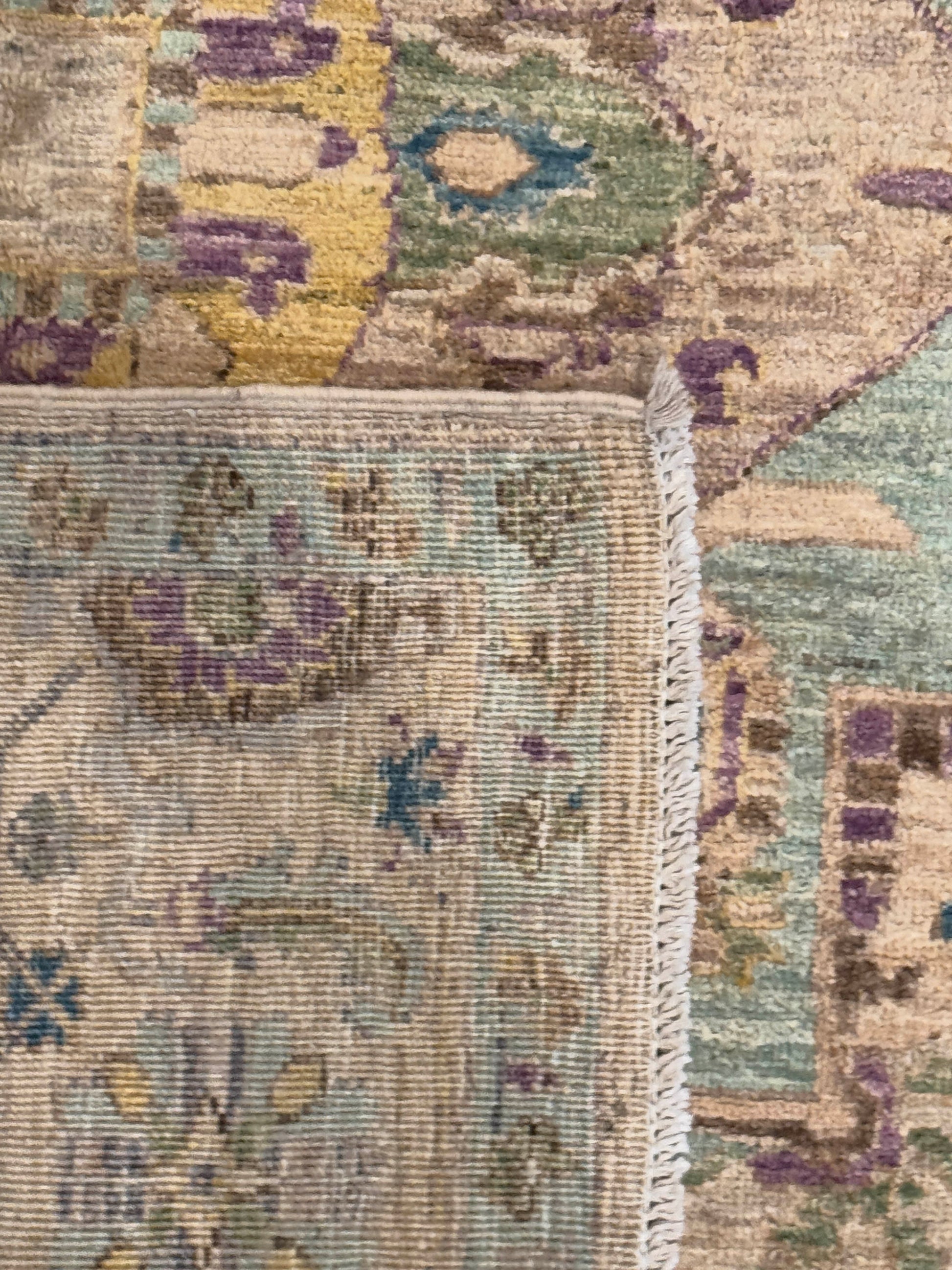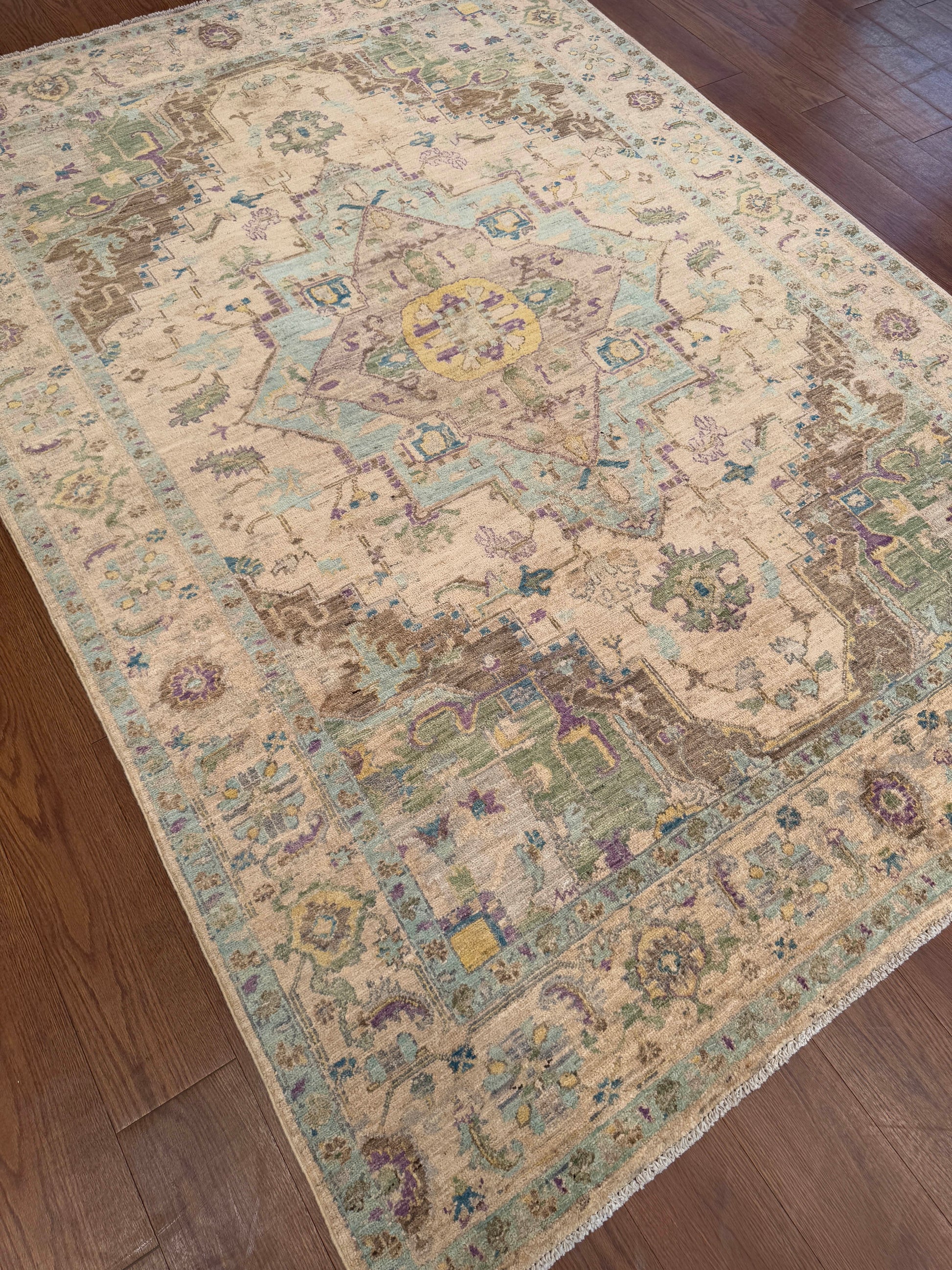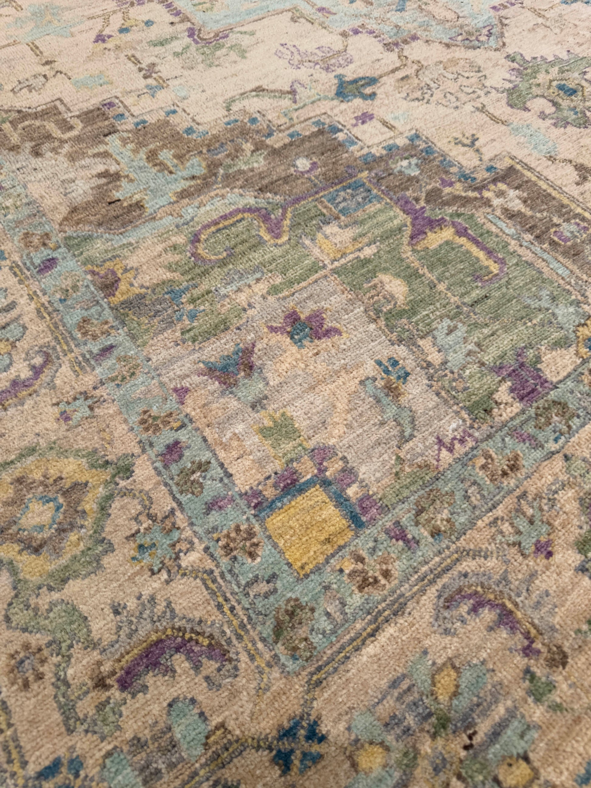 This elegant hand-knotted rug features a soft, faded medallion design framed by an ornate floral border. Woven in muted shades of beige, sage green, aqua, lavender, and hints of gold, the rug exudes an antique-inspired charm. Its distressed finish enhances the timeless character, making it a versatile piece for both classic and transitional interiors.