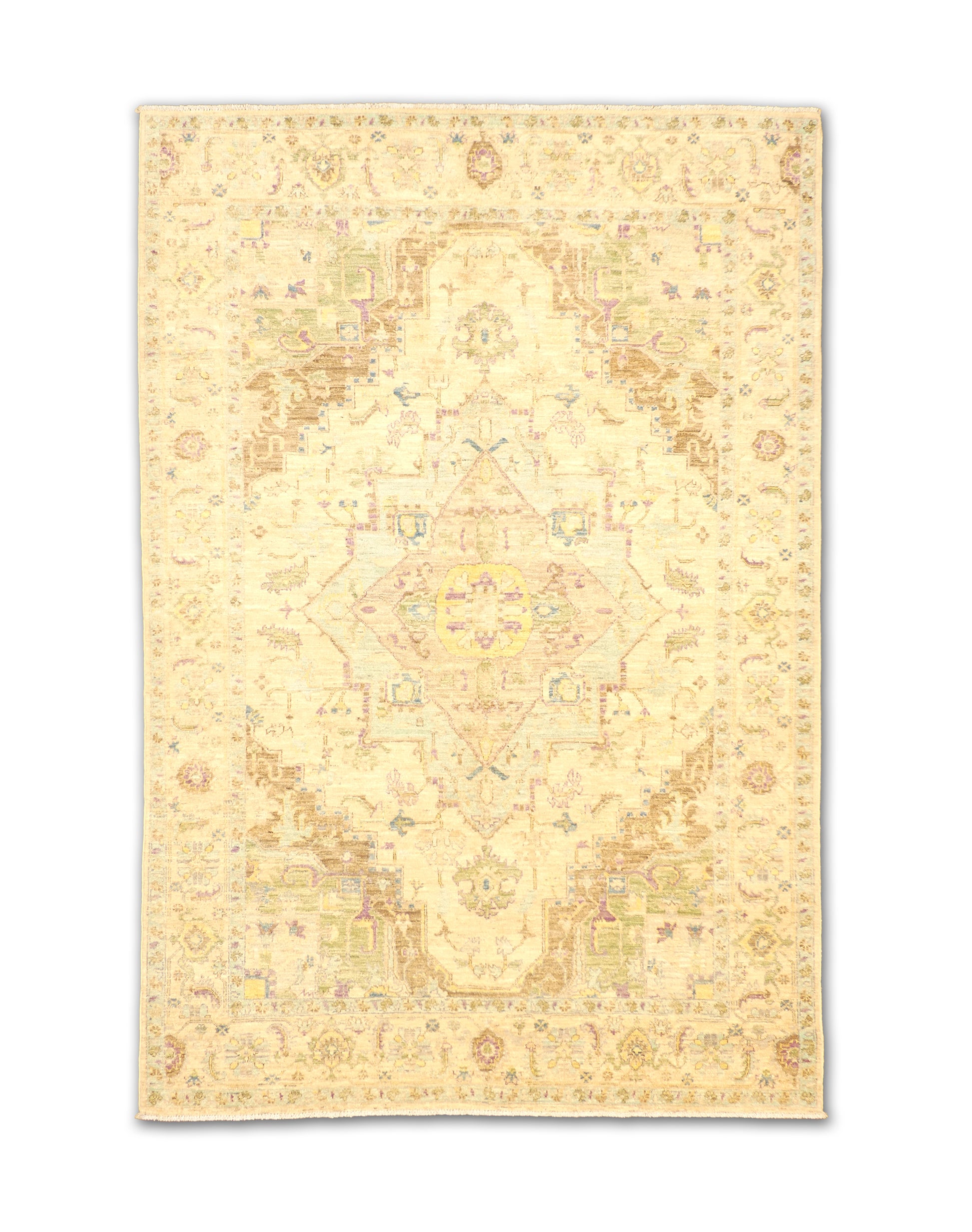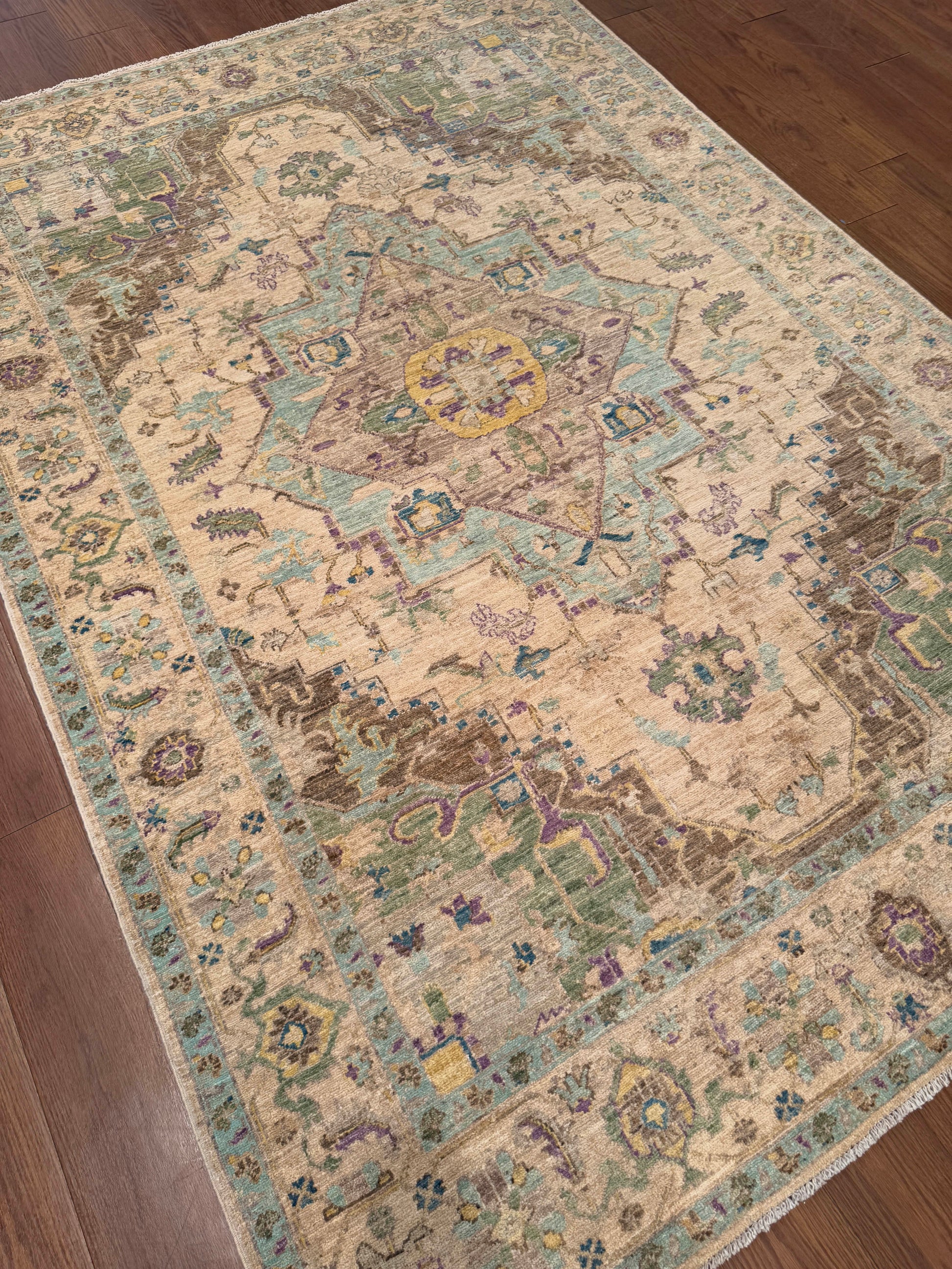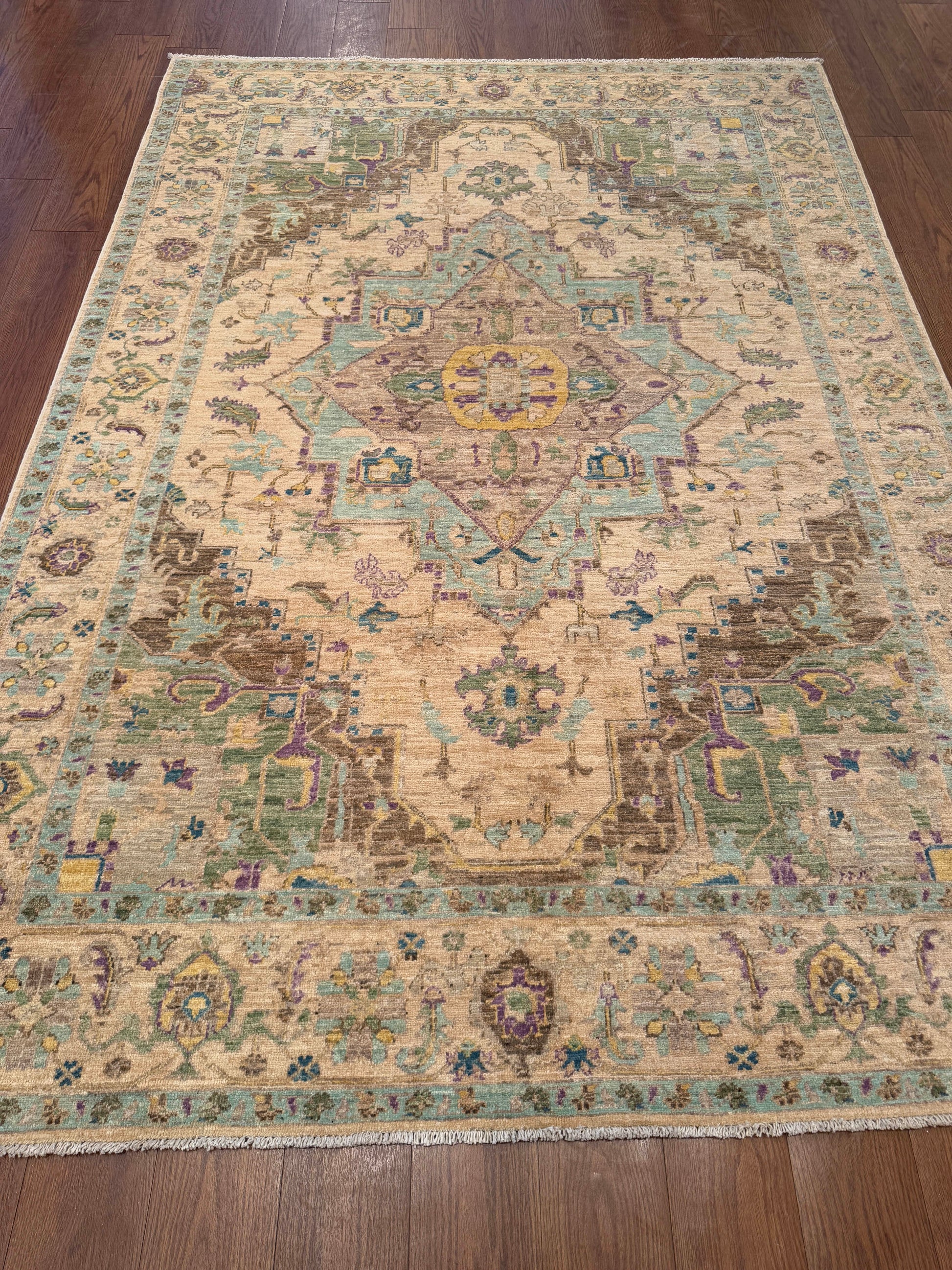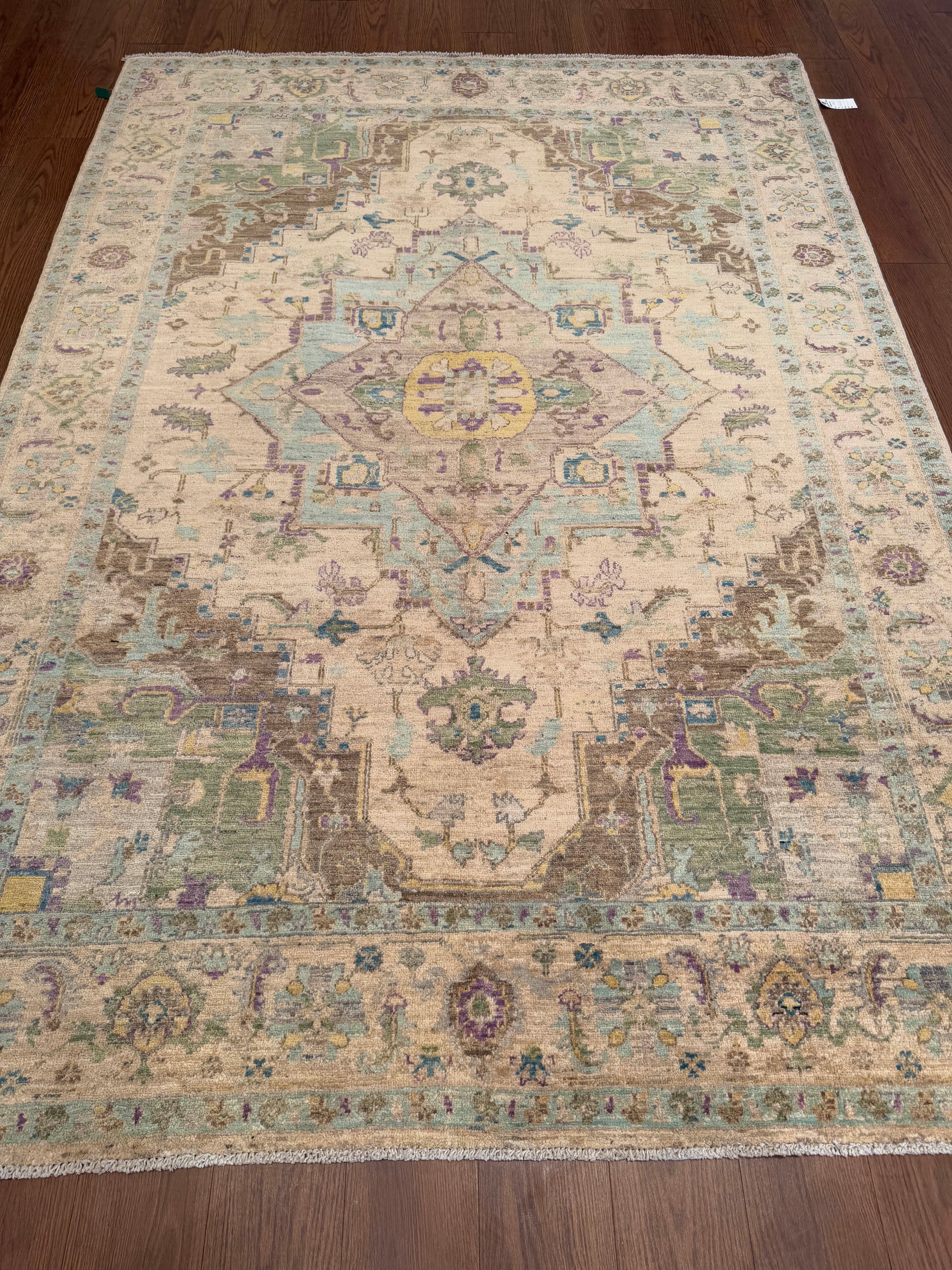 This elegant hand-knotted rug features a soft, faded medallion design framed by an ornate floral border. Woven in muted shades of beige, sage green, aqua, lavender, and hints of gold, the rug exudes an antique-inspired charm. Its distressed finish enhances the timeless character, making it a versatile piece for both classic and transitional interiors.