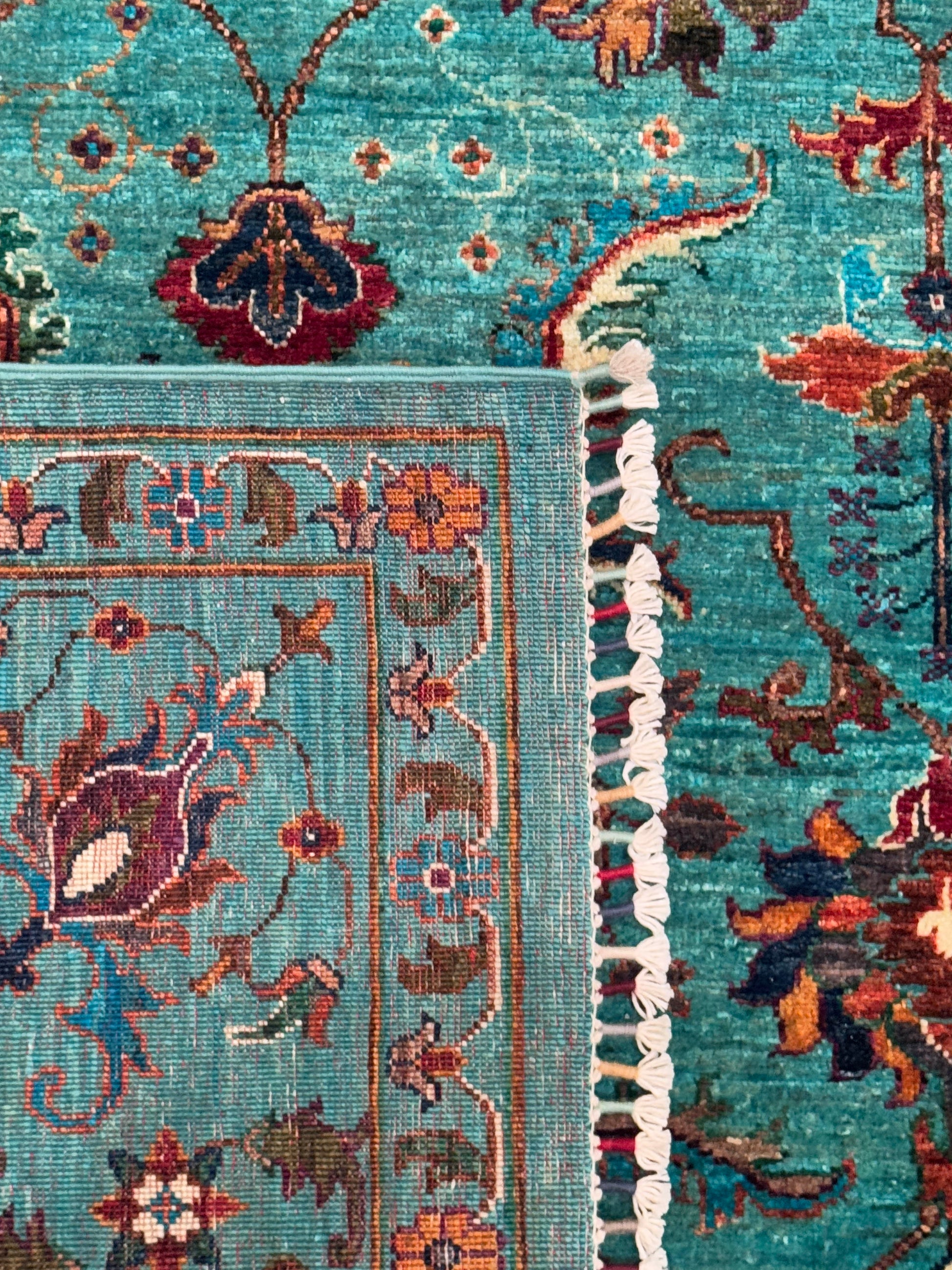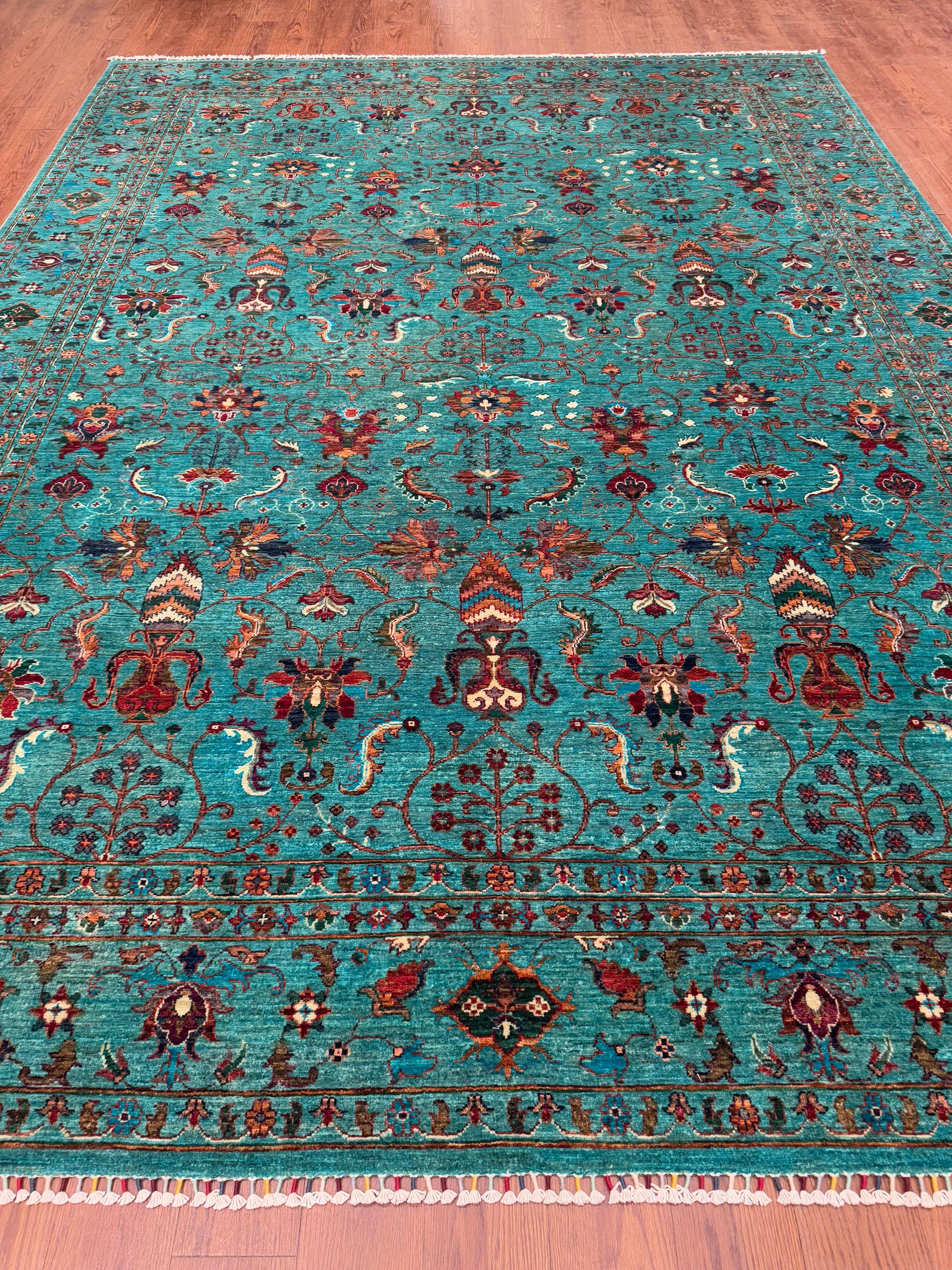 This breathtaking handwoven piece radiates elegance through its striking turquoise field adorned with an intricate floral and vine motif. Delicate details in burgundy, gold, ivory, and navy create a beautiful contrast that enhances the rug’s visual depth and sophistication. The balanced symmetry and refined craftsmanship make it a statement piece that uplifts both contemporary and traditional interiors.