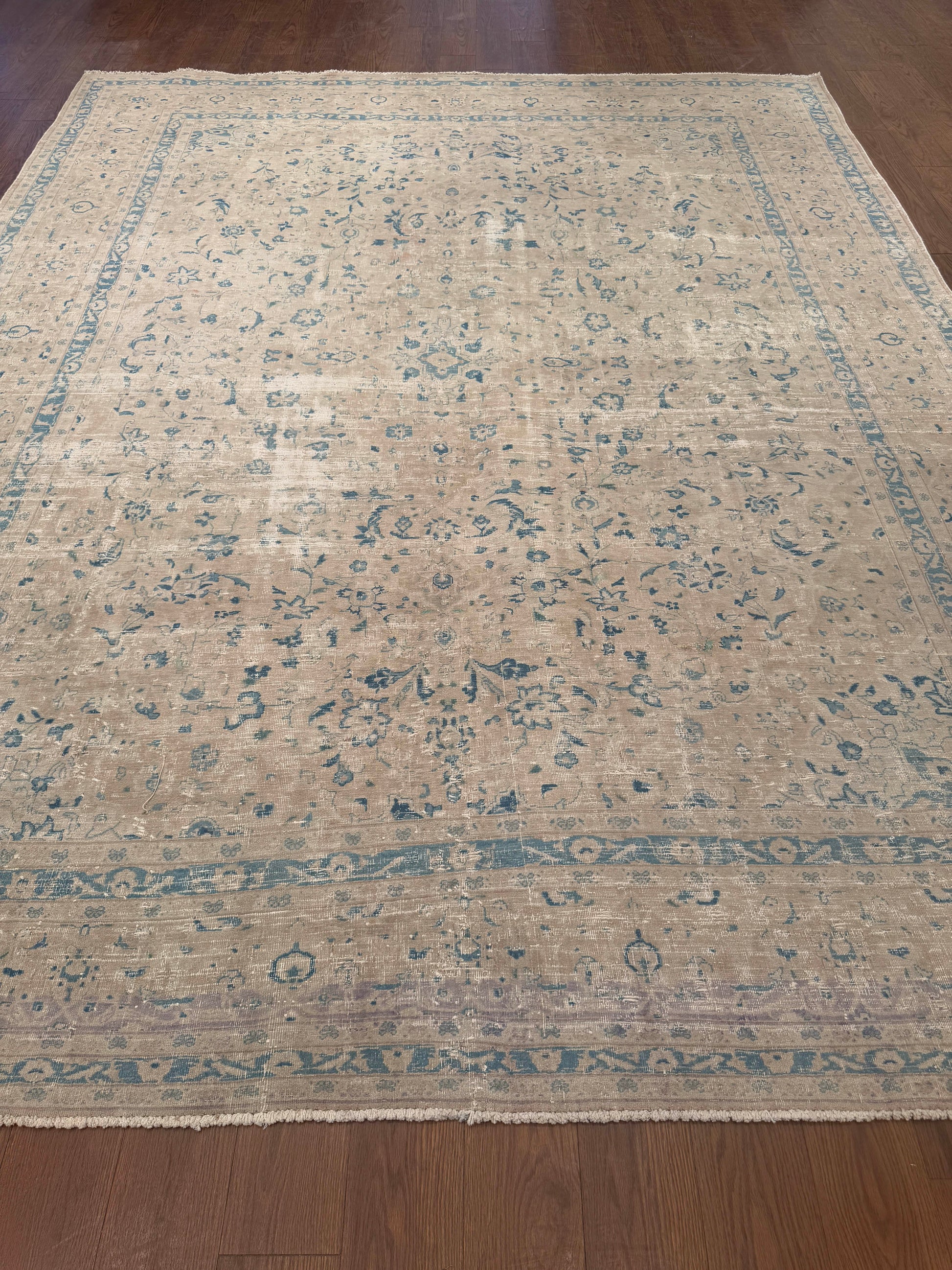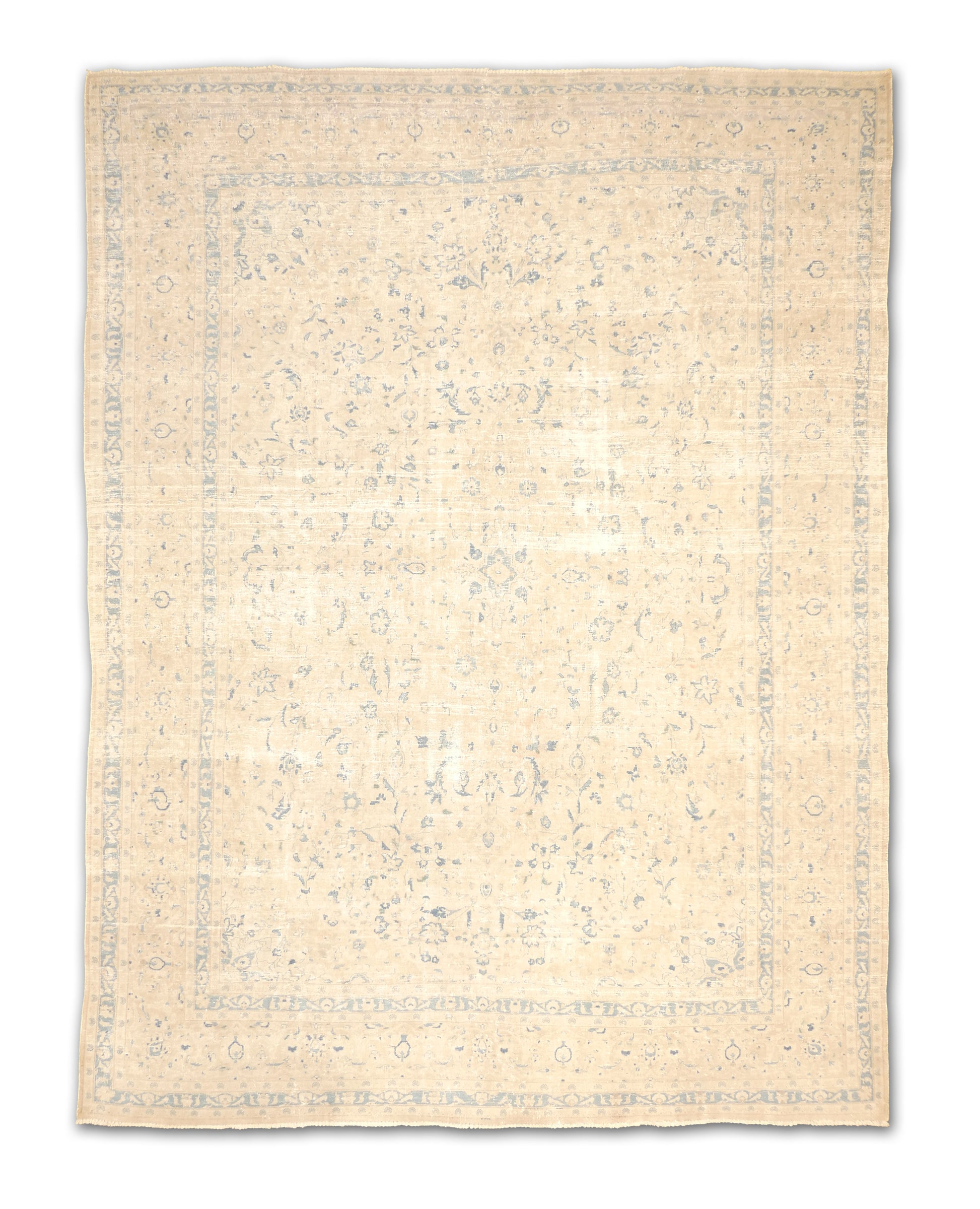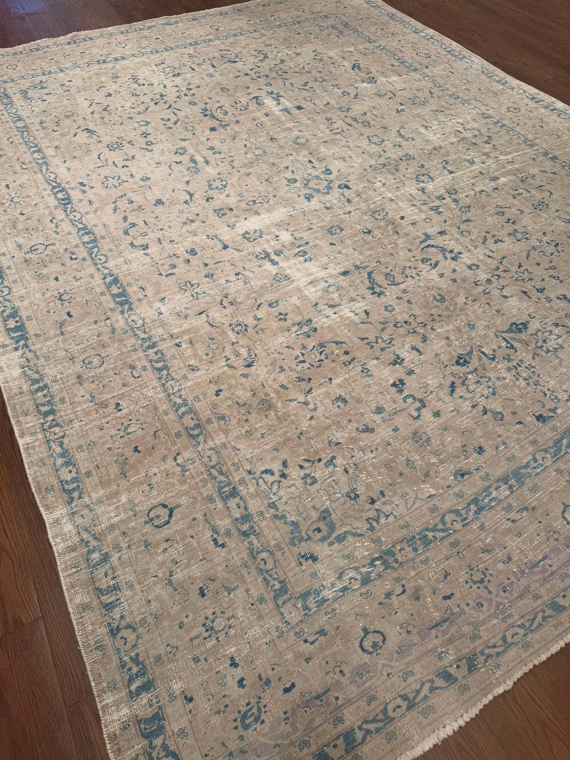 This elegant handwoven rug features a delicate floral pattern softened by a faded, distressed finish. The neutral beige field is accented with subtle blue and lavender botanical motifs, giving it a timeless, vintage appeal. A narrow border frames the rug with understated detail, enhancing its refined character. The muted palette and worn aesthetic create a versatile piece that blends seamlessly into both modern and traditional interiors.