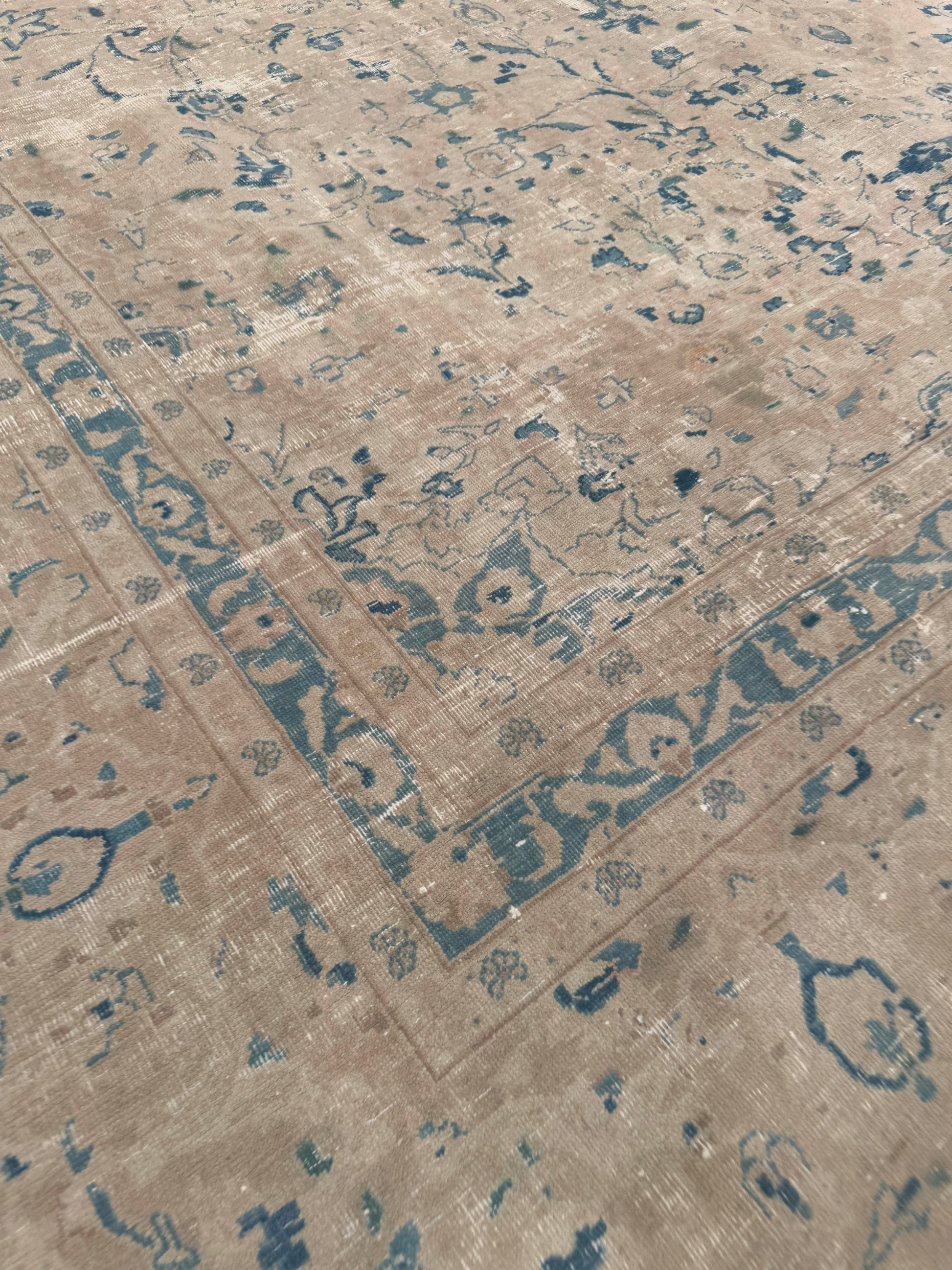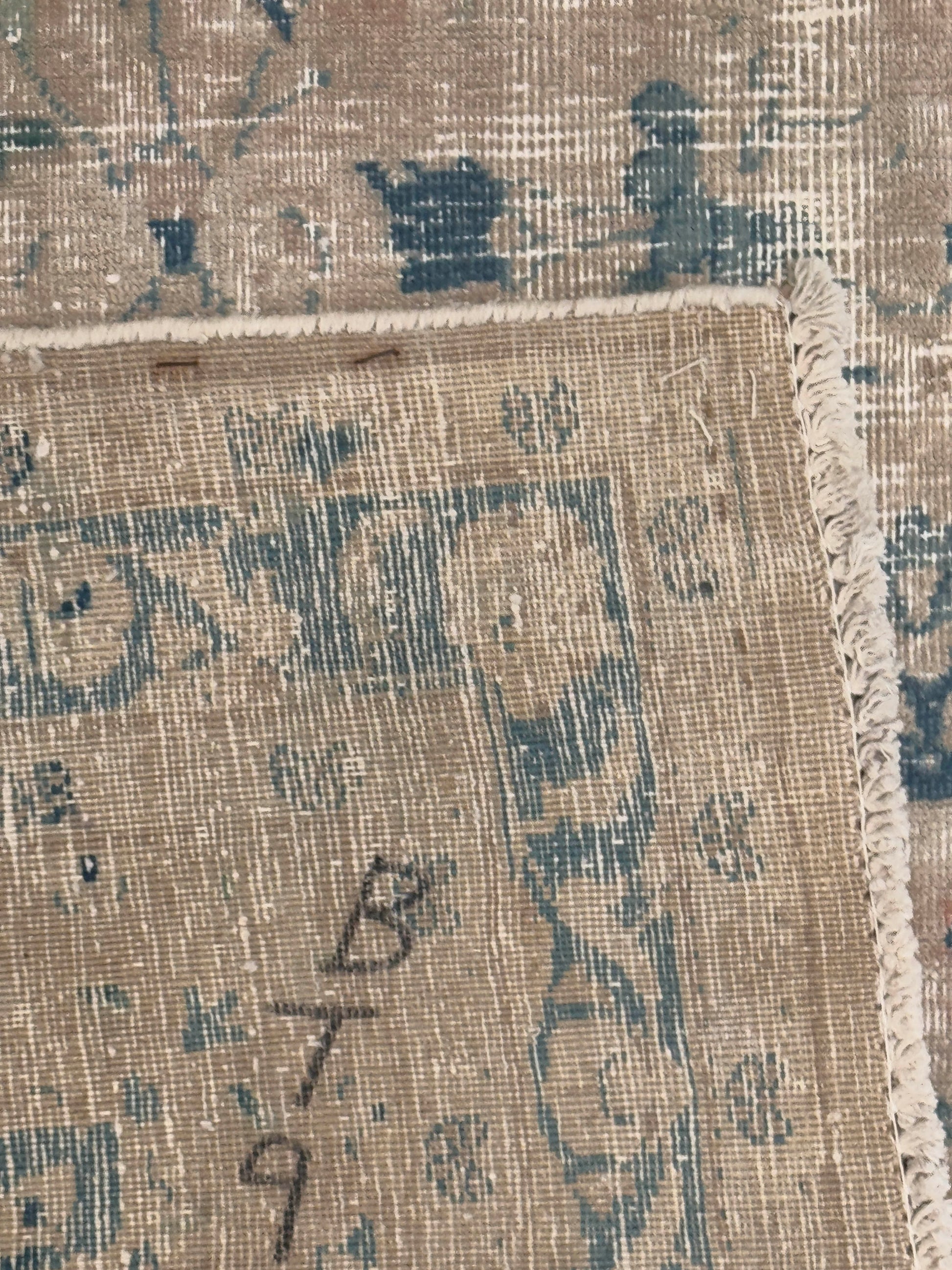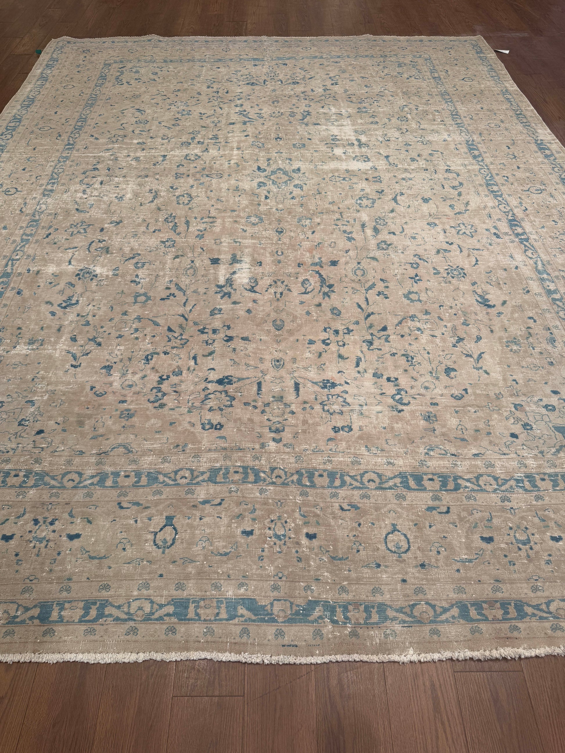 This elegant handwoven rug features a delicate floral pattern softened by a faded, distressed finish. The neutral beige field is accented with subtle blue and lavender botanical motifs, giving it a timeless, vintage appeal. A narrow border frames the rug with understated detail, enhancing its refined character. The muted palette and worn aesthetic create a versatile piece that blends seamlessly into both modern and traditional interiors.