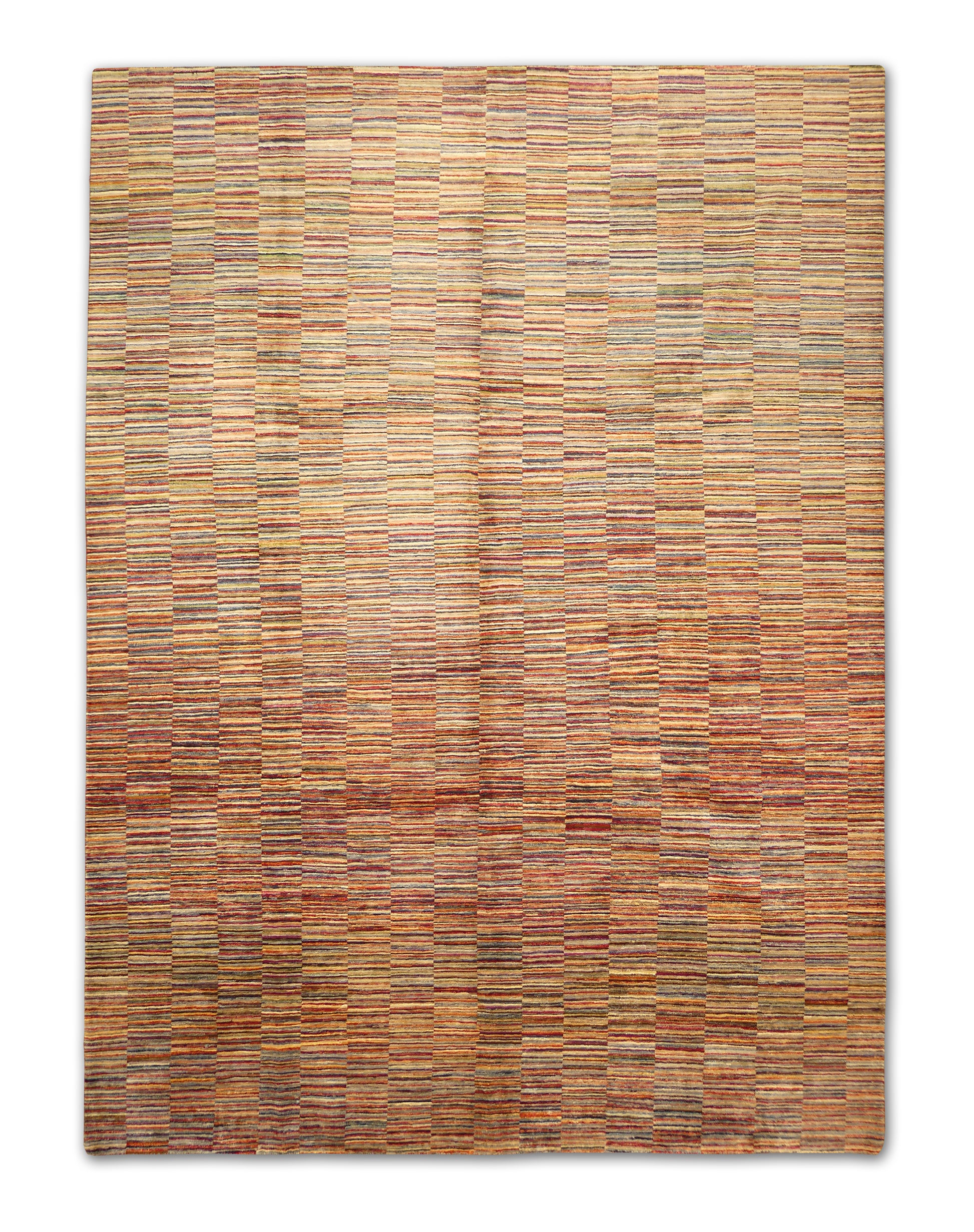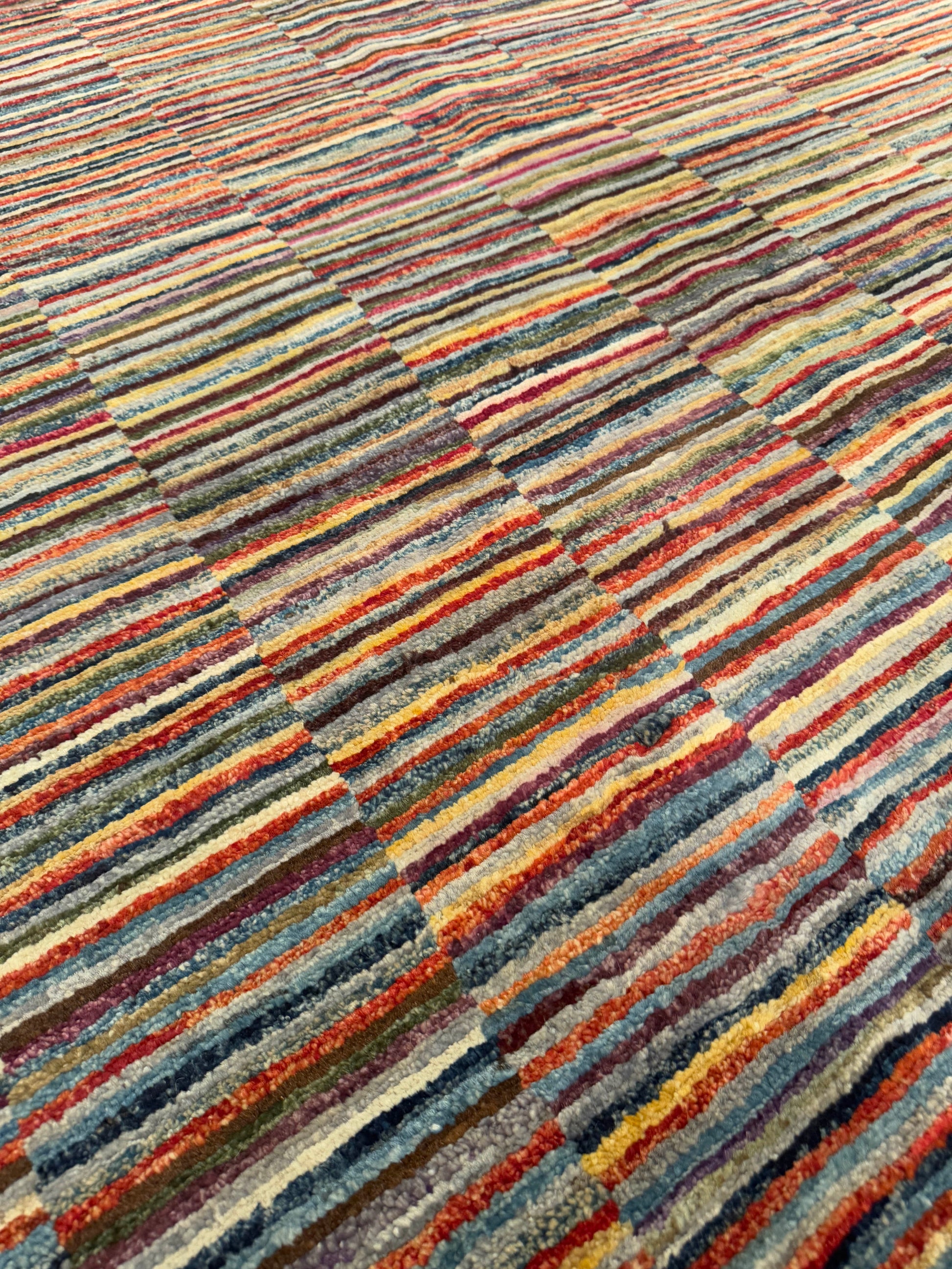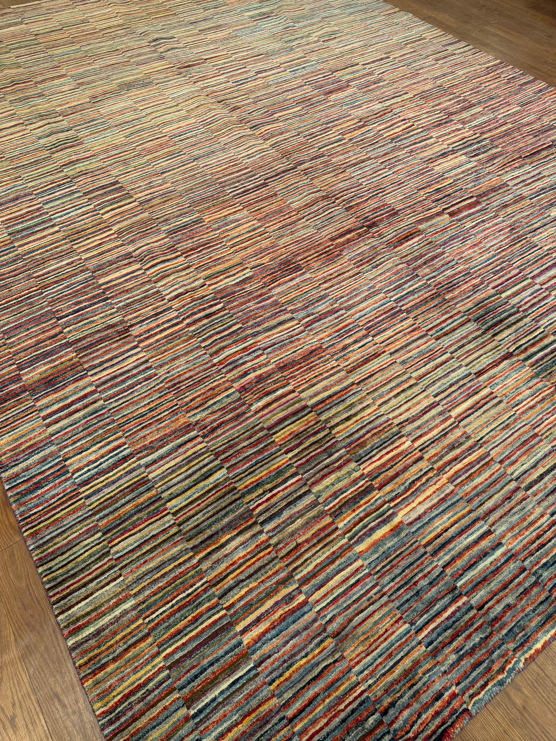 This bold handwoven rug showcases a contemporary striped patchwork design, blending earthy tones with vibrant accents for a dynamic visual effect. The alternating rectangular sections create movement and balance, while the rich wool texture enhances warmth and durability. Its unique modern style makes it a versatile statement piece for eclectic, artistic, or transitional interiors.