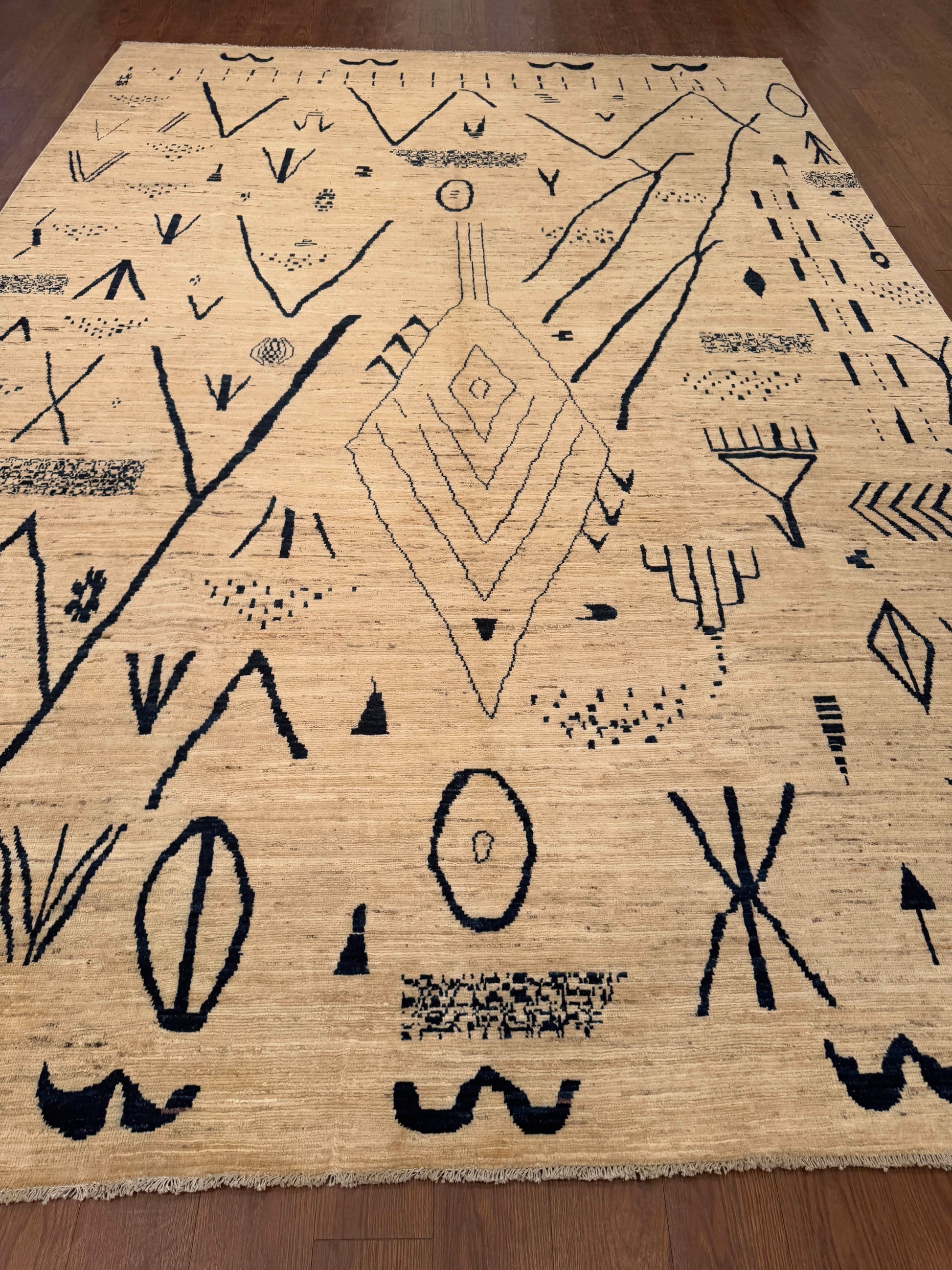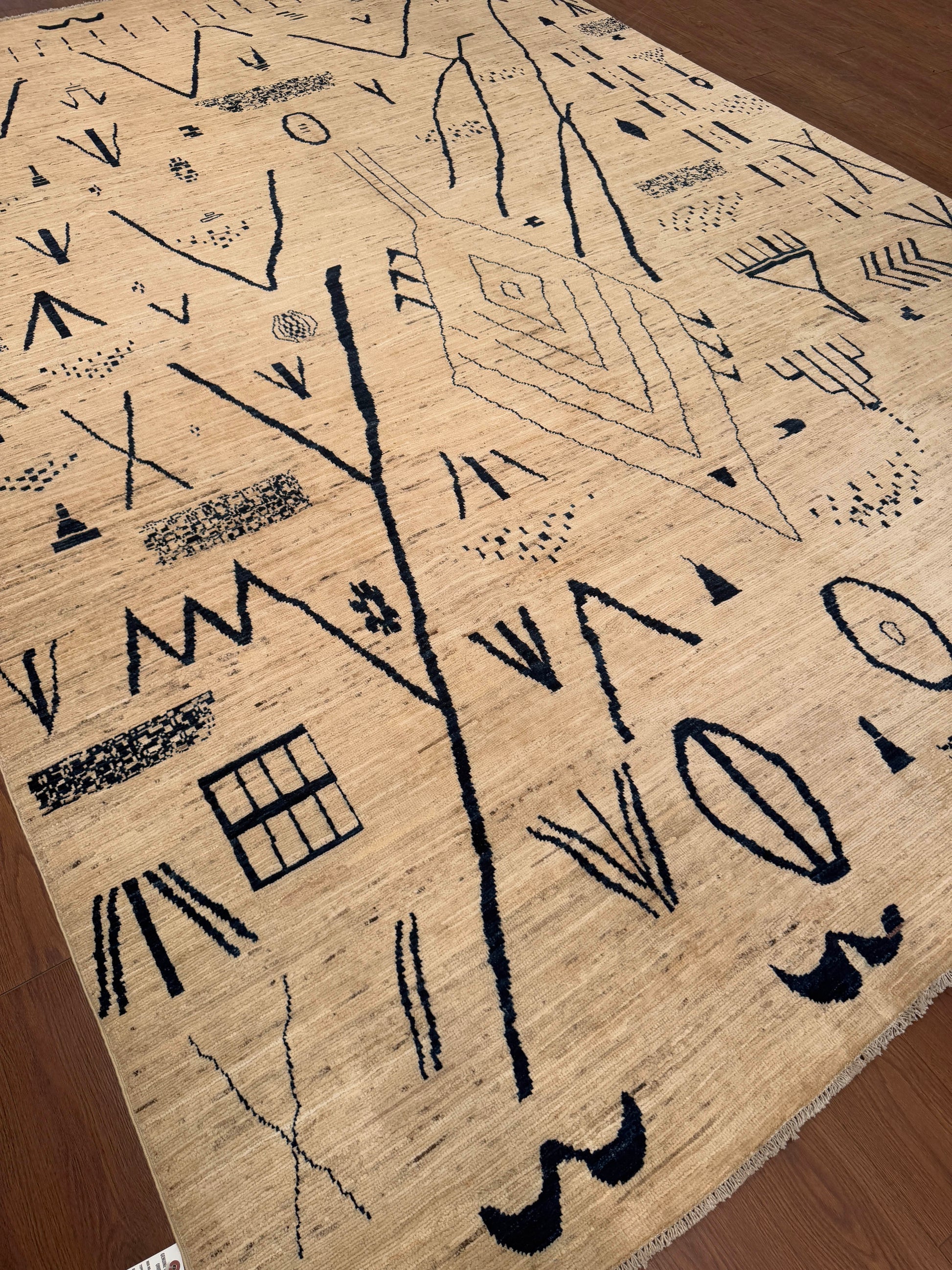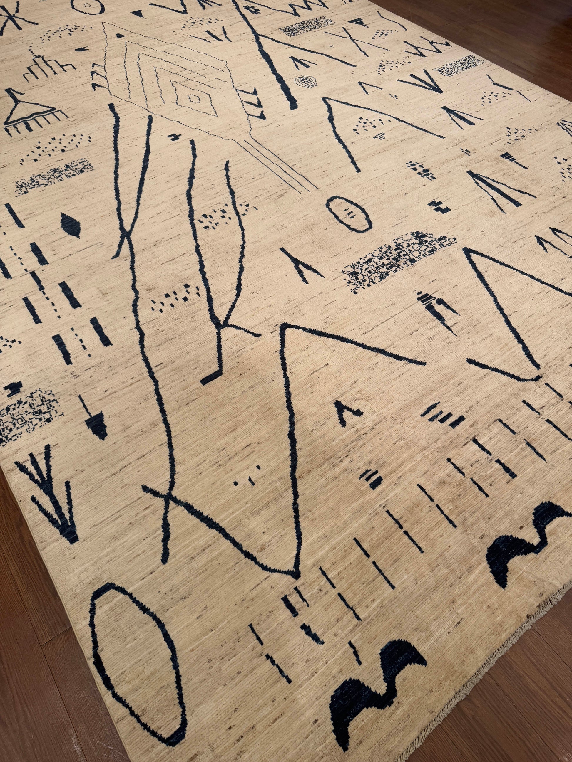 This striking handwoven rug blends Moroccan-inspired minimalism with modern artistry. The natural beige field is decorated with bold black geometric and abstract symbols, giving it a playful yet sophisticated look. Its large size and neutral palette make it perfect for anchoring contemporary living rooms, lofts, or creative spaces seeking a statement piece.