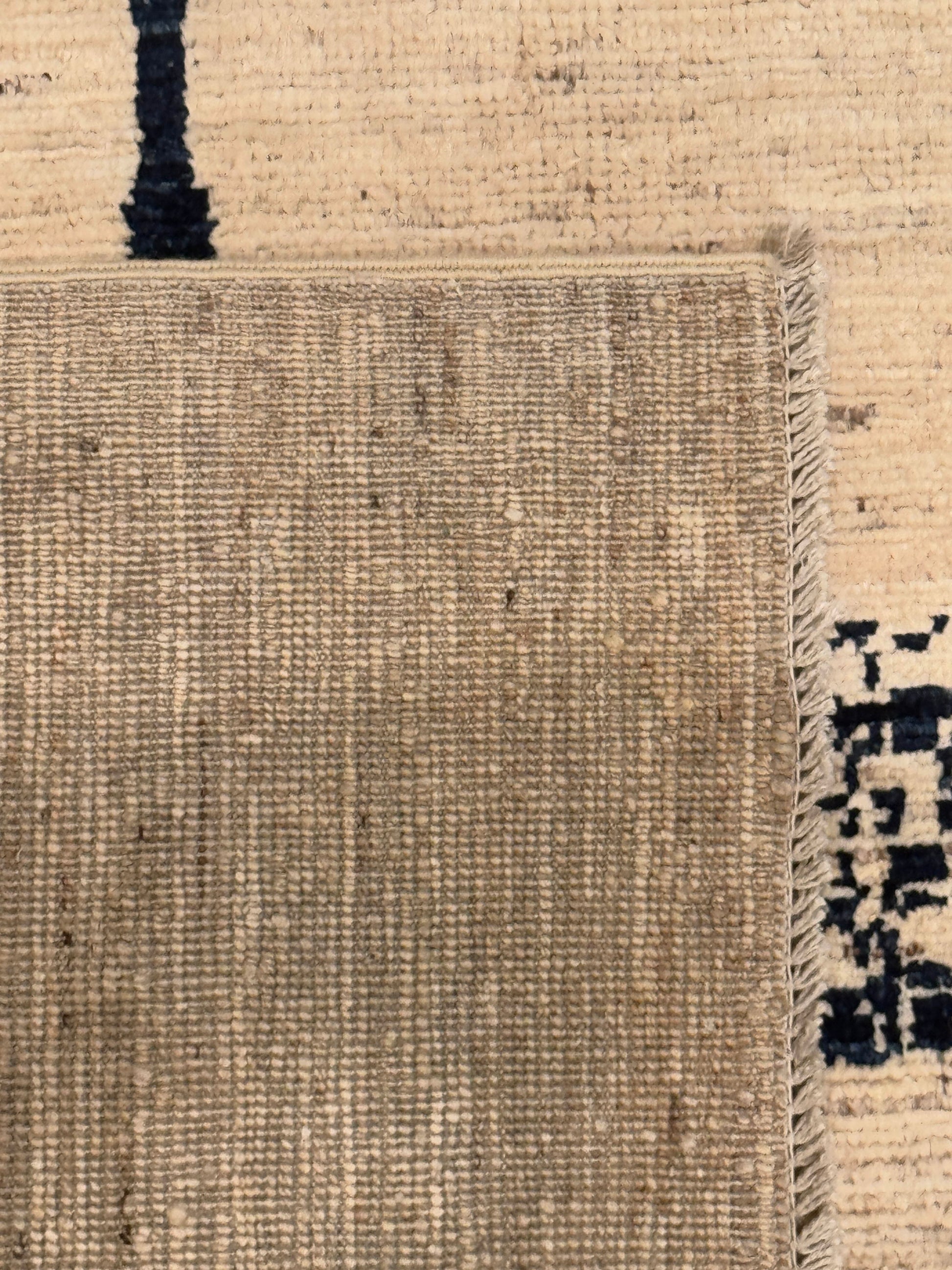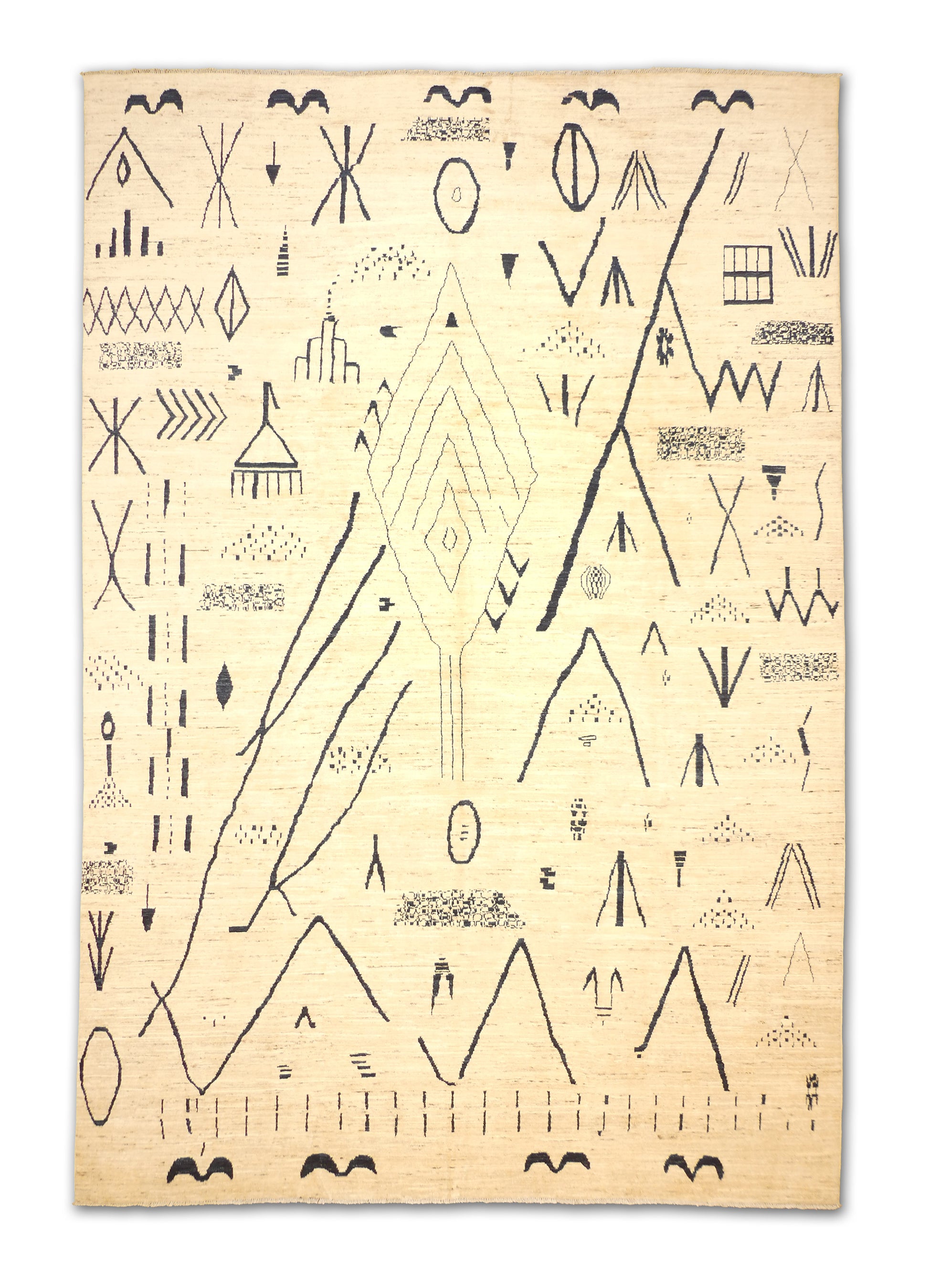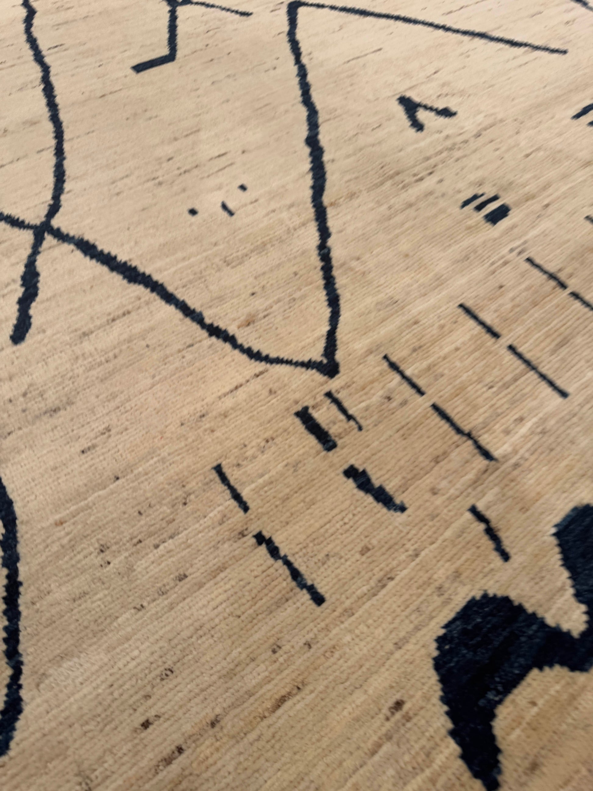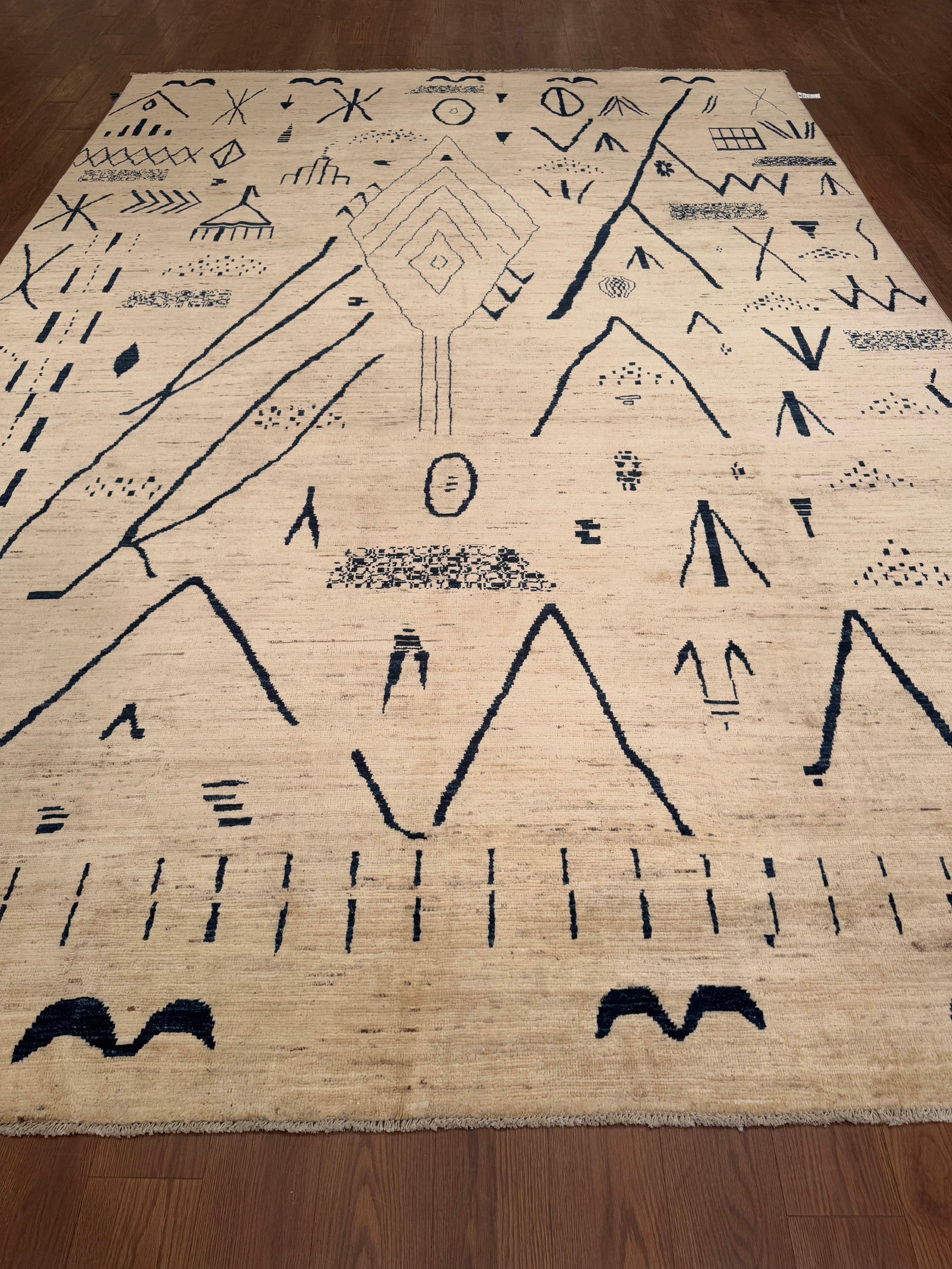 This striking handwoven rug blends Moroccan-inspired minimalism with modern artistry. The natural beige field is decorated with bold black geometric and abstract symbols, giving it a playful yet sophisticated look. Its large size and neutral palette make it perfect for anchoring contemporary living rooms, lofts, or creative spaces seeking a statement piece.