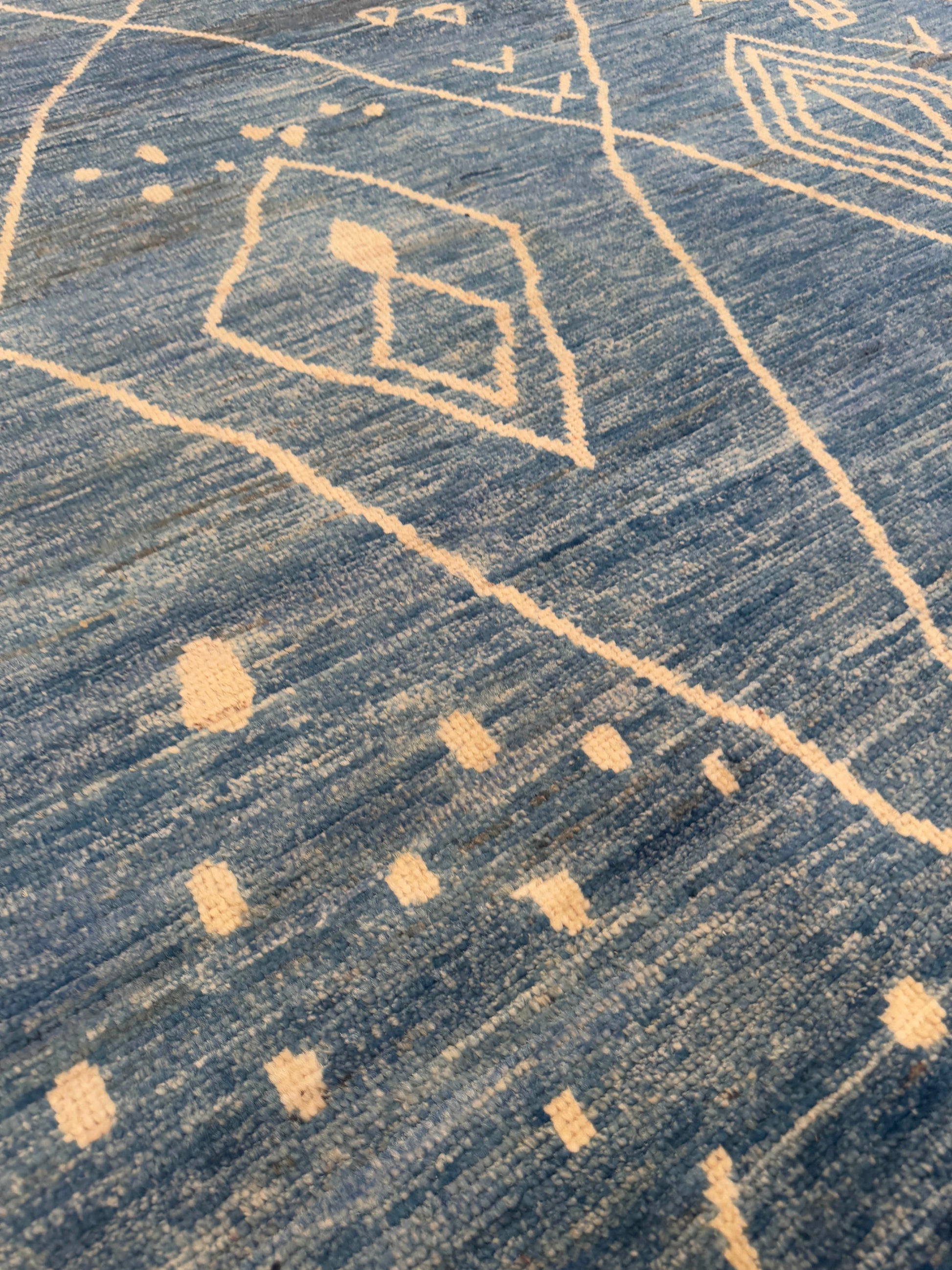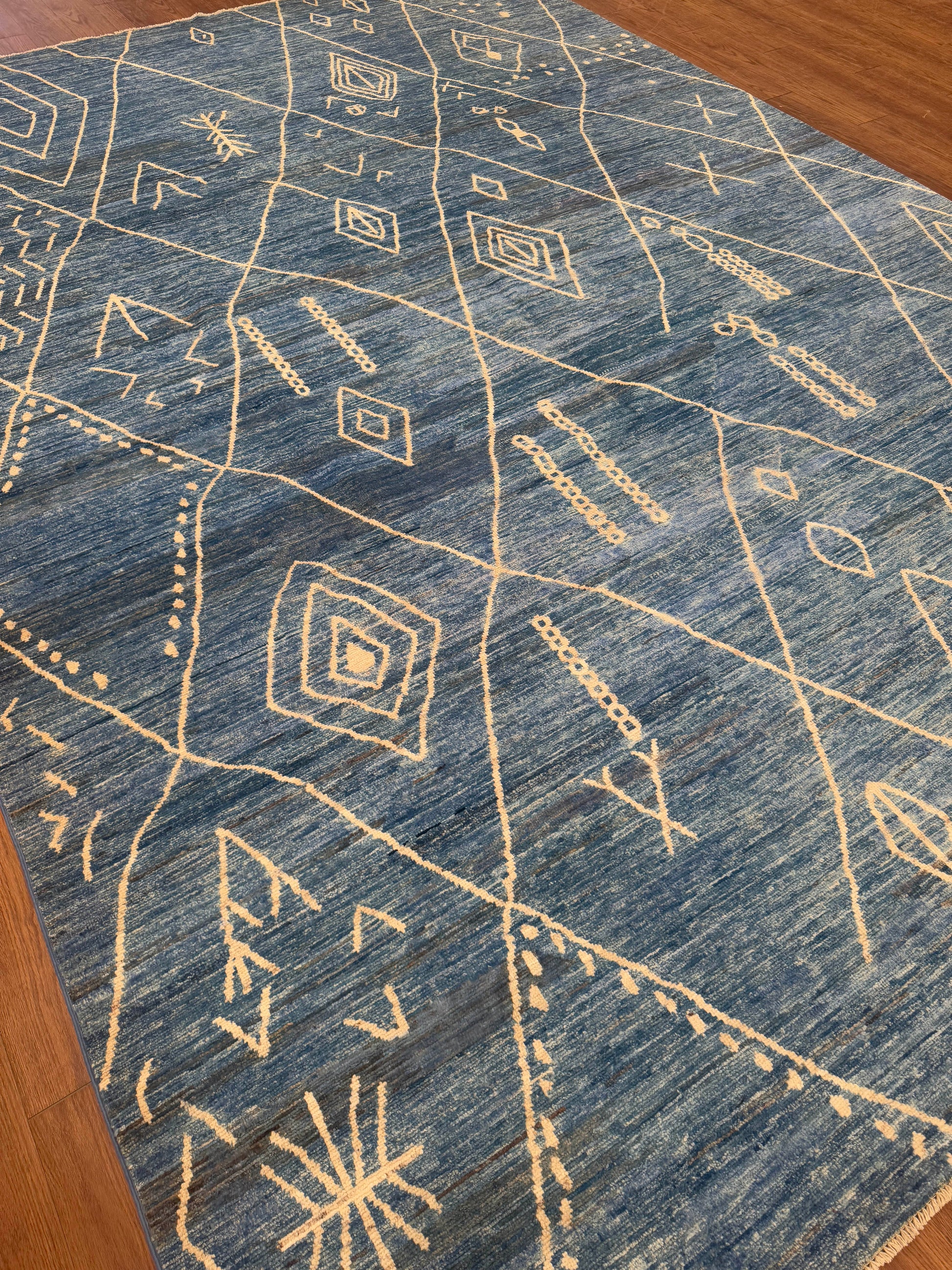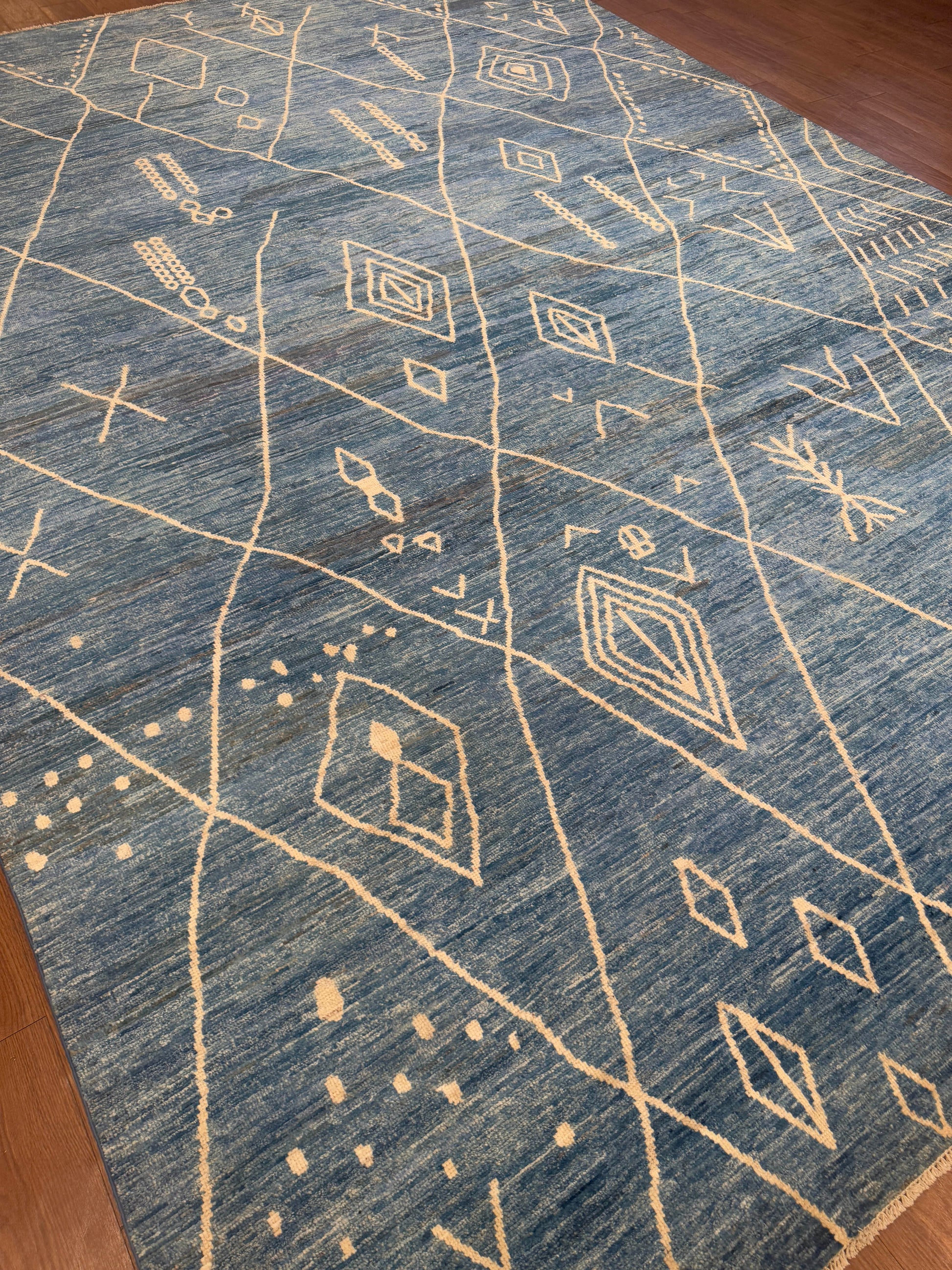 This handwoven wool rug showcases a bold contemporary take on tribal artistry. Its soft blue field is intersected with ivory diamond outlines and scattered abstract motifs, creating movement and visual rhythm. The abrash texture enhances the handmade character, making it an artistic yet versatile centerpiece.