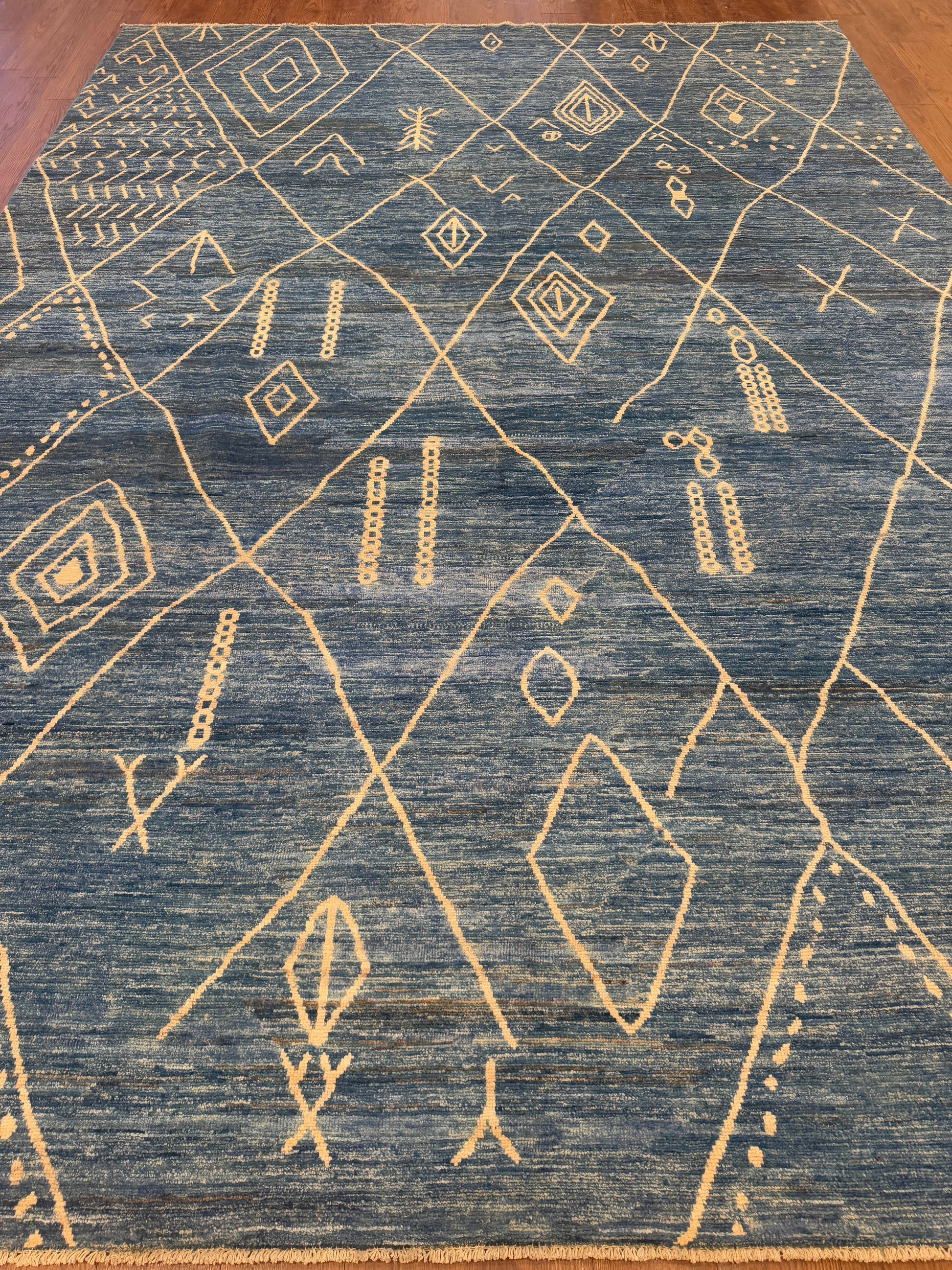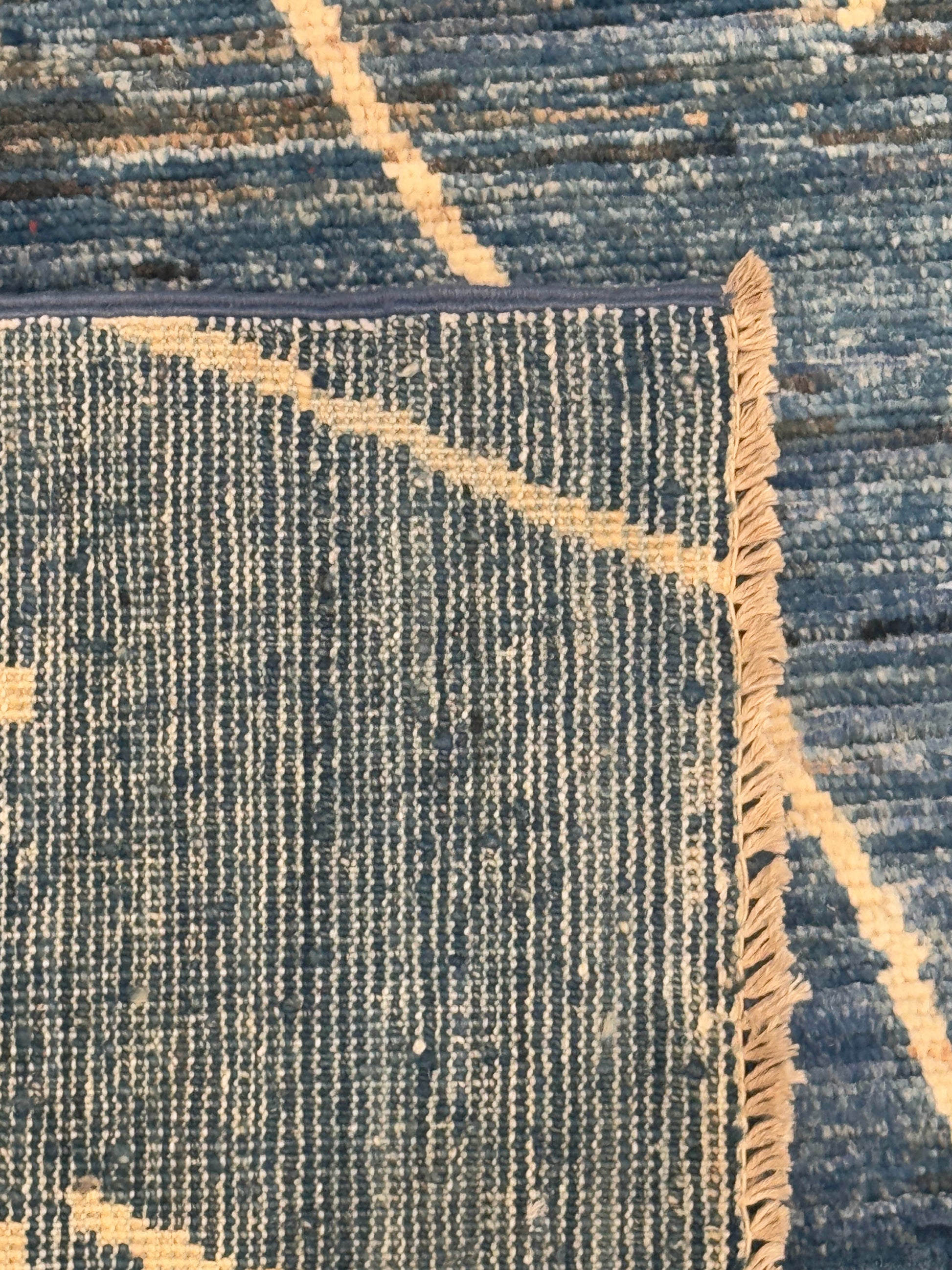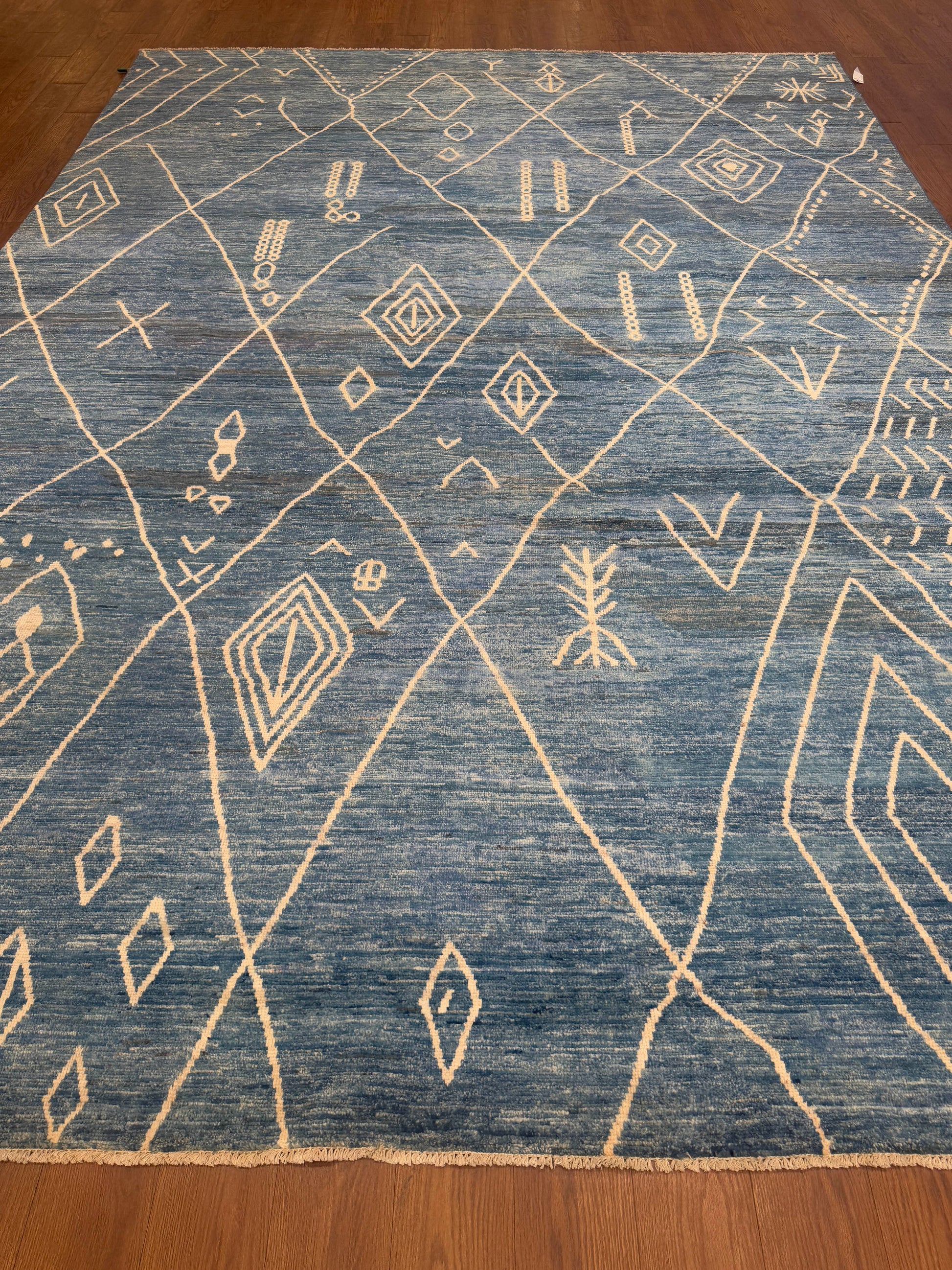 This handwoven wool rug showcases a bold contemporary take on tribal artistry. Its soft blue field is intersected with ivory diamond outlines and scattered abstract motifs, creating movement and visual rhythm. The abrash texture enhances the handmade character, making it an artistic yet versatile centerpiece.