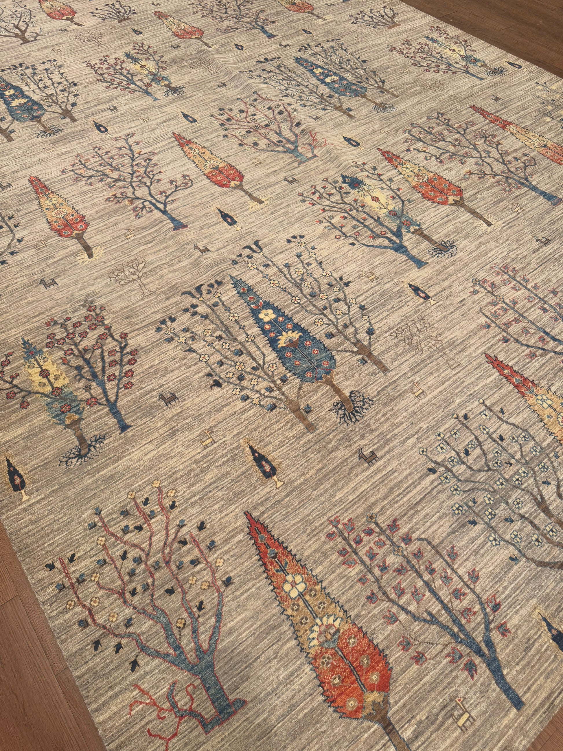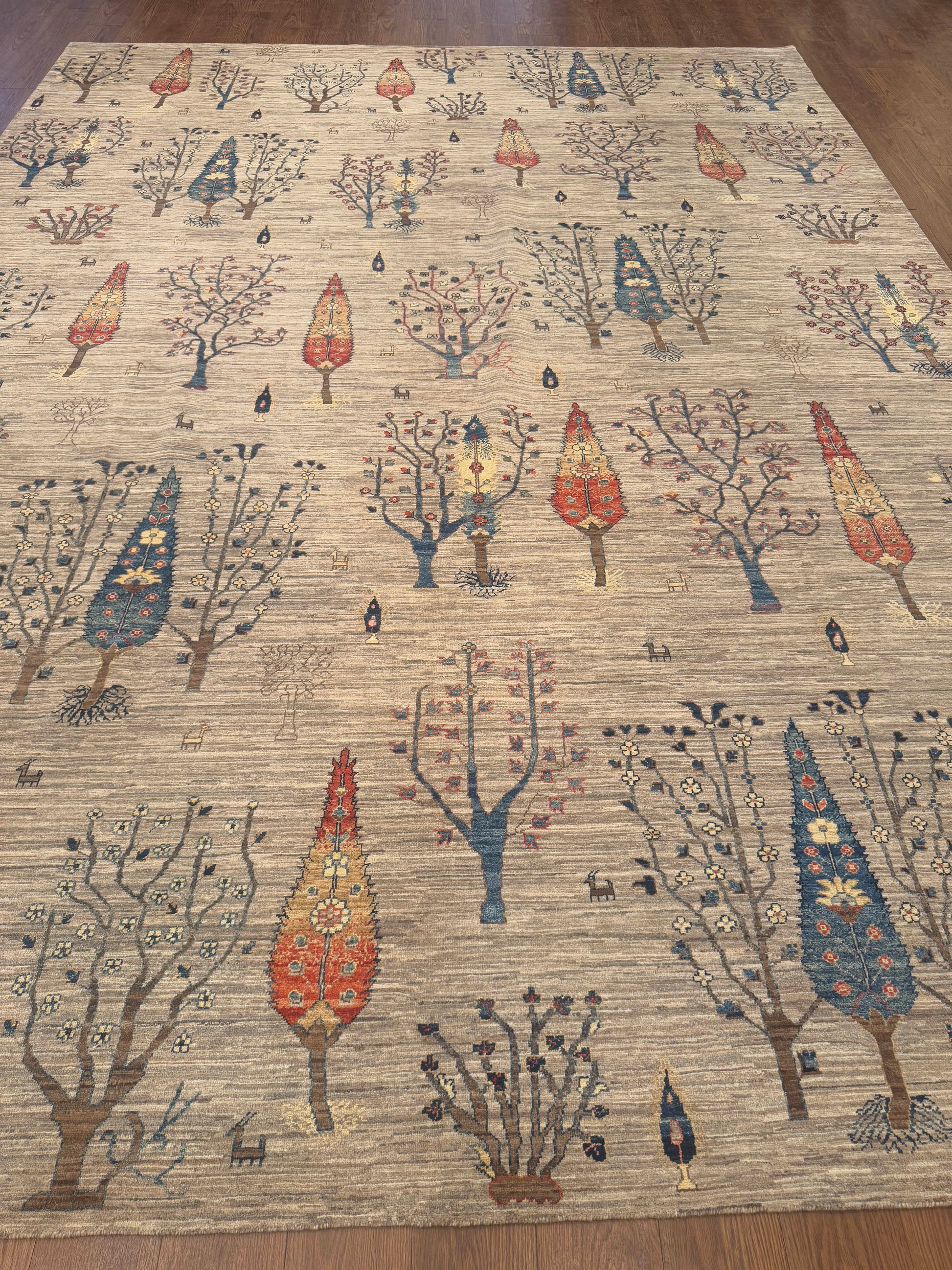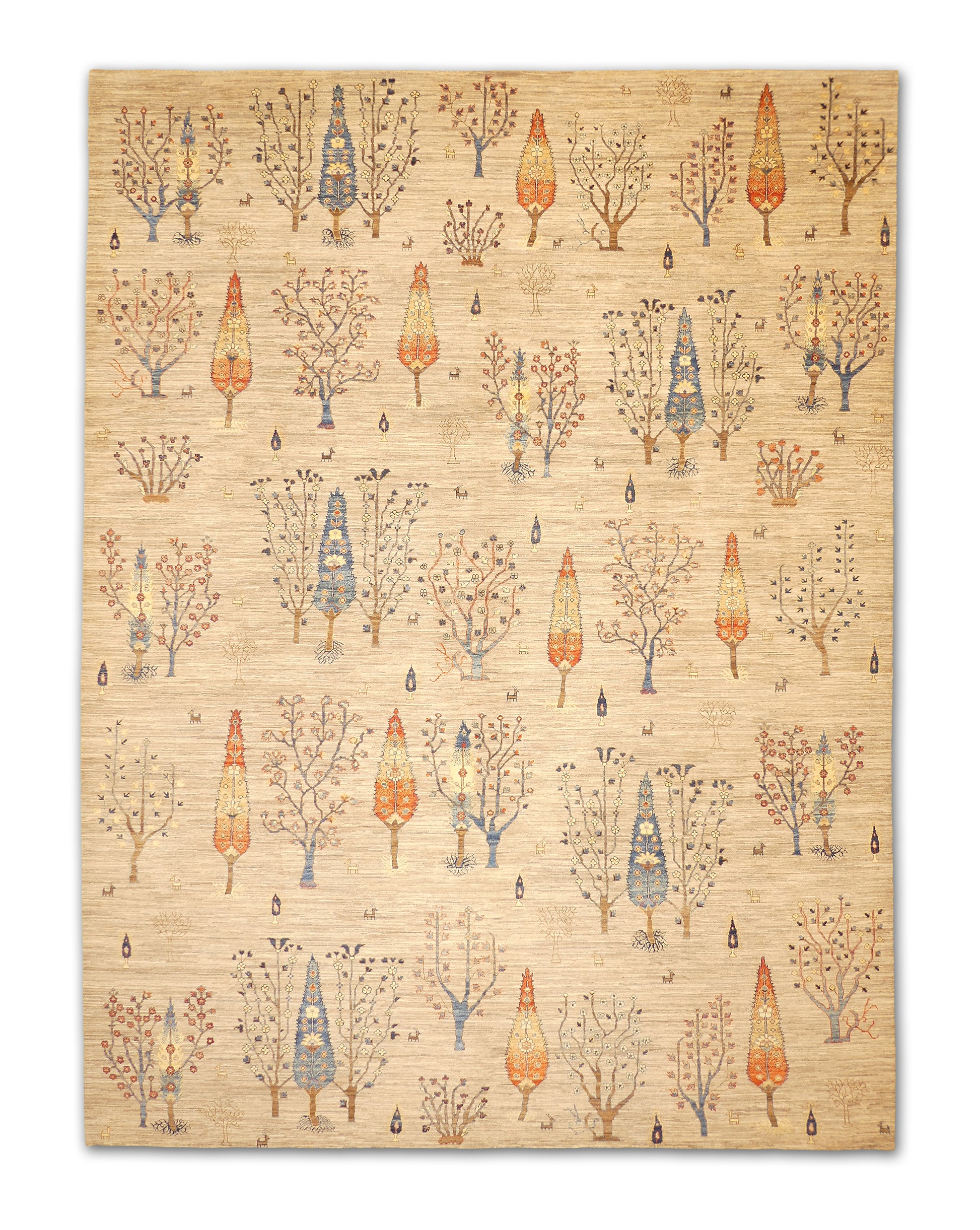 This handmade wool rug features a unique botanical design, where stylized tree motifs cascade across a neutral ground. The soft beige field is accented by vibrant shades of blue, red, gold, and brown, giving the piece both warmth and character. Its playful yet elegant composition makes it an ideal centerpiece for spaces that blend traditional artistry with a modern twist.