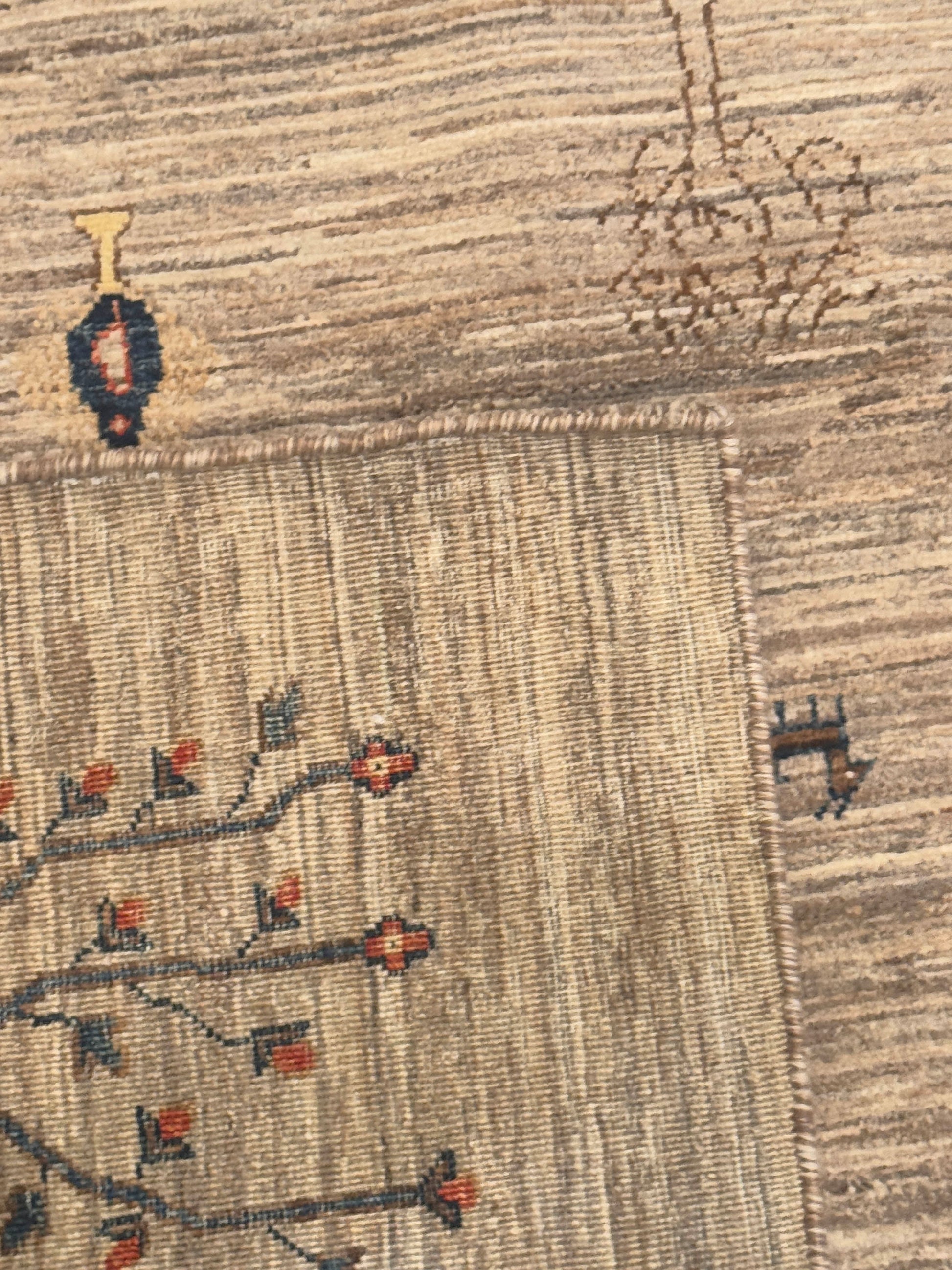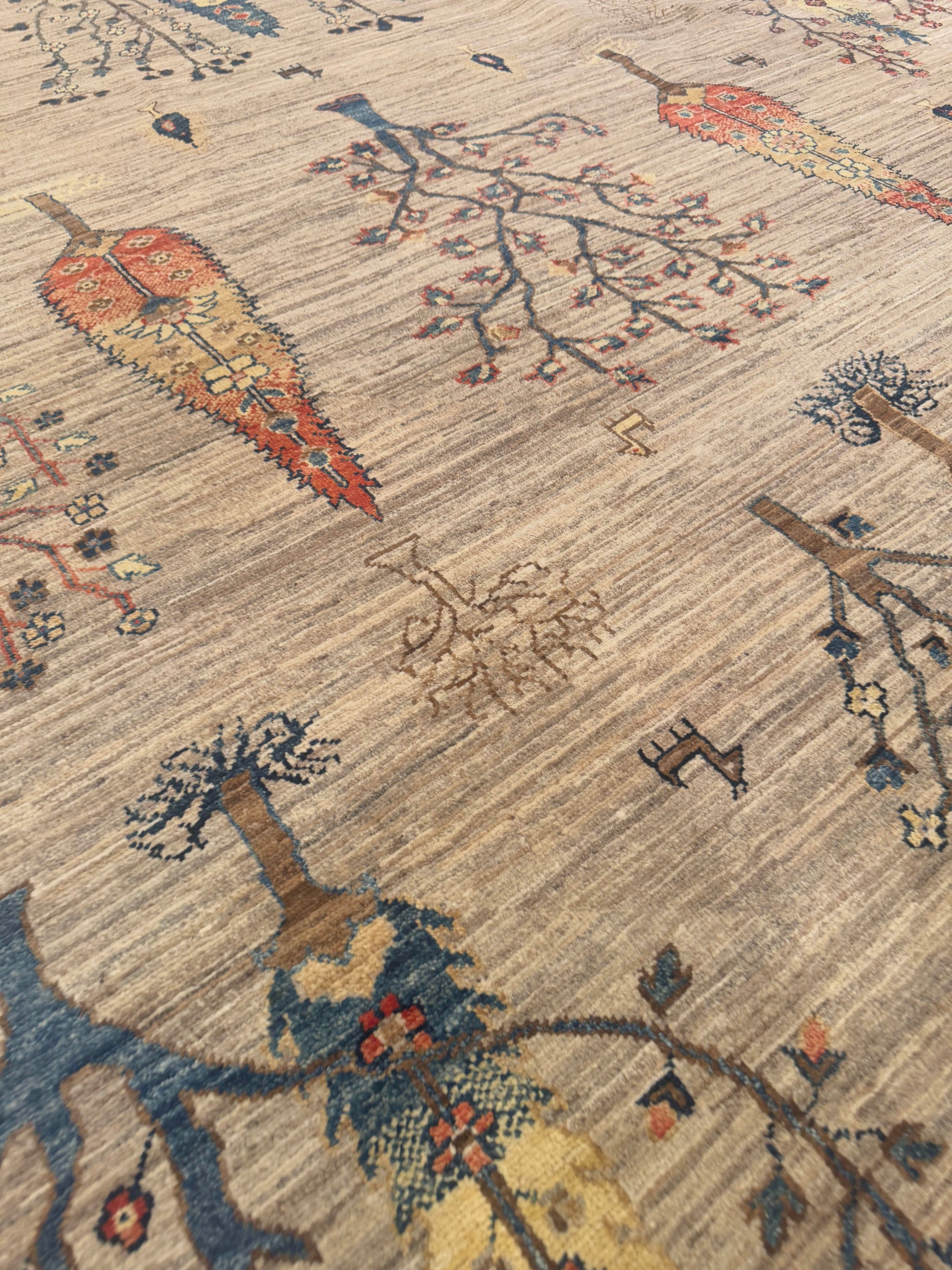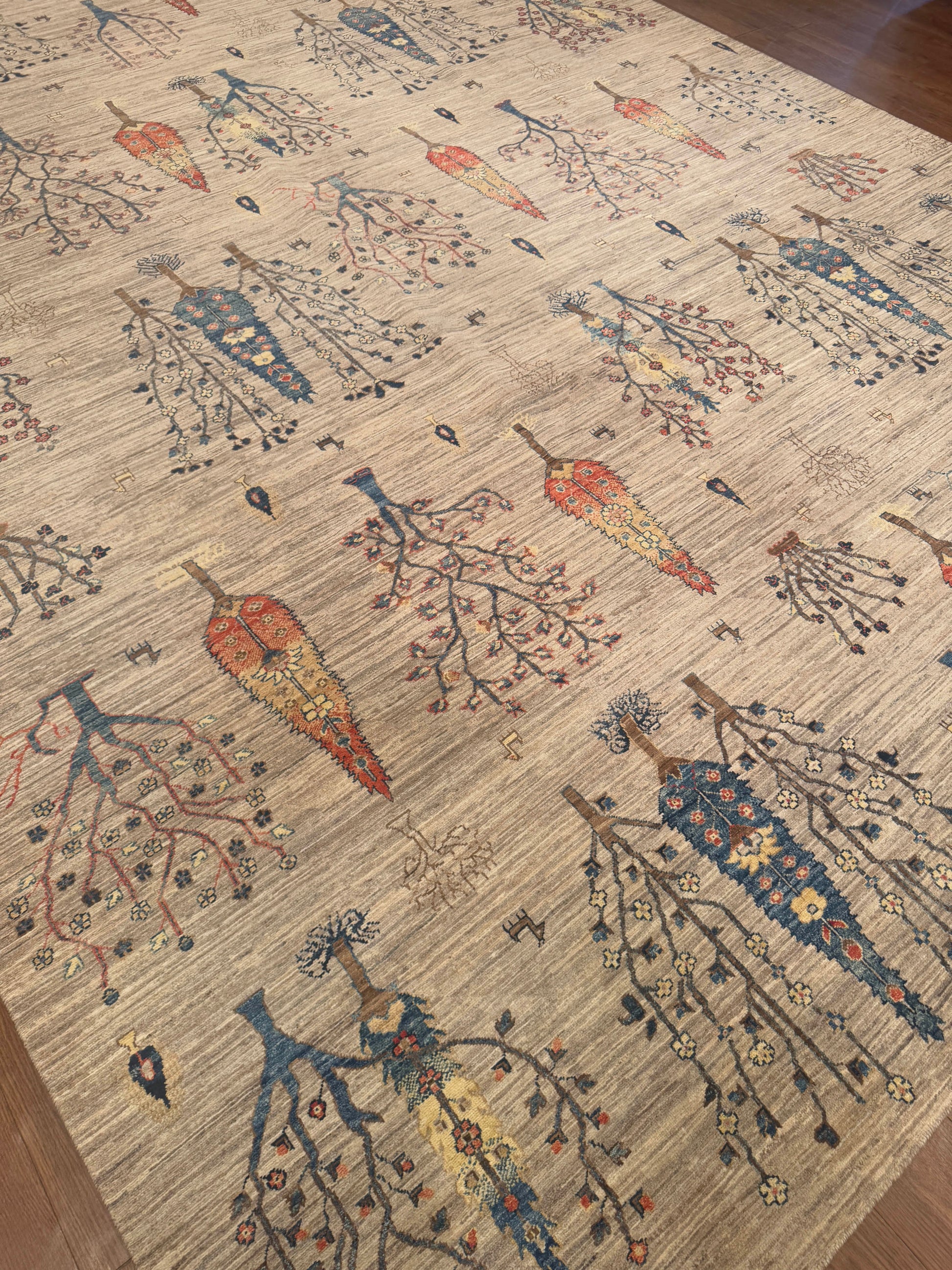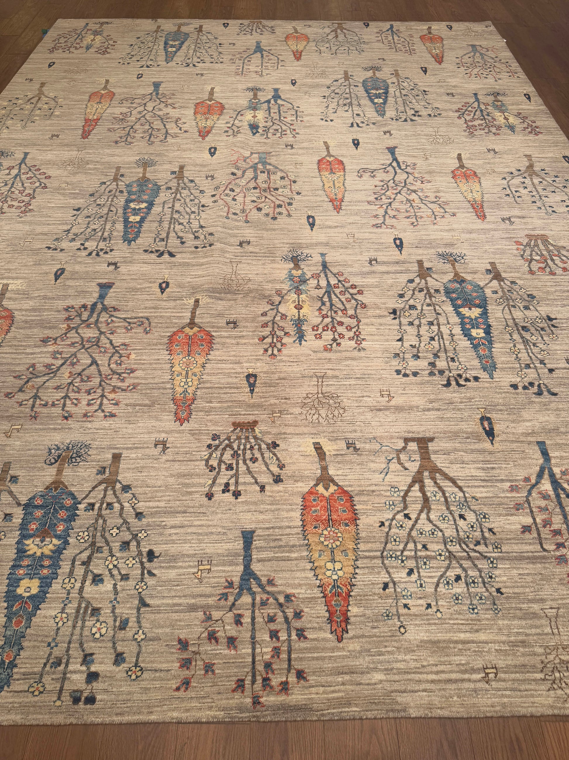 This handmade wool rug features a unique botanical design, where stylized tree motifs cascade across a neutral ground. The soft beige field is accented by vibrant shades of blue, red, gold, and brown, giving the piece both warmth and character. Its playful yet elegant composition makes it an ideal centerpiece for spaces that blend traditional artistry with a modern twist.