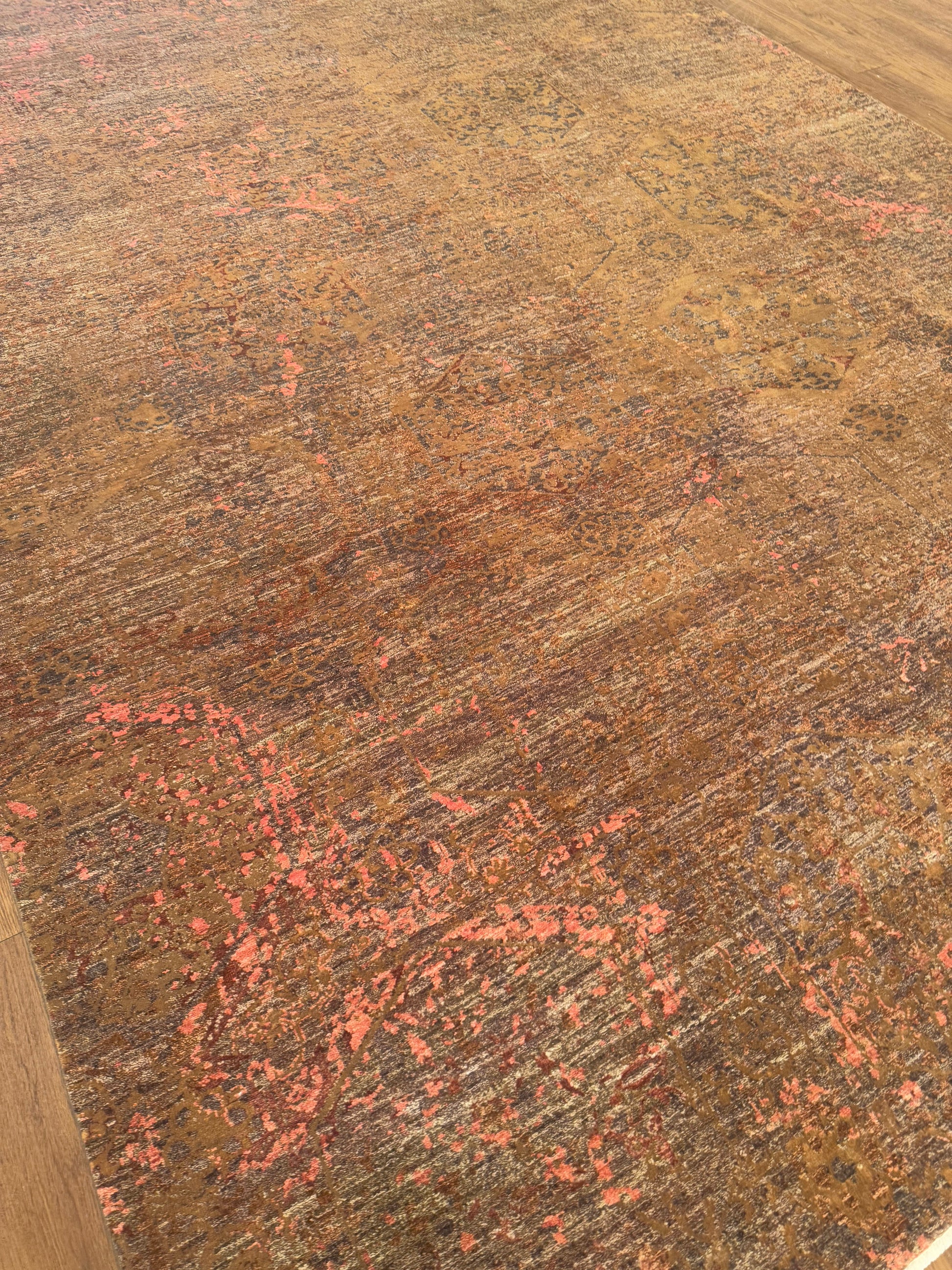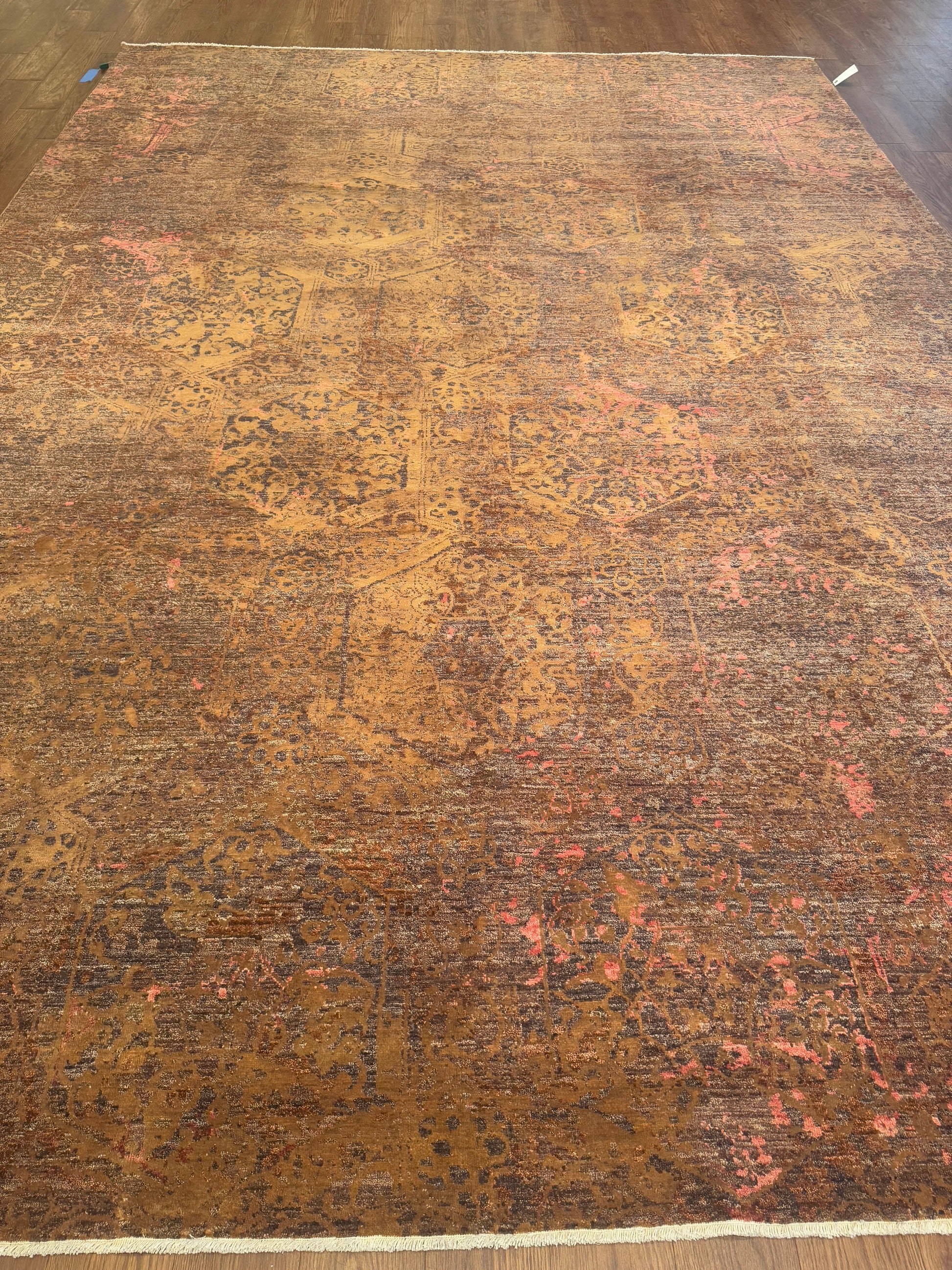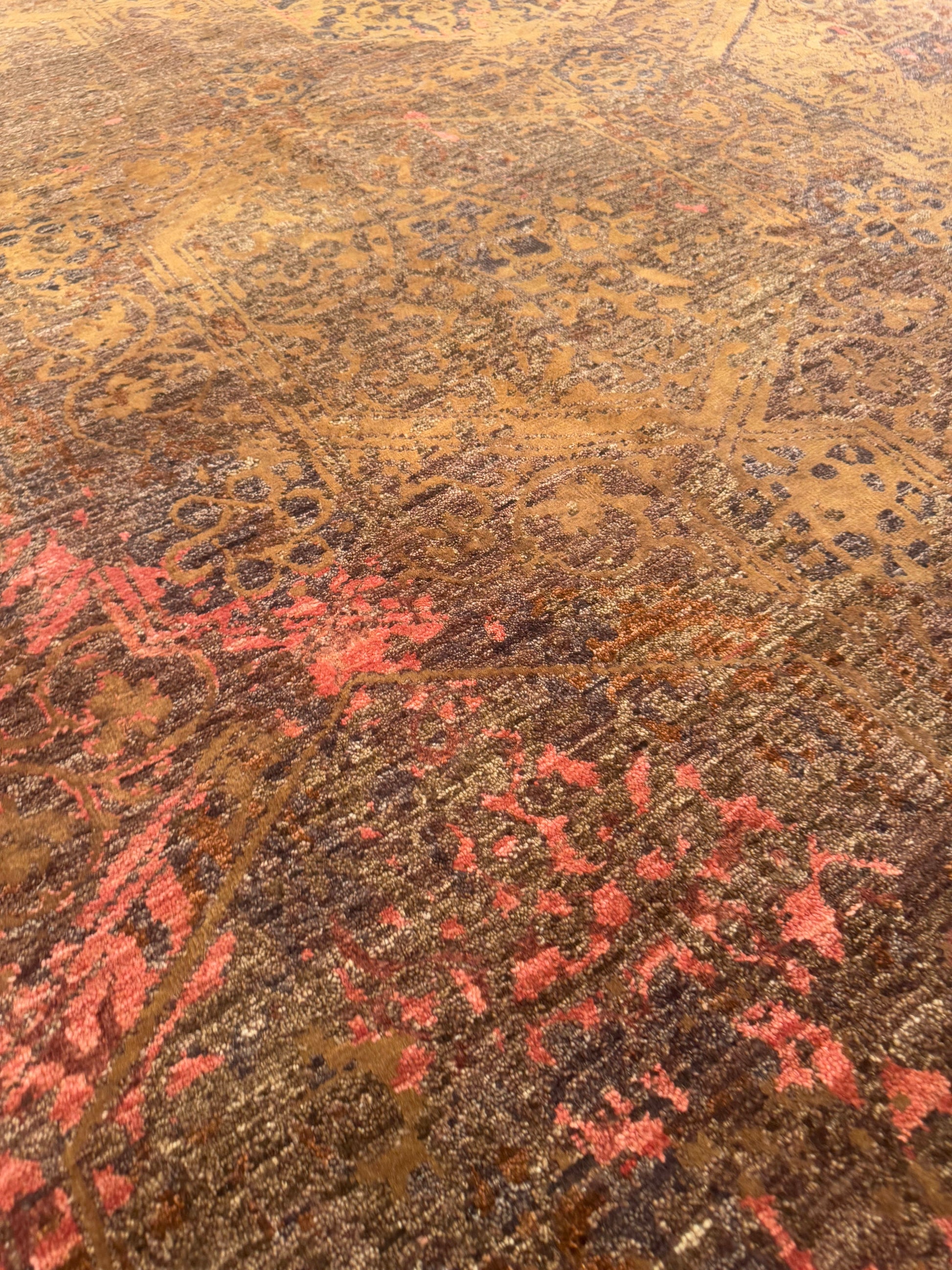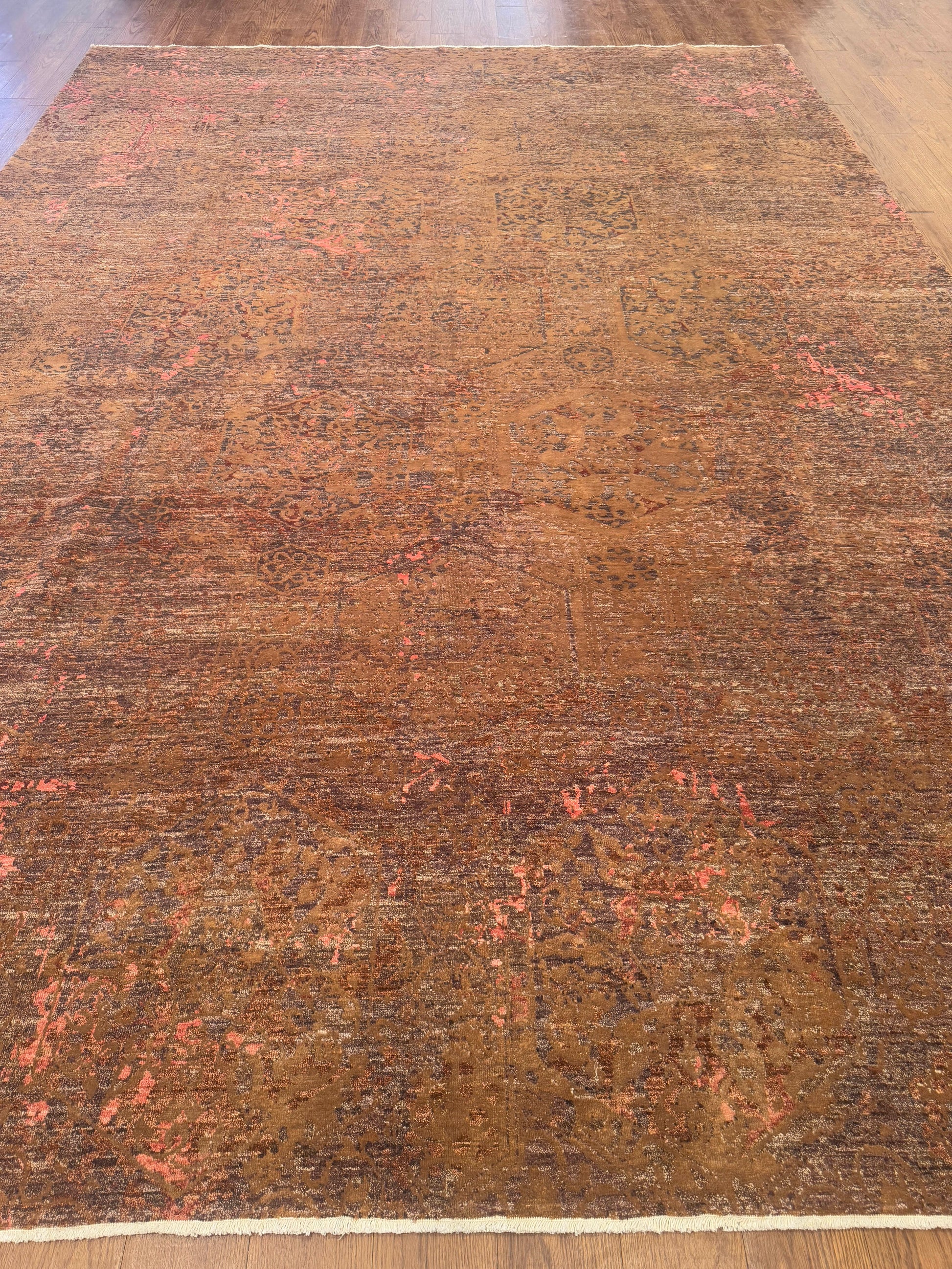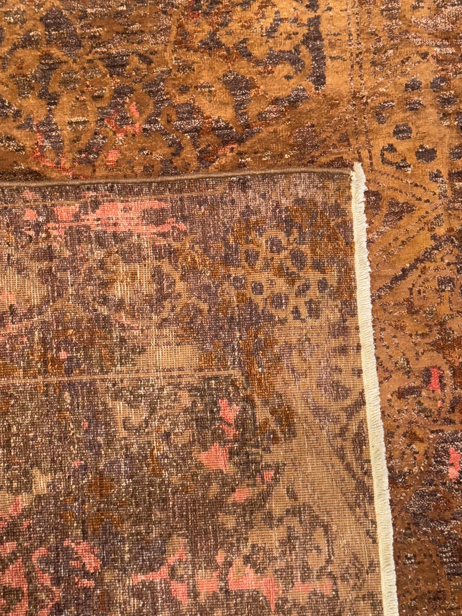This handwoven wool rug features a distressed, overdyed finish that blends deep amber, brown, and subtle coral-red accents. The faded geometric and floral undertones add layers of character, giving it a vintage-inspired yet contemporary aesthetic. Its muted warmth makes it versatile for modern, rustic, or eclectic interiors.