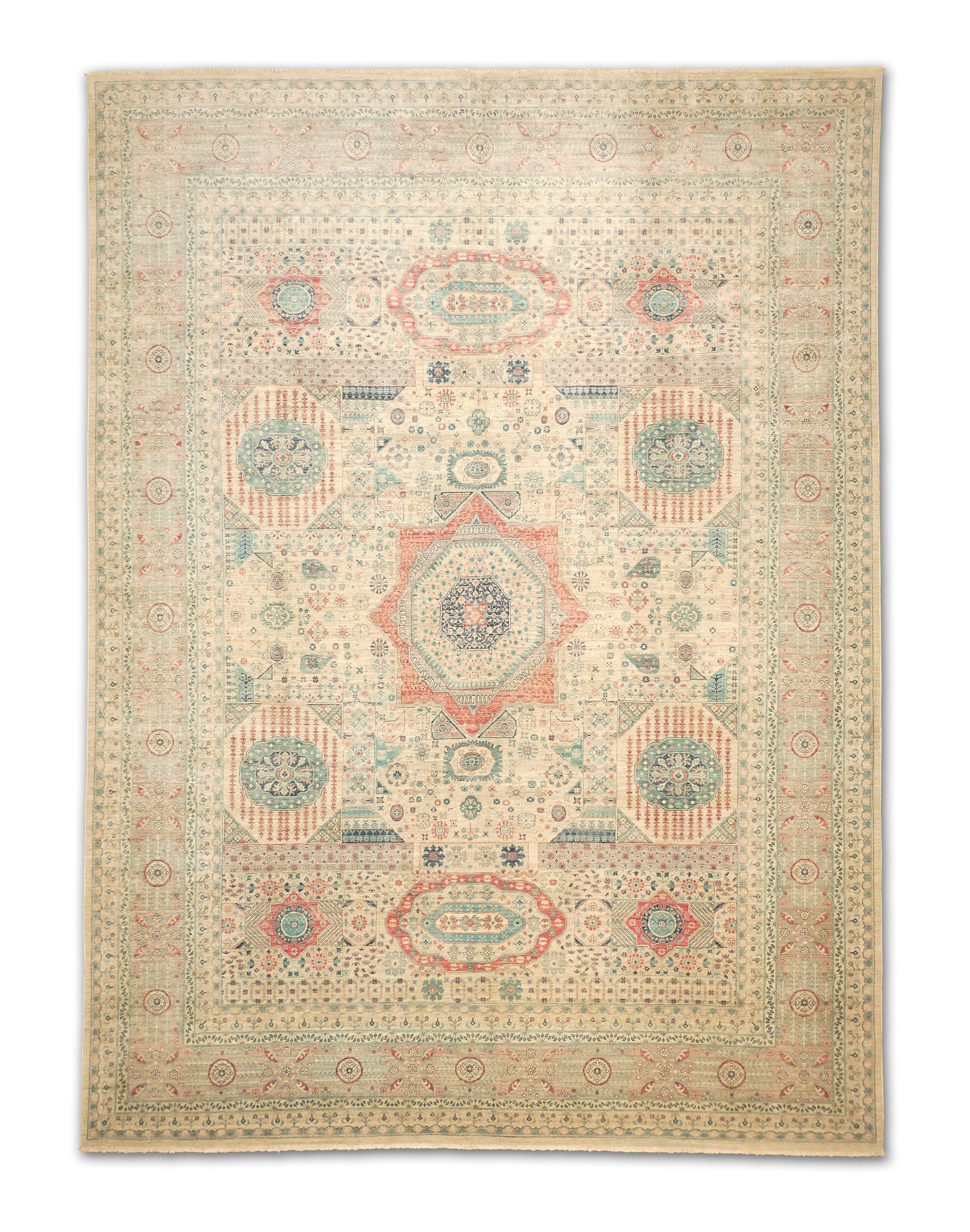 This striking handwoven rug is adorned with a central medallion surrounded by layered geometric motifs and ornate floral accents. Its palette of soft ivory, teal, and coral tones creates a lively yet balanced composition, enhanced by detailed borders rich in botanical patterns. The overall look is both elegant and vibrant, making it a versatile statement piece.