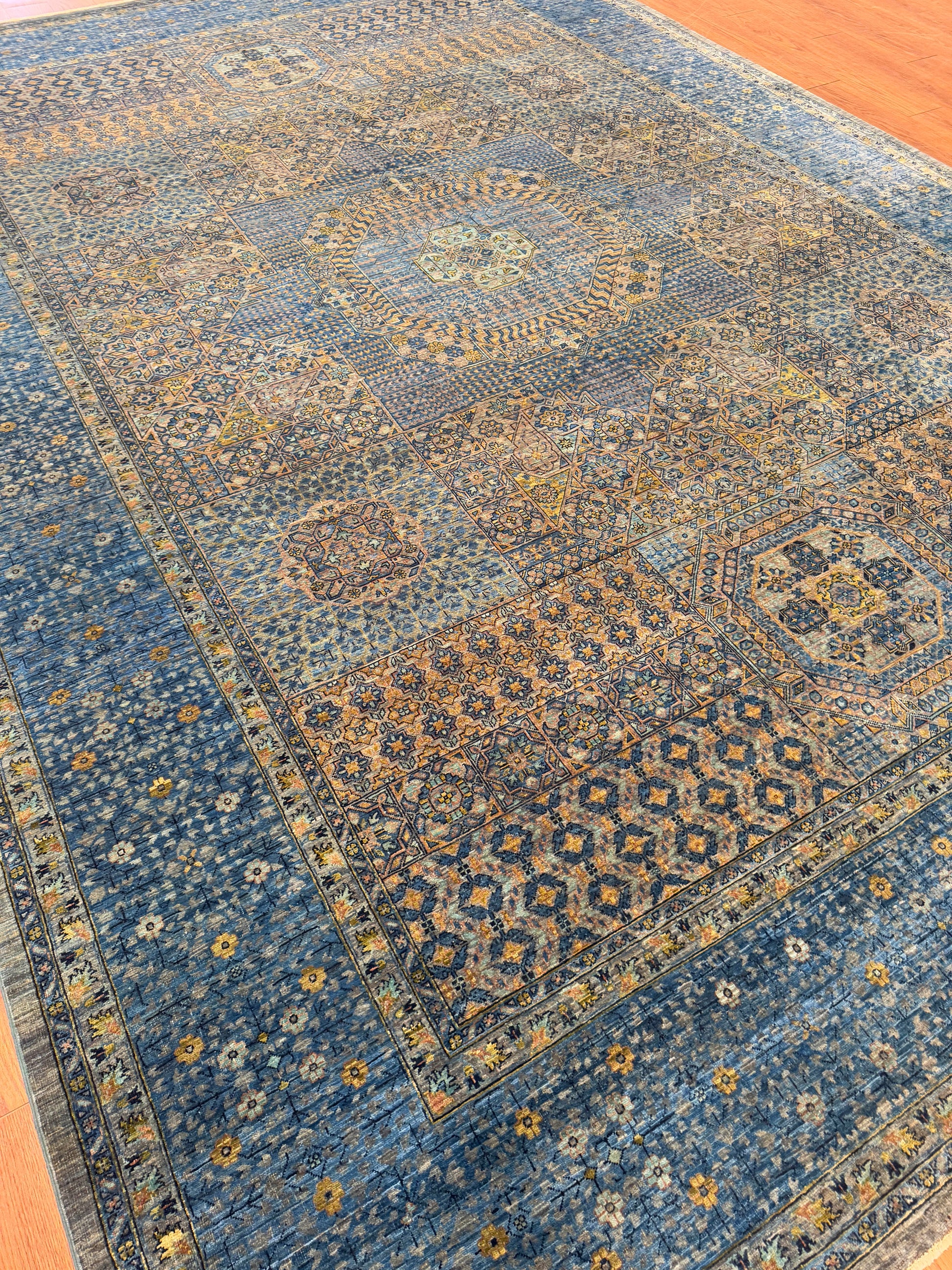 This elegant handwoven rug features a grand central medallion framed by intricate geometric layers and floral latticework. The deep denim and slate blue palette is softened by accents of gold and taupe, creating a refined balance between bold design and subtle sophistication. Its detailed patterning lends a sense of structure, making it an impressive focal point in any room.