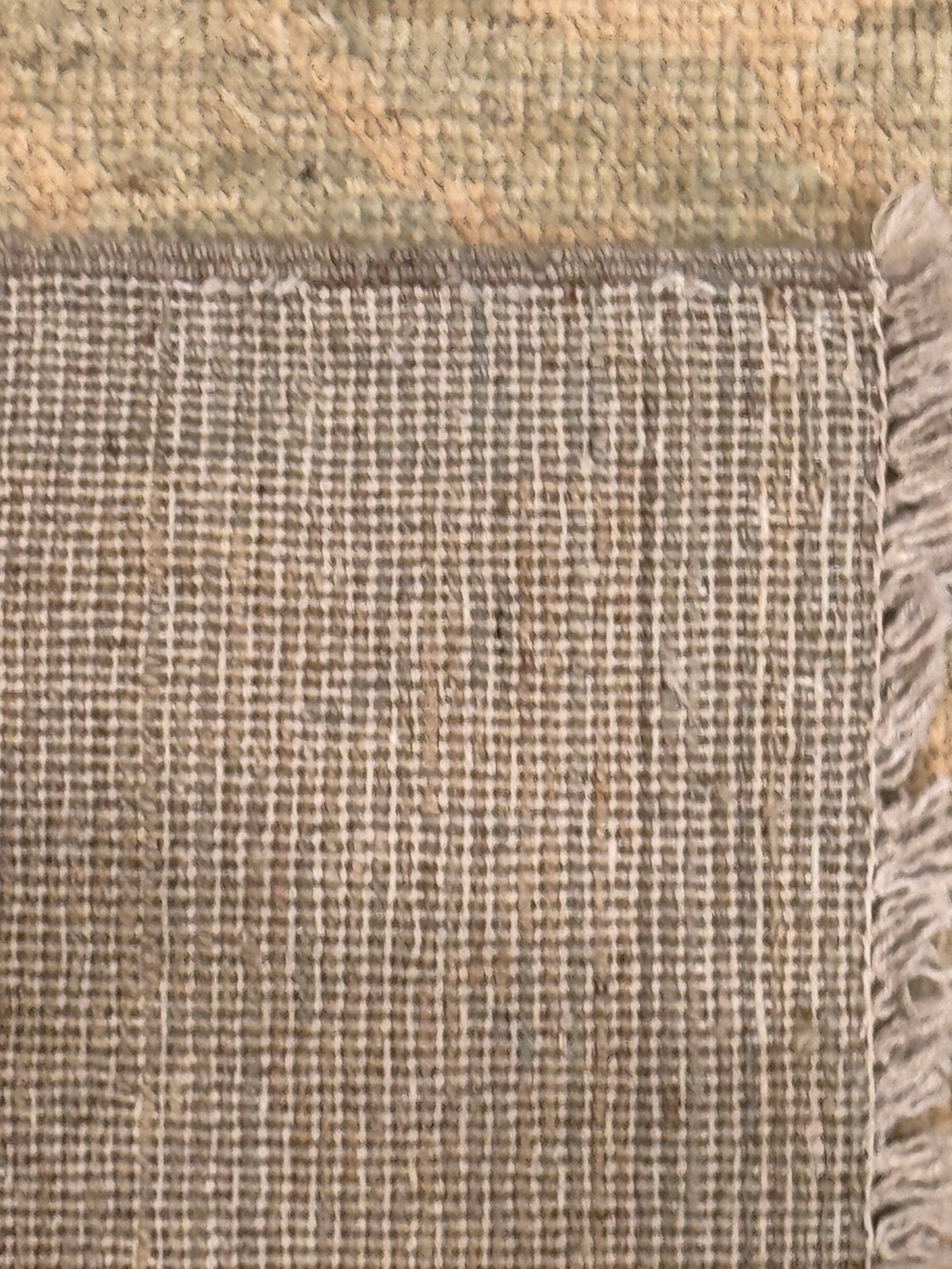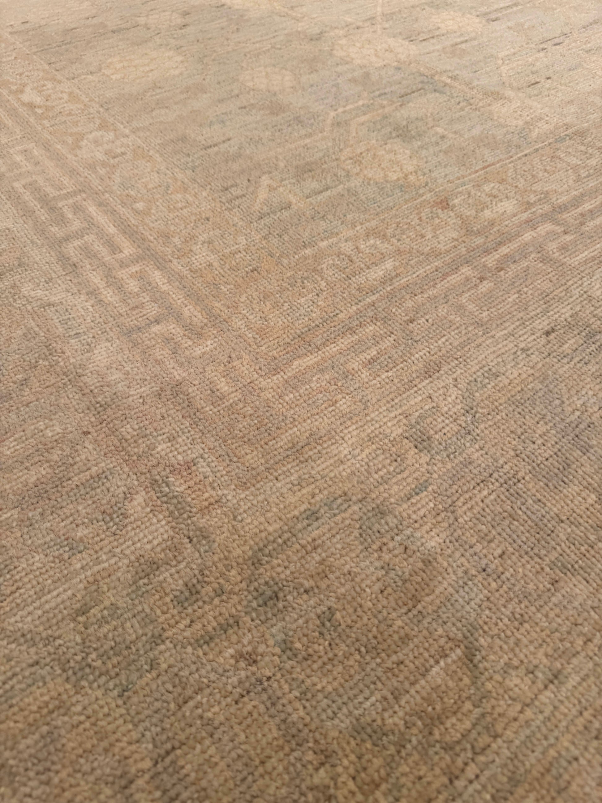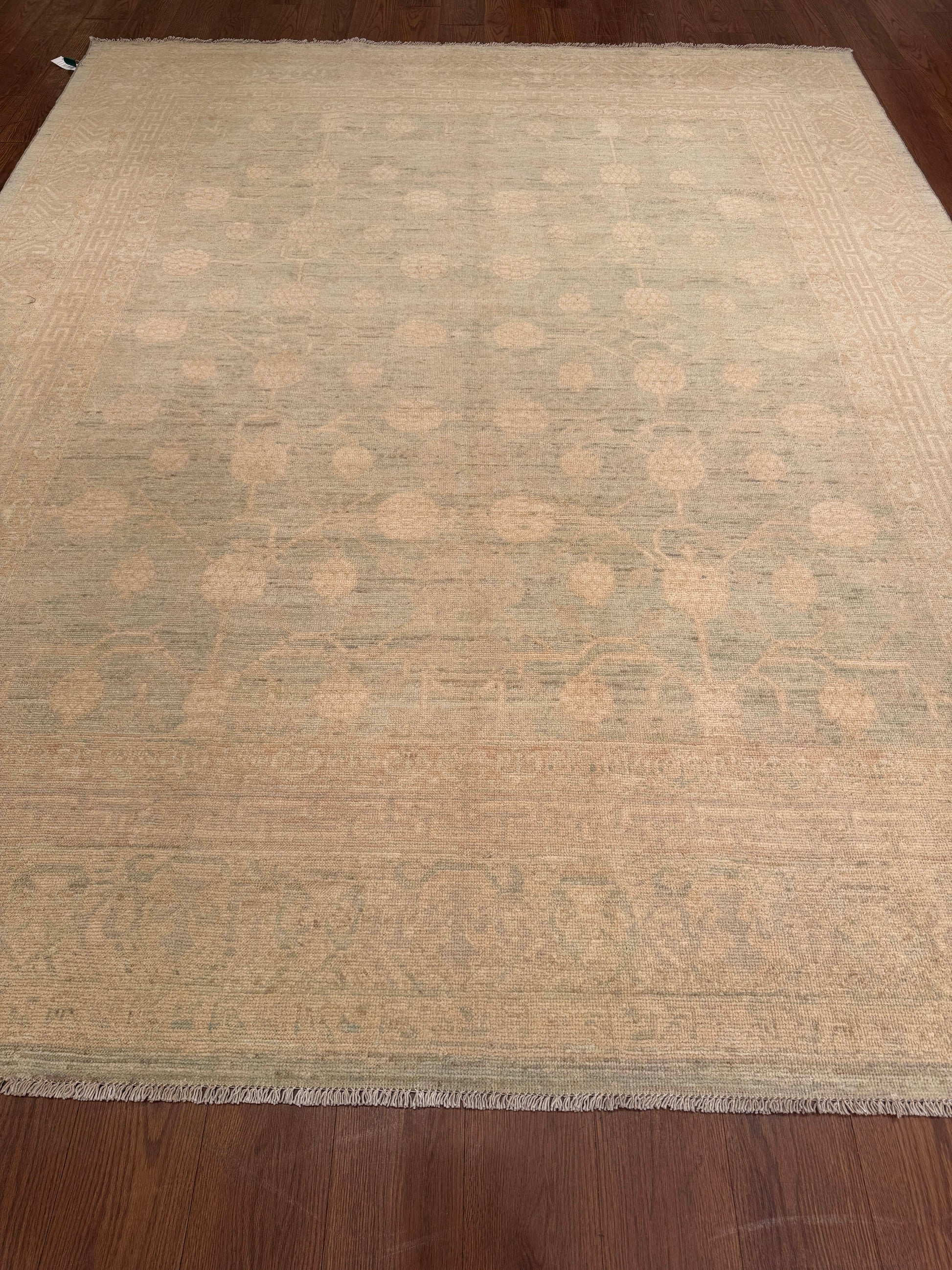 This elegant handwoven rug features a subtle tone-on-tone palette of sandy beige and soft sage green. Its understated pattern of repeating medallion-like floral motifs blends seamlessly into the background, creating a refined and calming aesthetic. With its minimalist appeal and gentle color transitions, this rug is perfect for interiors that embrace quiet luxury and timeless design.