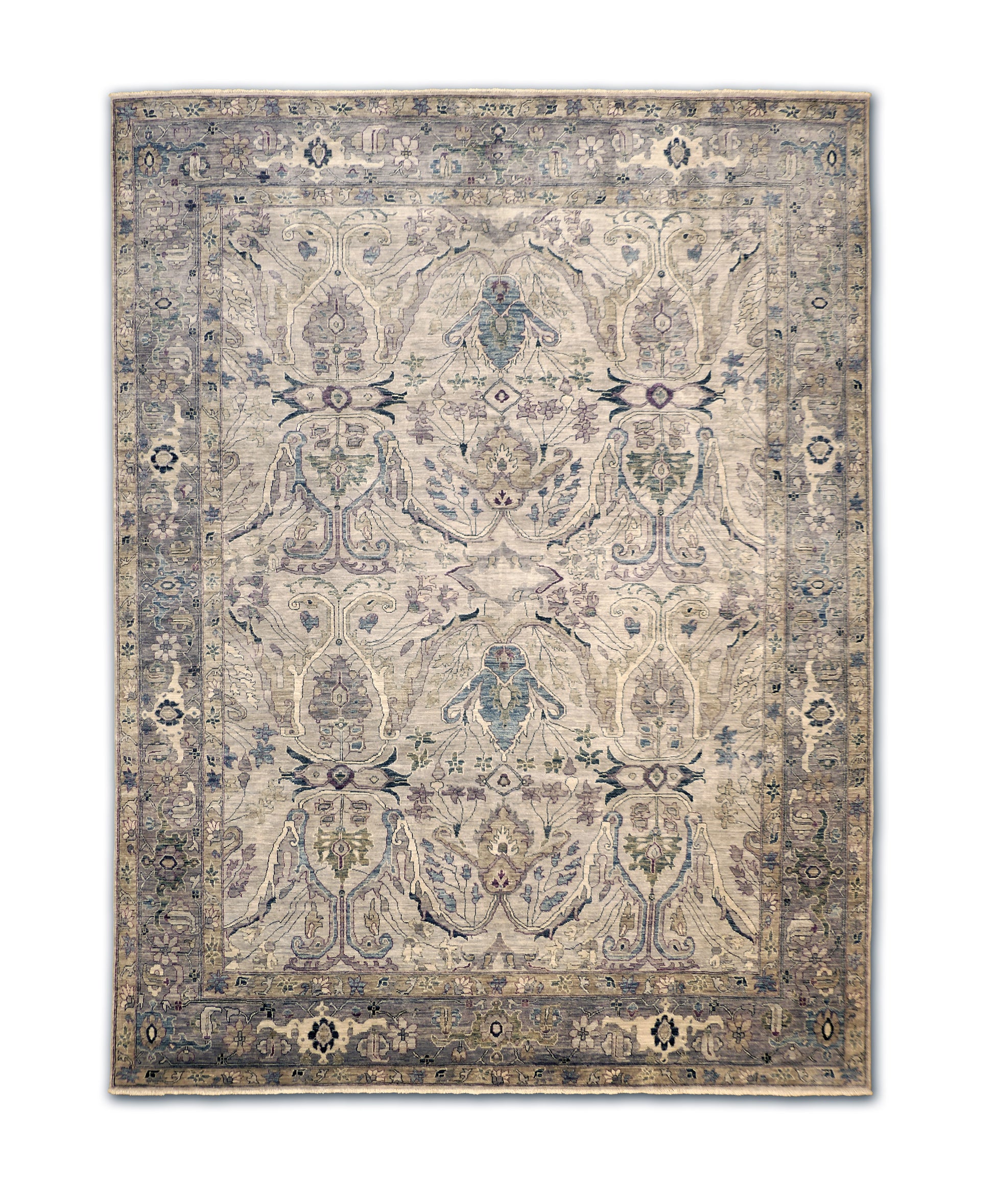 This hand-knotted rug showcases a soft ivory-gray field adorned with large-scale palmettes, floral sprays, and scrolling vines in muted tones of lavender, dusty blue, sage, and taupe. The design is symmetrical and flowing, offering a sense of elegance while maintaining a slightly distressed, vintage character. A wide border filled with floral motifs and delicate vine work frames the rug, making it a versatile piece for refined and transitional spaces.