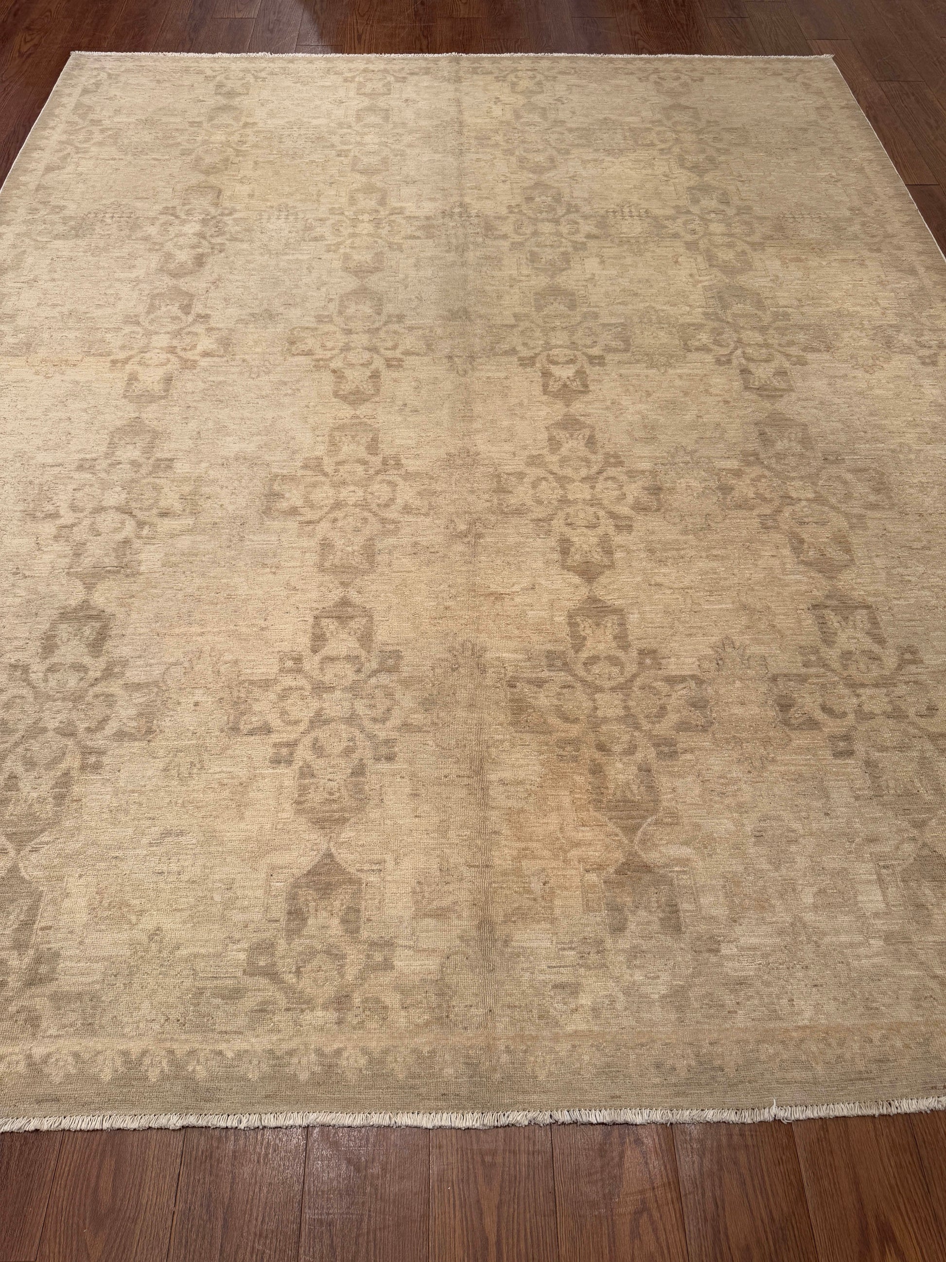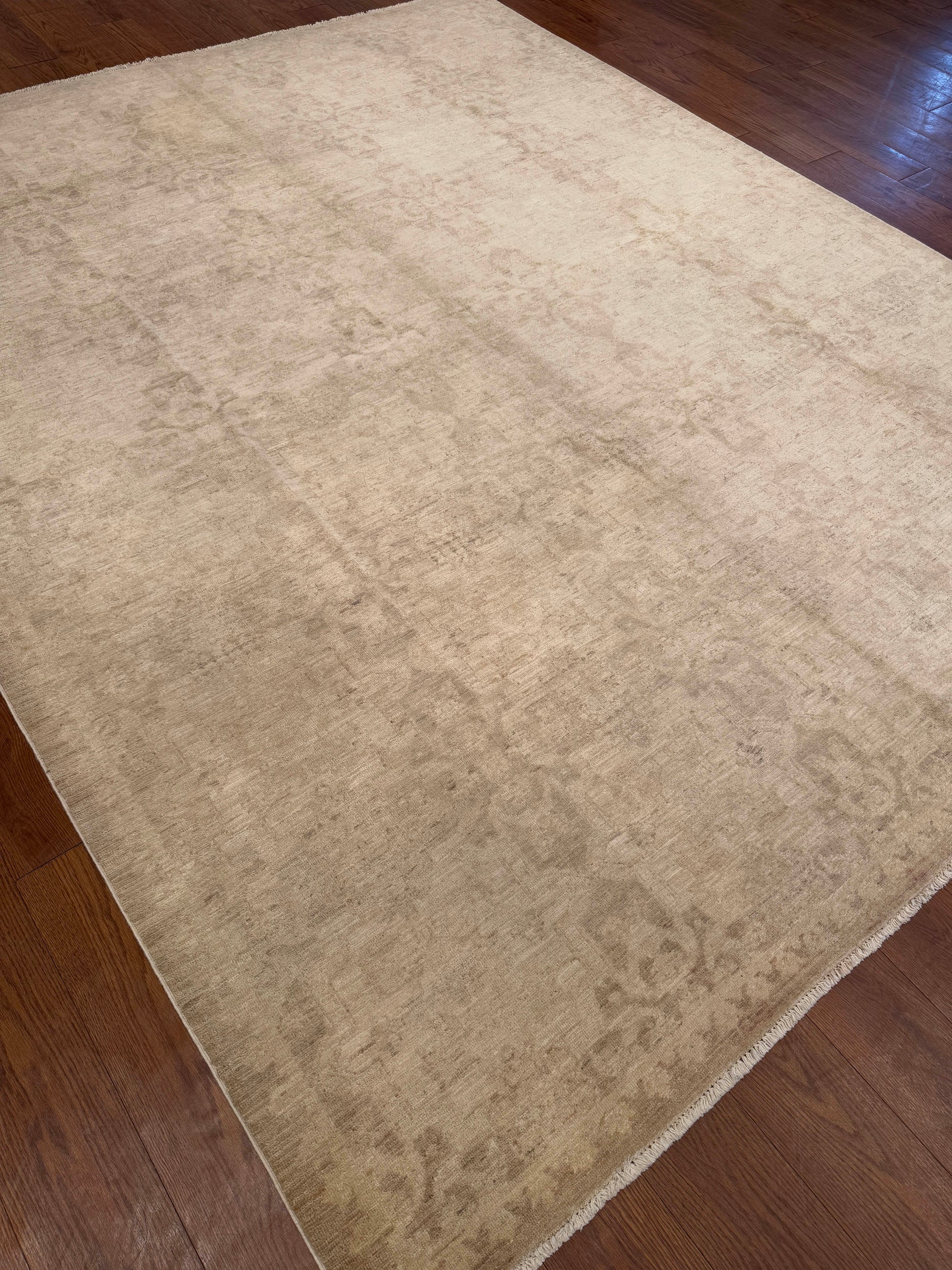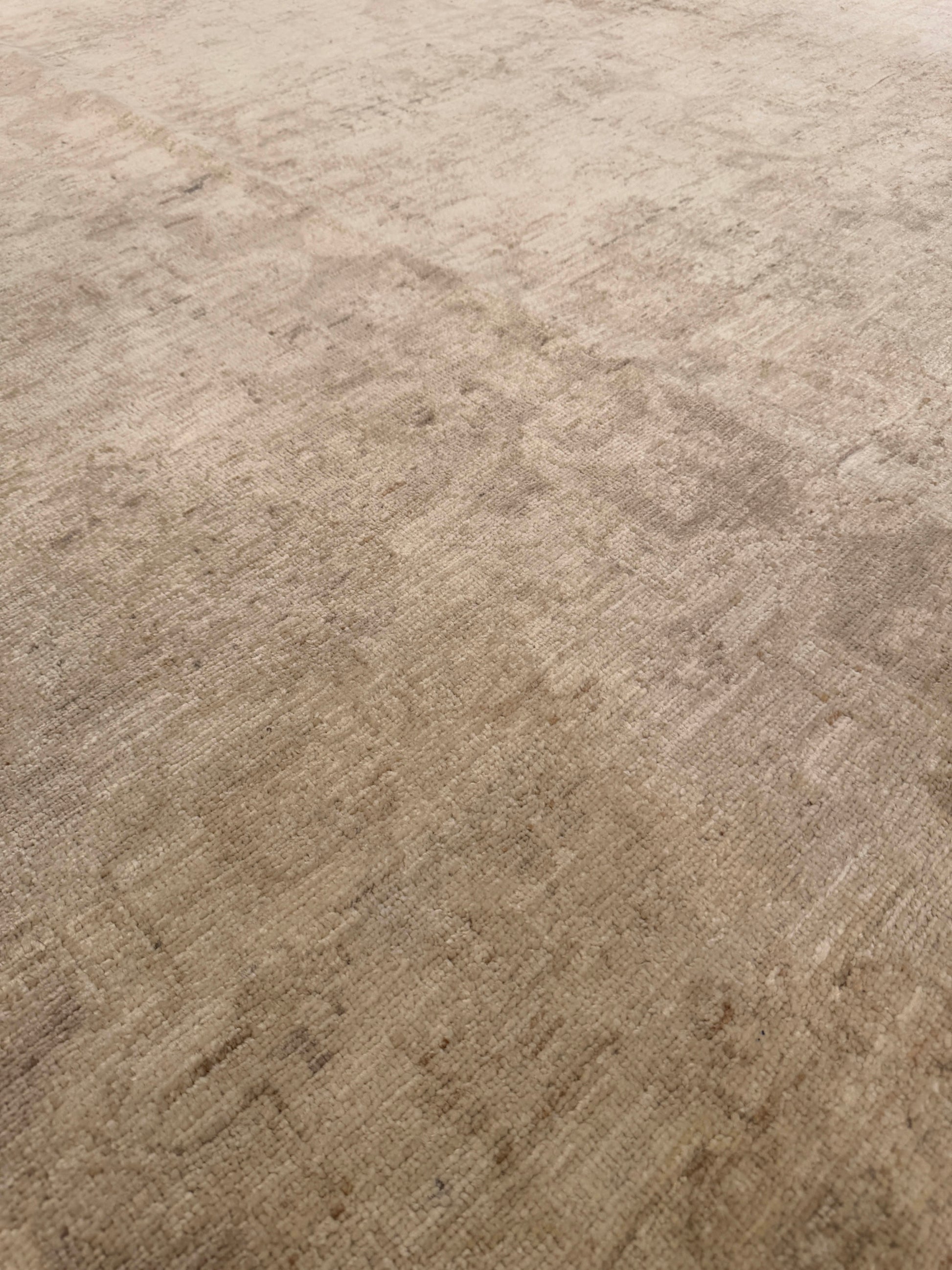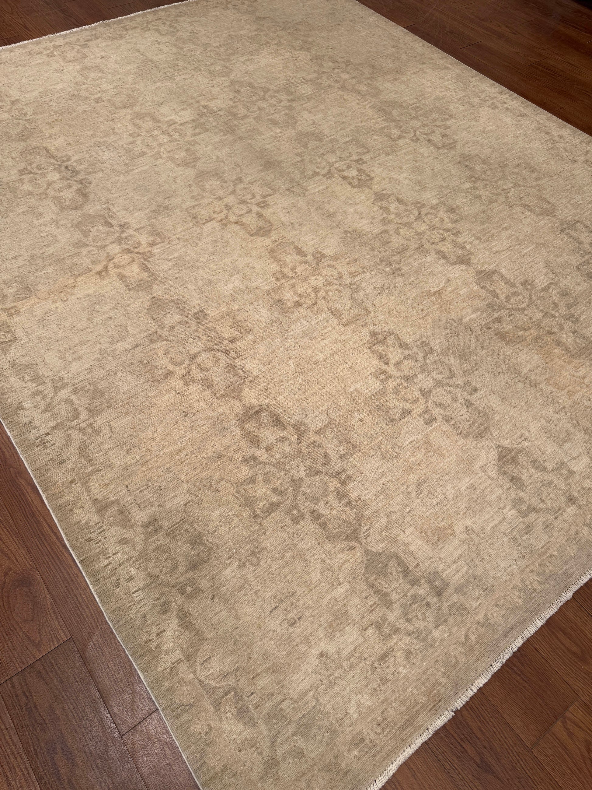 This understated handwoven rug embraces a soft, tonal palette of beige and taupe, creating a soothing and versatile foundation. Its faintly woven patterns emerge subtly within the field, offering depth and texture without overwhelming the space. The understated elegance makes it an ideal choice for interiors seeking a calm, neutral anchor with artisanal charm.