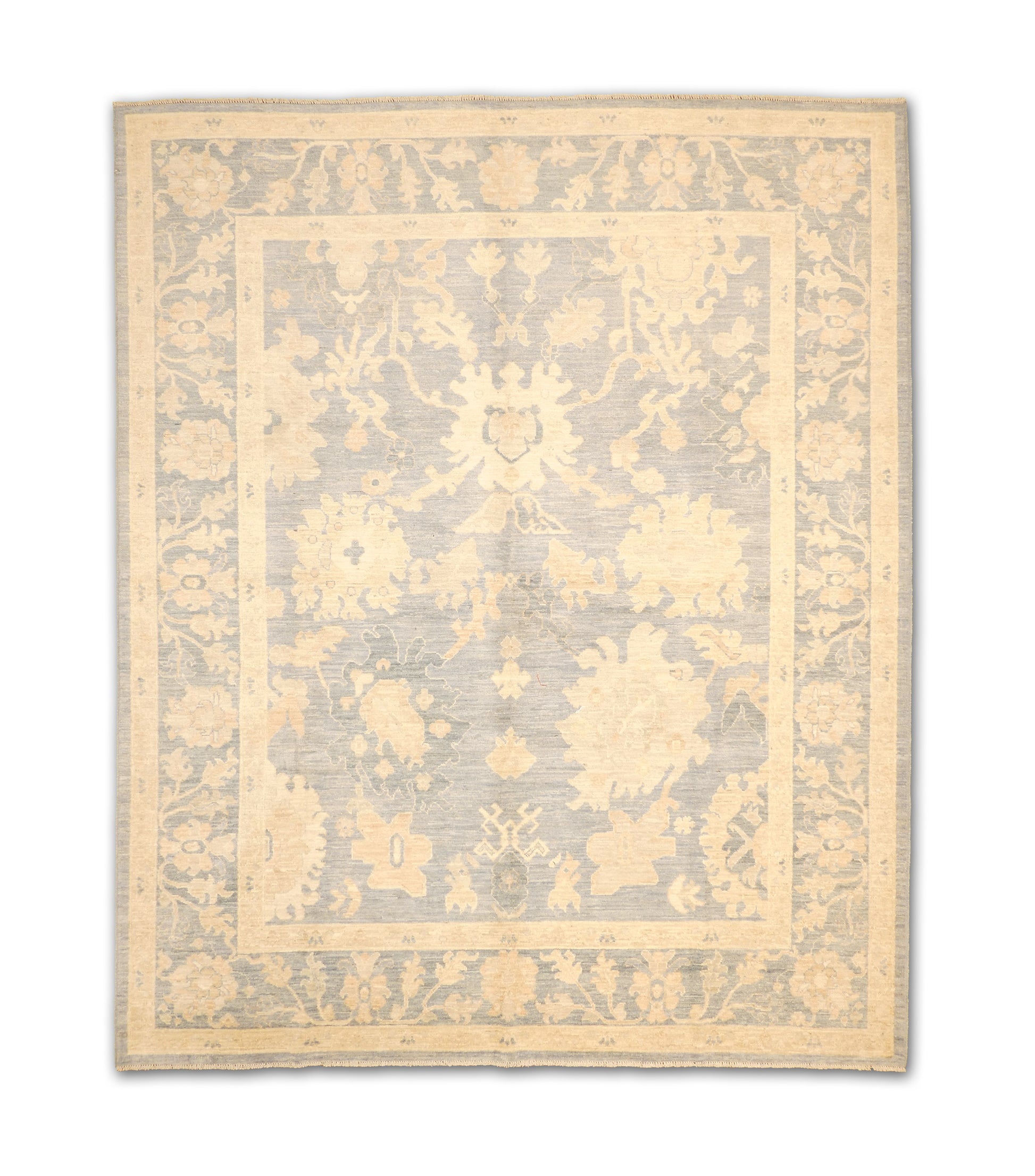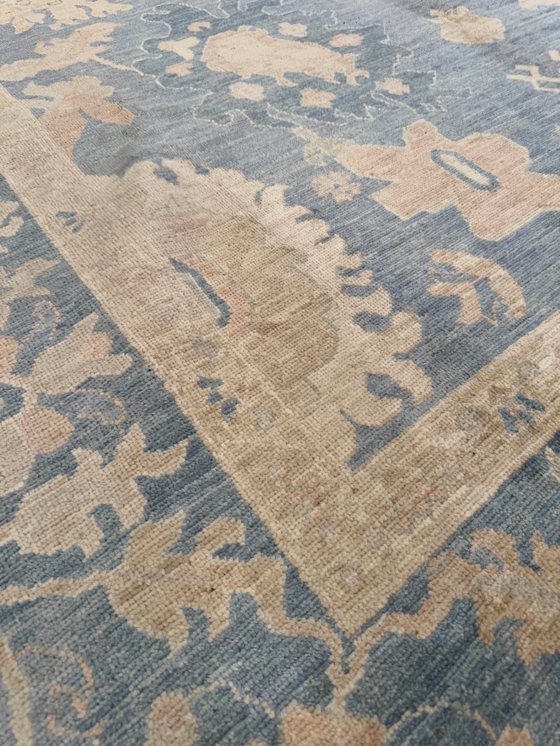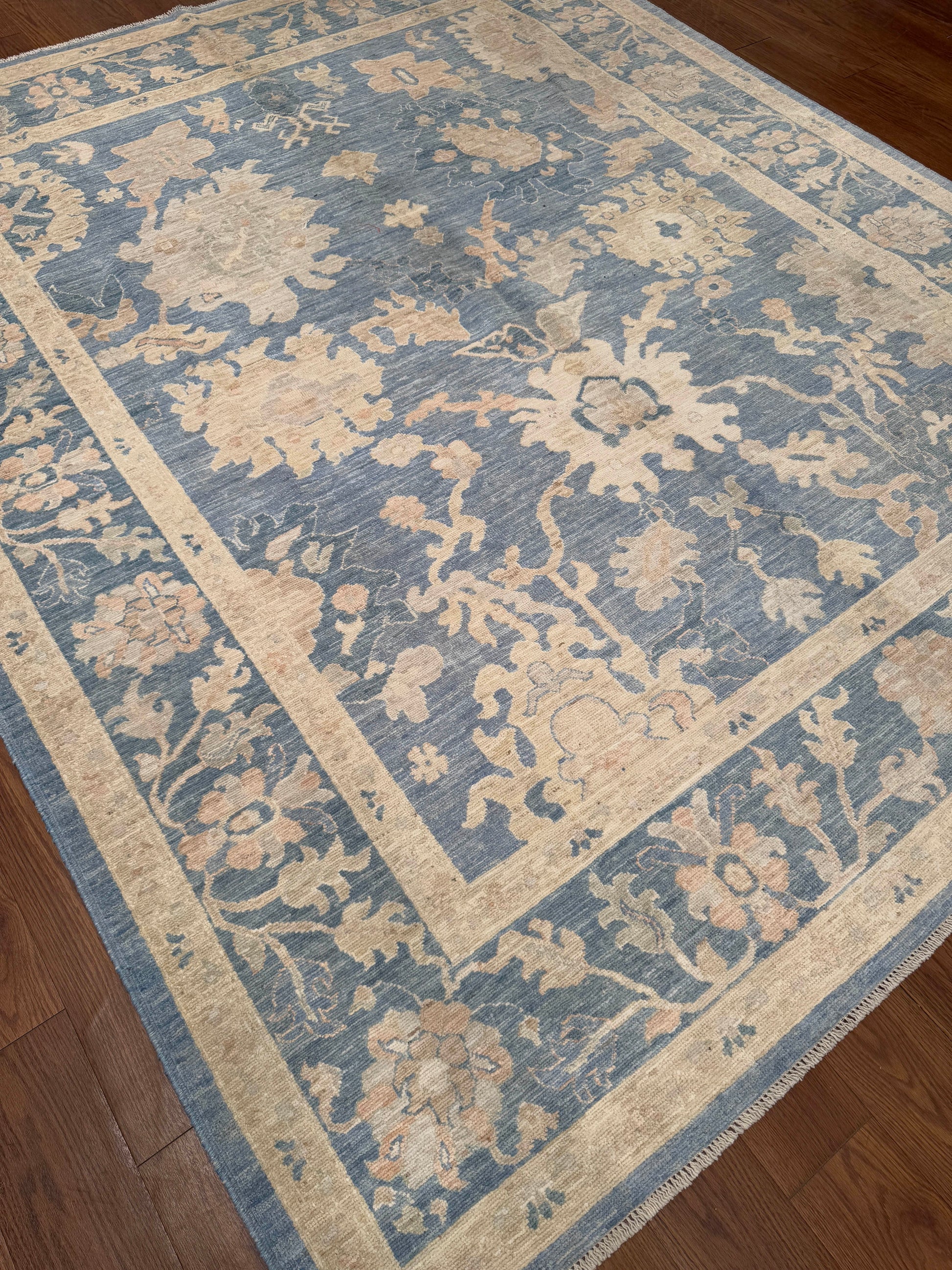This elegant handwoven rug features a serene palette of soft blue, ivory, and beige, offering a calm yet refined aesthetic. Oversized floral and vine motifs spread gracefully across the field, framed by a wide border that balances the overall composition. Its gentle tones and airy design make it a versatile piece, perfect for brightening interiors while maintaining a timeless sense of craftsmanship.