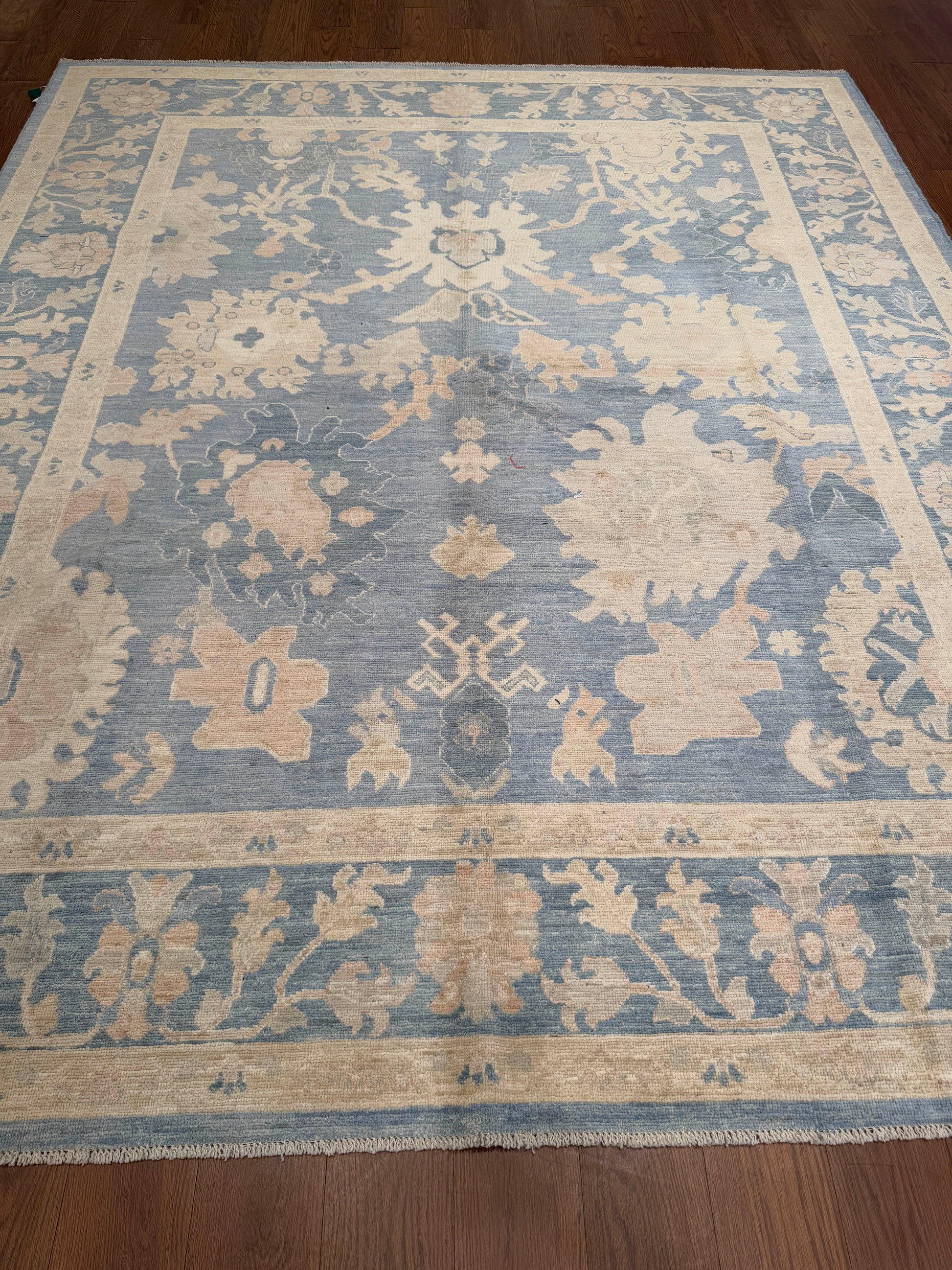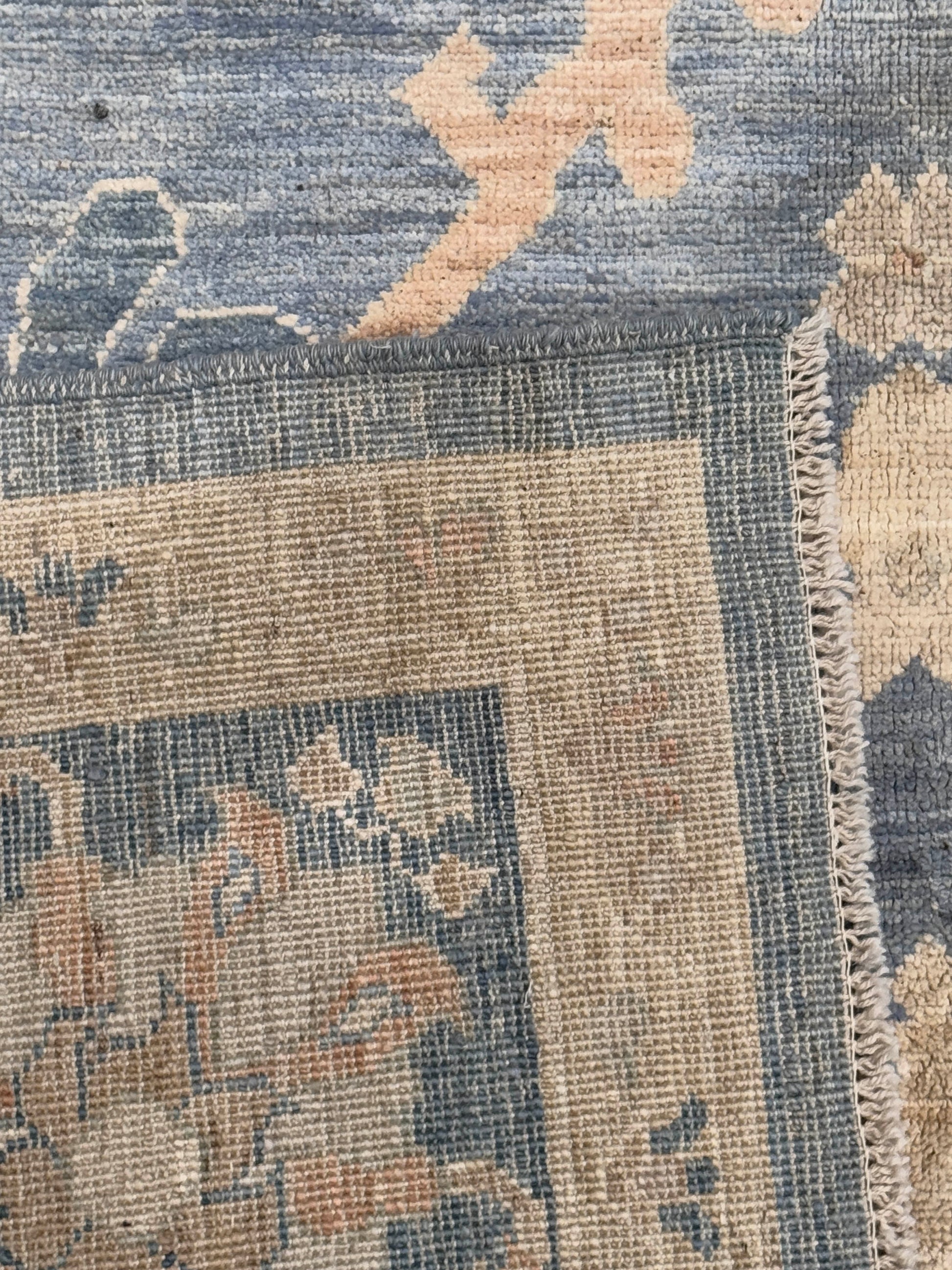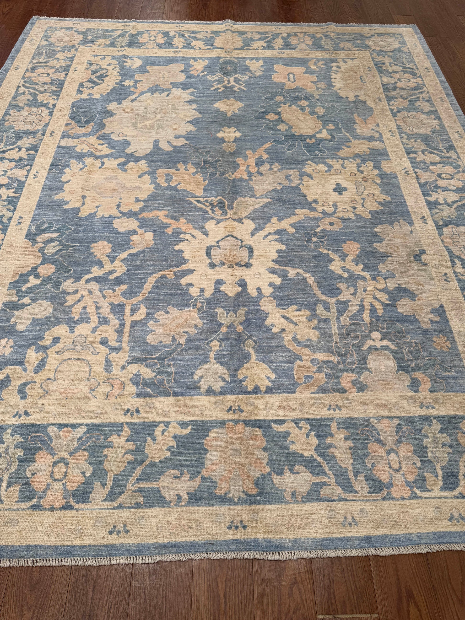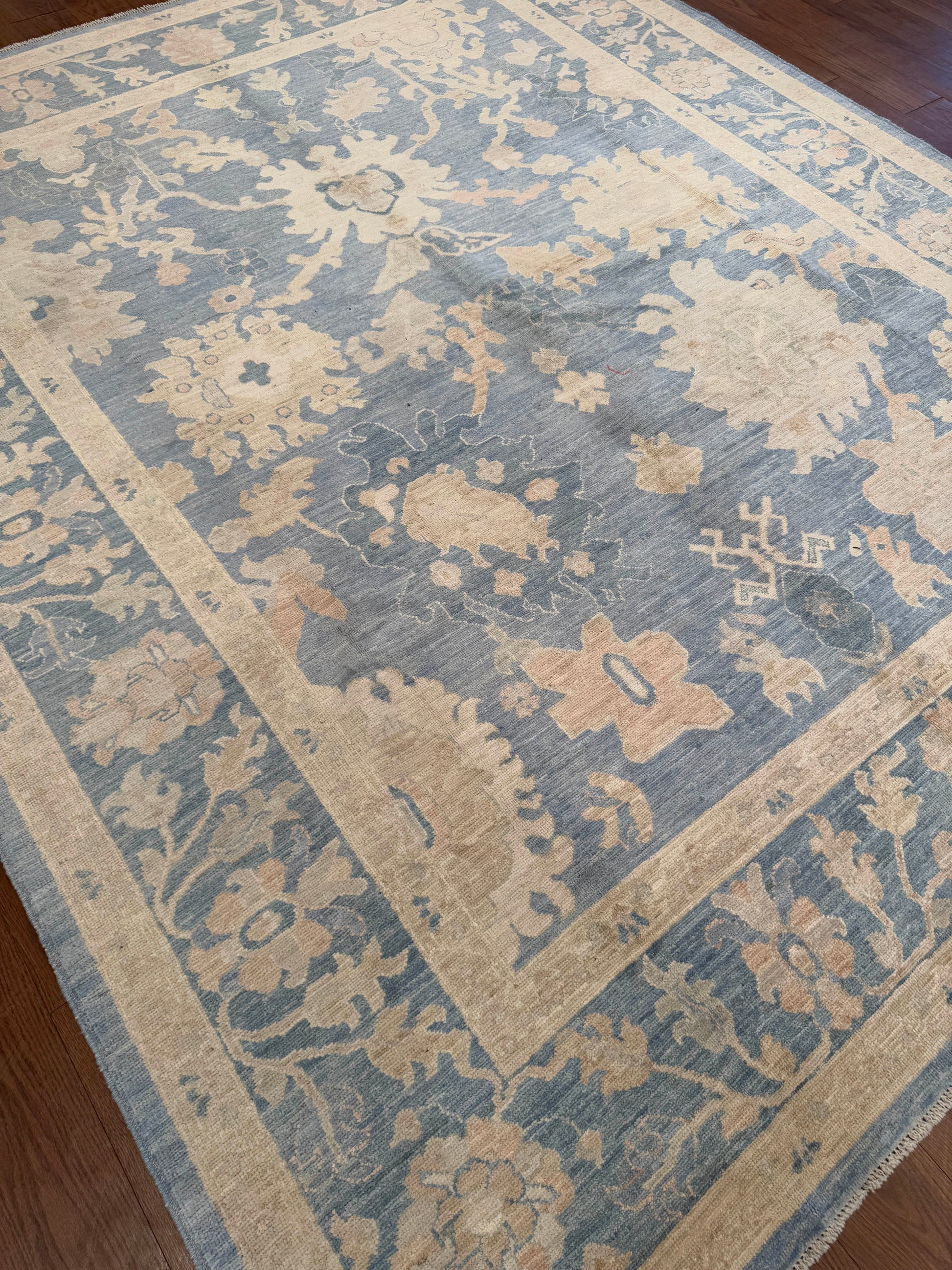 This elegant handwoven rug features a serene palette of soft blue, ivory, and beige, offering a calm yet refined aesthetic. Oversized floral and vine motifs spread gracefully across the field, framed by a wide border that balances the overall composition. Its gentle tones and airy design make it a versatile piece, perfect for brightening interiors while maintaining a timeless sense of craftsmanship.