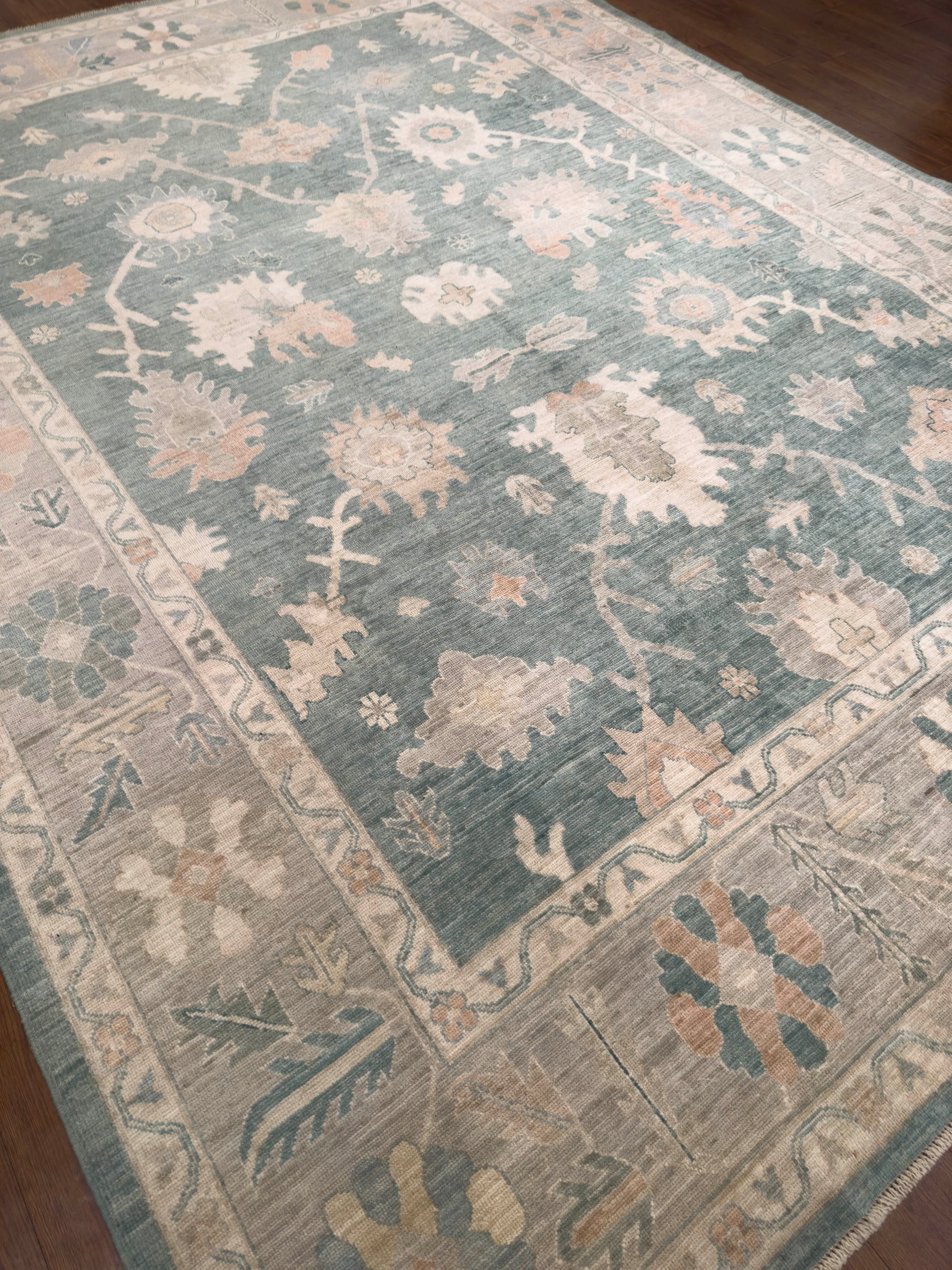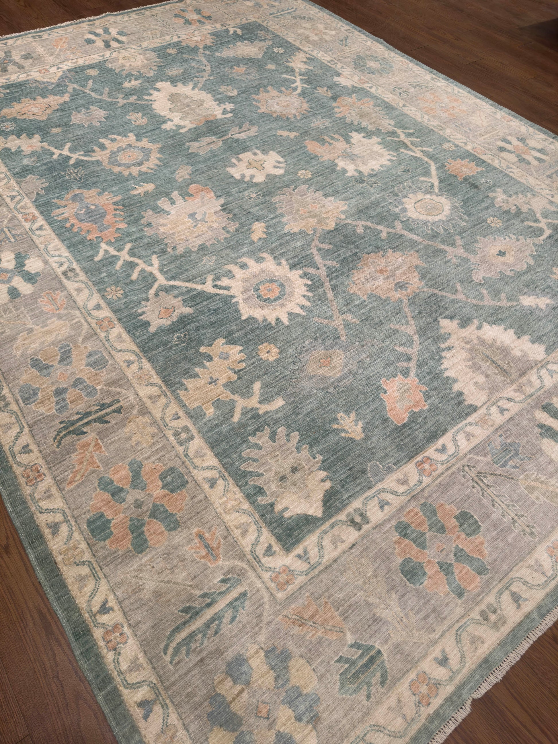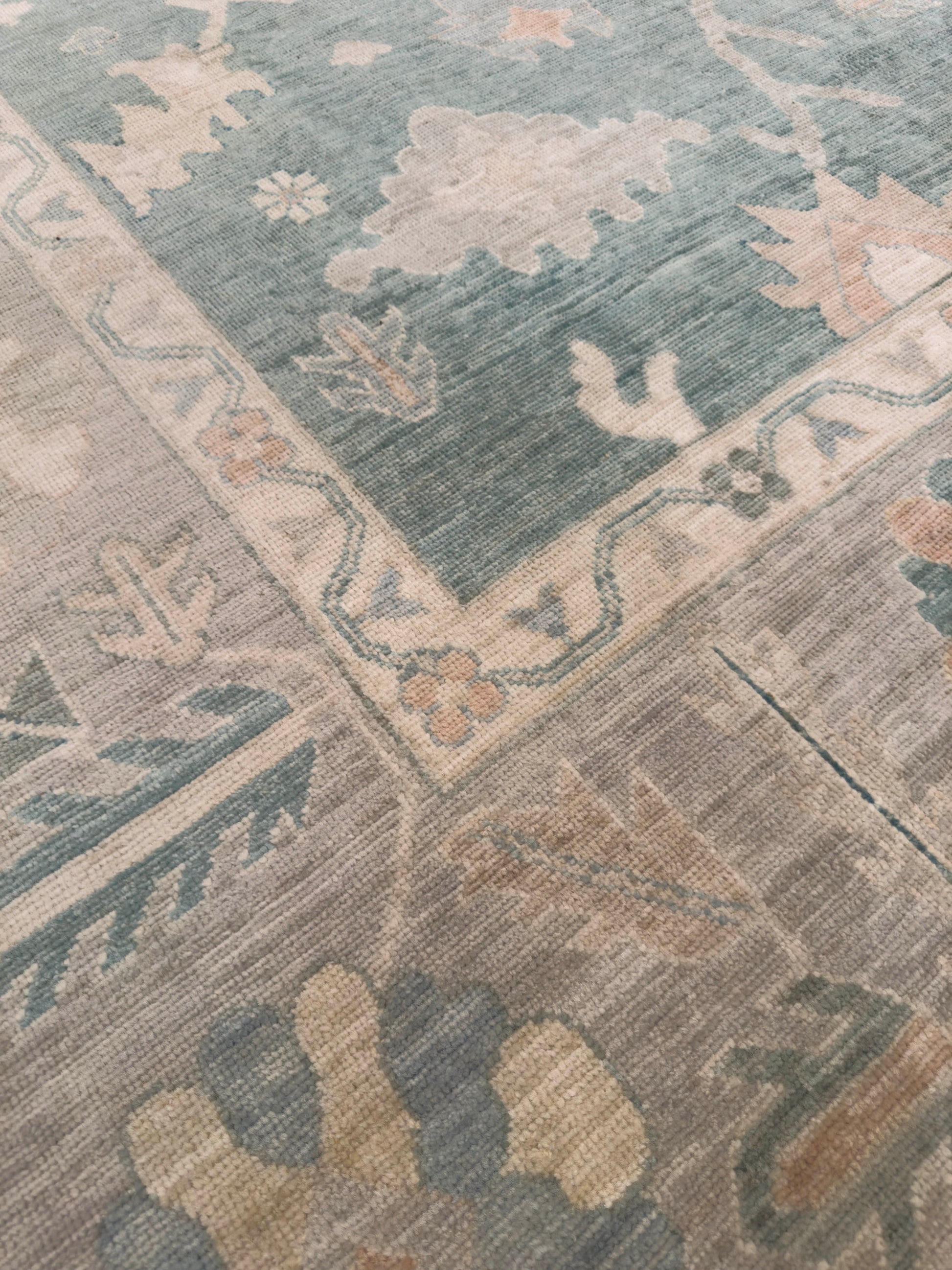 This hand-knotted rug features a refreshing aqua-blue field adorned with large-scale floral and palmette motifs in soft ivory, beige, and muted peach. The spacious, open design is framed by a wide border that echoes the botanical elements, giving the rug balance and harmony. Its gentle palette and traditional layout make it an elegant choice for light, airy interiors.