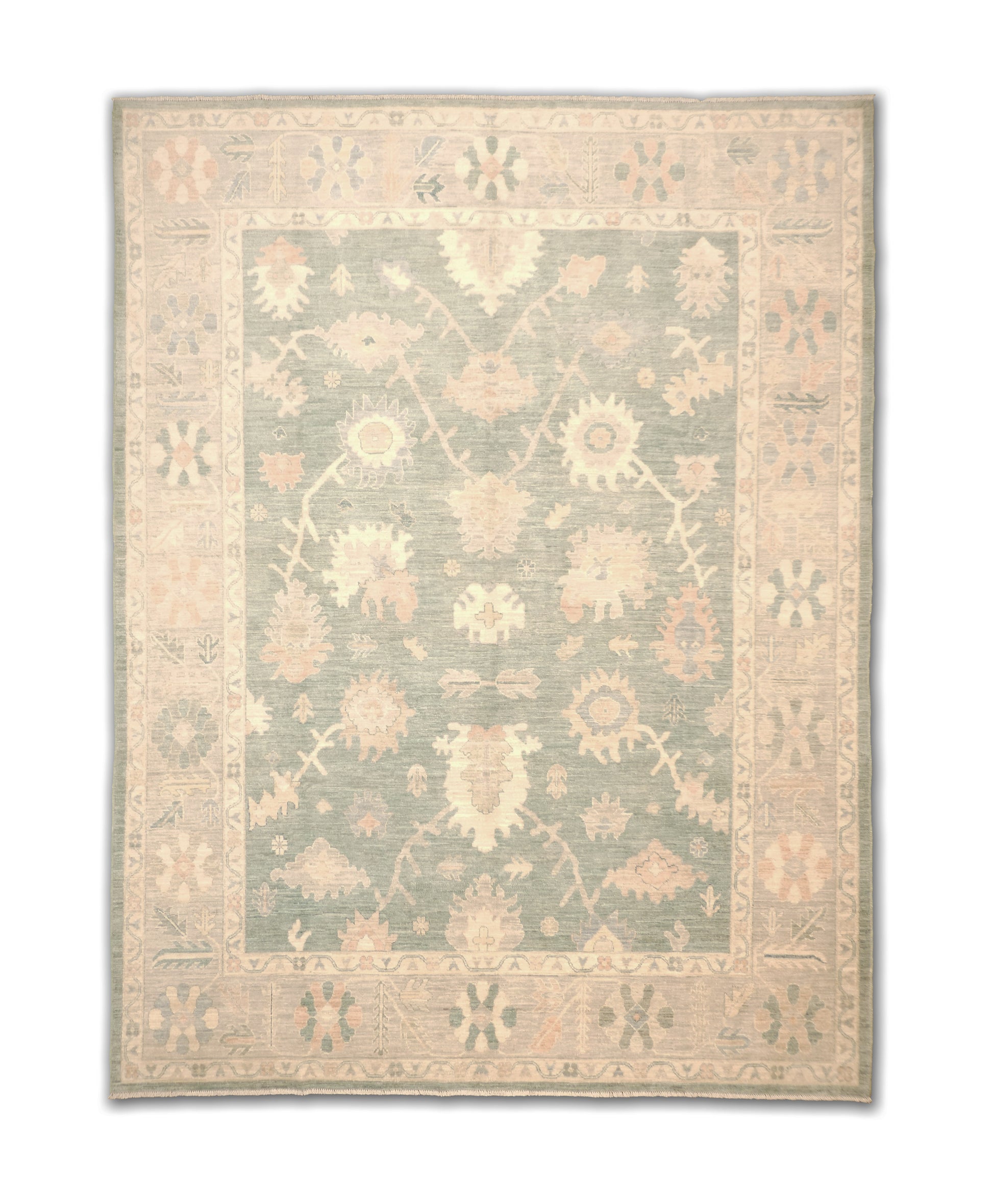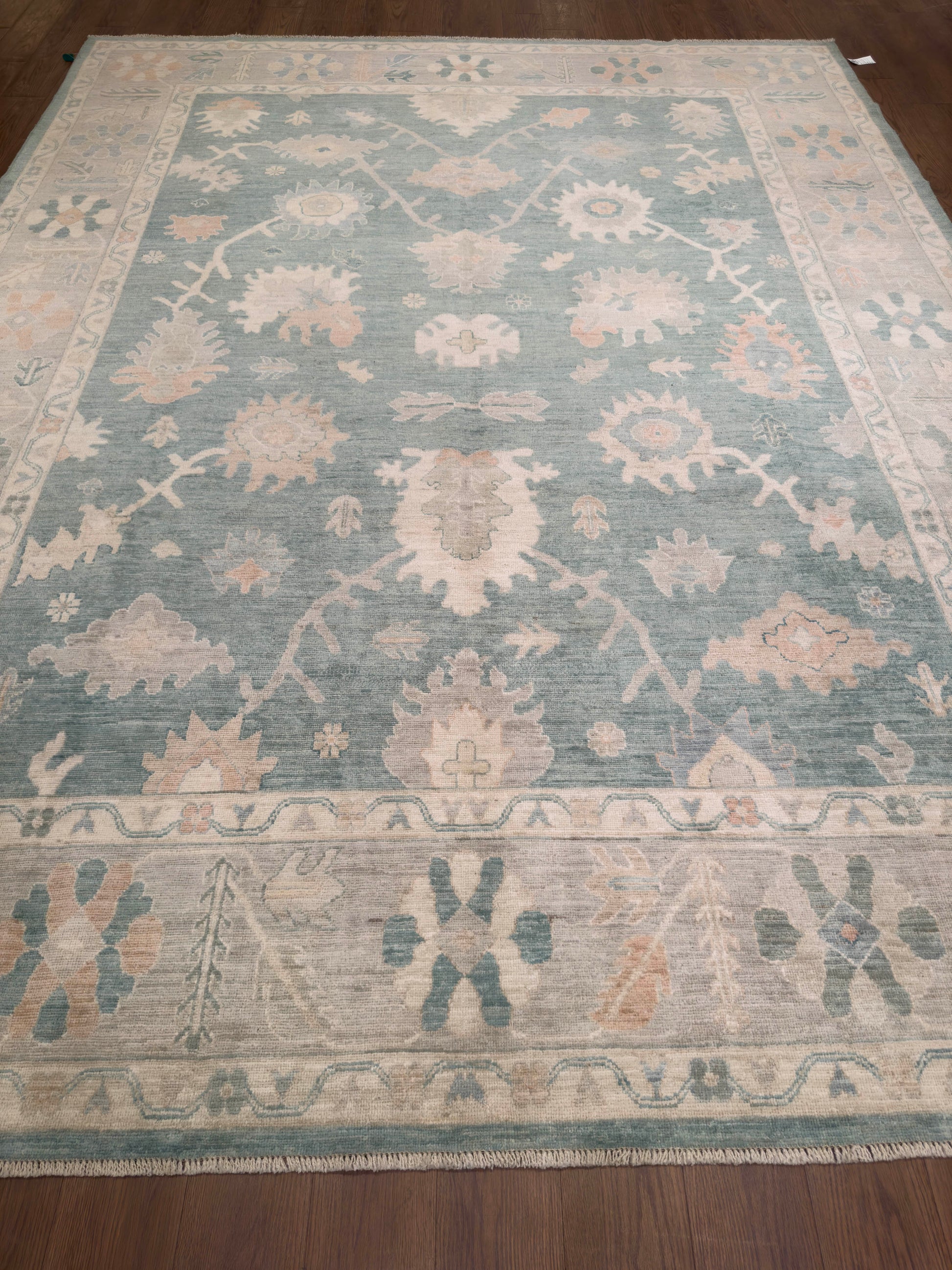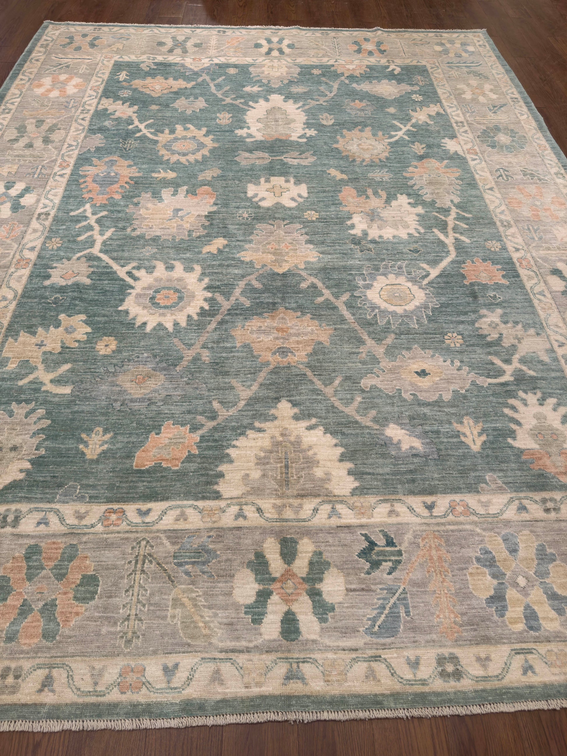 This hand-knotted rug features a refreshing aqua-blue field adorned with large-scale floral and palmette motifs in soft ivory, beige, and muted peach. The spacious, open design is framed by a wide border that echoes the botanical elements, giving the rug balance and harmony. Its gentle palette and traditional layout make it an elegant choice for light, airy interiors.