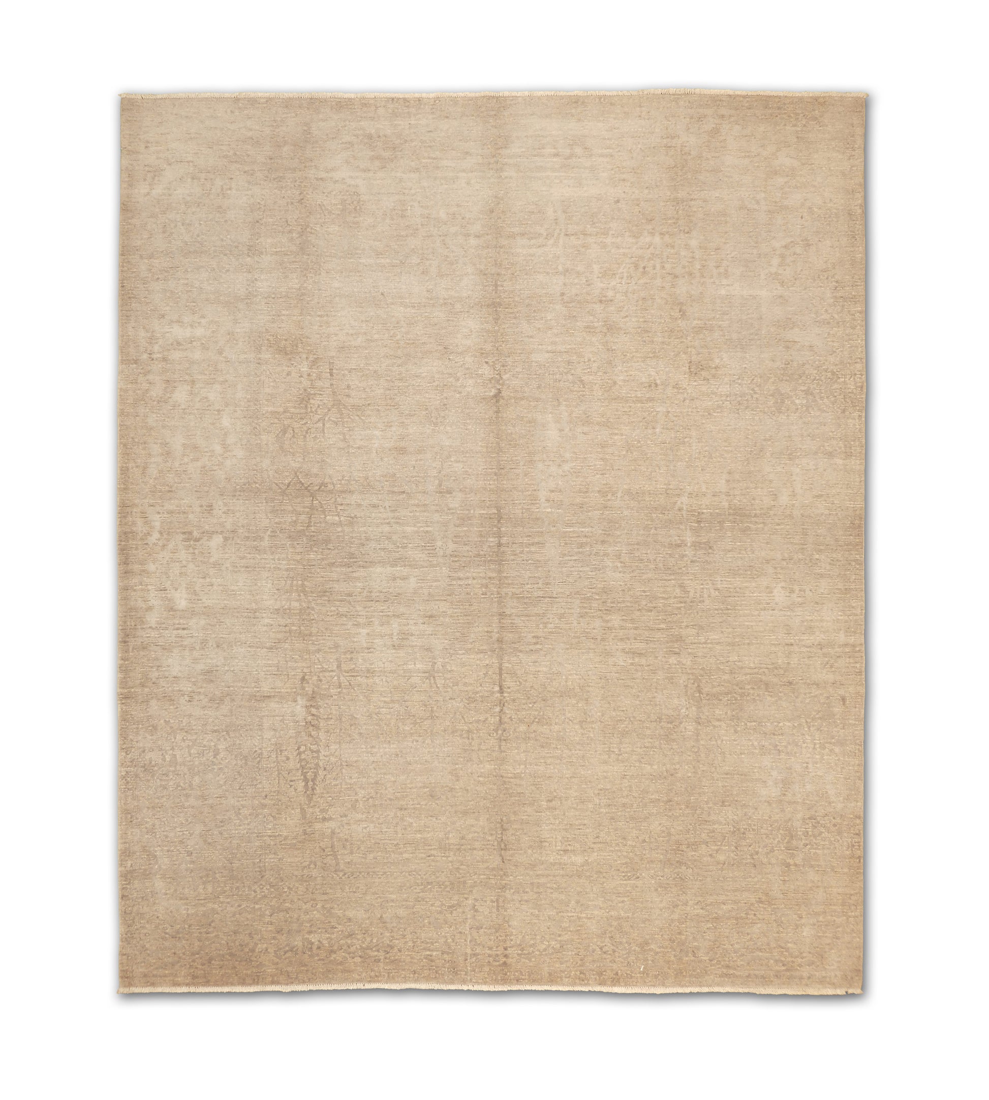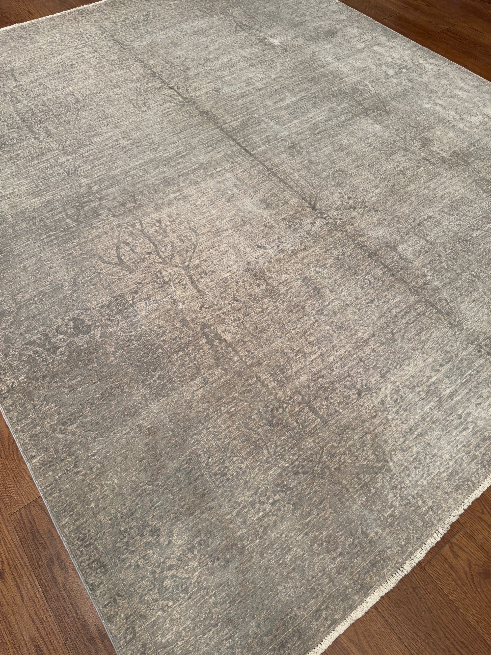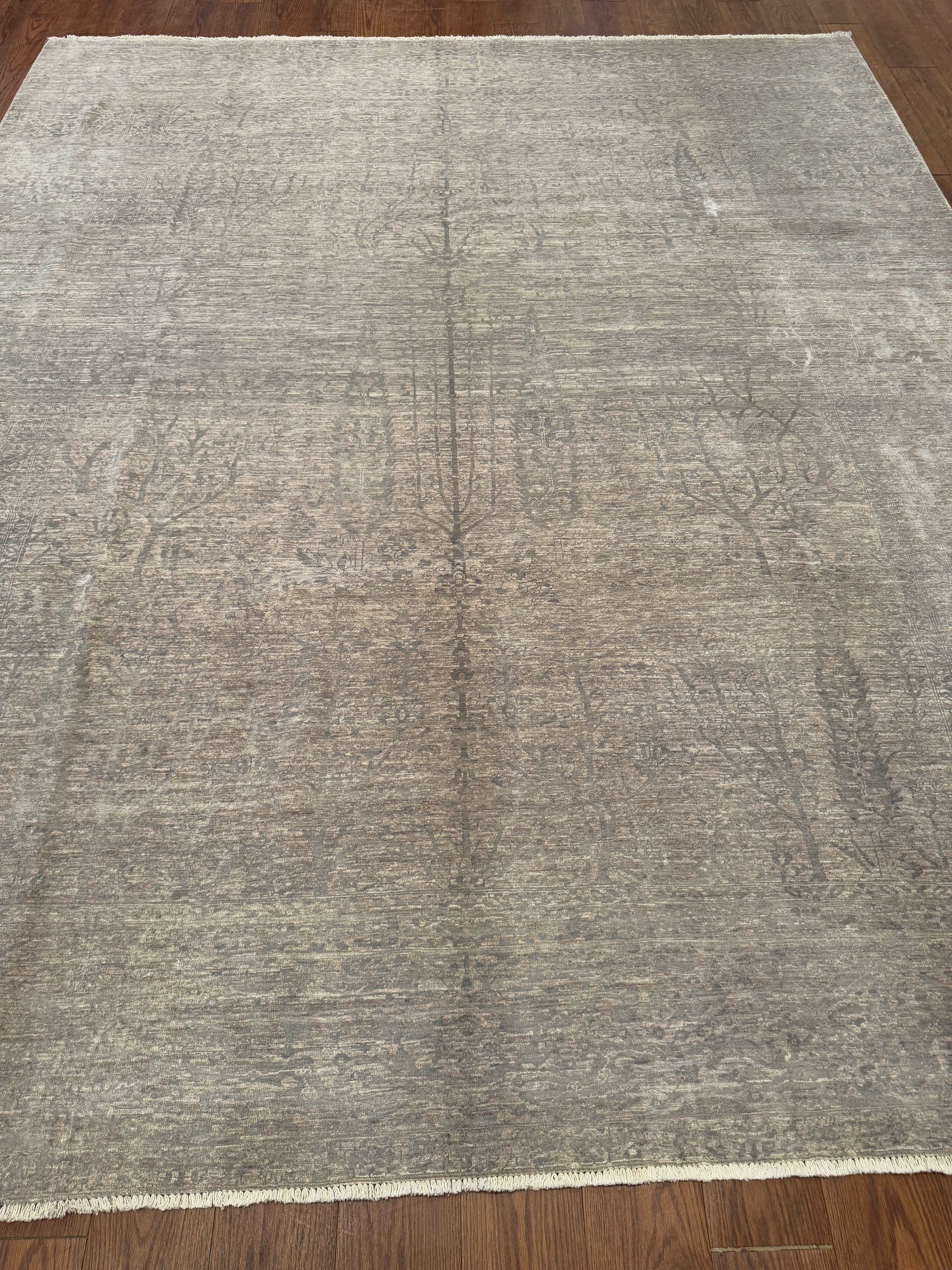 This understated handwoven rug embraces a soft, monochromatic palette of taupe, gray, and muted beige. Subtle tree and branch motifs emerge across the field, lending it a serene, nature-inspired character. Its delicate design blends seamlessly with the background, creating a calming, almost tone-on-tone effect that feels both modern and timeless. Perfect for interiors seeking quiet sophistication, this piece offers versatility and elegance without overpowering the space.