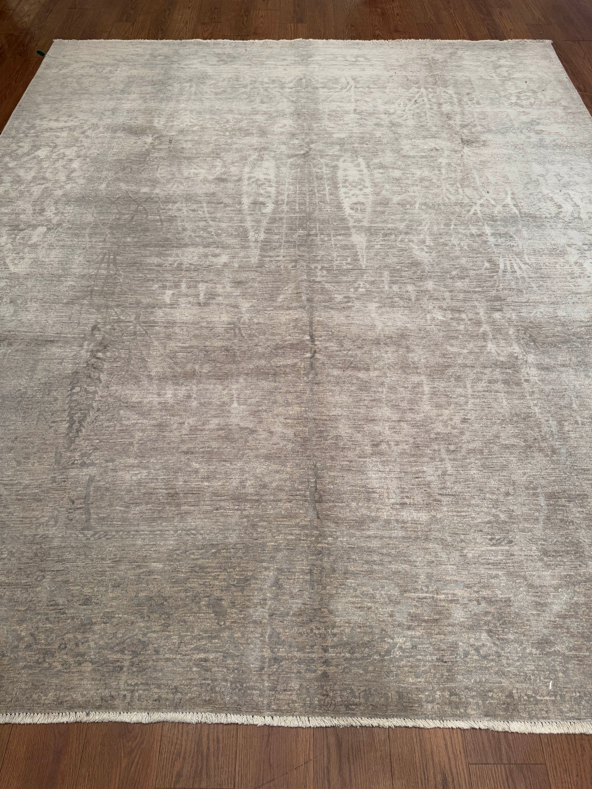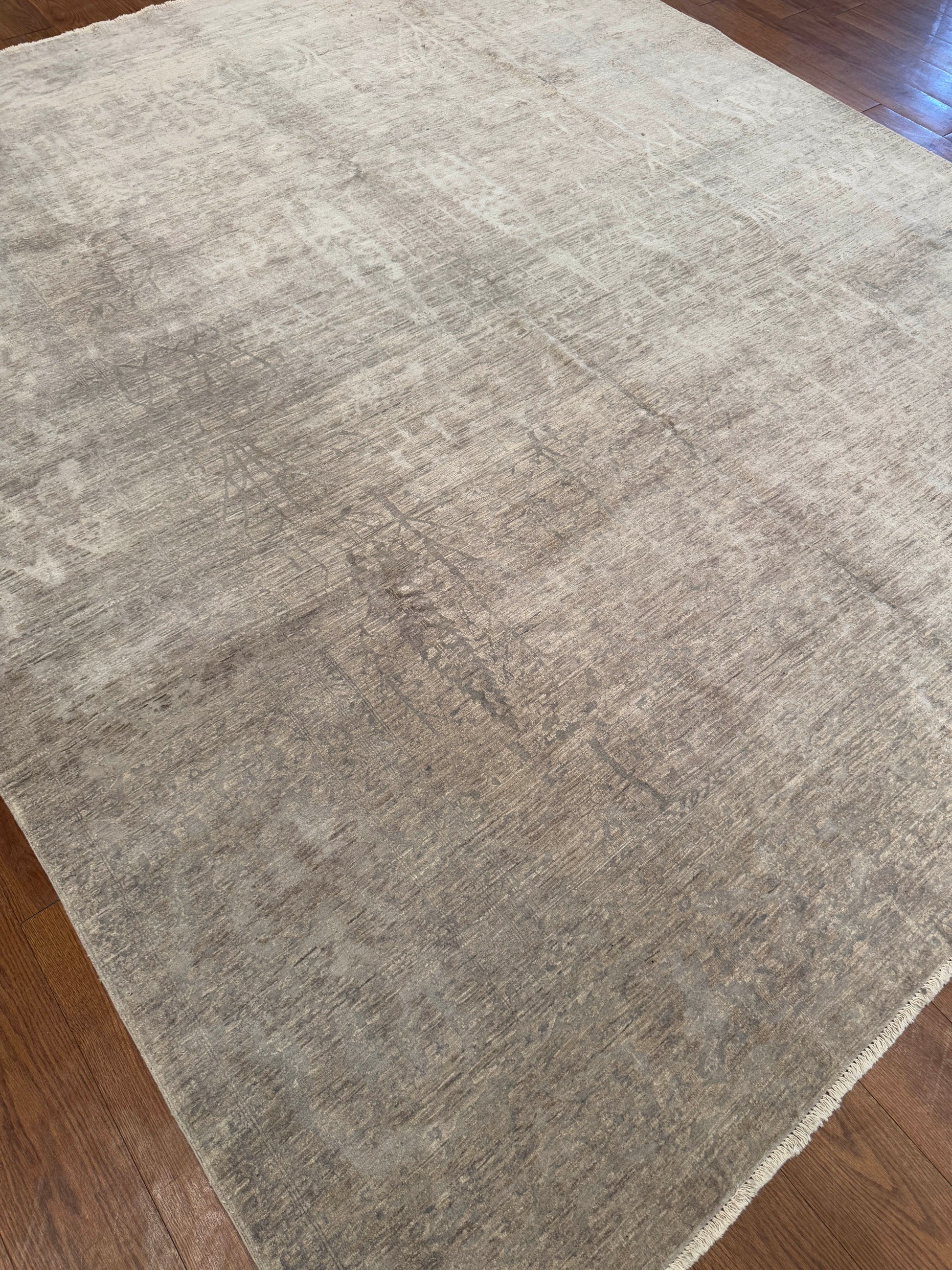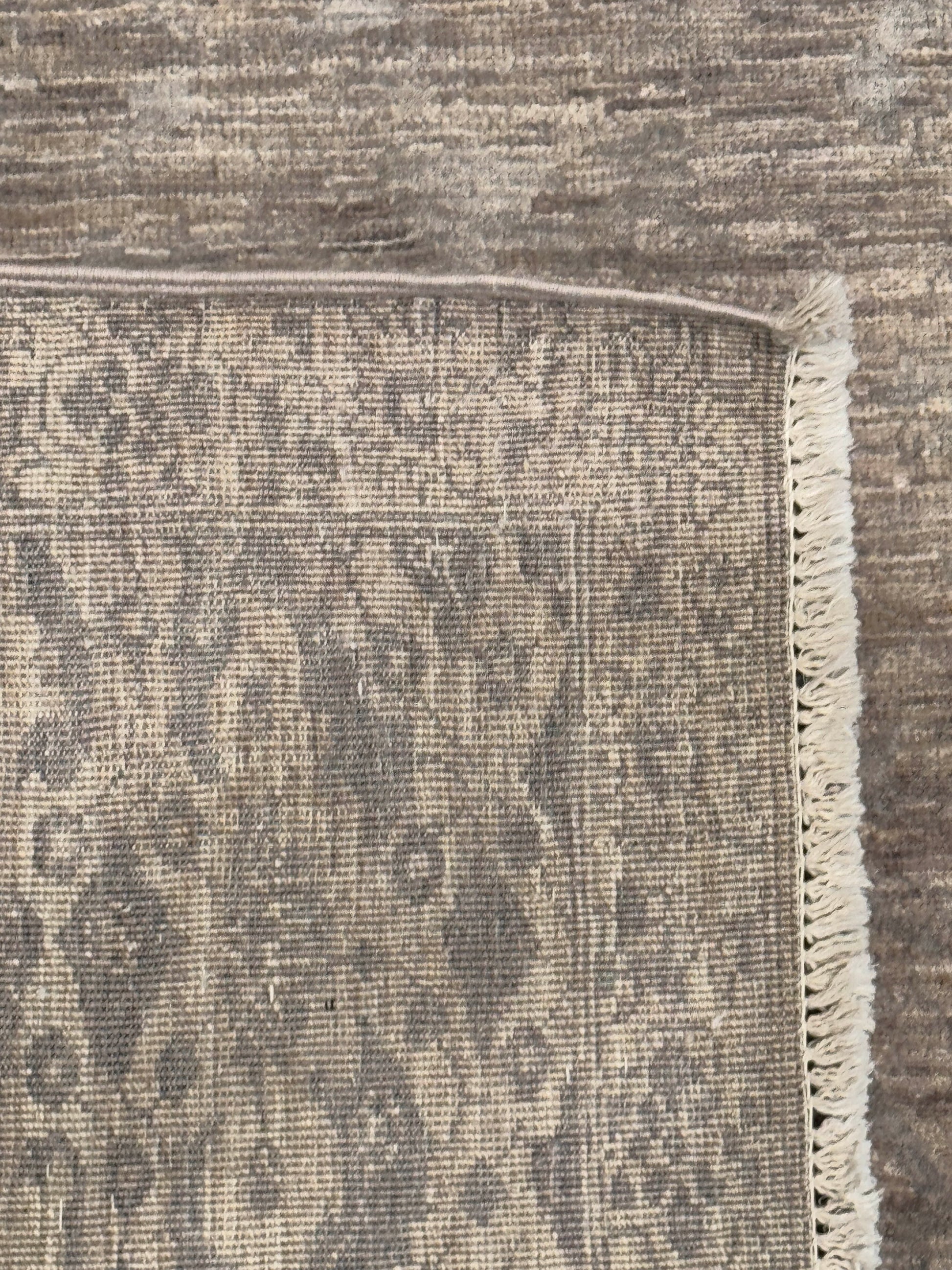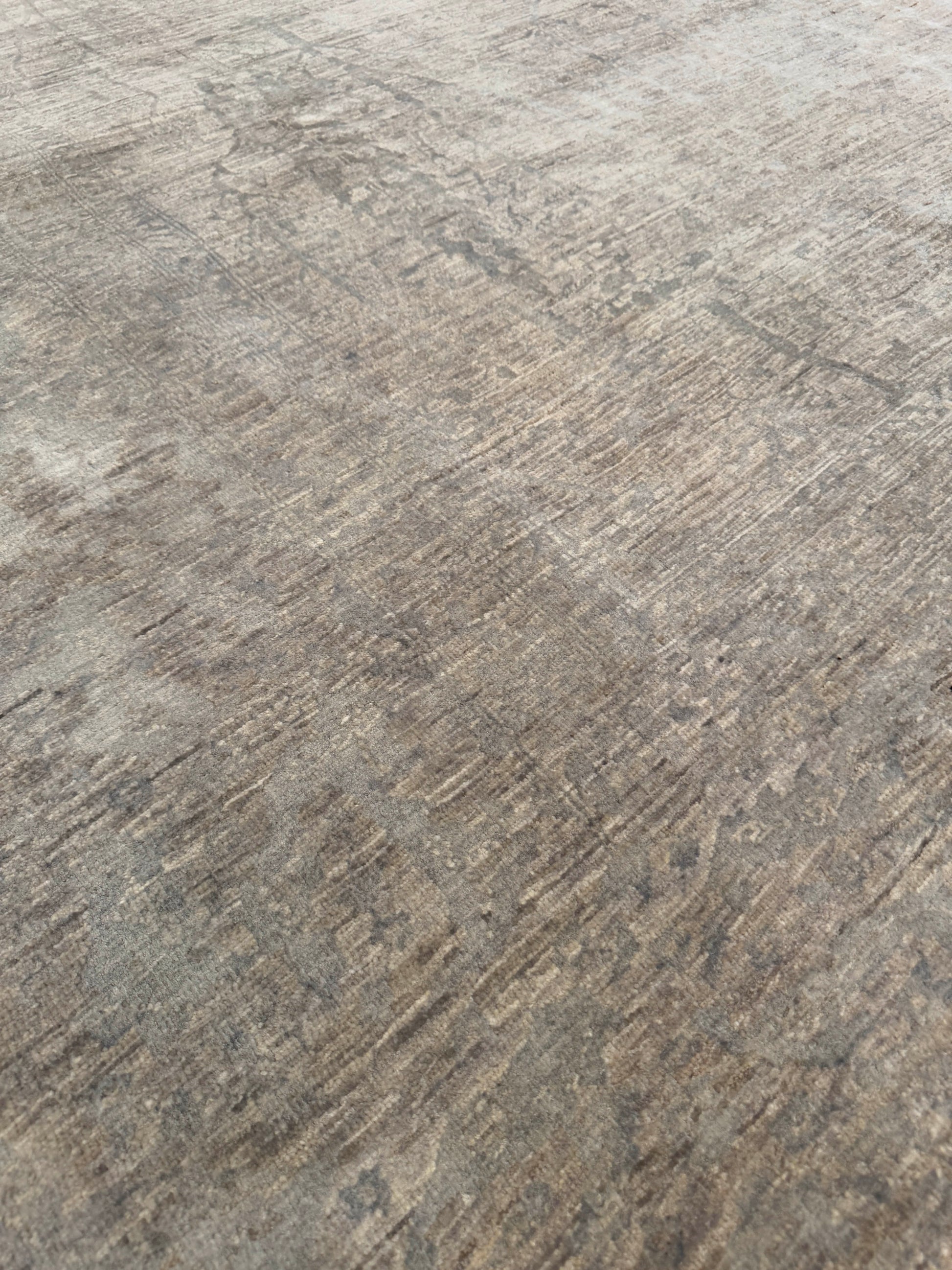 This understated handwoven rug embraces a soft, monochromatic palette of taupe, gray, and muted beige. Subtle tree and branch motifs emerge across the field, lending it a serene, nature-inspired character. Its delicate design blends seamlessly with the background, creating a calming, almost tone-on-tone effect that feels both modern and timeless. Perfect for interiors seeking quiet sophistication, this piece offers versatility and elegance without overpowering the space.