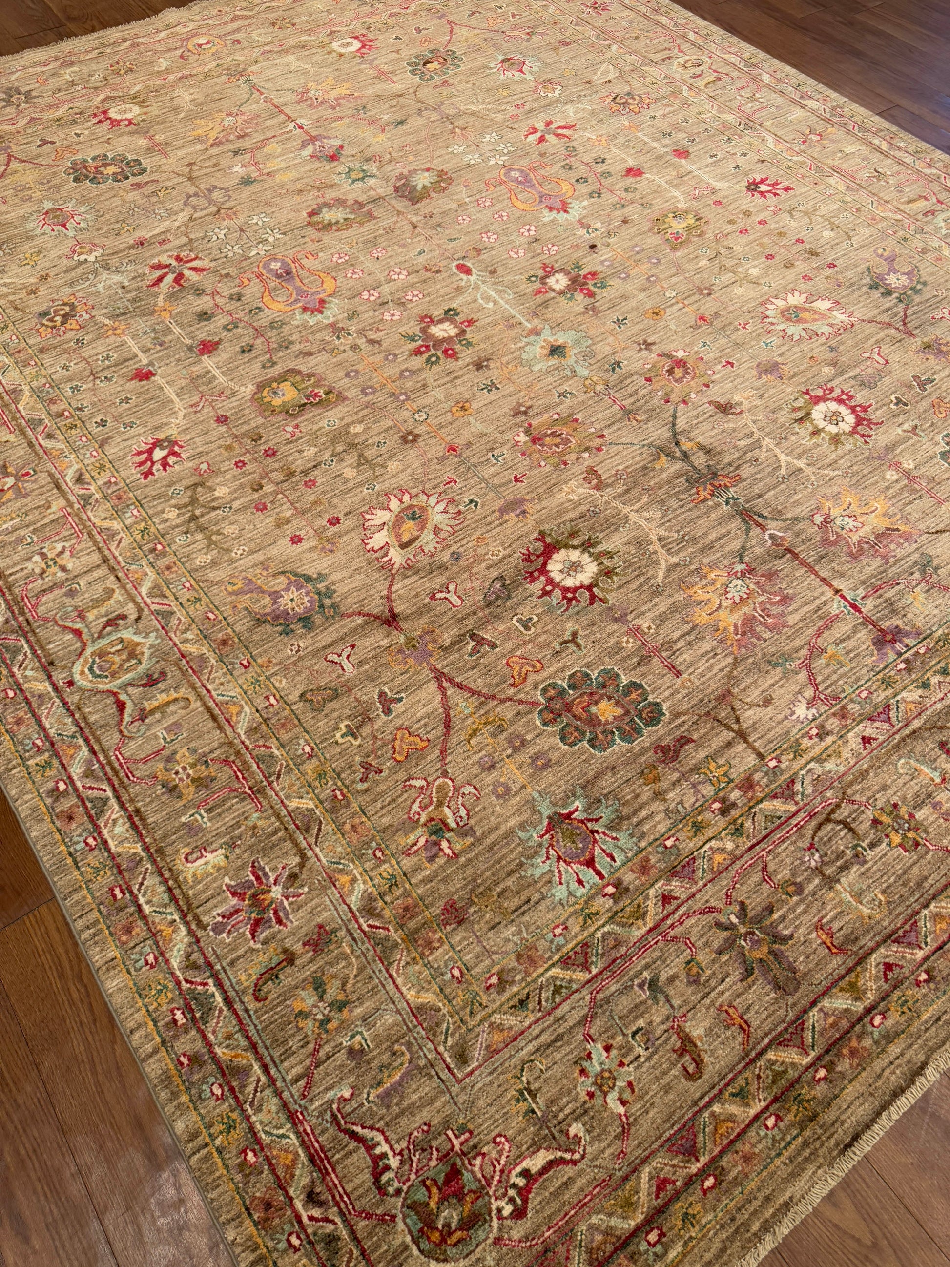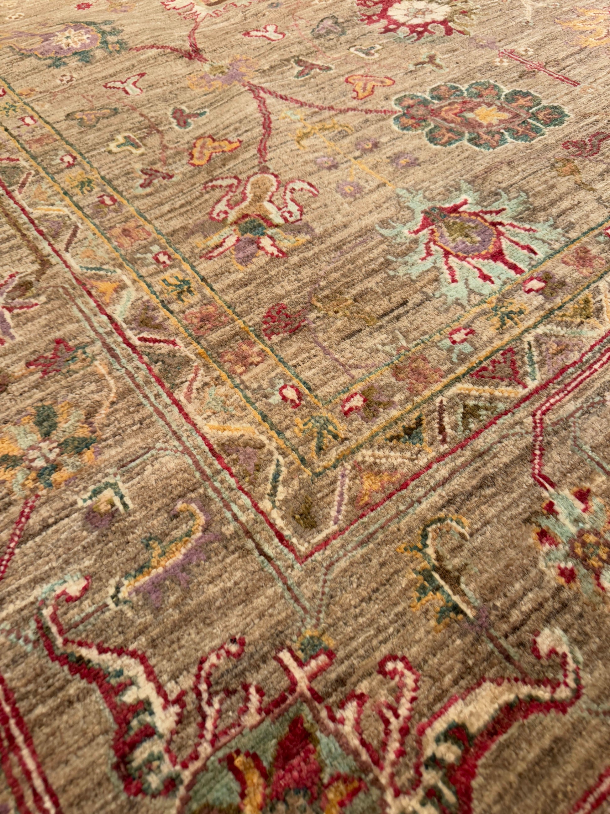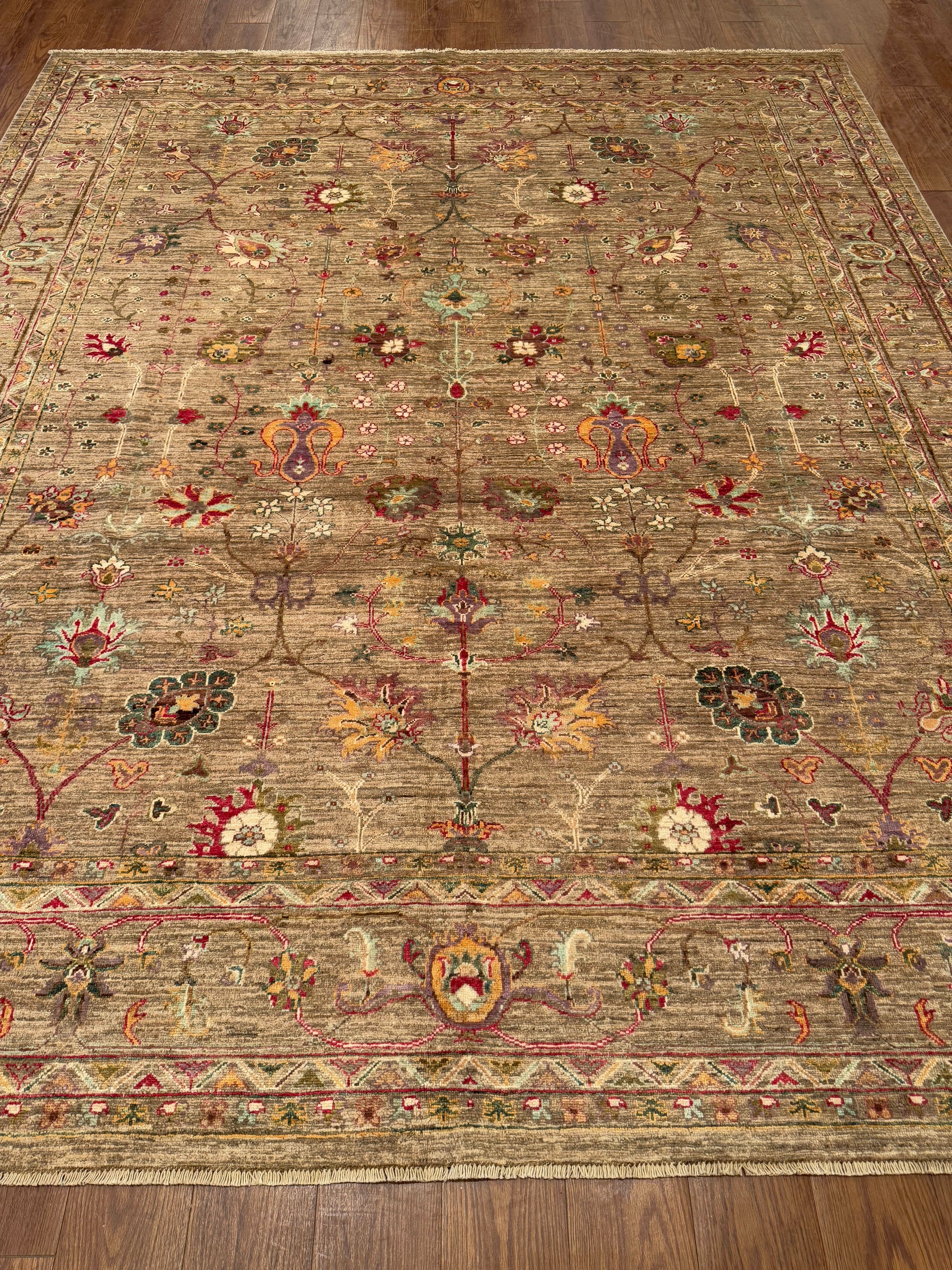 This exquisite handwoven rug features an earthy brown field adorned with delicate floral and vine motifs in vivid shades of crimson, gold, ivory, and teal. Its layout is balanced yet free-flowing, with slender stems and blossoms branching outward in graceful symmetry. The detailed border frames the composition beautifully, enhancing the sense of refinement while allowing the lively colors to stand out. The blend of warm and jewel-toned accents gives this rug both depth and vibrancy, making it a sophisticated centerpiece for any room.