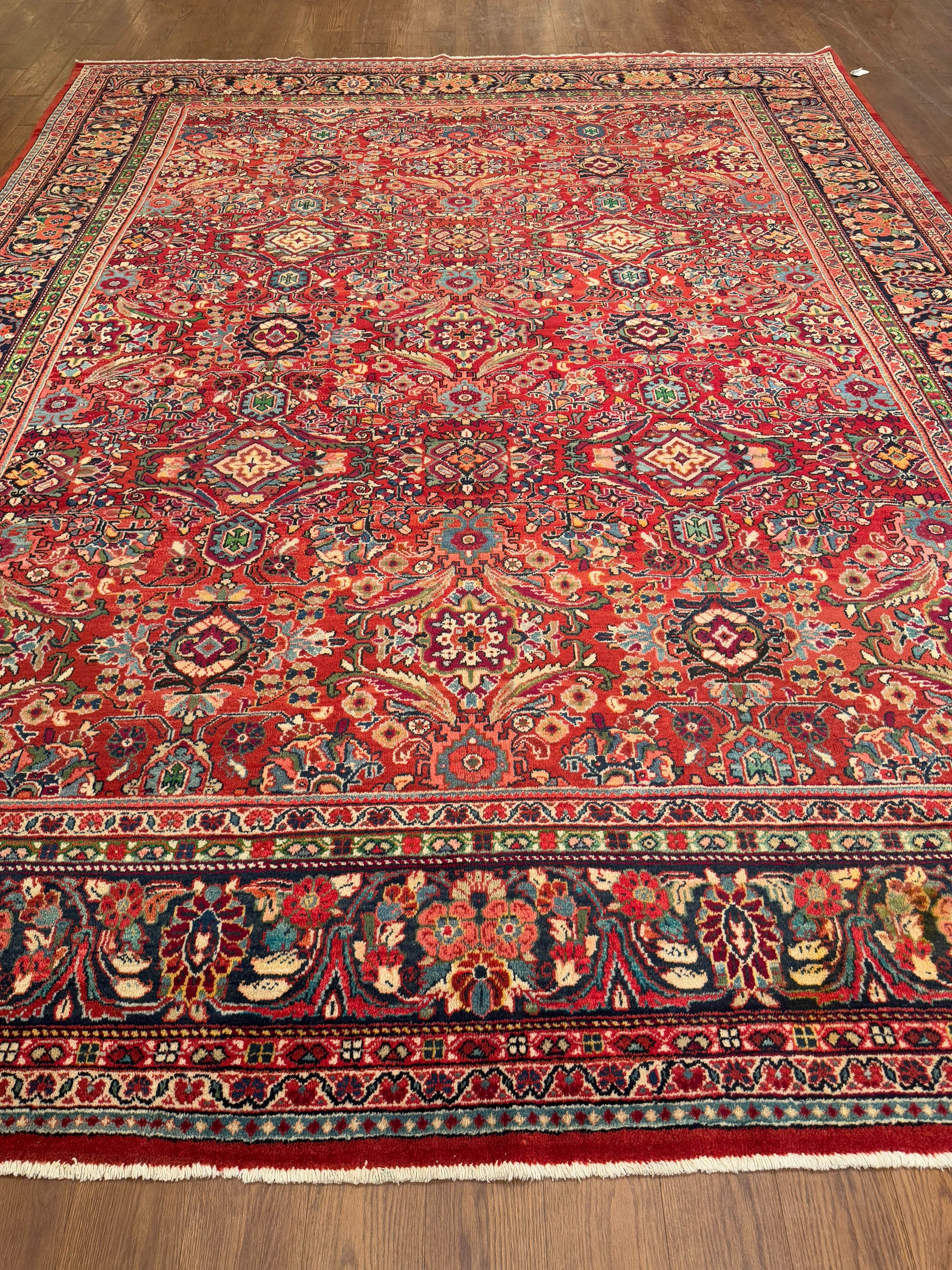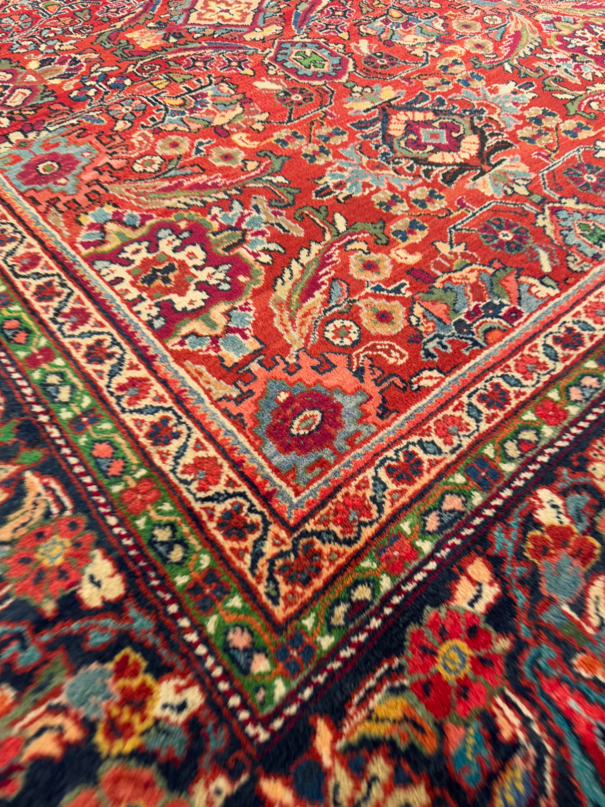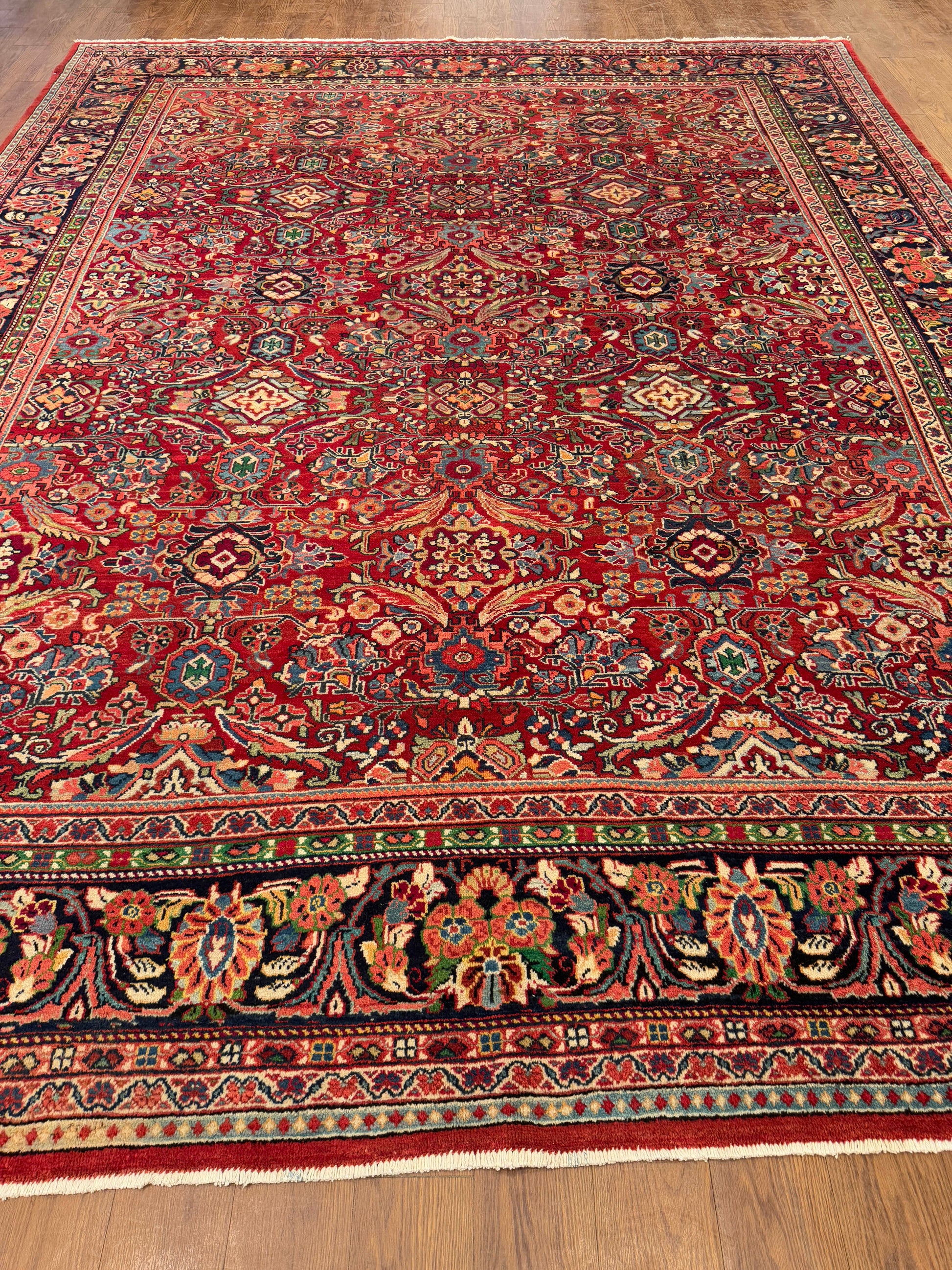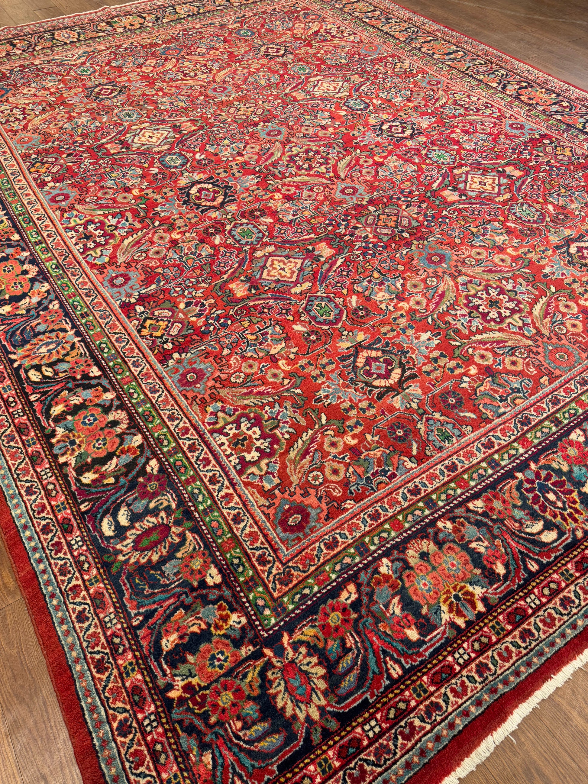 This elegant handwoven rug features a richly detailed allover pattern of floral and geometric motifs, beautifully balanced across a vibrant red field. The intricate borders, highlighted with layers of floral bands, frame the design with a sense of harmony and refinement. Accents of green, gold, blue, and ivory bring depth and liveliness, making it a versatile piece for both traditional and transitional interiors.