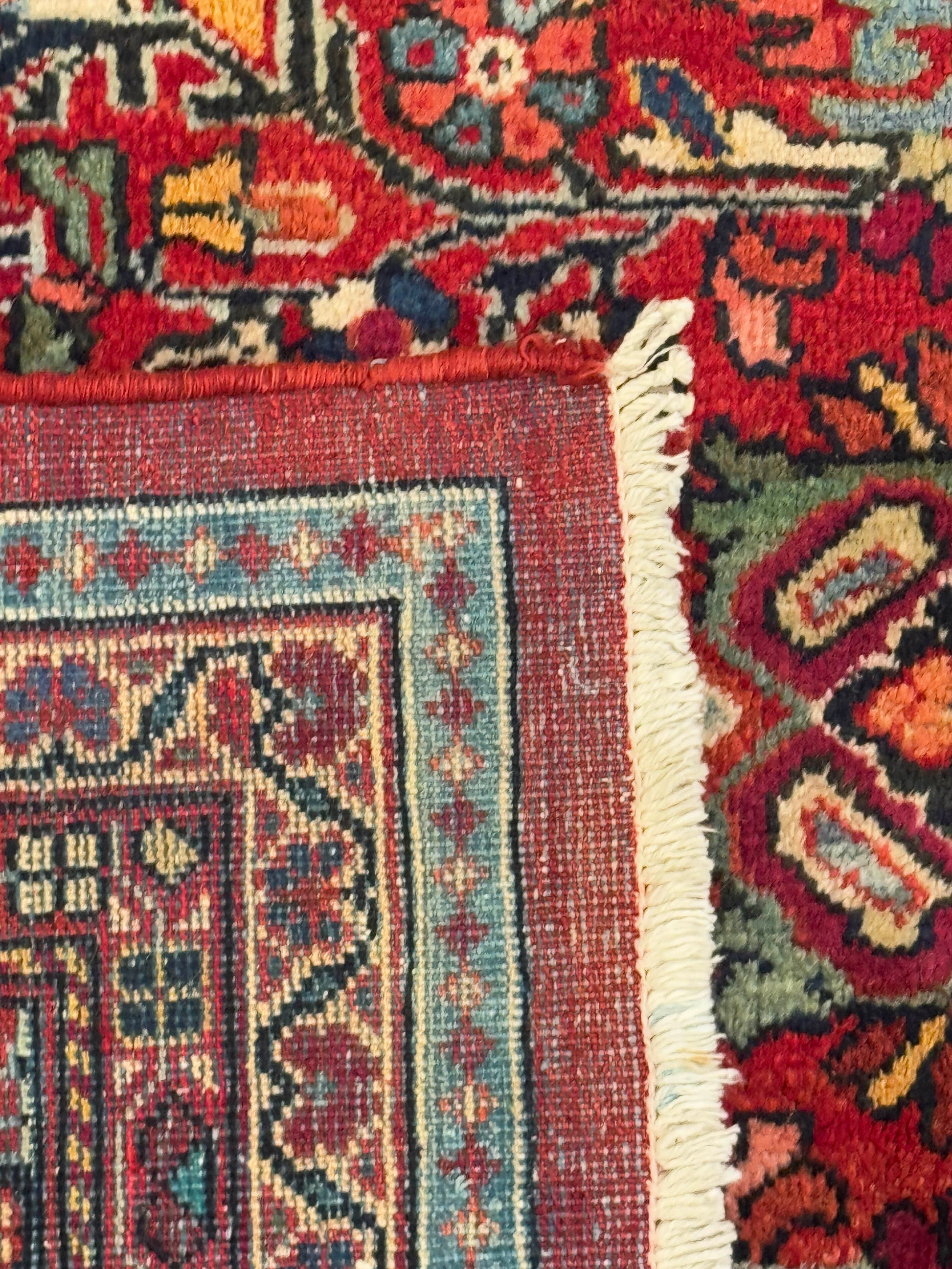 - Design: Allover floral and geometric motifs with layered botanical borders