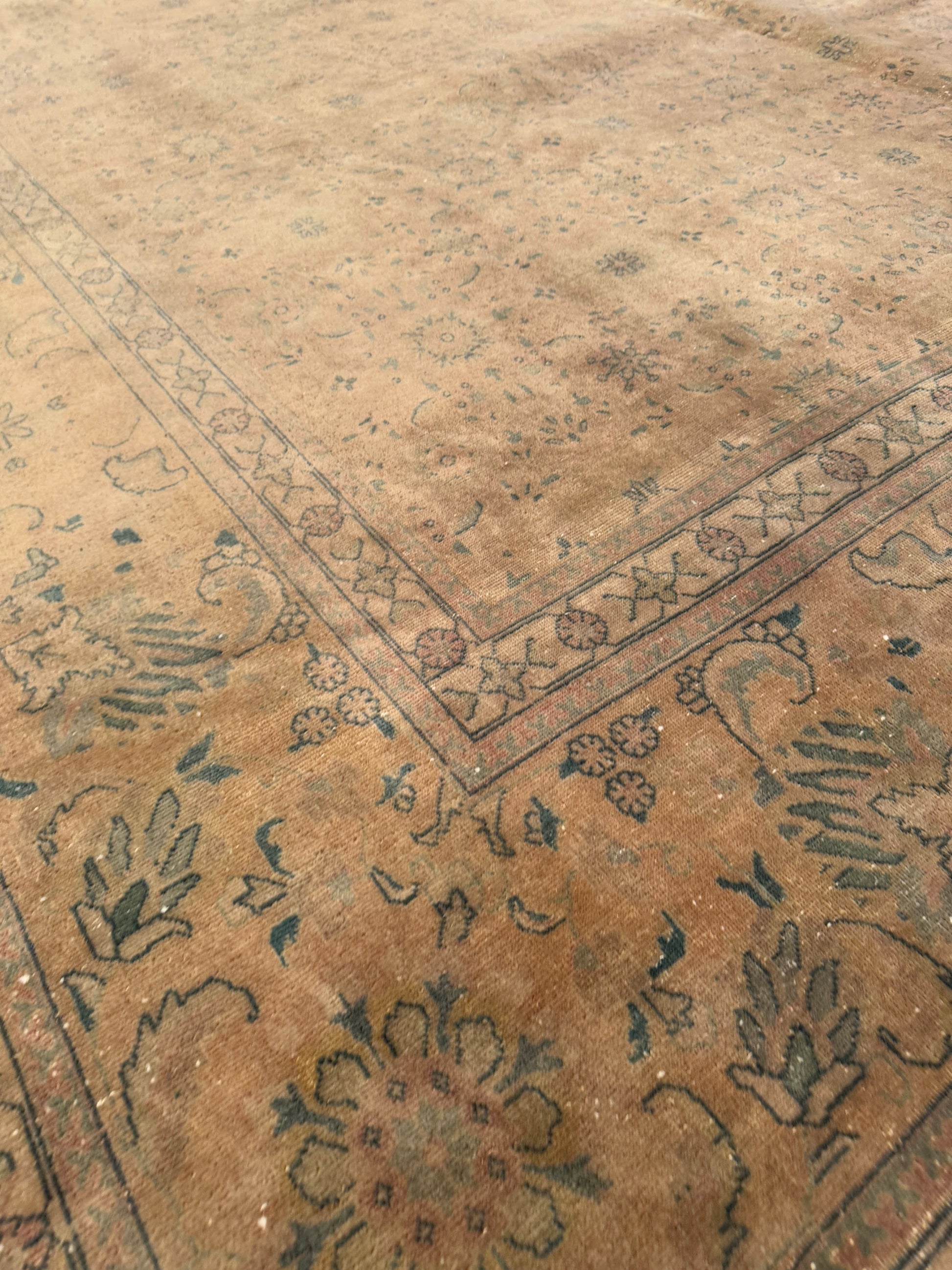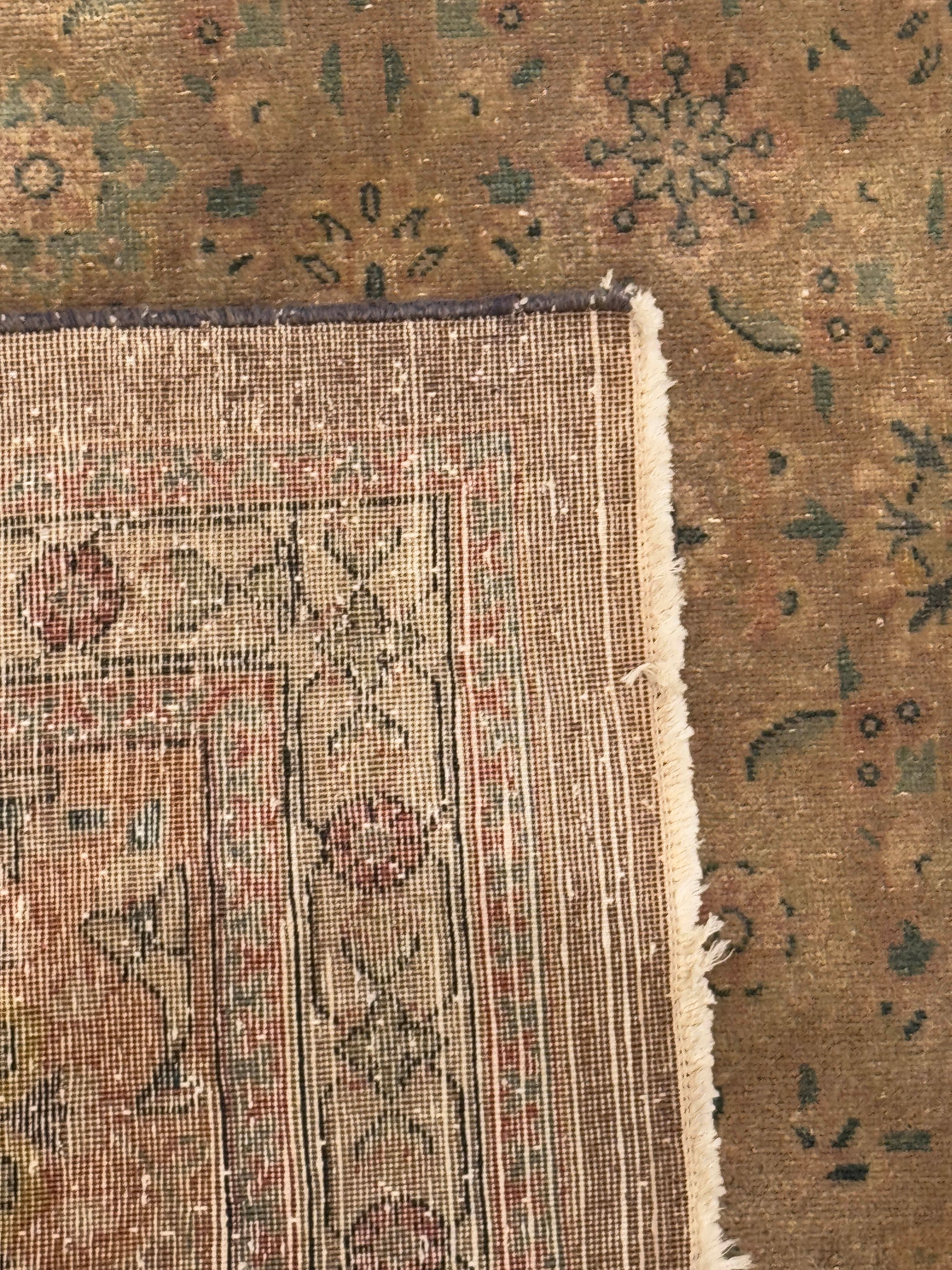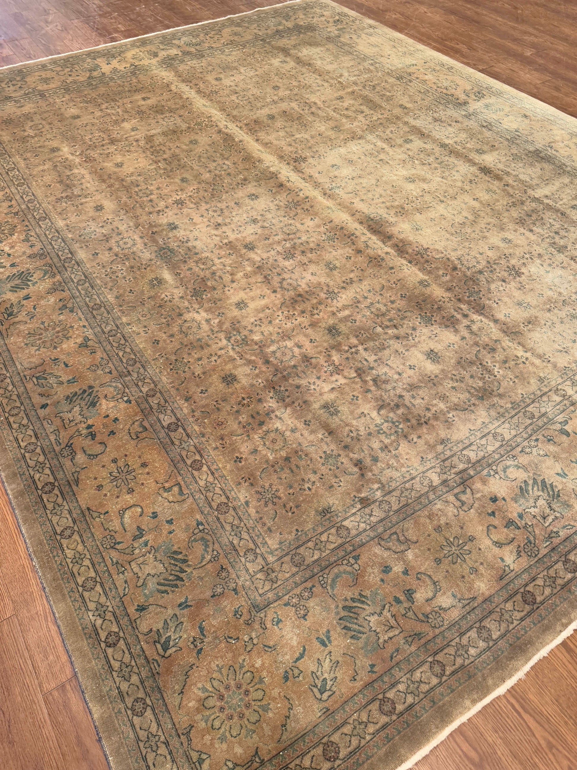 This elegant handwoven rug features an allover Herati-inspired pattern, delicately arranged in soft, repeating floral and geometric motifs. Muted earthy tones of beige, sage green, and faded gold give it a refined, timeworn character, while the subtle abrash adds depth and texture. Its understated sophistication makes it an easy fit for both classic and transitional interiors.