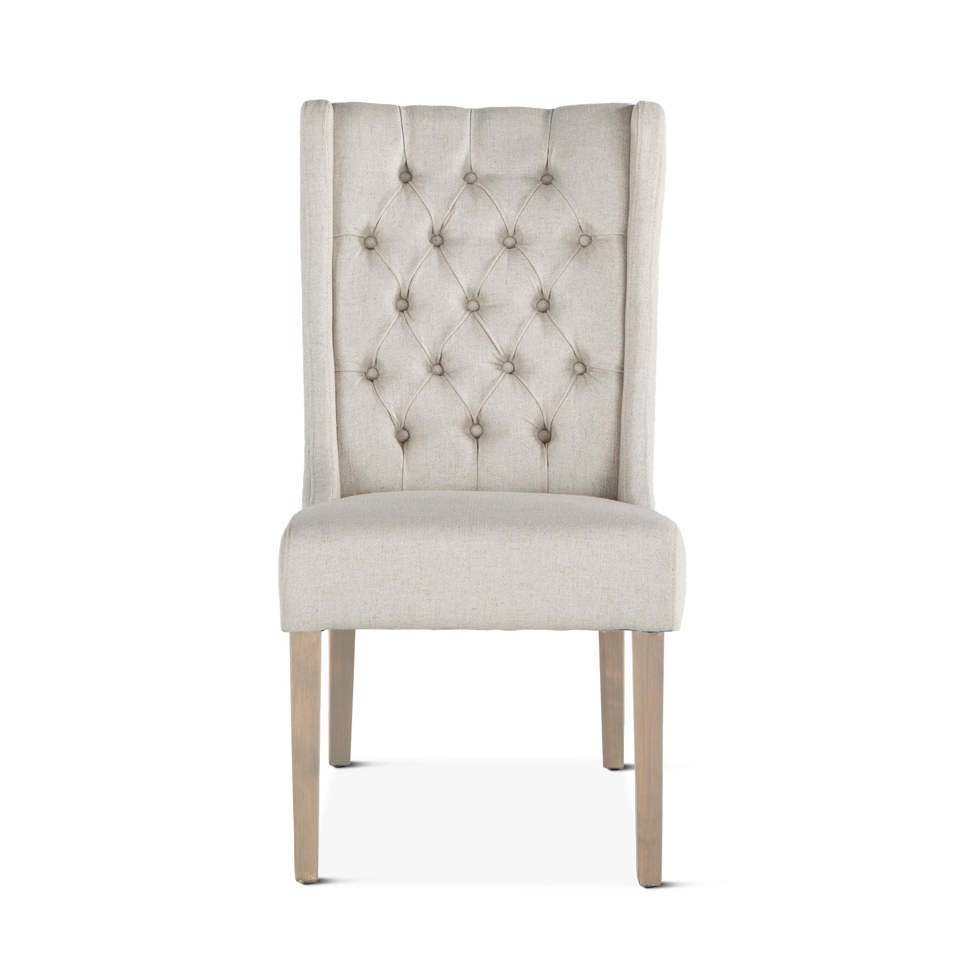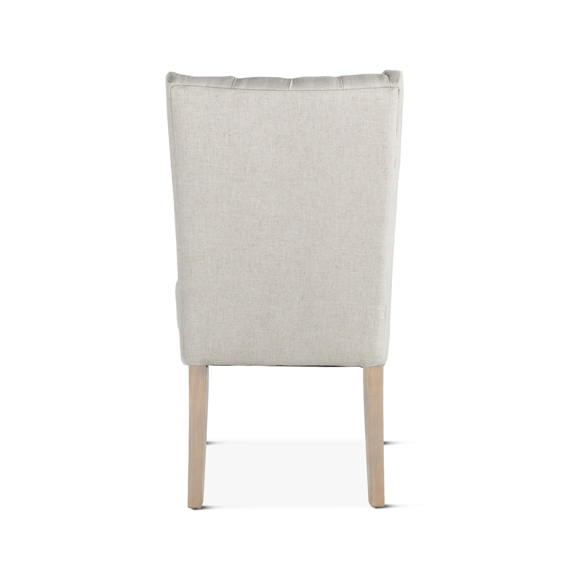 This dining chair combines classic tufted craftsmanship with elegant proportions. Upholstered in an off-white linen blend, it features a high wingback silhouette and button-tufted detailing that create a refined, timeless presence. The solid birch wood frame and Napoleon-style legs add structure and traditional character, making it ideal for dining rooms, lounges, or boutique interiors. Soft, supportive, and beautifully tailored, it delivers lasting comfort and understated sophistication.