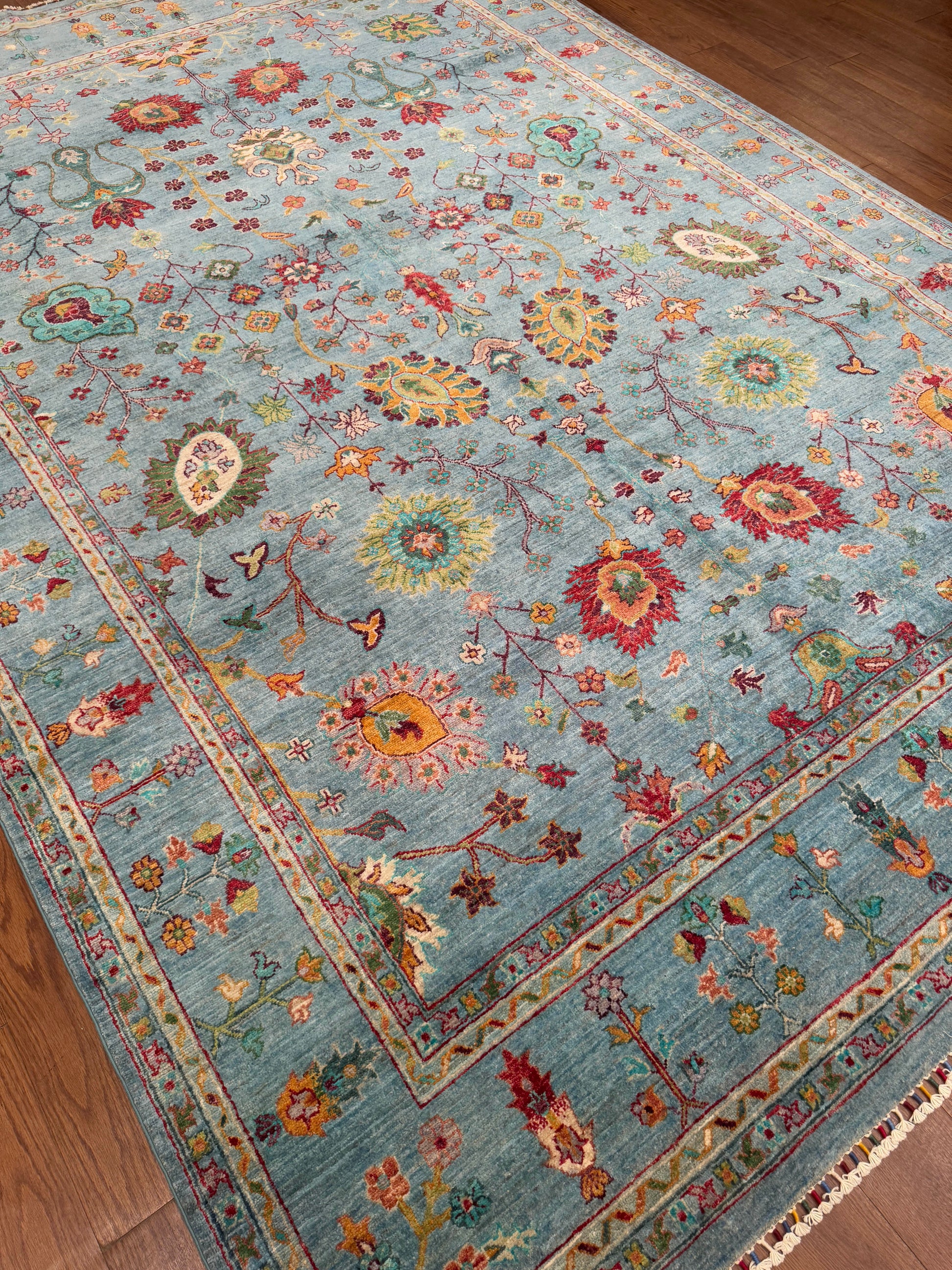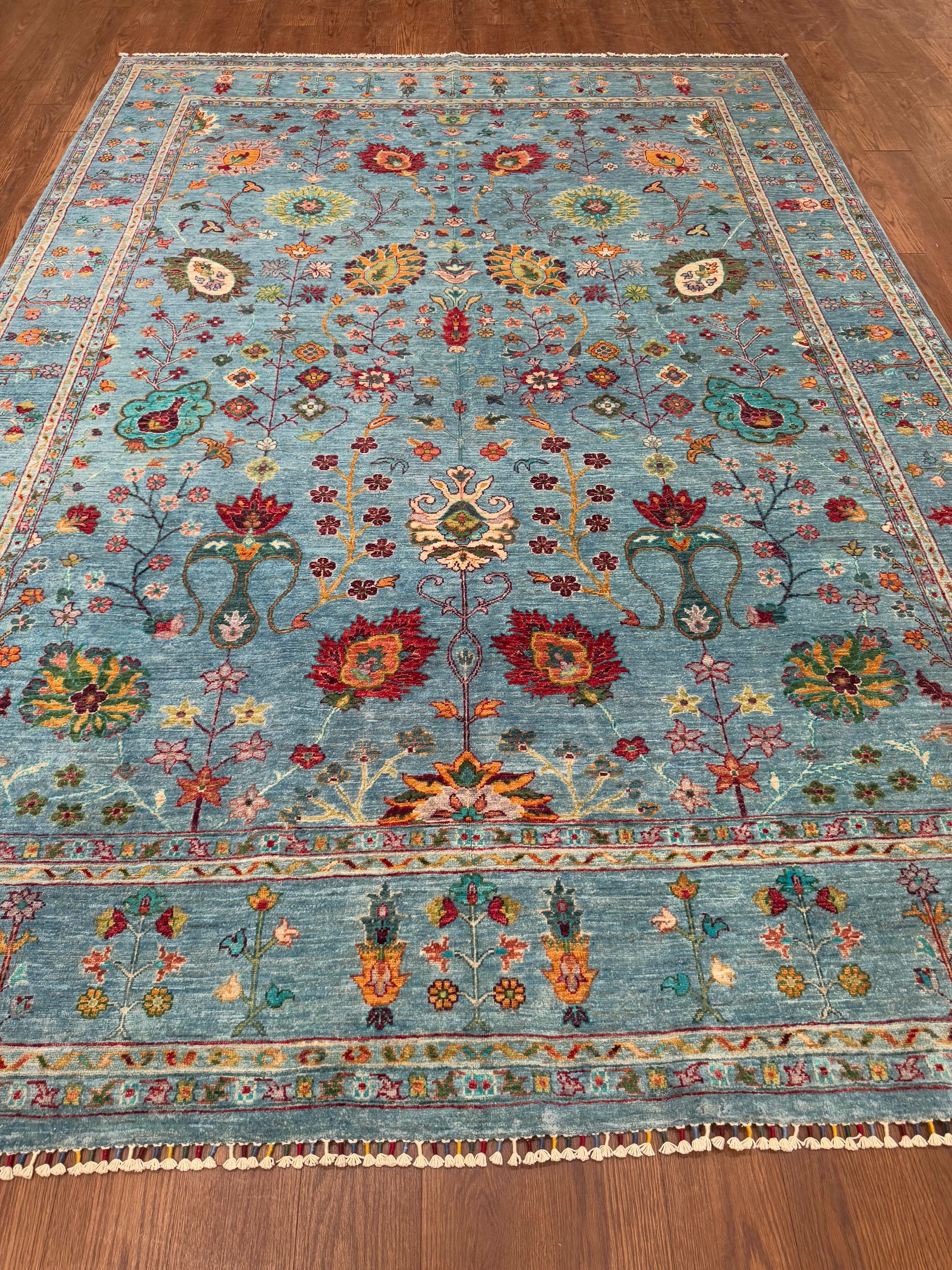 This handmade rug presents a beautifully balanced floral design on a serene sky-blue background. The pattern features blooming rosettes, delicate vines, and stylized leaves in shades of coral, gold, ivory, and sage, creating a graceful and uplifting aesthetic. Its soft palette and intricate detailing make it ideal for brightening both classic and contemporary interiors.