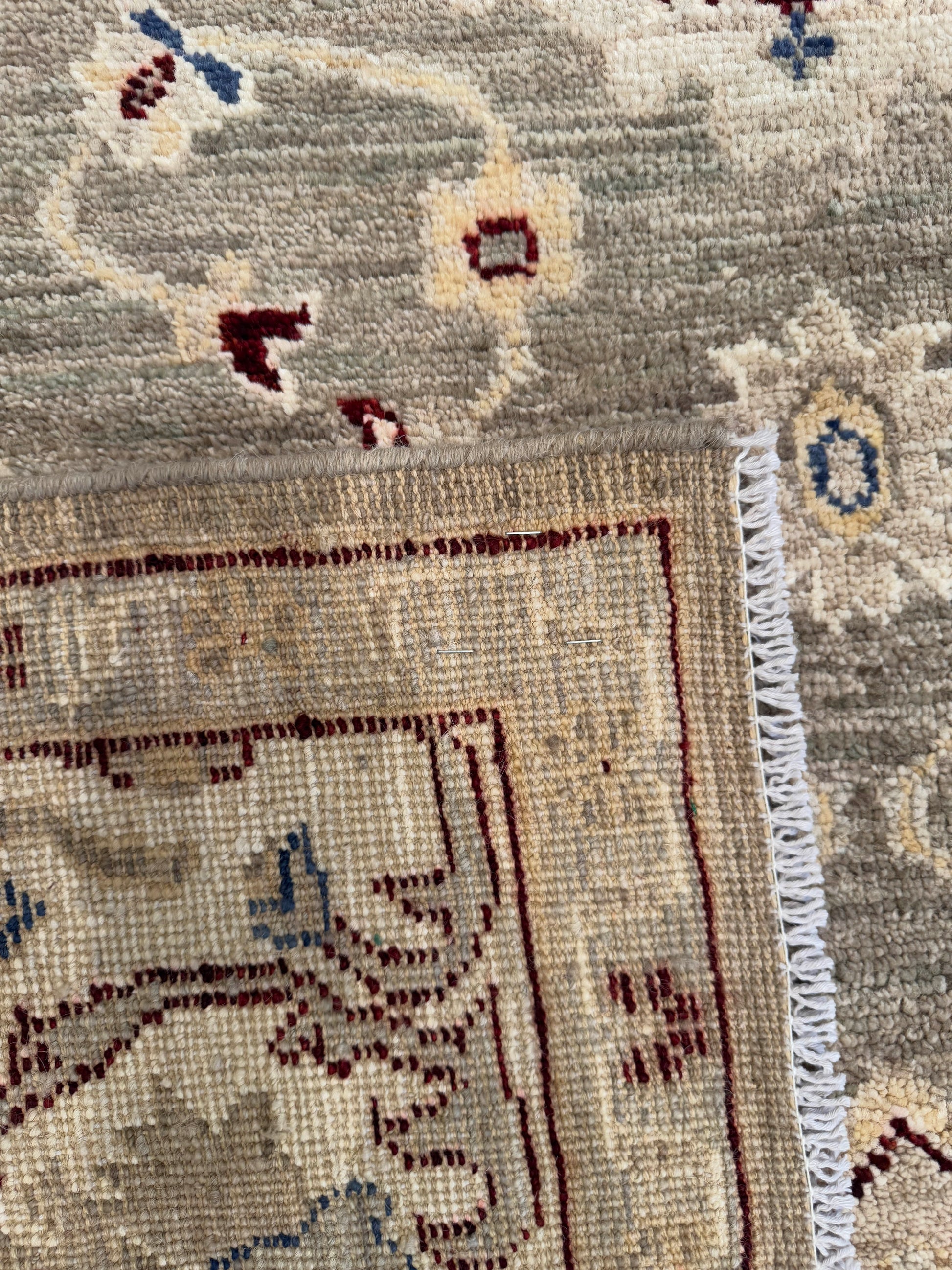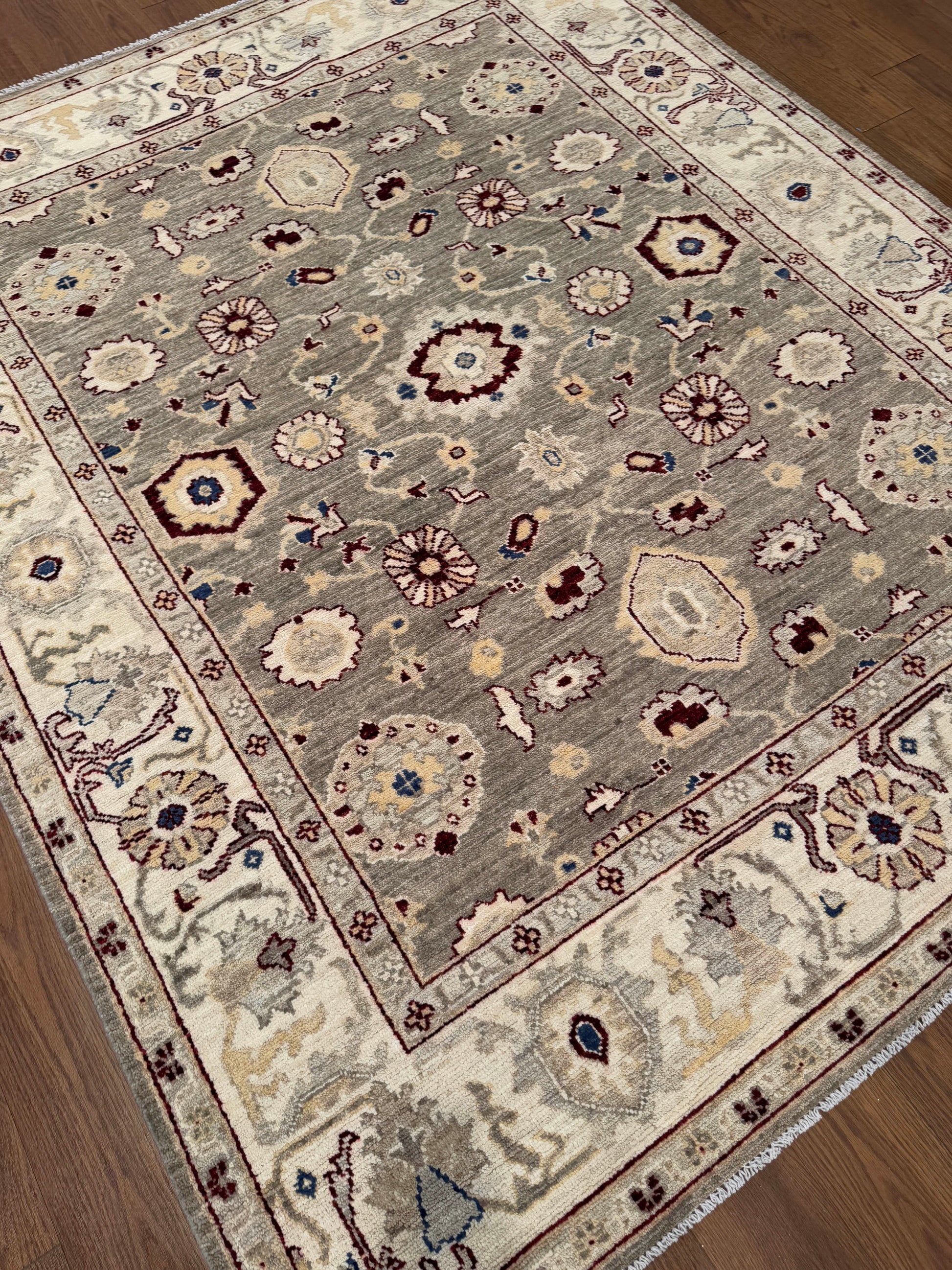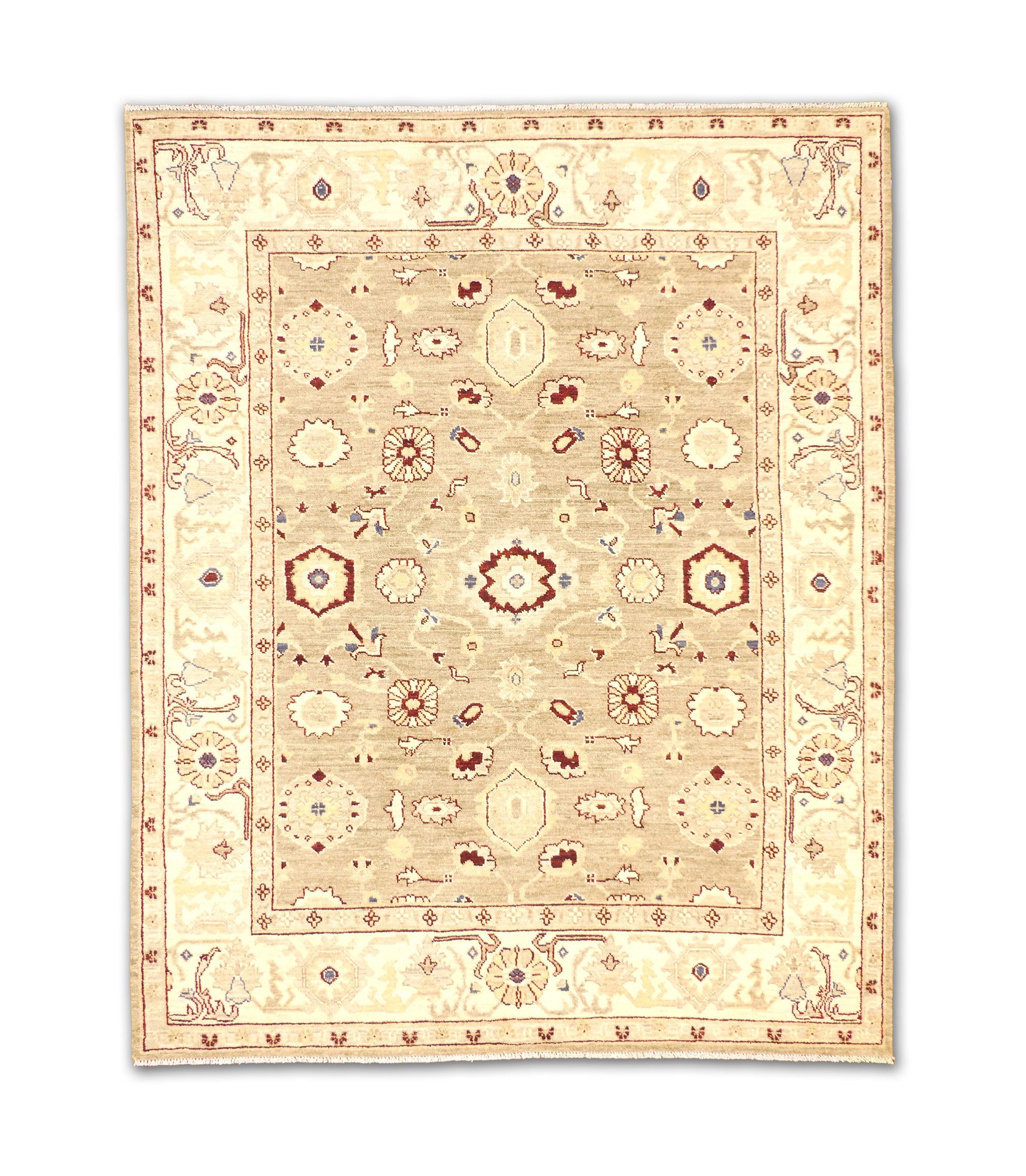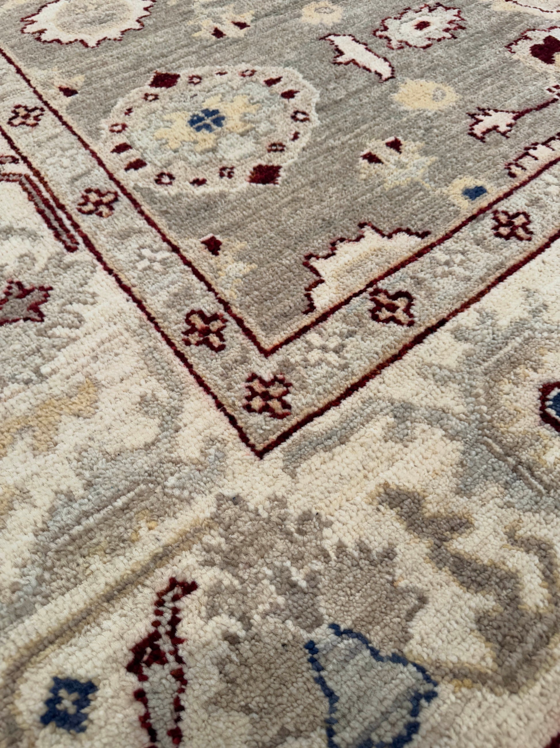 This handwoven wool rug blends earthy taupe tones with soft ivory borders, highlighted by burgundy and blue accents. Its detailed floral motifs and balanced composition bring warmth and elegance, making it a versatile addition to both traditional and transitional interiors.