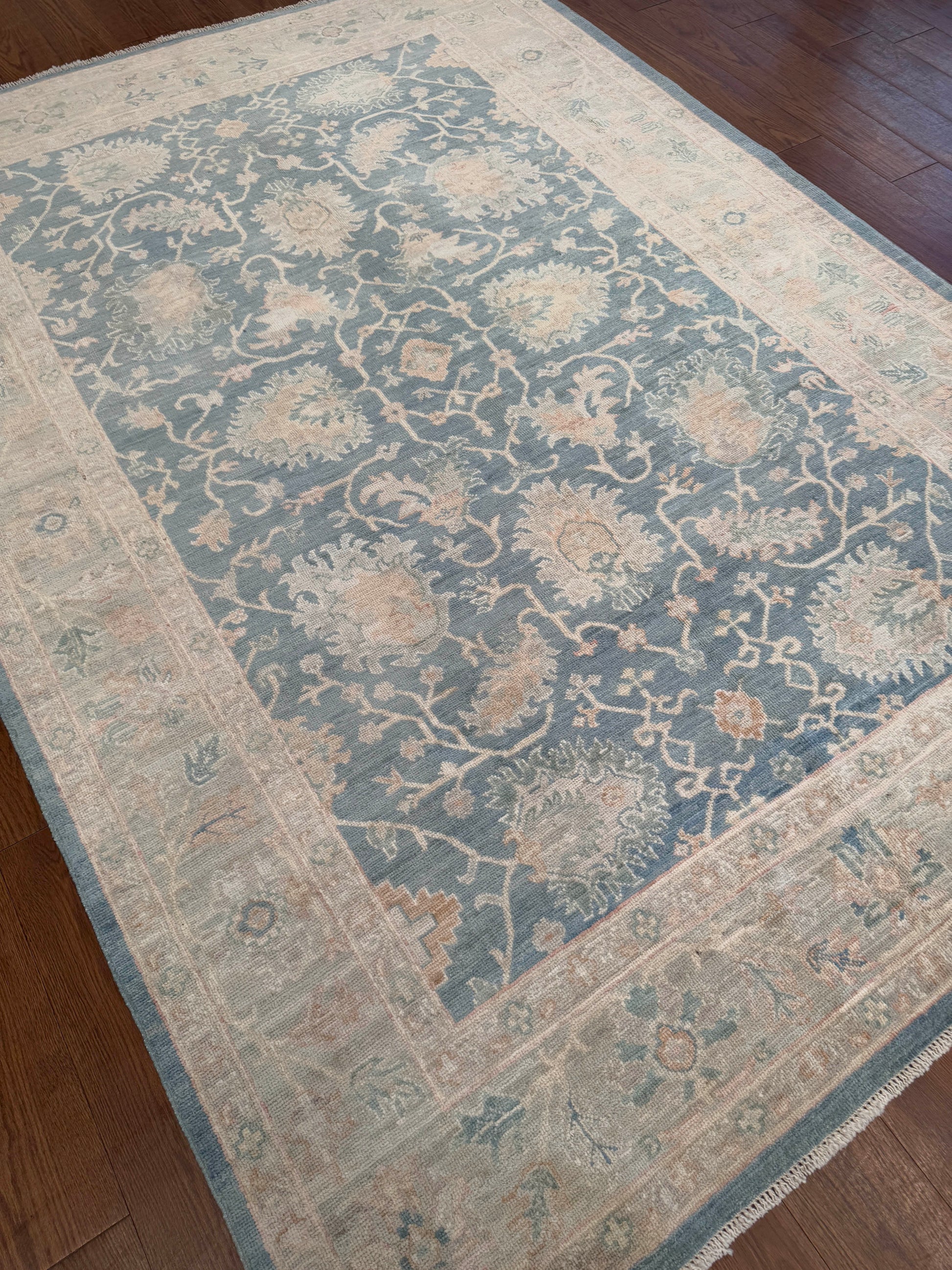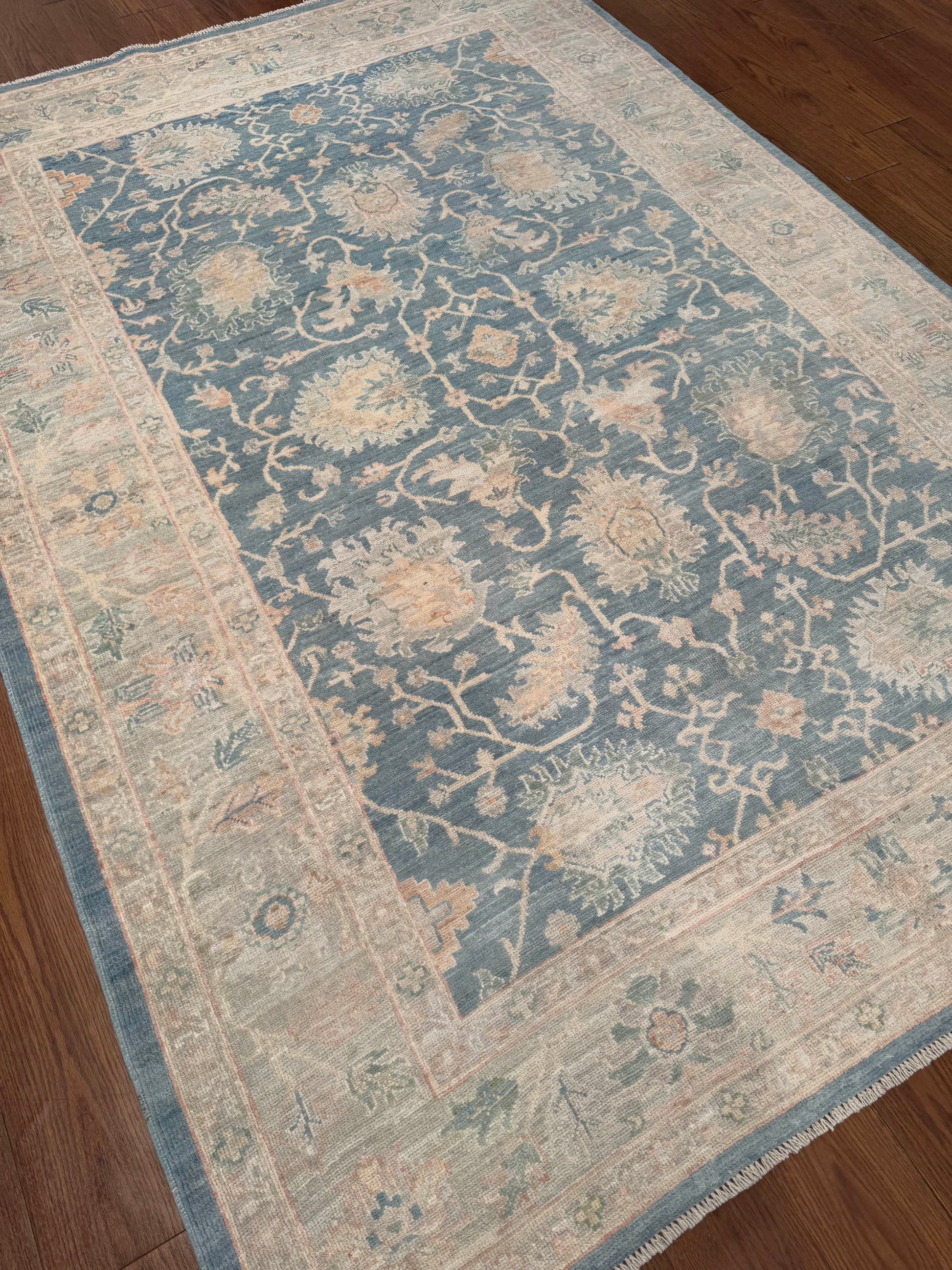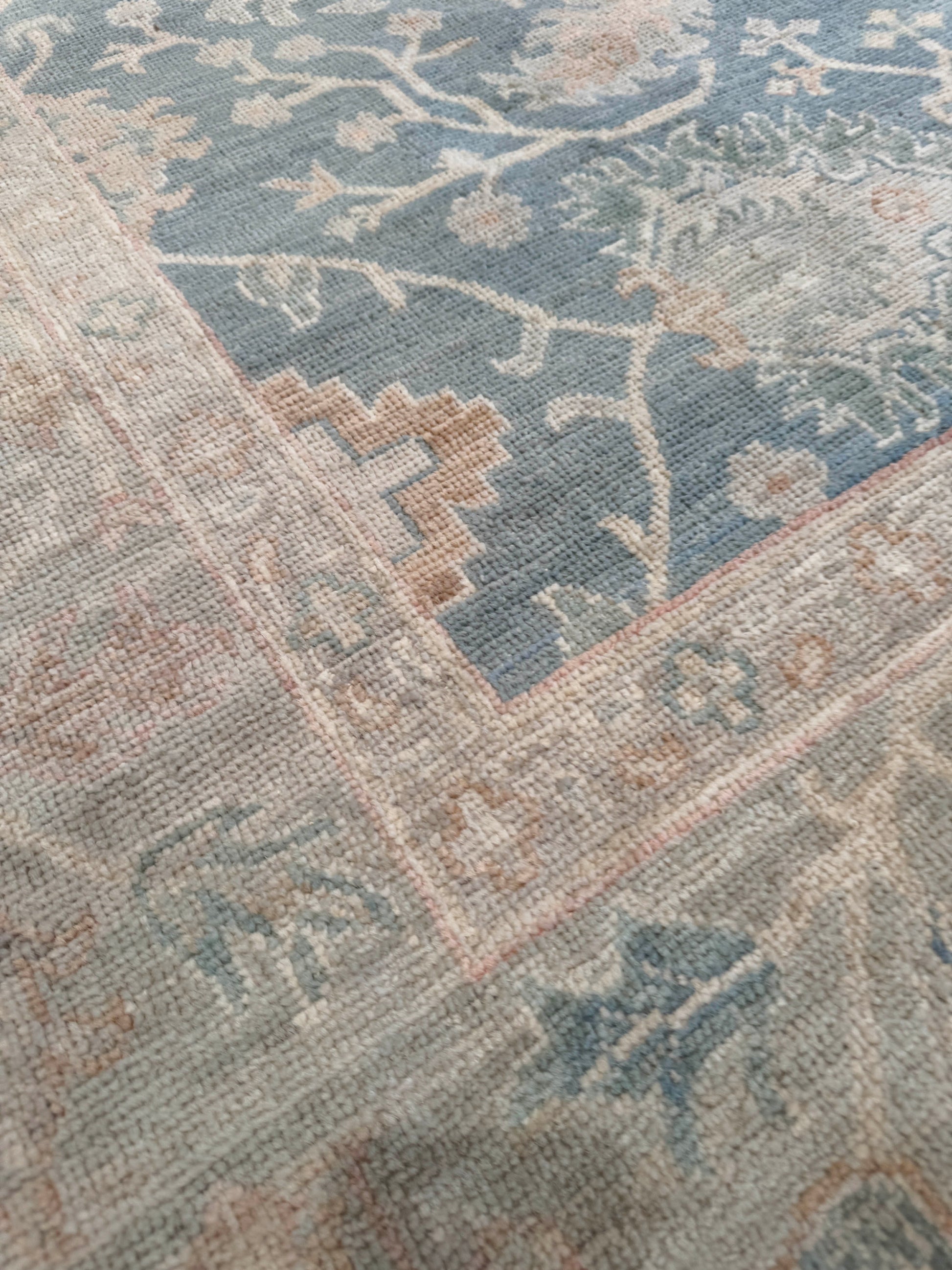 This refined handwoven wool rug features a serene palette and graceful detailing. The soft blue field is balanced with muted ivory and beige accents, while intricate floral motifs flow seamlessly throughout, framed by a subtle border. Its understated elegance makes it versatile and timeless, enhancing any space with warmth and sophistication.