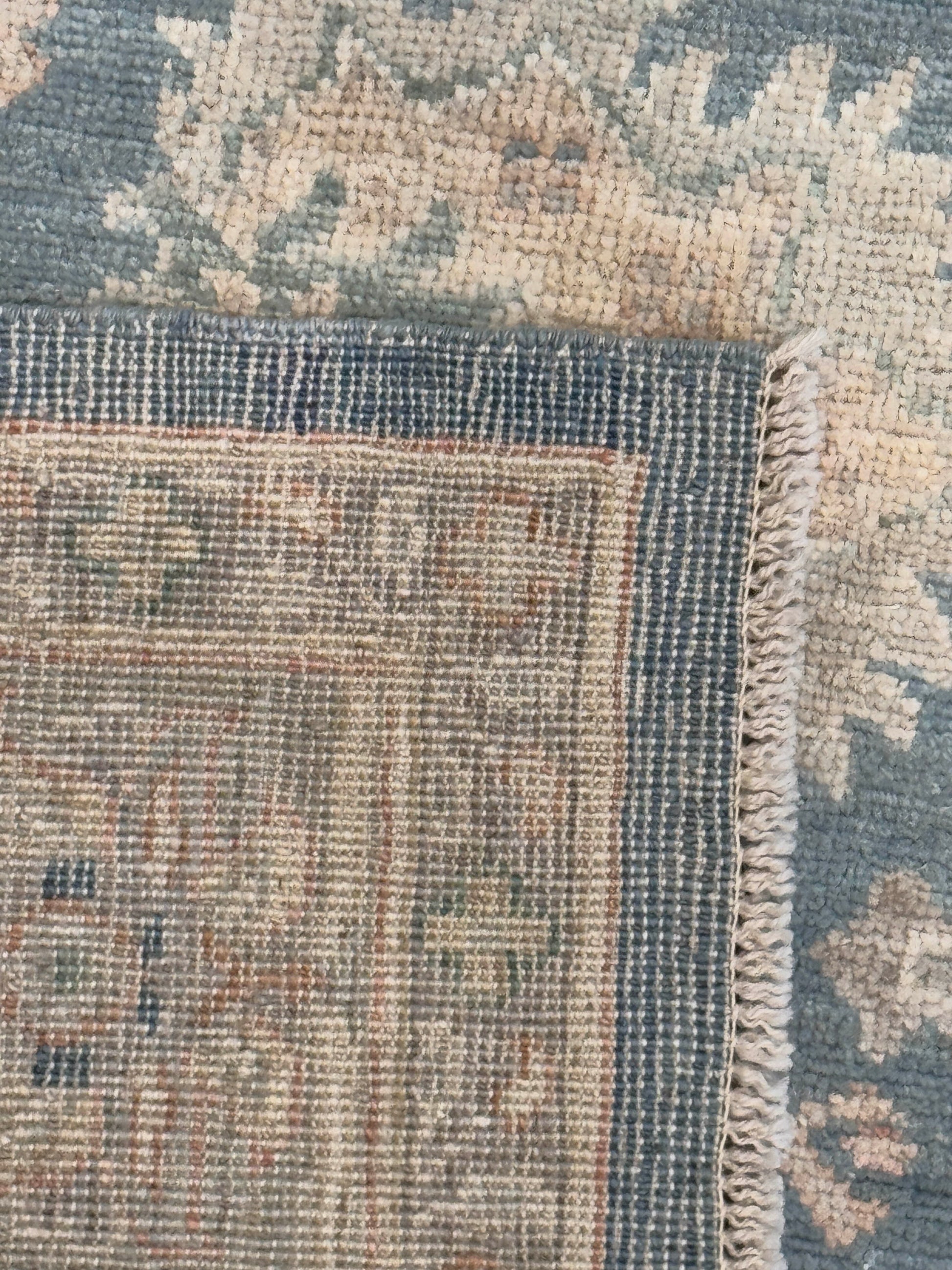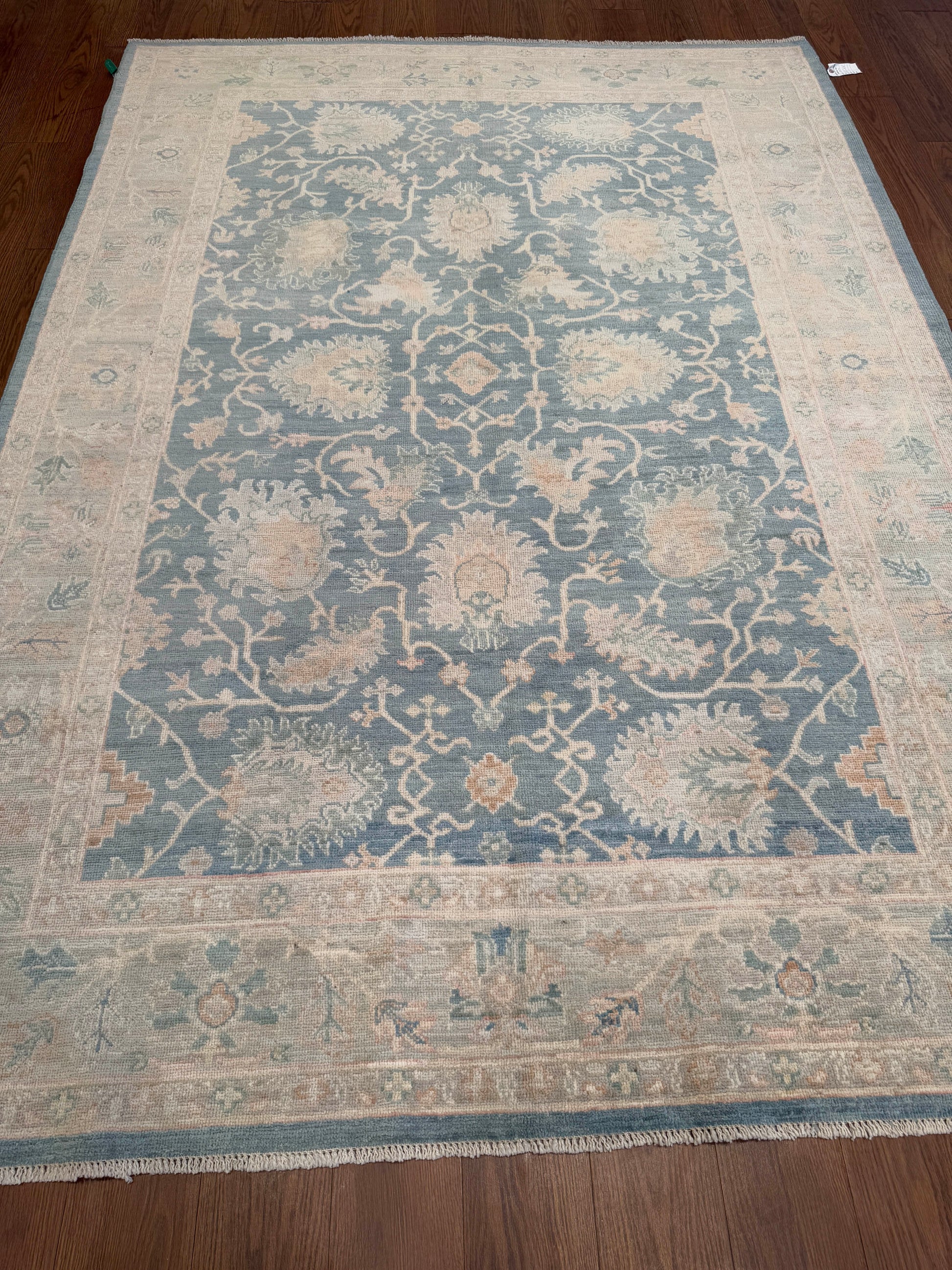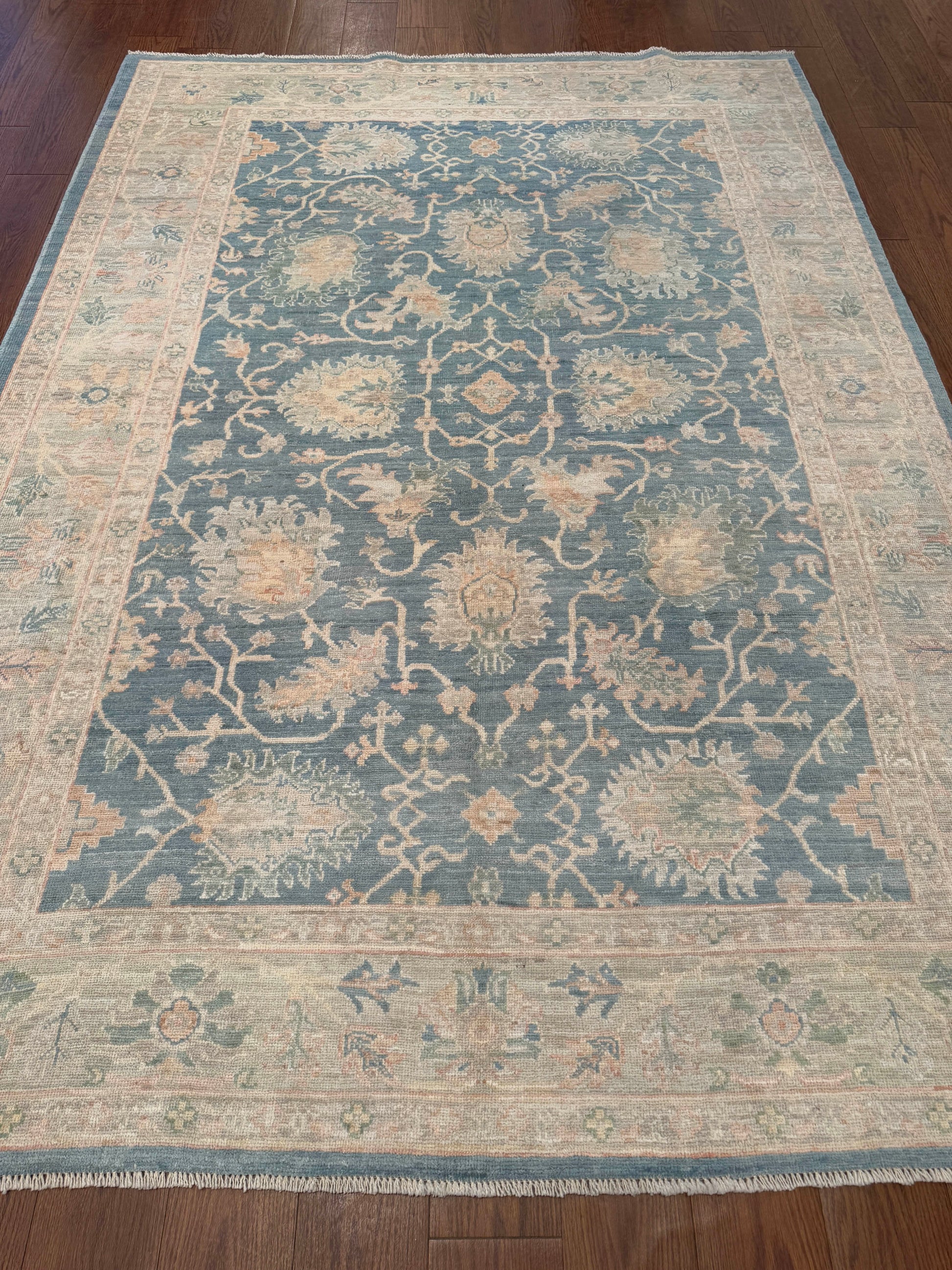 This refined handwoven wool rug features a serene palette and graceful detailing. The soft blue field is balanced with muted ivory and beige accents, while intricate floral motifs flow seamlessly throughout, framed by a subtle border. Its understated elegance makes it versatile and timeless, enhancing any space with warmth and sophistication.
