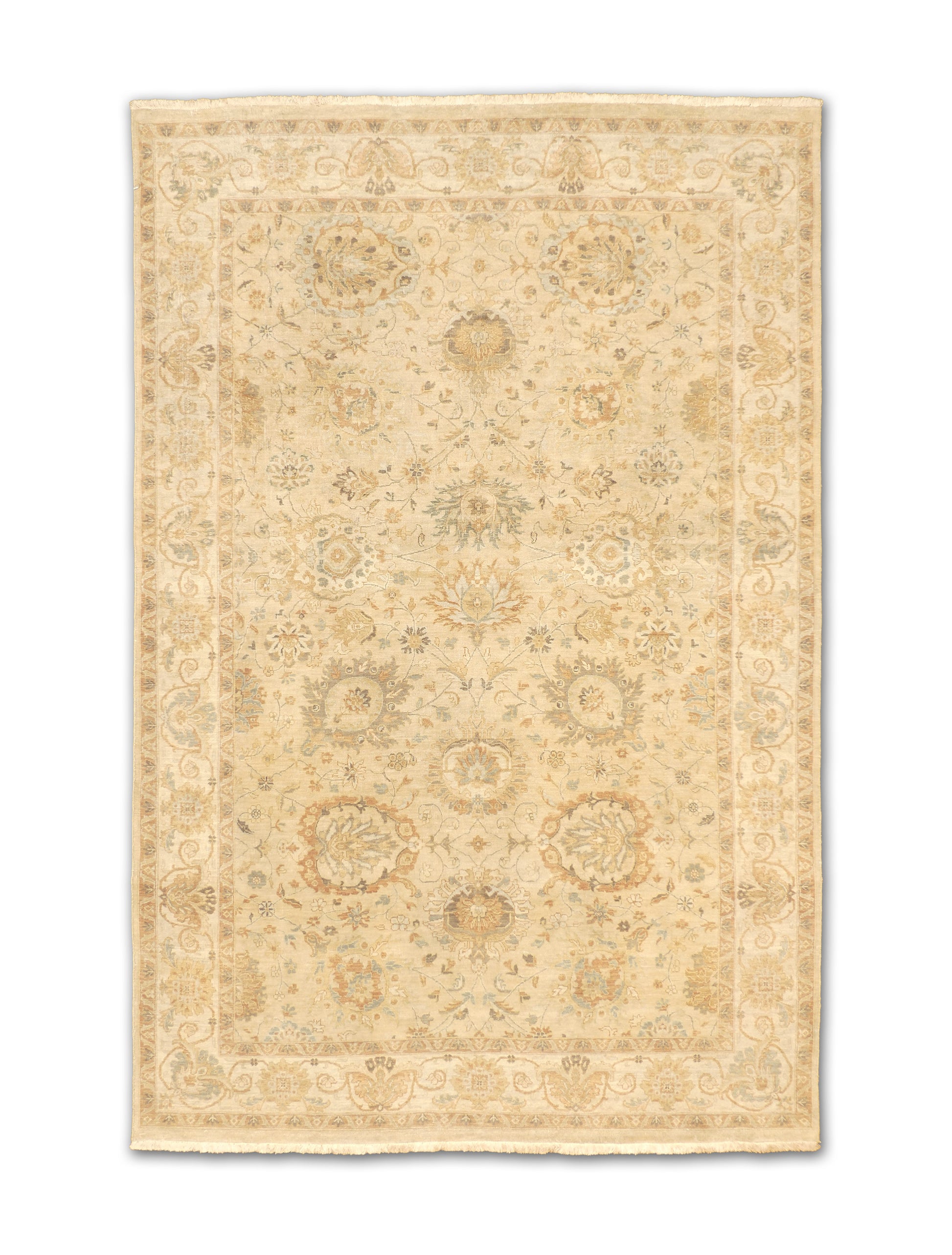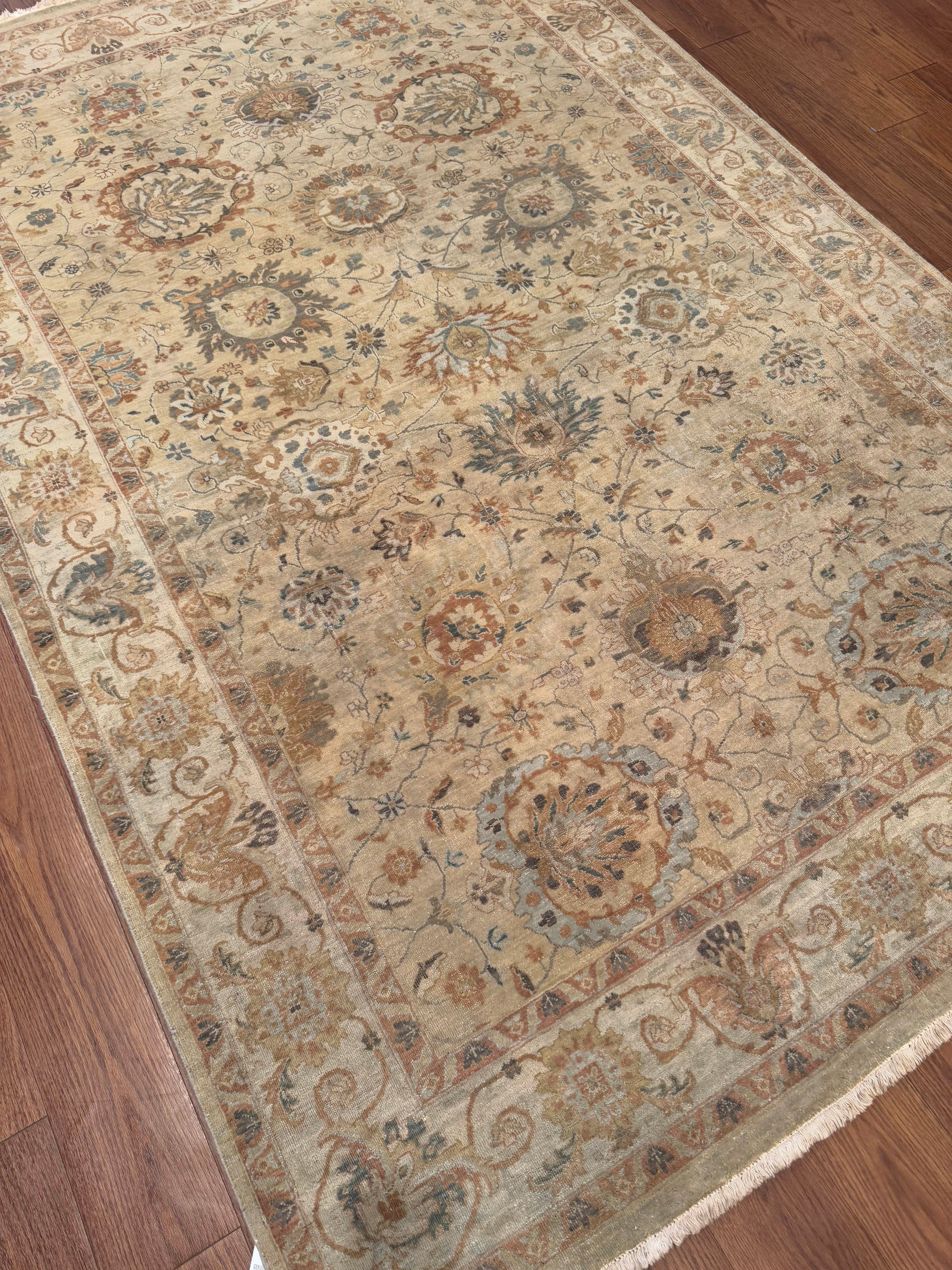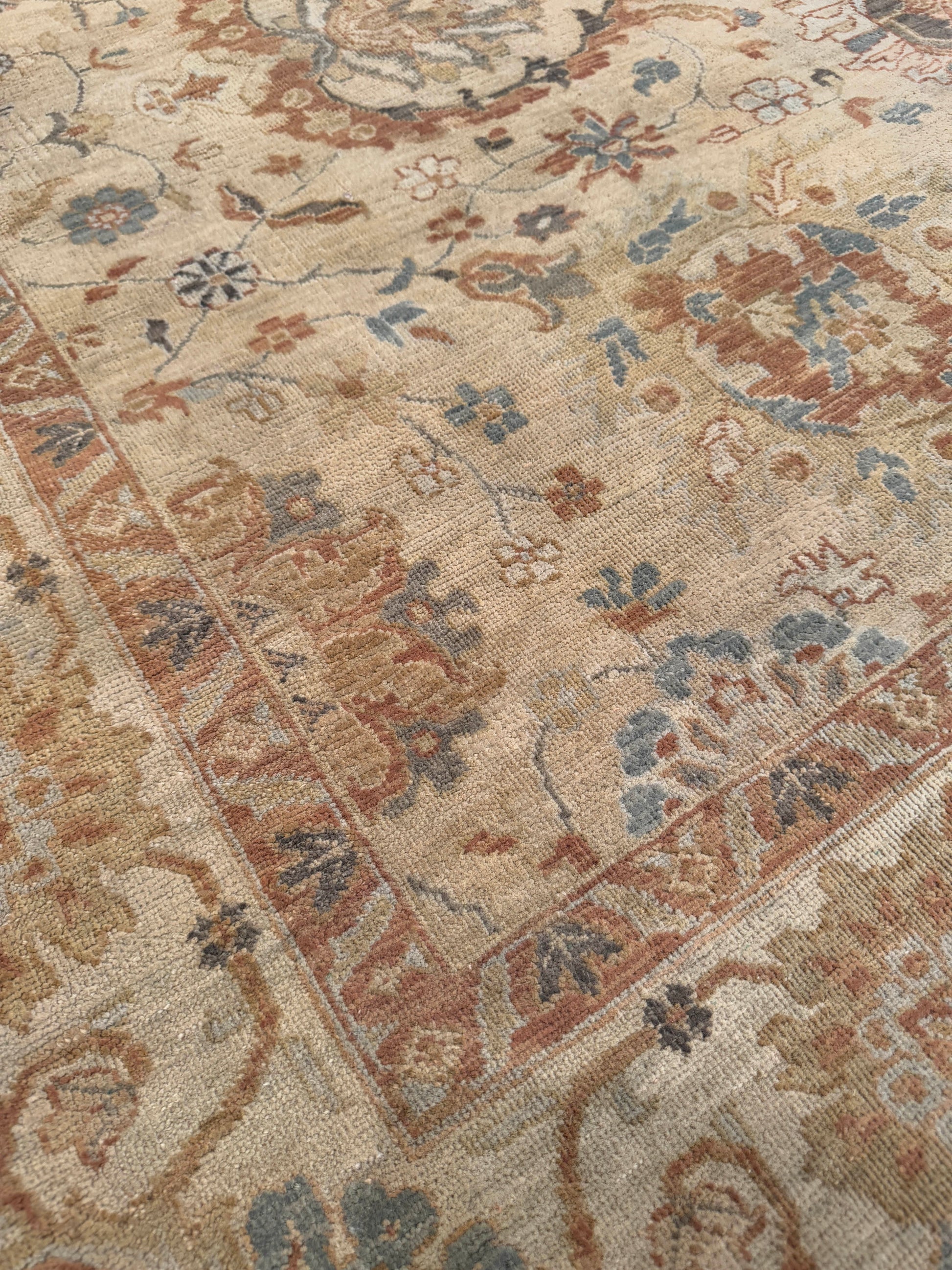This elegant hand-knotted rug features an allover floral and vine design gracefully arranged across a soft beige field. The muted palette of ivory, tan, light blue, and subtle terracotta lends a refined, antique-inspired character. A delicately patterned border frames the composition, adding depth and balance while maintaining a timeless look. Its versatile tones make it suitable for both traditional and transitional interiors.