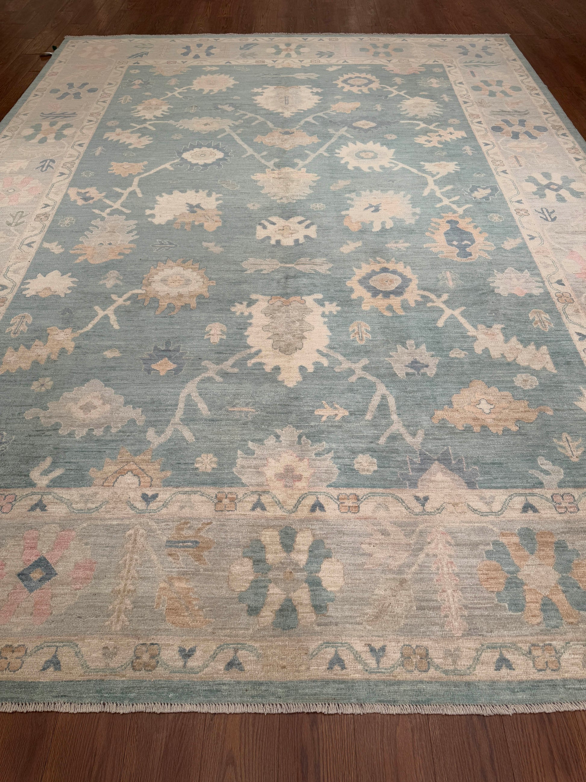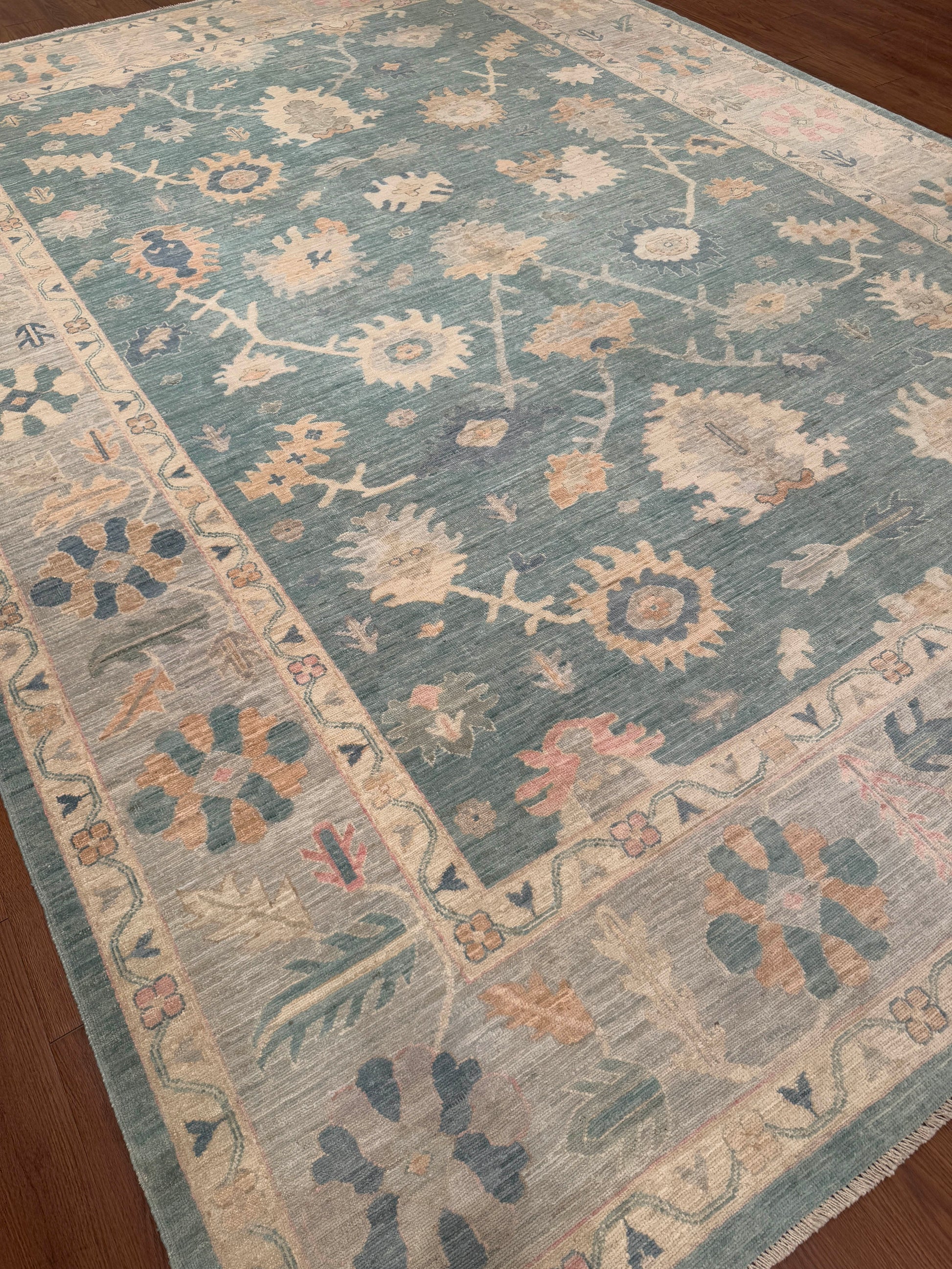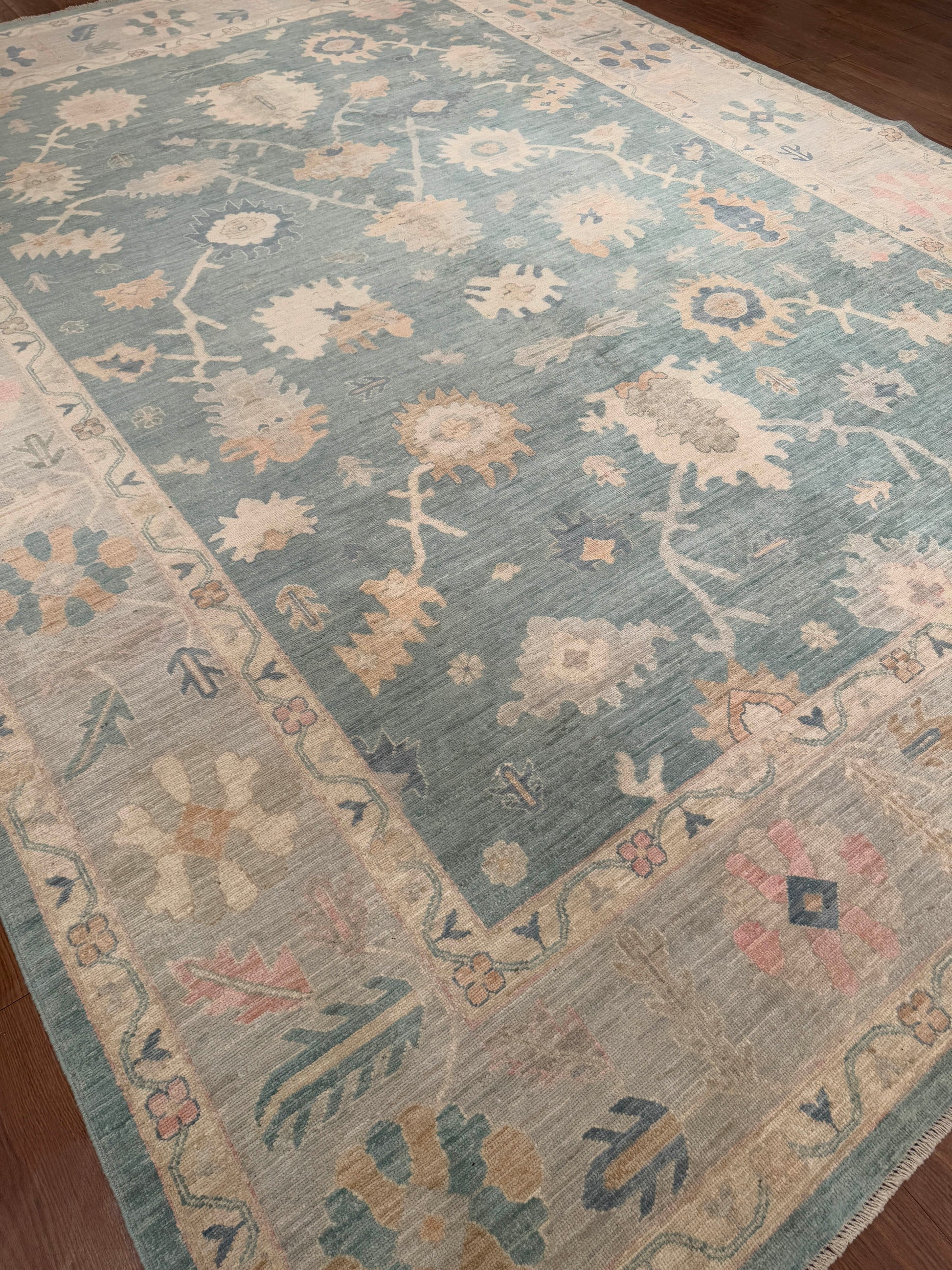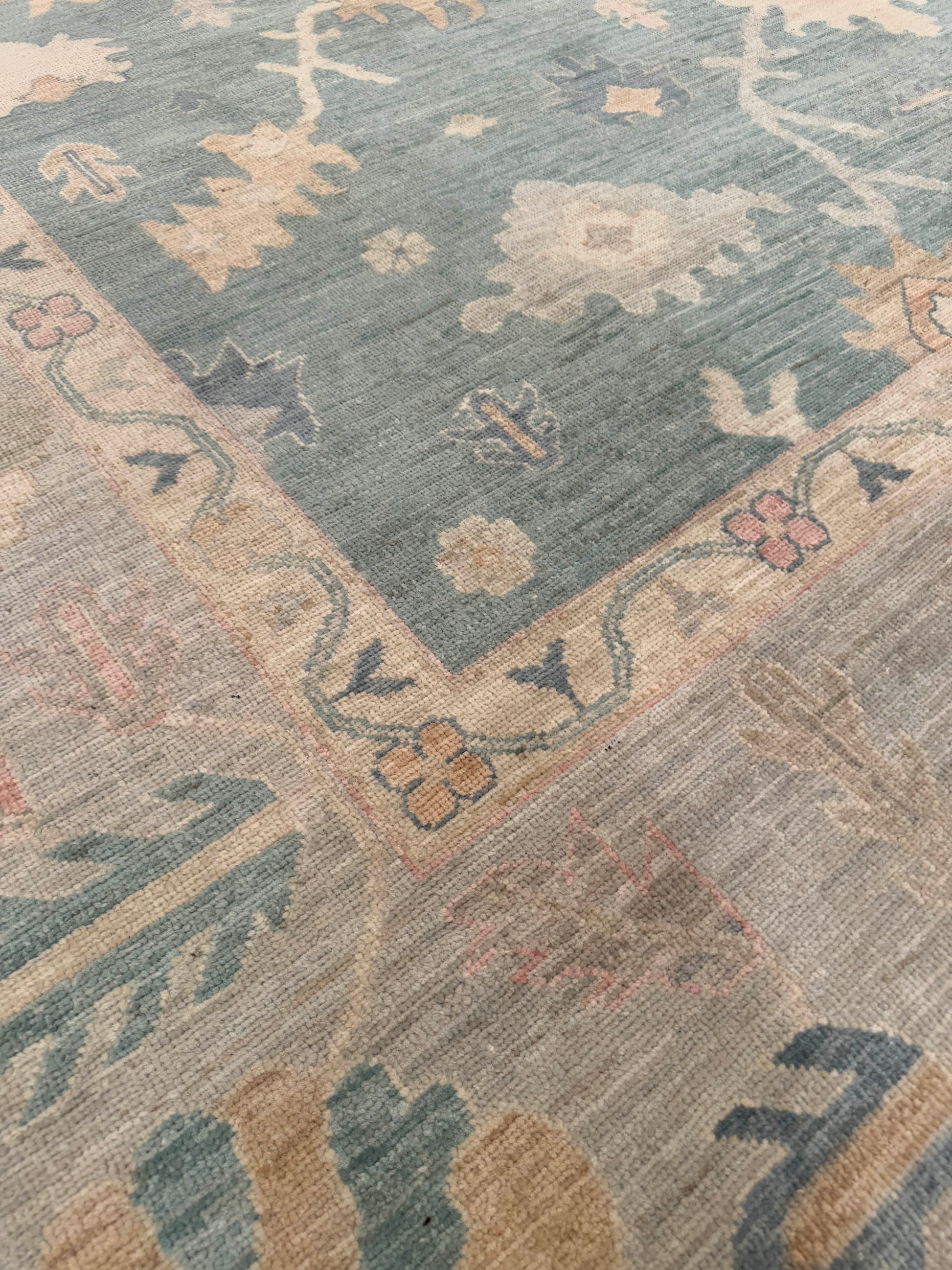 This beautifully handwoven rug features a tranquil and airy palette that evokes a sense of calm and openness. The soft teal field is adorned with delicate floral and vine motifs in muted ivory, beige, and blush, offering a graceful balance between traditional artistry and contemporary serenity. Its washed finish and refined texture make it a versatile foundation for elegant interiors.