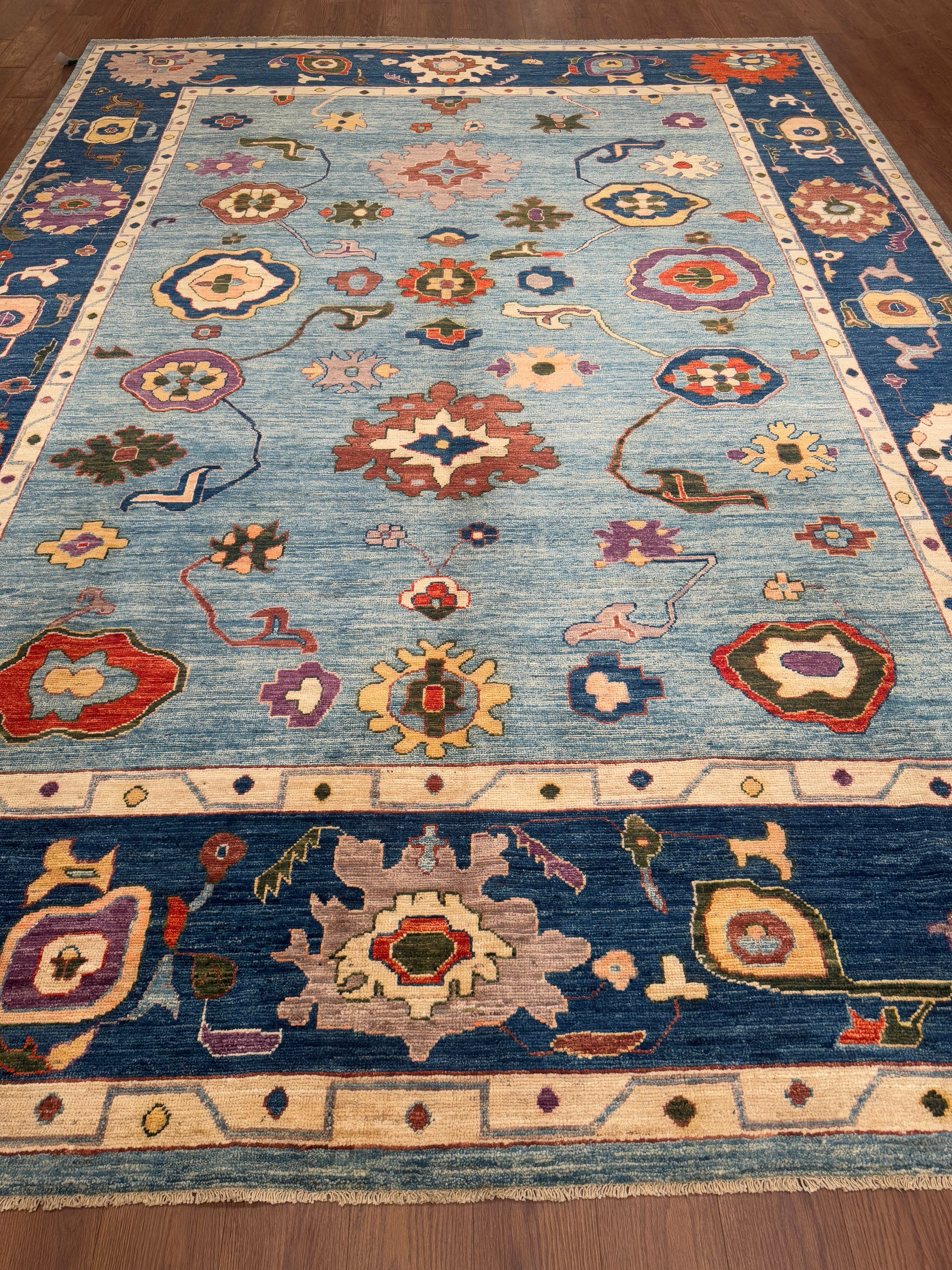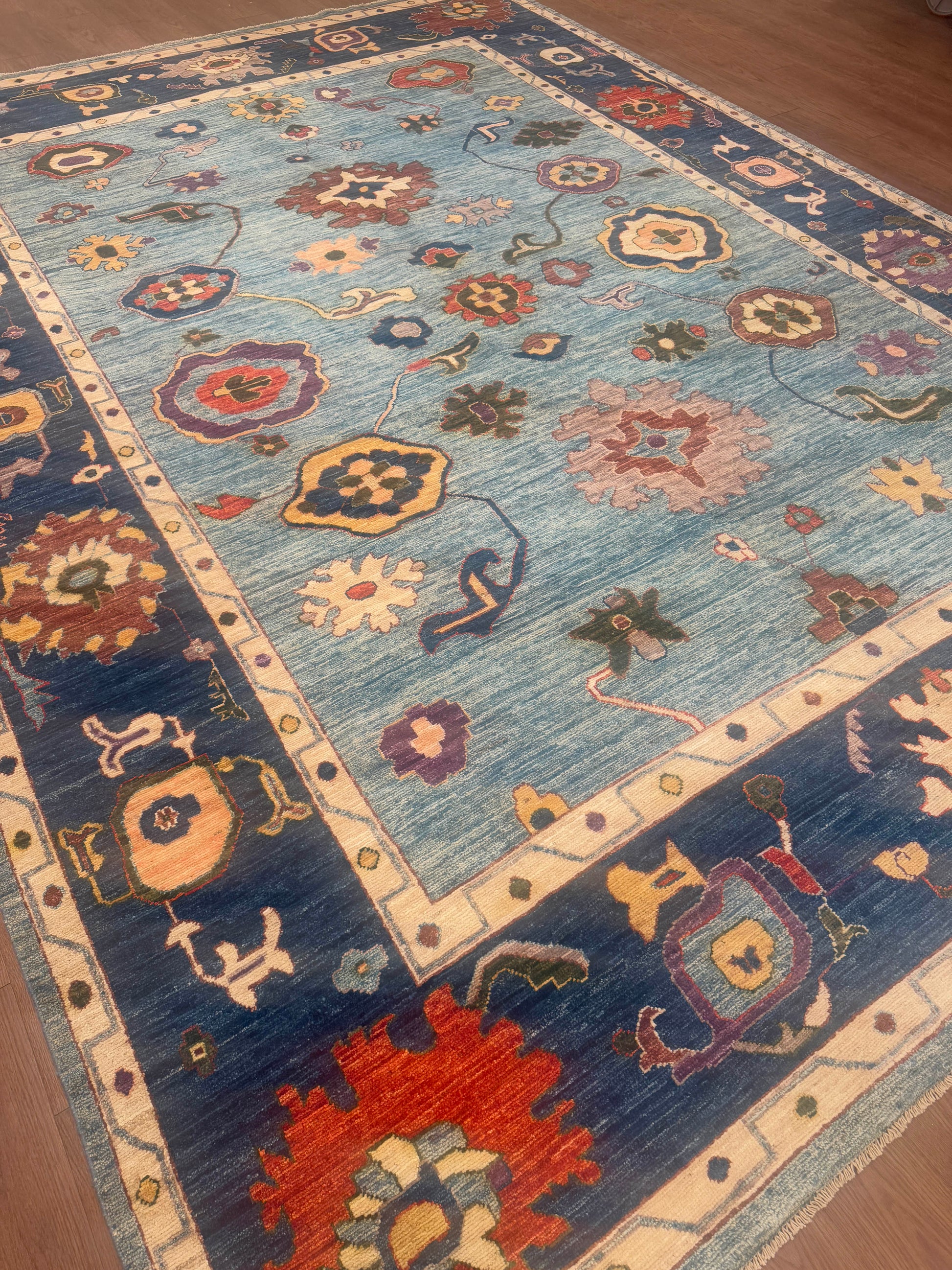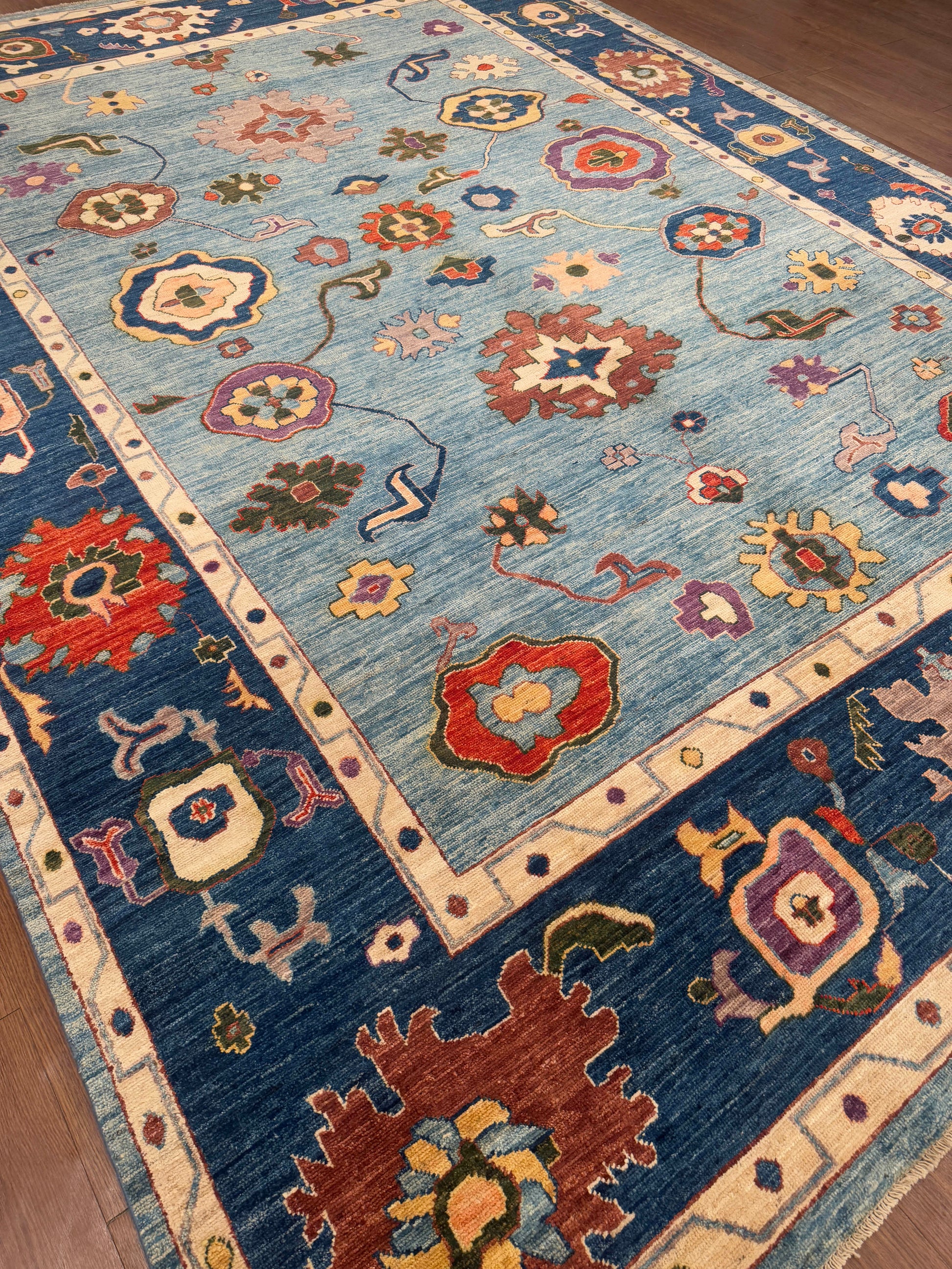 This vibrant handwoven rug showcases a playful mix of floral and tribal motifs set against a soothing sky-blue background. Accents of deep navy, coral, ivory, and lavender add movement and depth, while the contrasting border frames the design beautifully. Its cheerful palette and rich texture make it a perfect statement piece for modern and eclectic interiors alike.