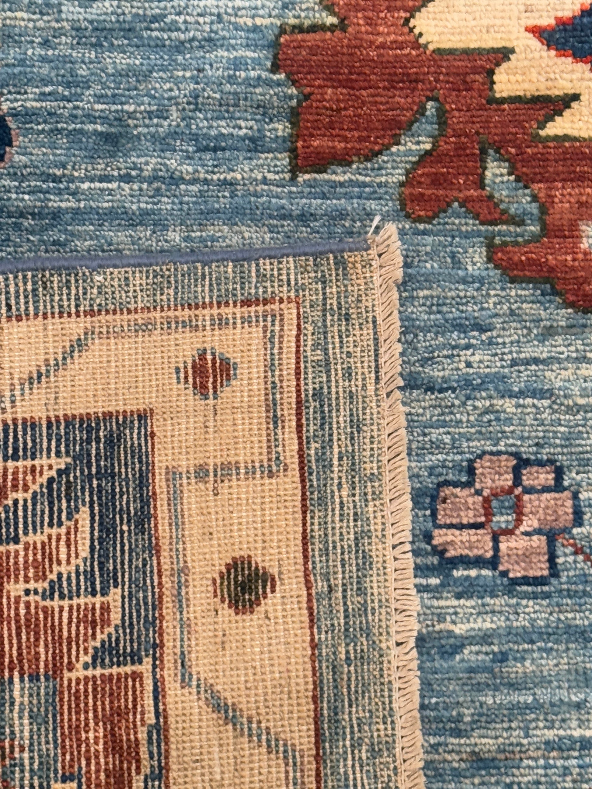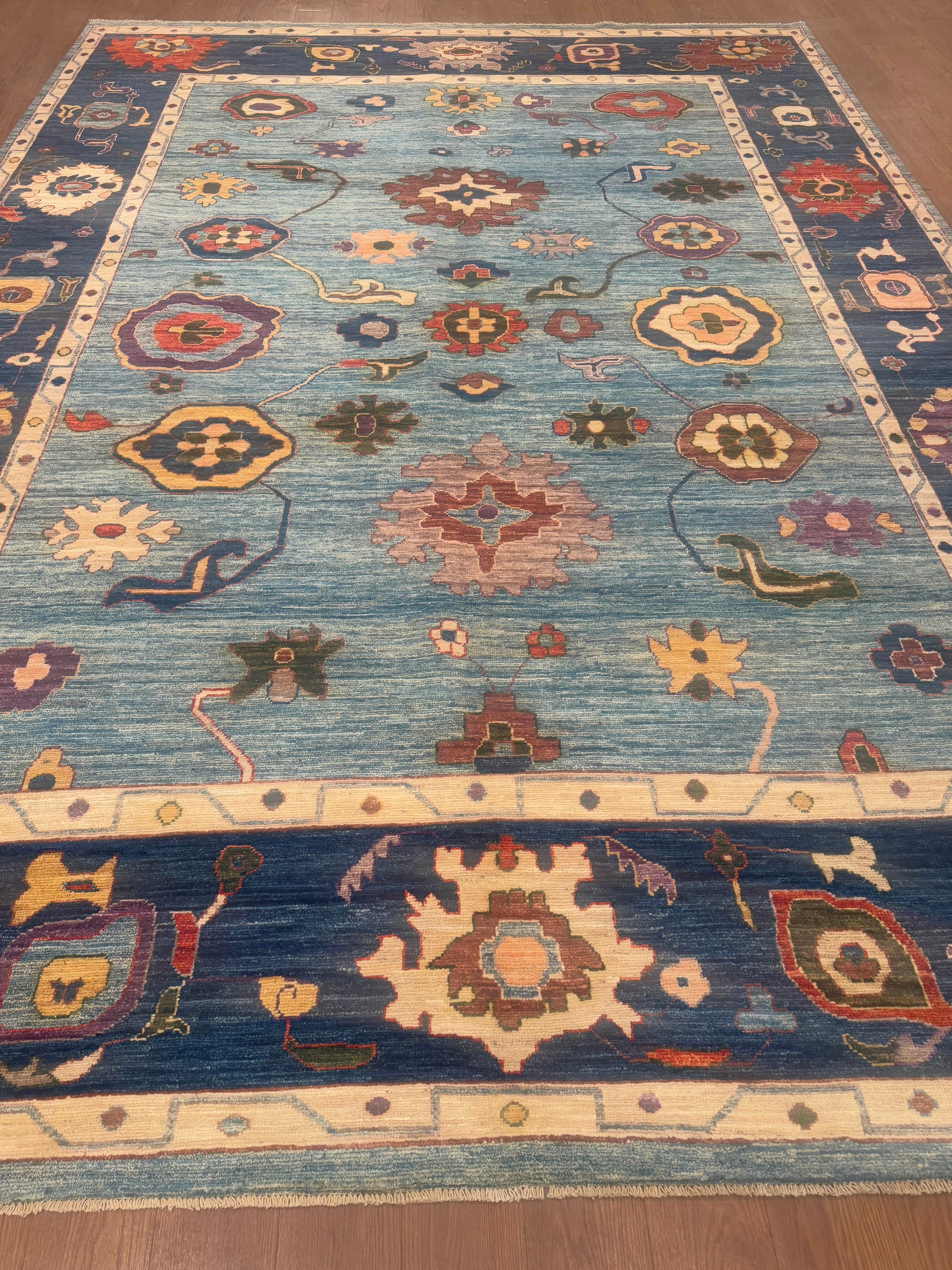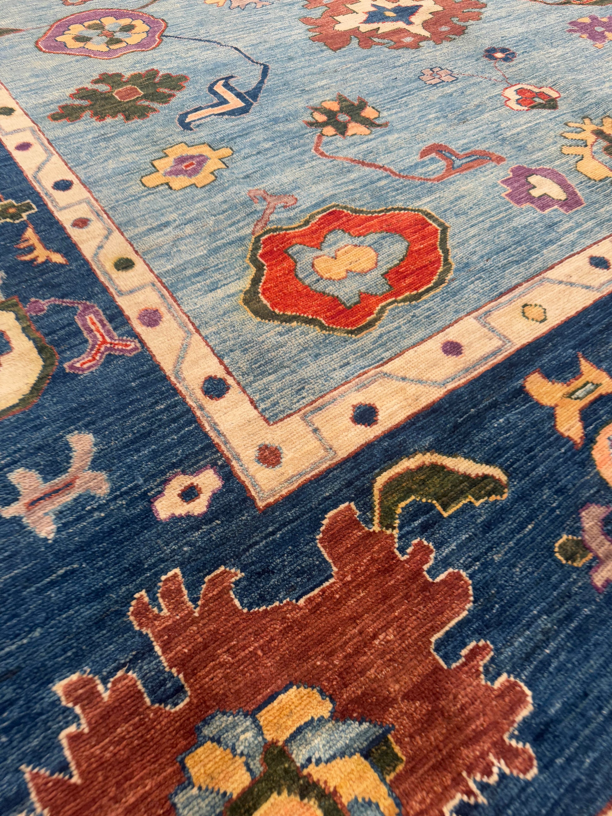 This vibrant handwoven rug showcases a playful mix of floral and tribal motifs set against a soothing sky-blue background. Accents of deep navy, coral, ivory, and lavender add movement and depth, while the contrasting border frames the design beautifully. Its cheerful palette and rich texture make it a perfect statement piece for modern and eclectic interiors alike.
