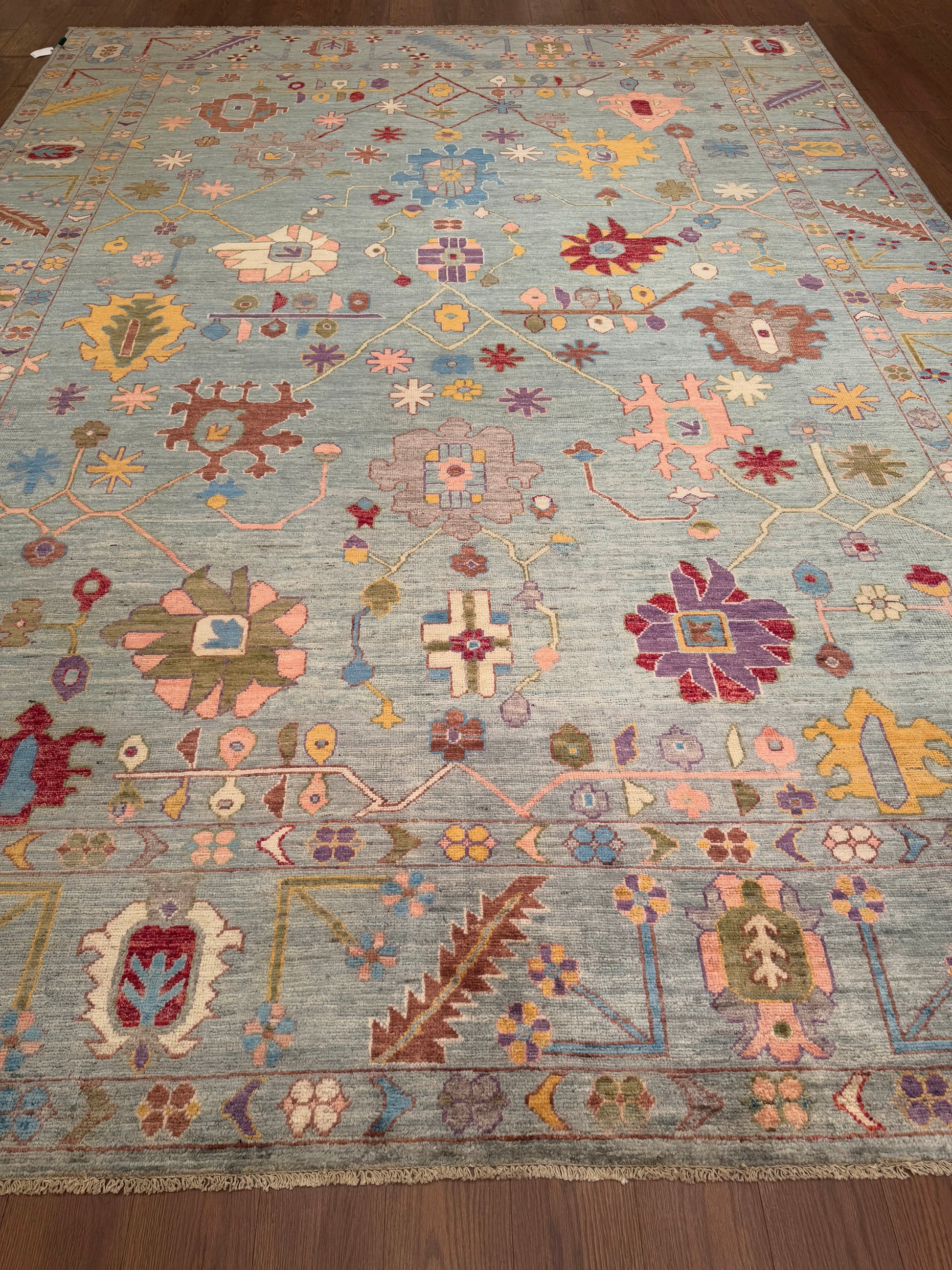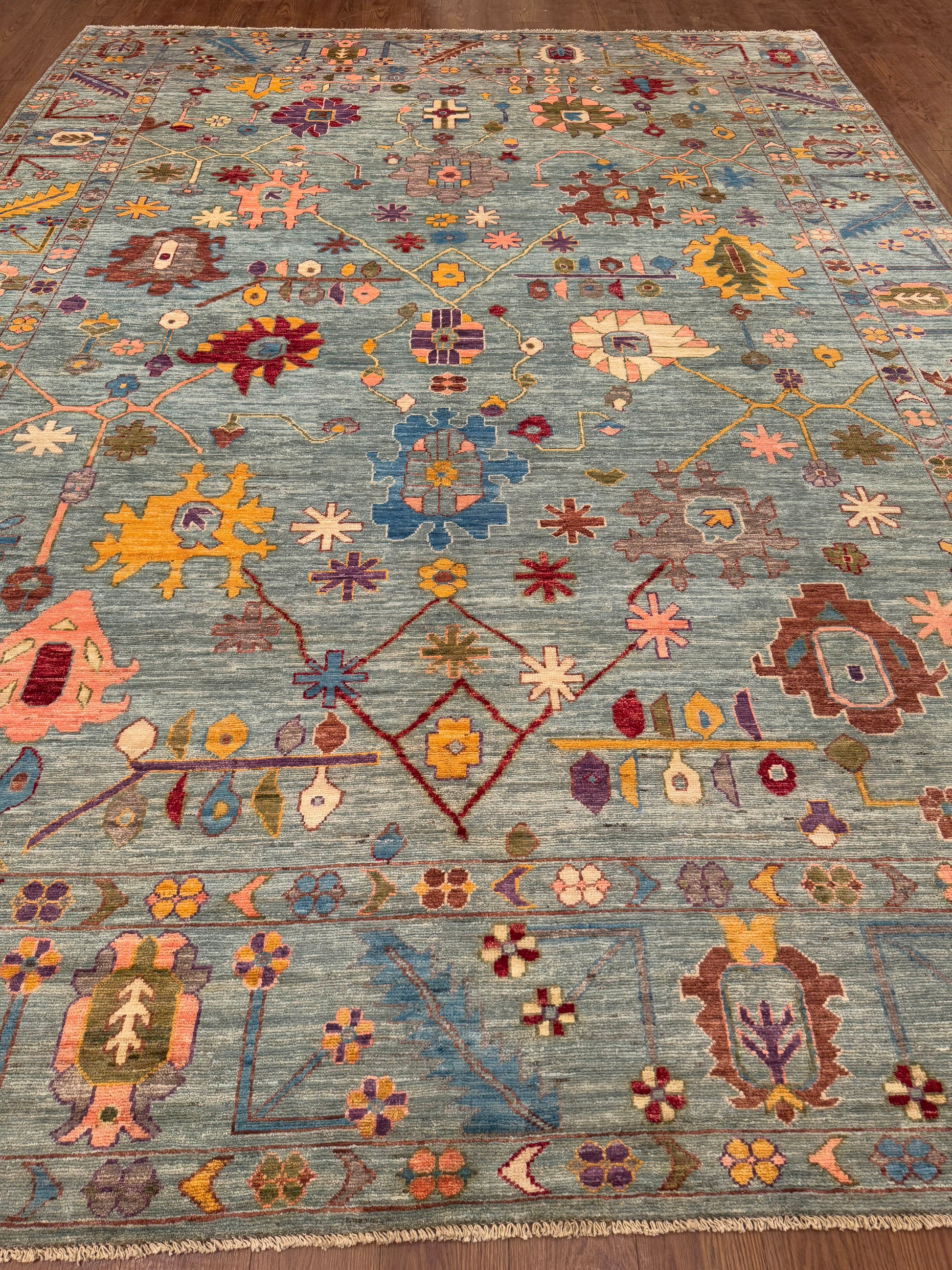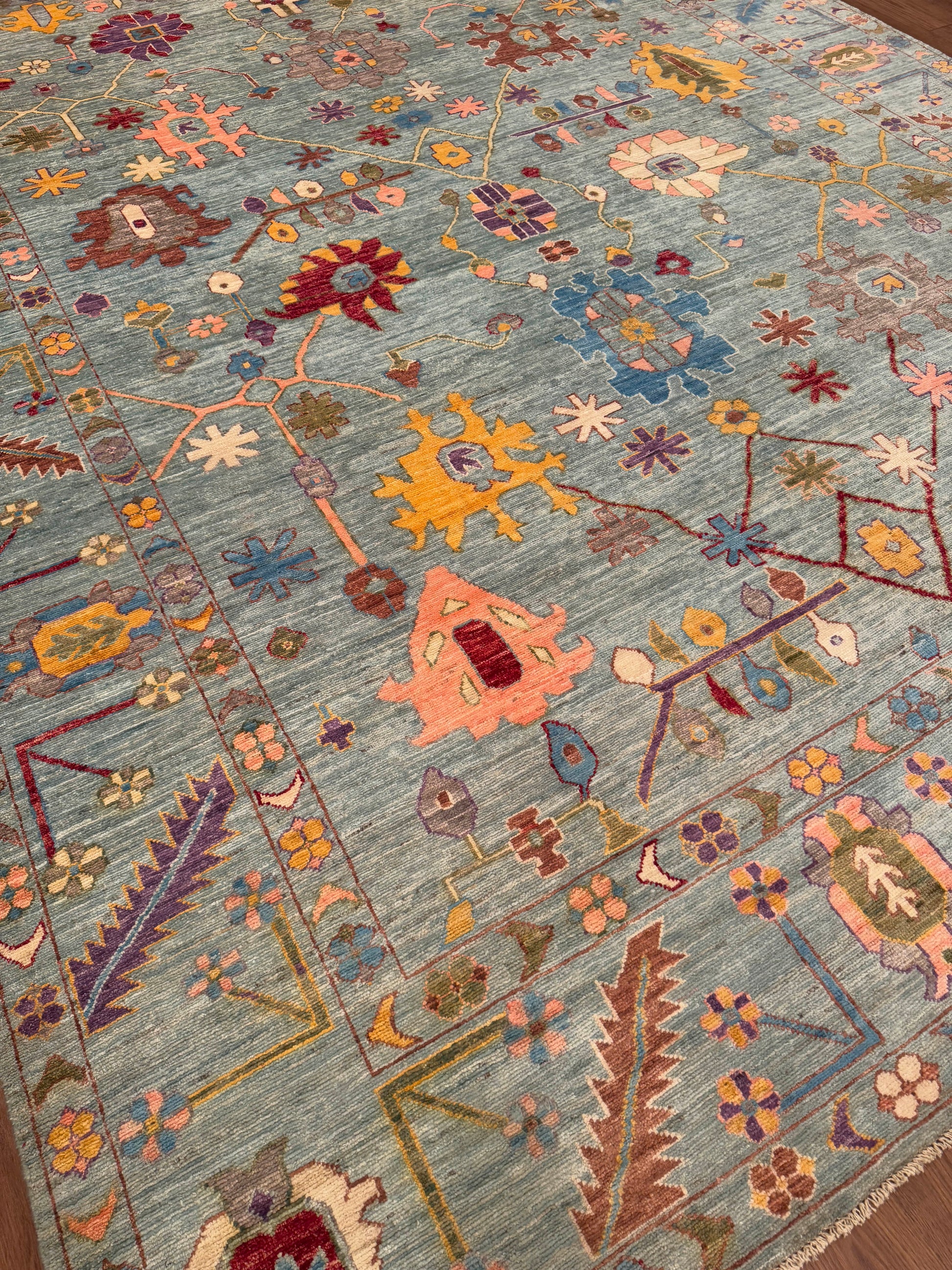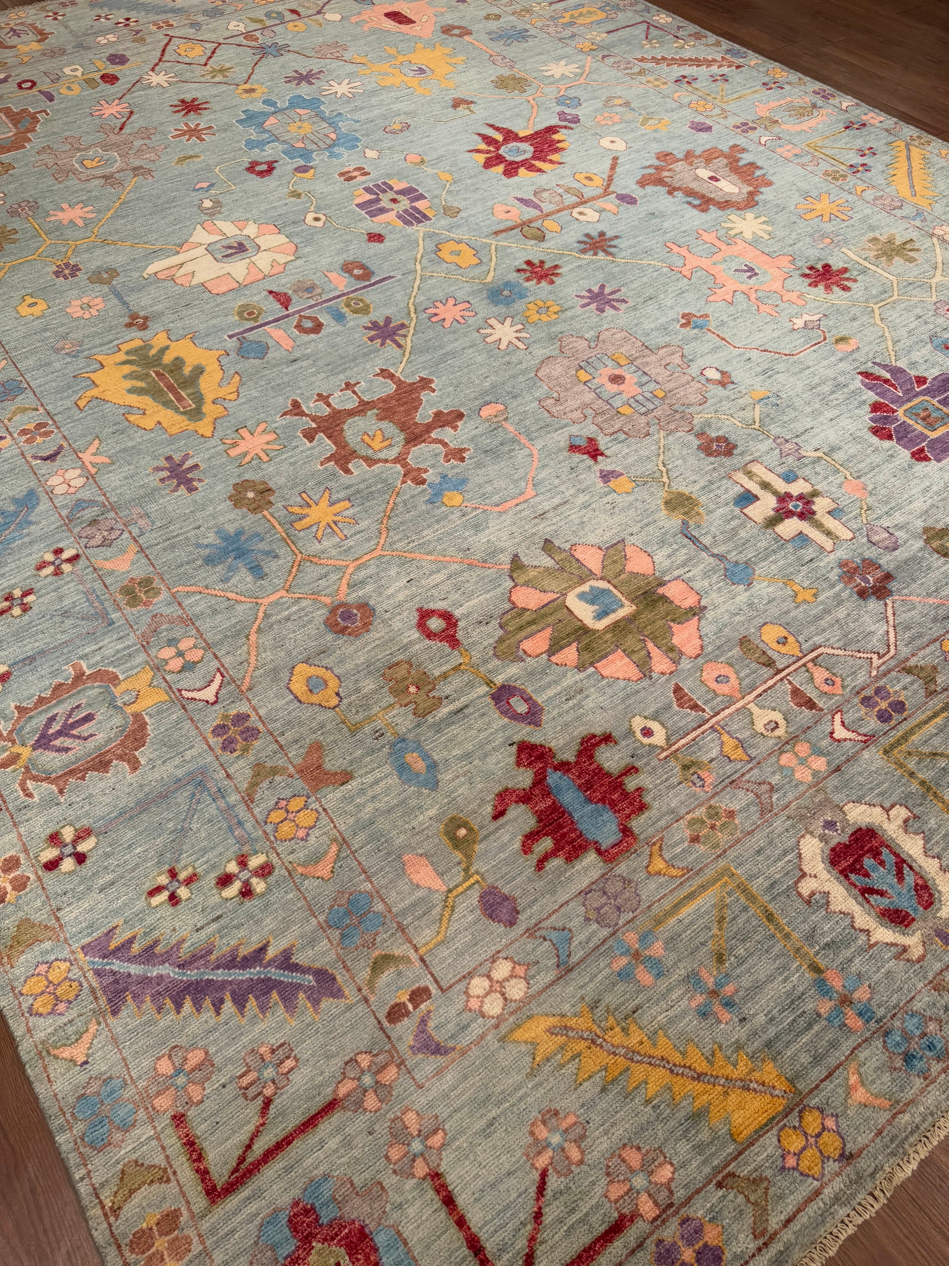 This elegant handwoven rug features a serene light blue backdrop adorned with whimsical floral and geometric motifs in shades of coral, lavender, mustard, and rose. The free-flowing pattern creates a balanced mix of tradition and playfulness, adding warmth and personality to any space. Its soft color palette and artisanal texture make it perfect for both modern and classic interiors.