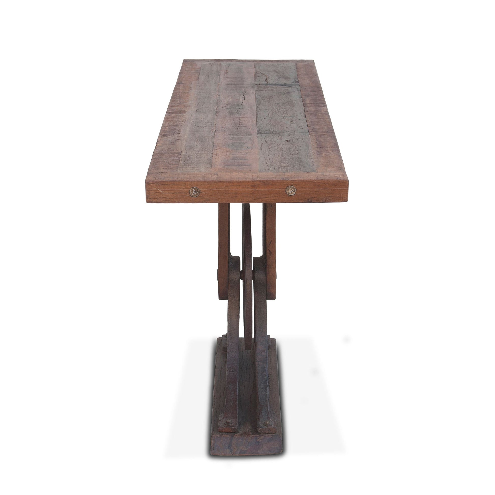 This console table blends industrial character with timeless craftsmanship. Crafted from reclaimed hardwood in a natural patina finish, it highlights the texture and imperfections that give each piece its unique charm. The cast iron base provides durability and contrast, while vintage-inspired detailing adds a sense of heritage and design authenticity. Perfect for entryways, living spaces, or offices, it serves as both a statement piece and a functional surface that embodies rugged sophistication.