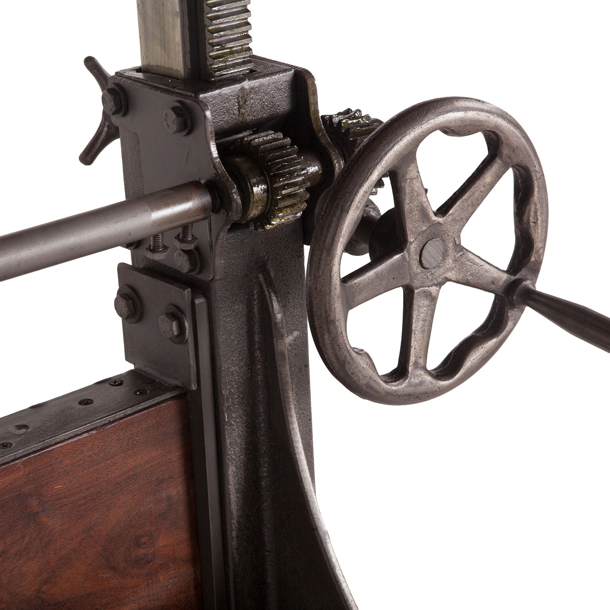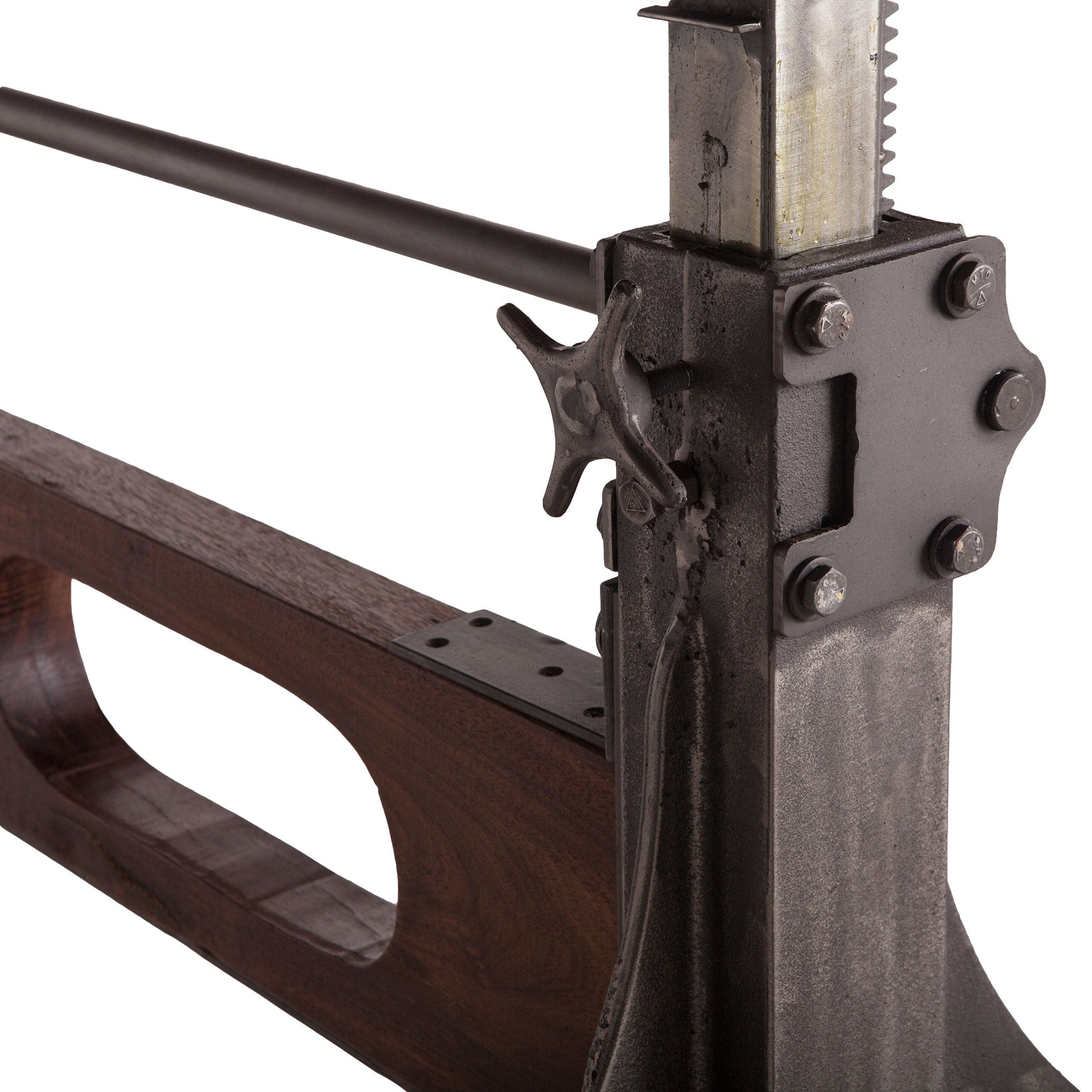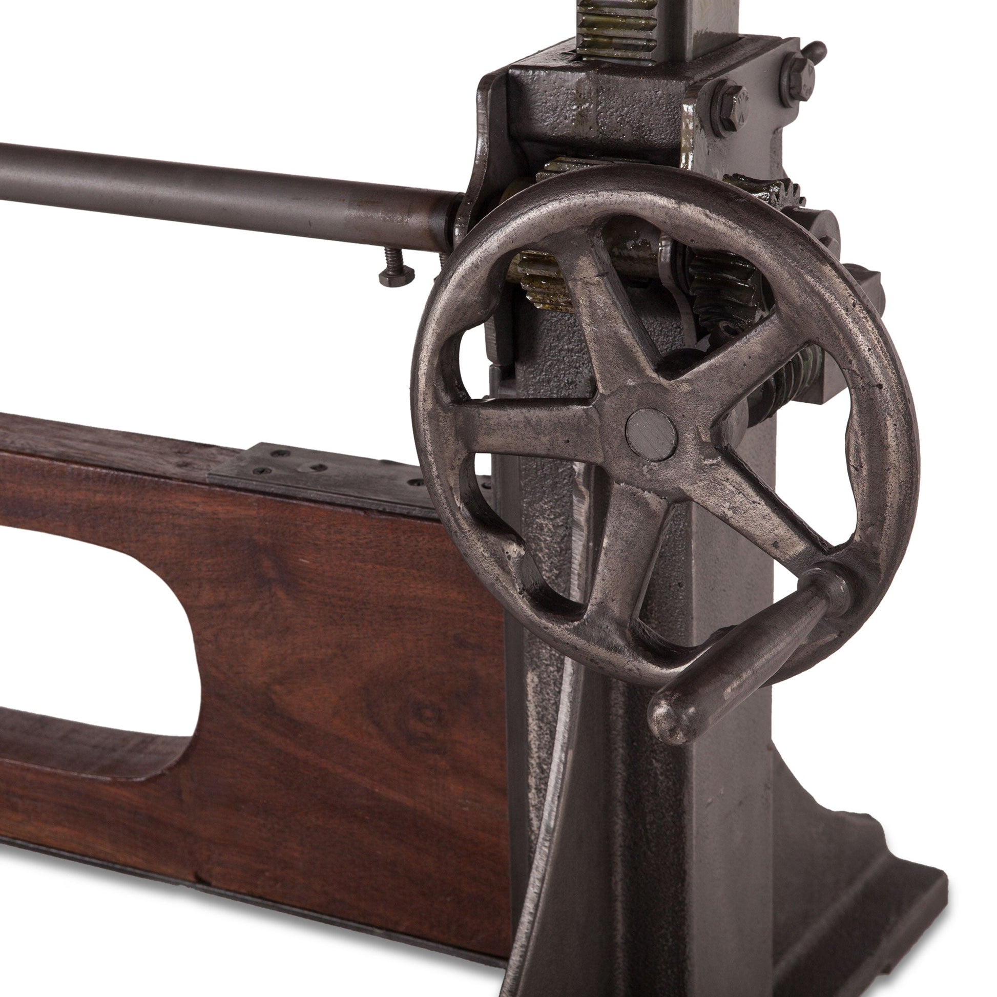 This handcrafted dining table captures the spirit of industrial design through reclaimed materials and authentic craftsmanship. The solid teakwood top, finished in a weathered natural tone, reveals the character and grain of the wood while maintaining a refined surface. A hand-crank mechanism integrated into the cast iron base allows smooth height adjustment, transforming the table from dining to bar height with ease. The trestle-style base in gunmetal gray completes the look, balancing rustic warmth with mechanical artistry.