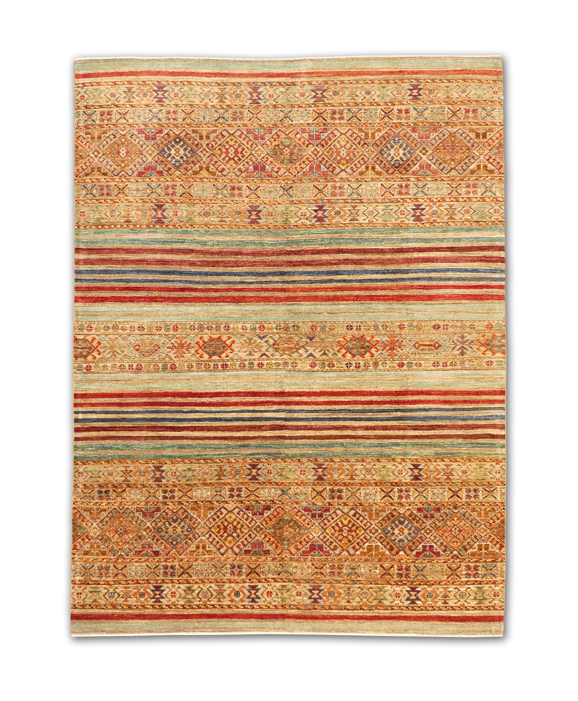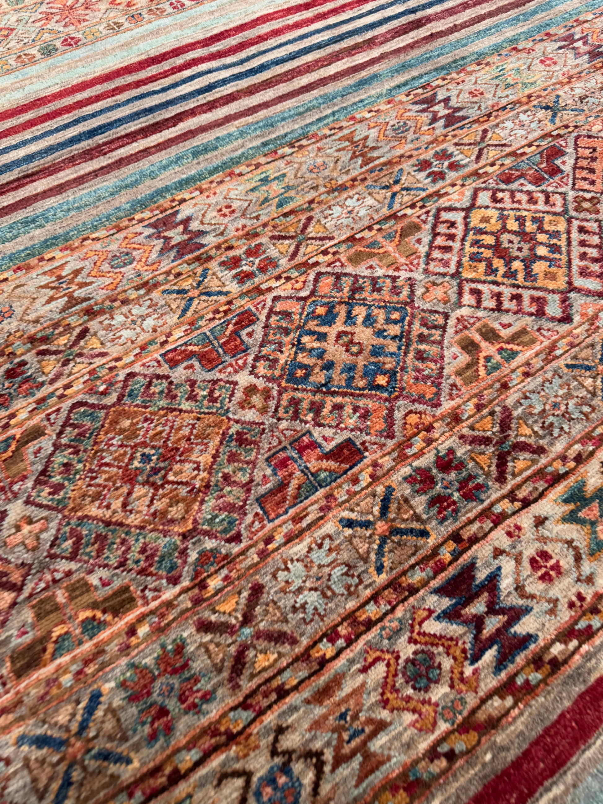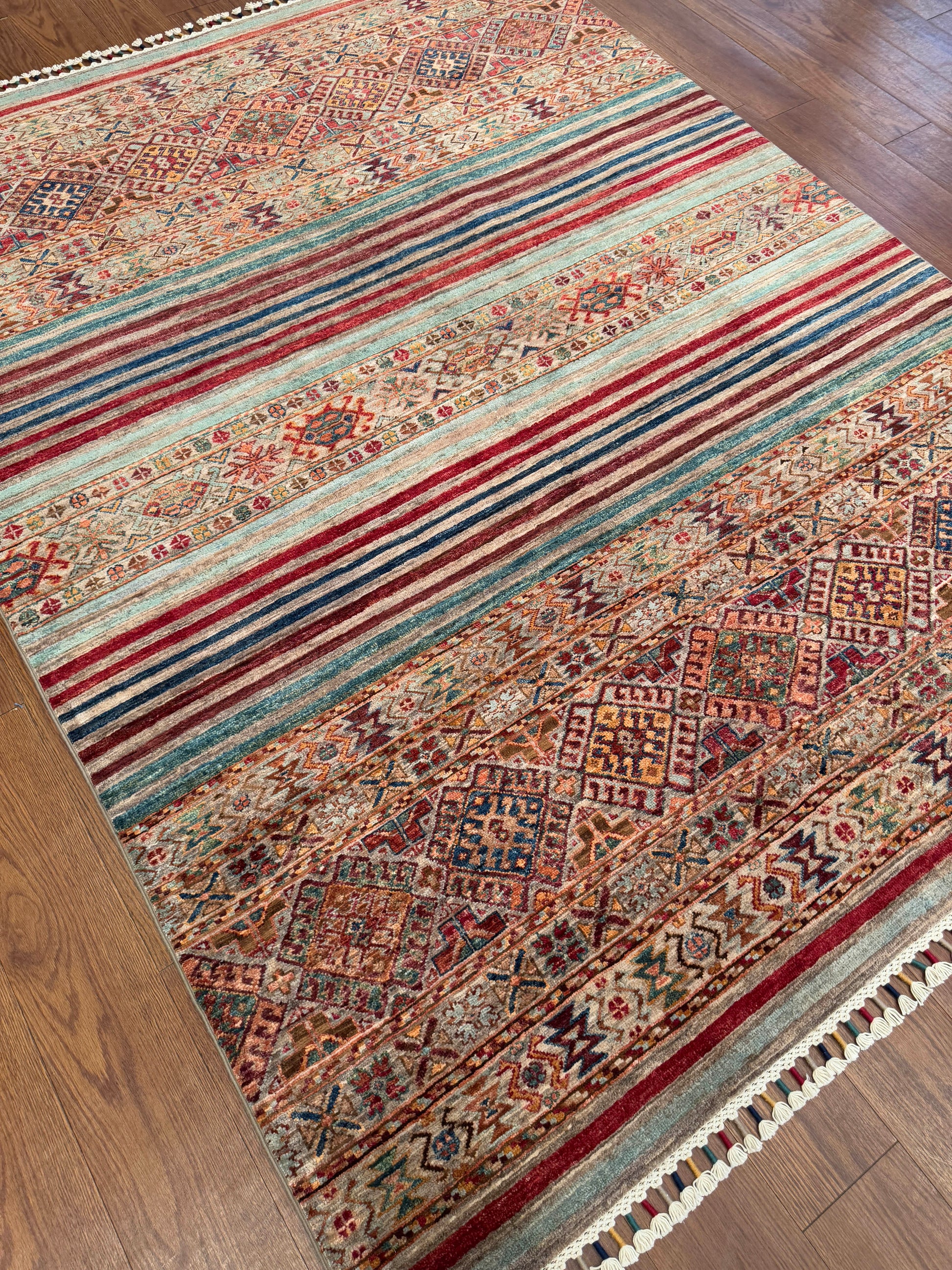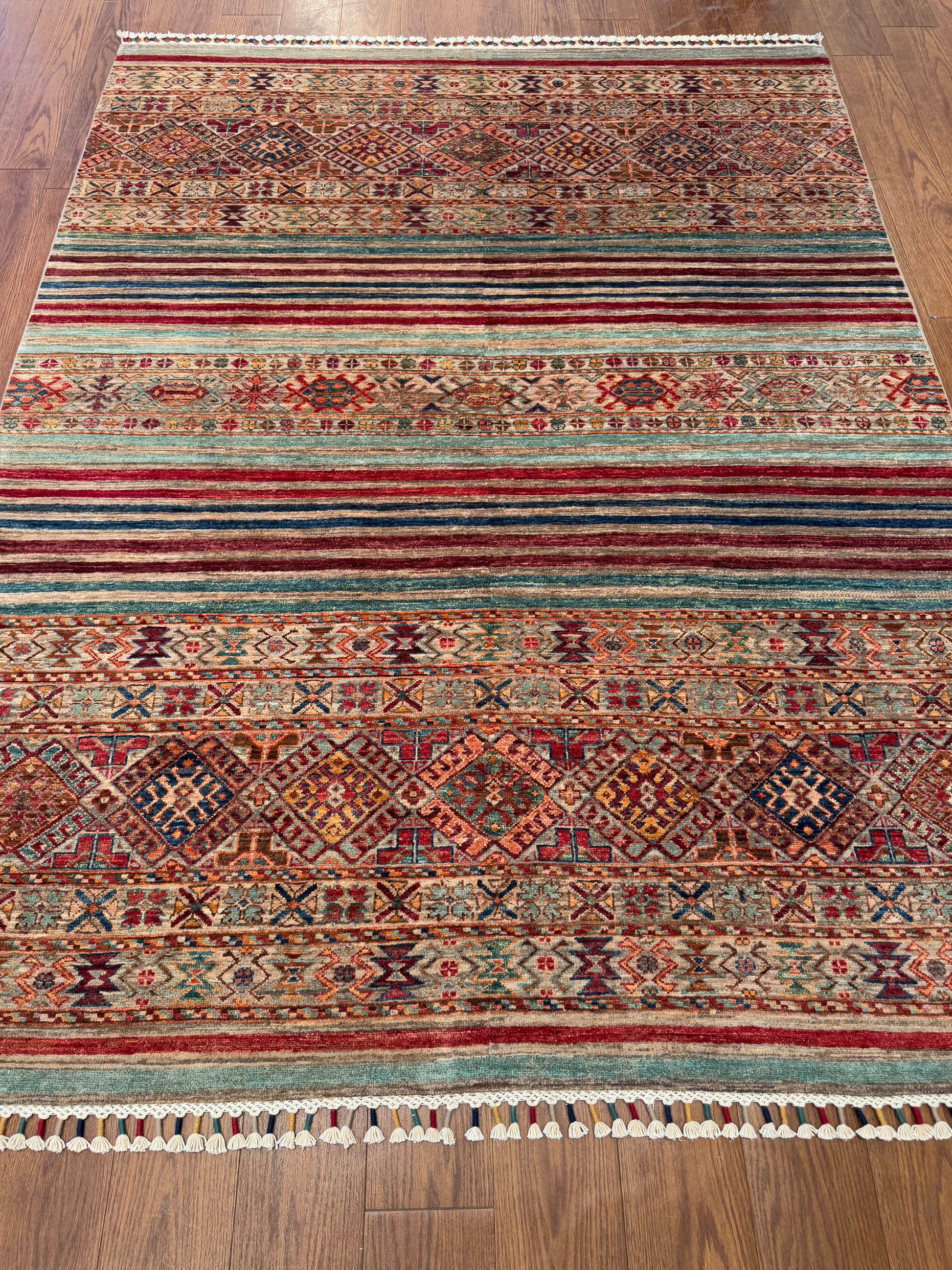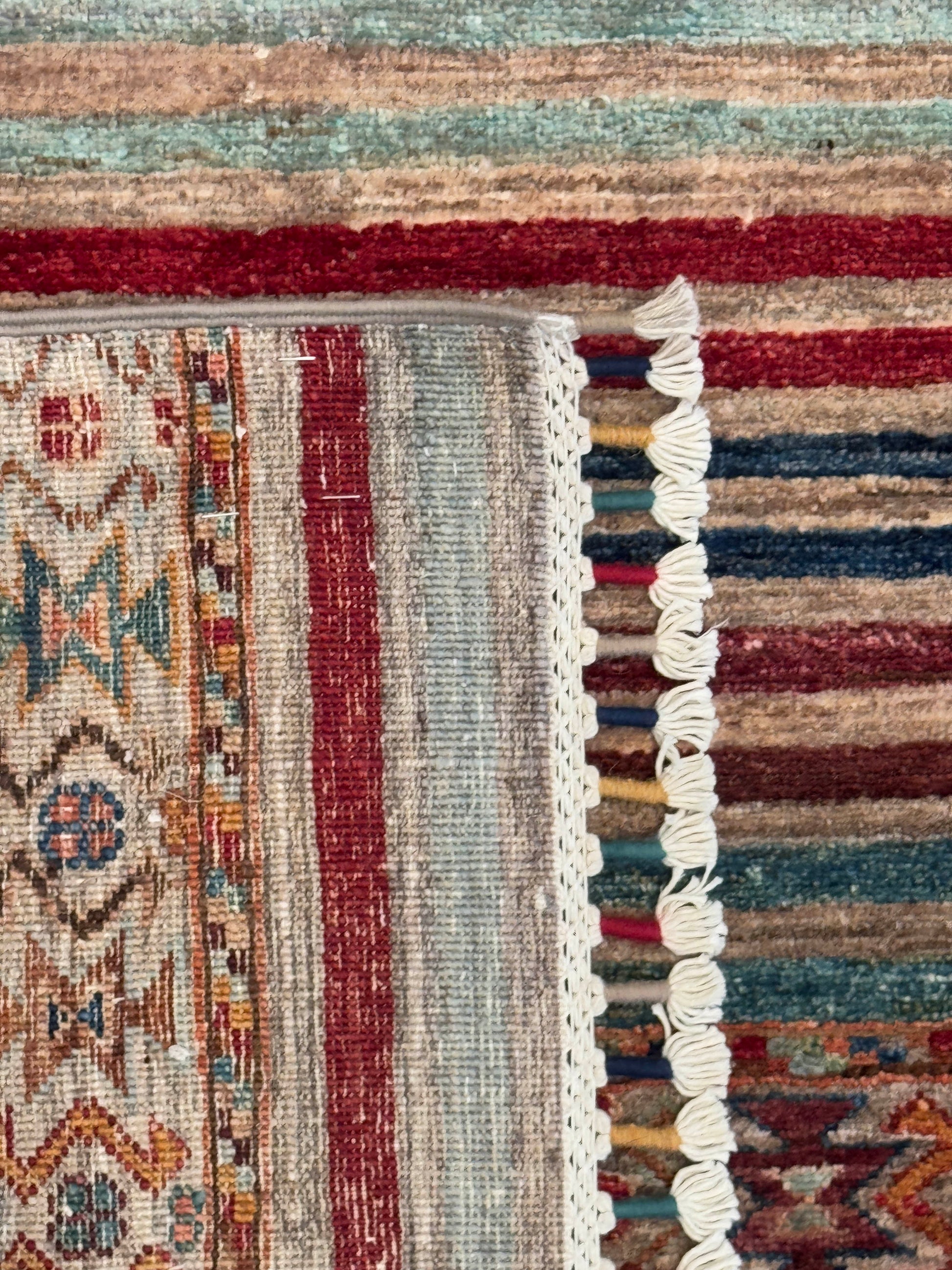 This rug showcases a stunning mix of tribal and modern aesthetics with its horizontal stripe layout interspersed with diamond lattice patterns. The warm palette of rust, red, ivory, teal, and navy creates depth and vibrancy, while the alternating narrow and wide bands evoke a nomadic weaving tradition. Decorative fringes add an artisanal finishing touch, making this rug a versatile choice for eclectic and contemporary interiors alike.
