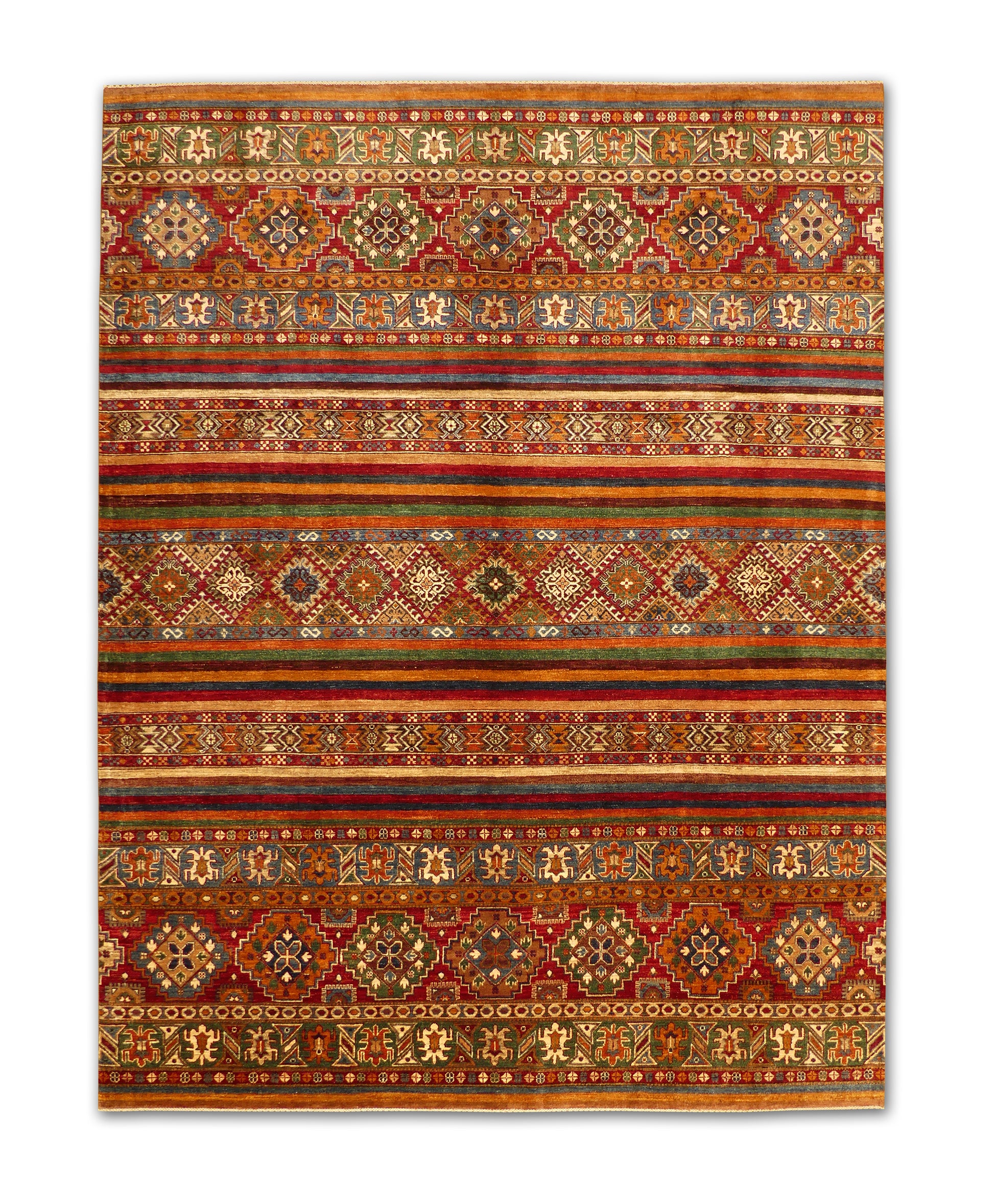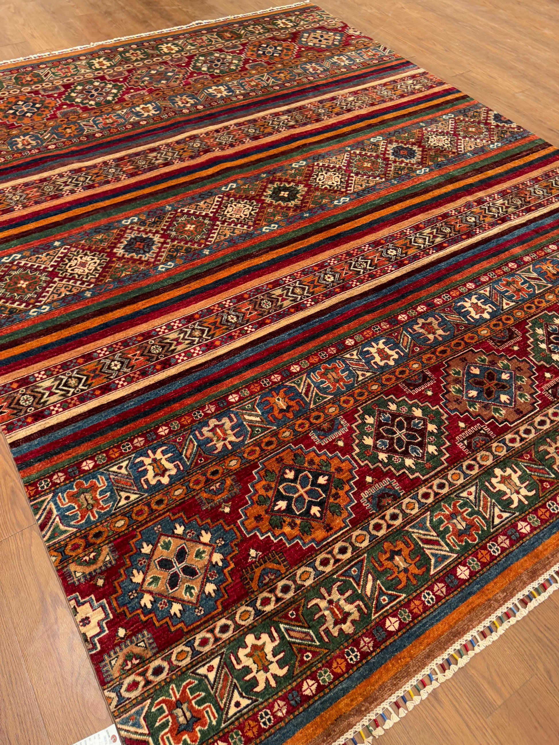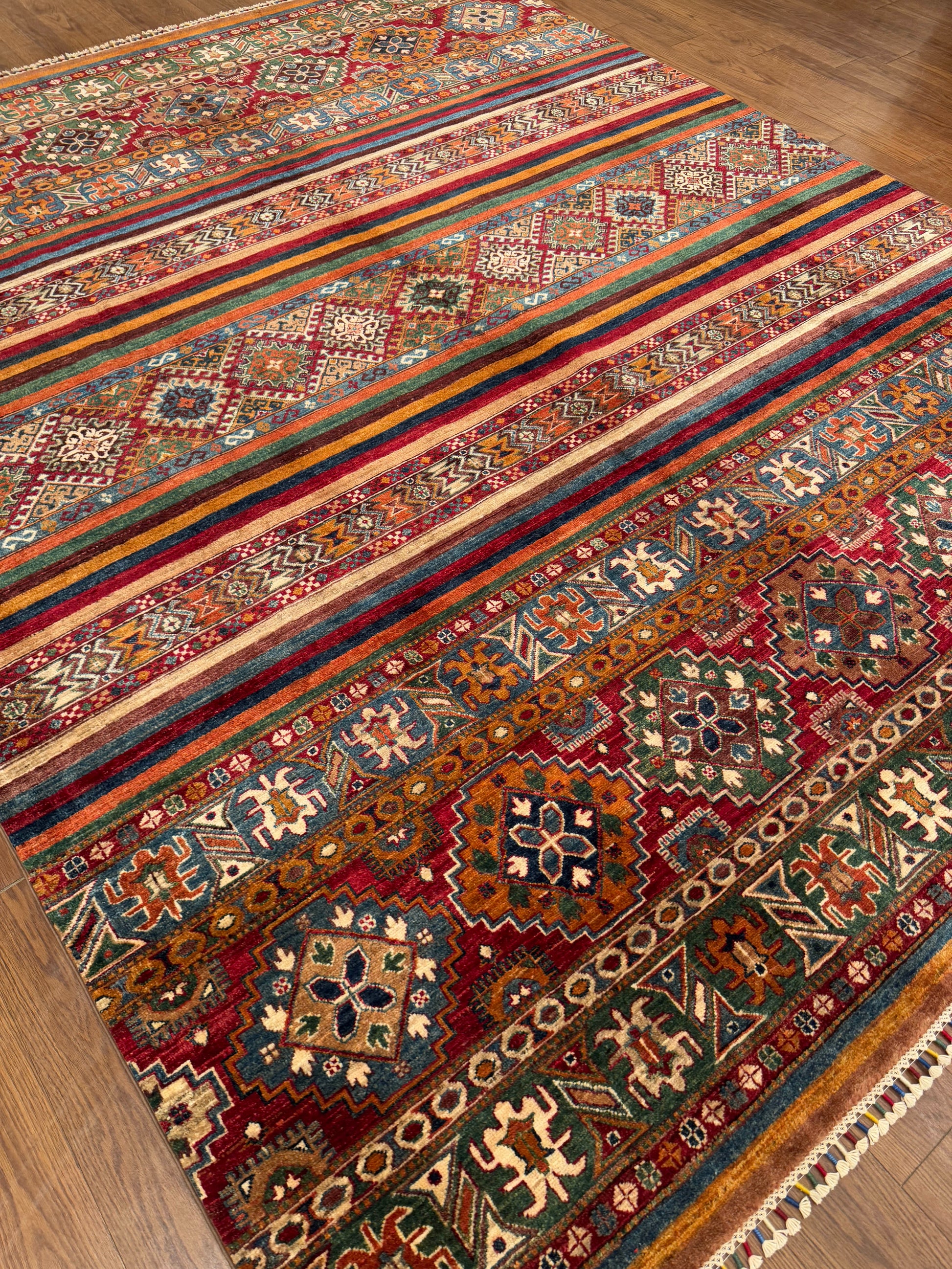 This handmade rug showcases a dynamic series of horizontal bands filled with intricate geometric motifs and tribal-inspired symbols. The blend of earthy reds, deep greens, blues, and golds creates a visually engaging and richly textured composition. Its layered stripe design evokes warmth and craftsmanship, making it a perfect centerpiece for eclectic, bohemian, or rustic interiors.