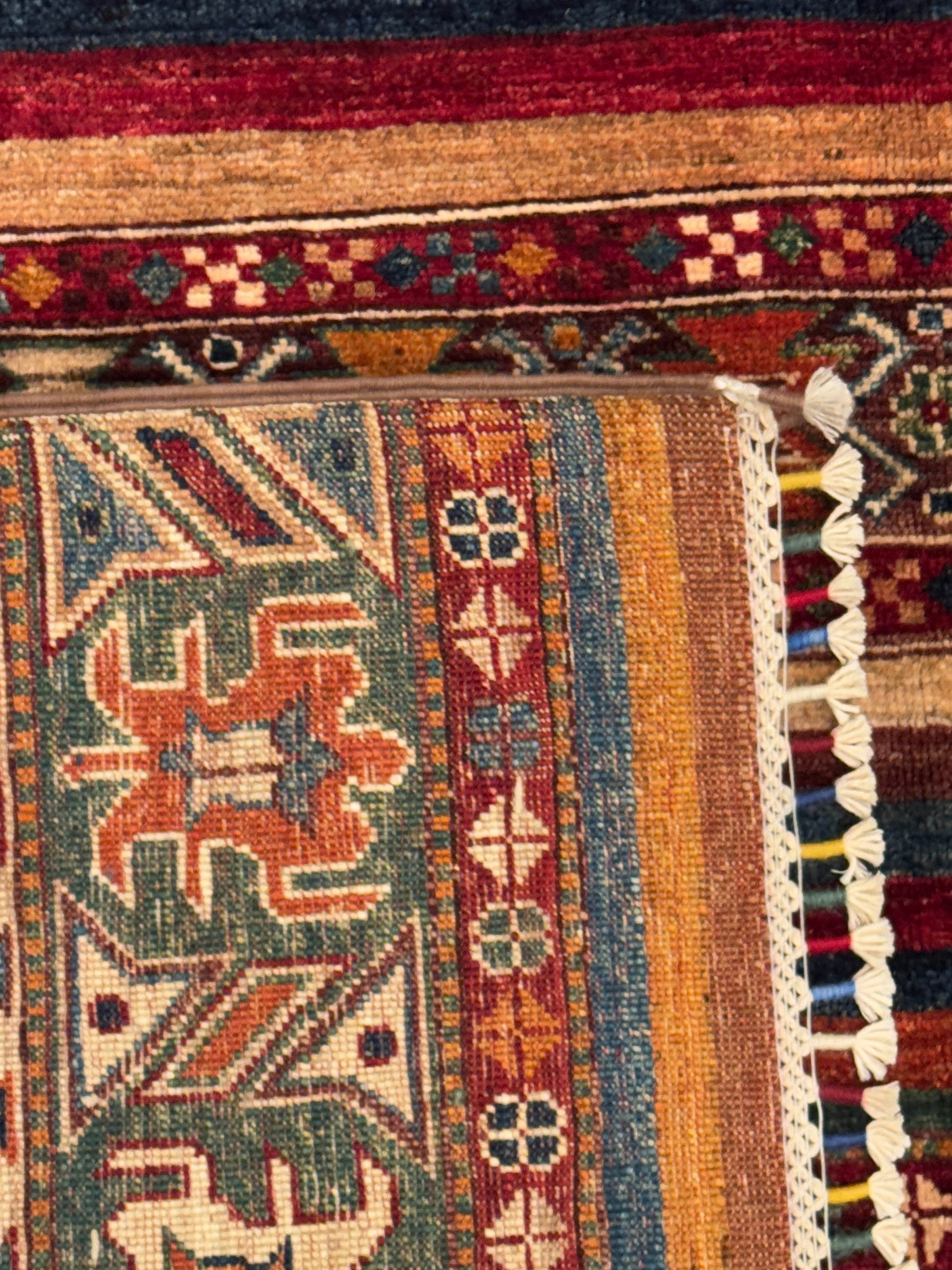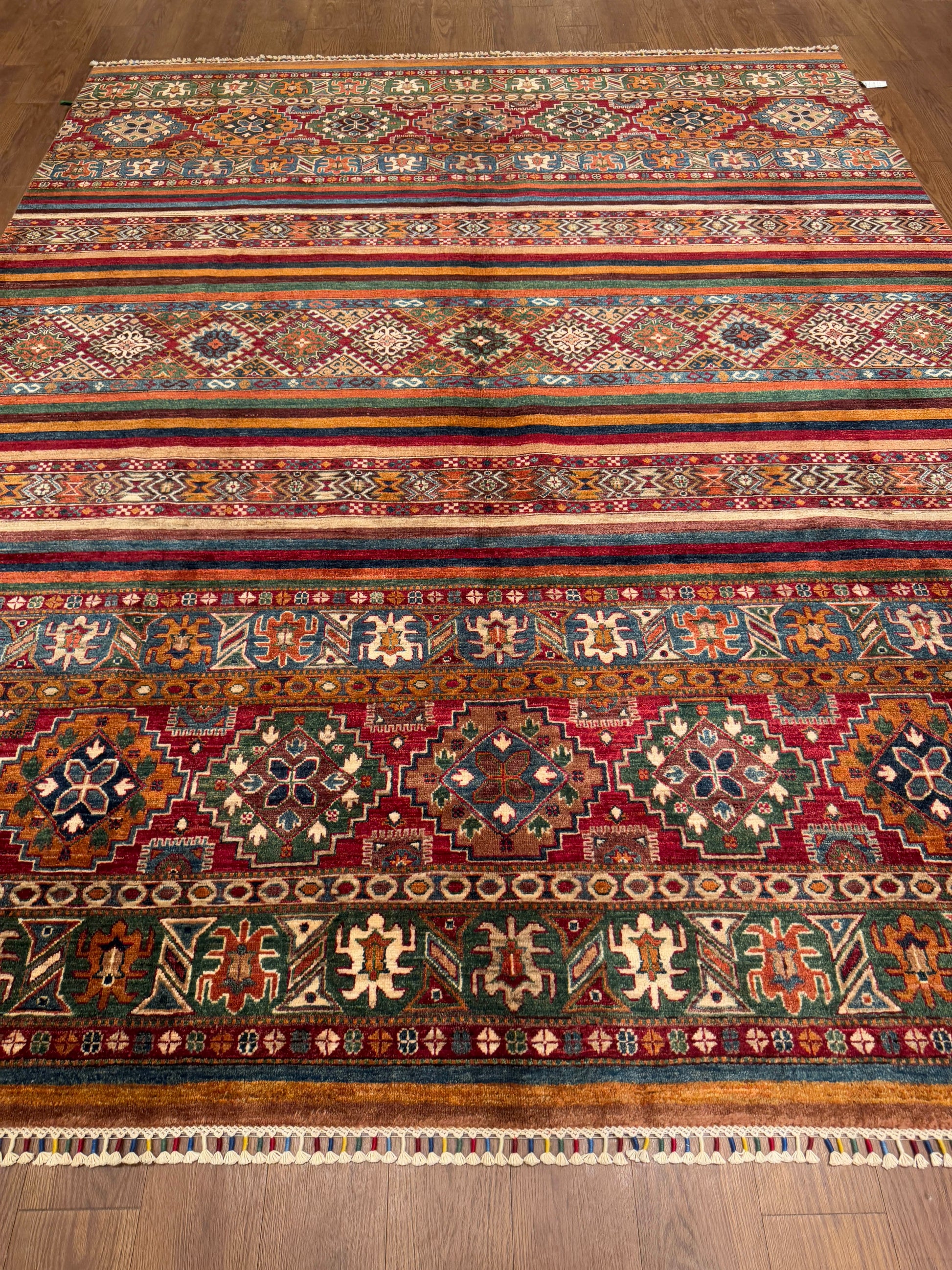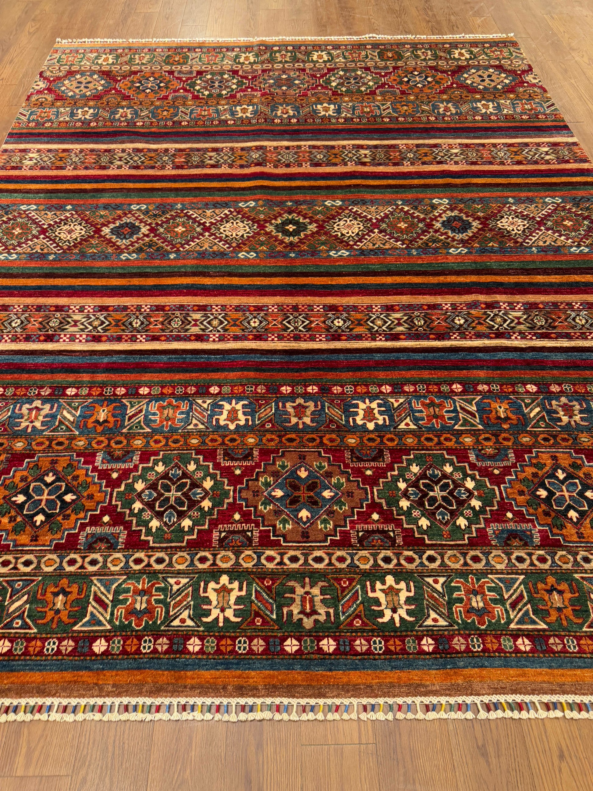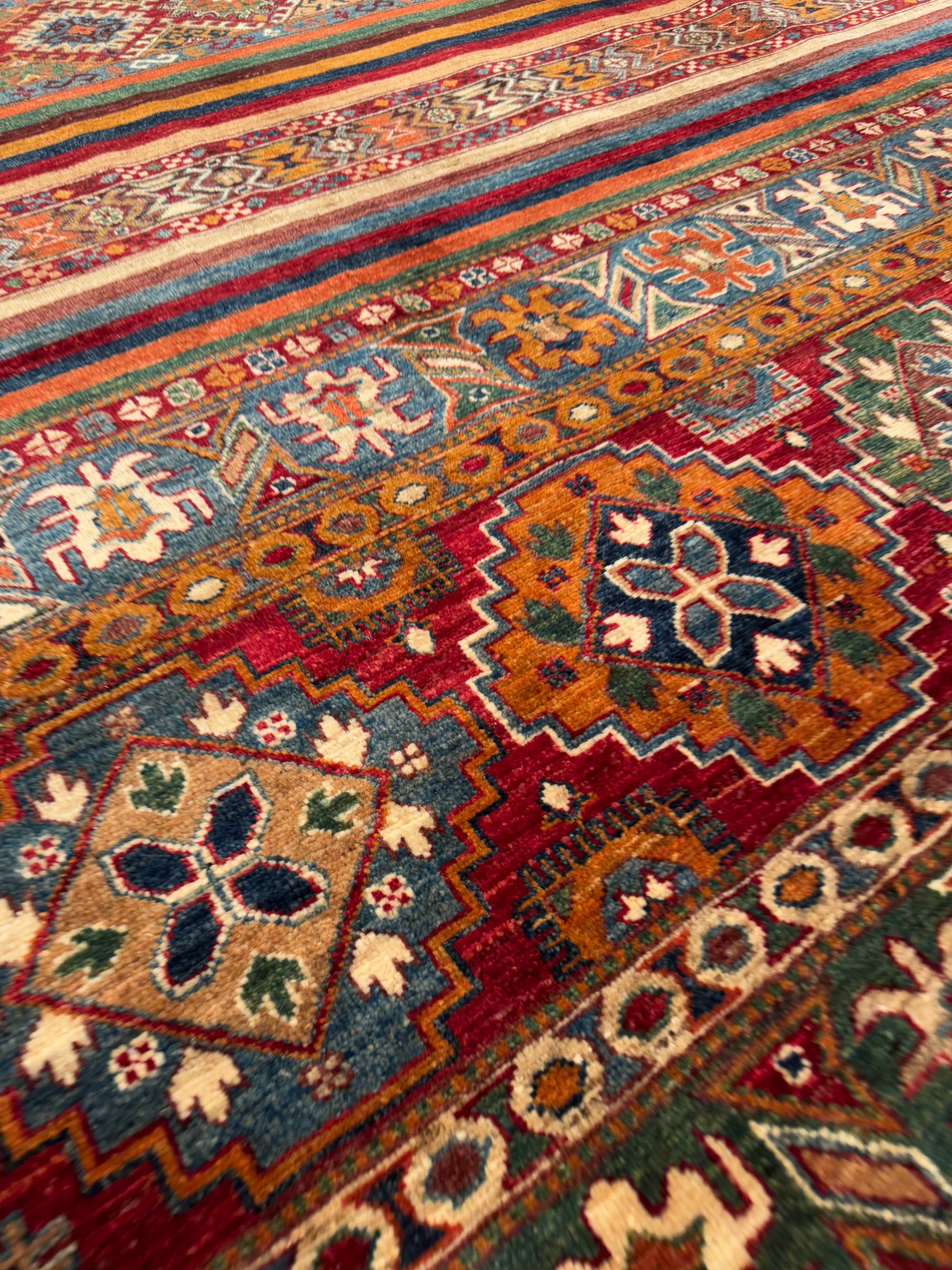 This handmade rug showcases a dynamic series of horizontal bands filled with intricate geometric motifs and tribal-inspired symbols. The blend of earthy reds, deep greens, blues, and golds creates a visually engaging and richly textured composition. Its layered stripe design evokes warmth and craftsmanship, making it a perfect centerpiece for eclectic, bohemian, or rustic interiors.