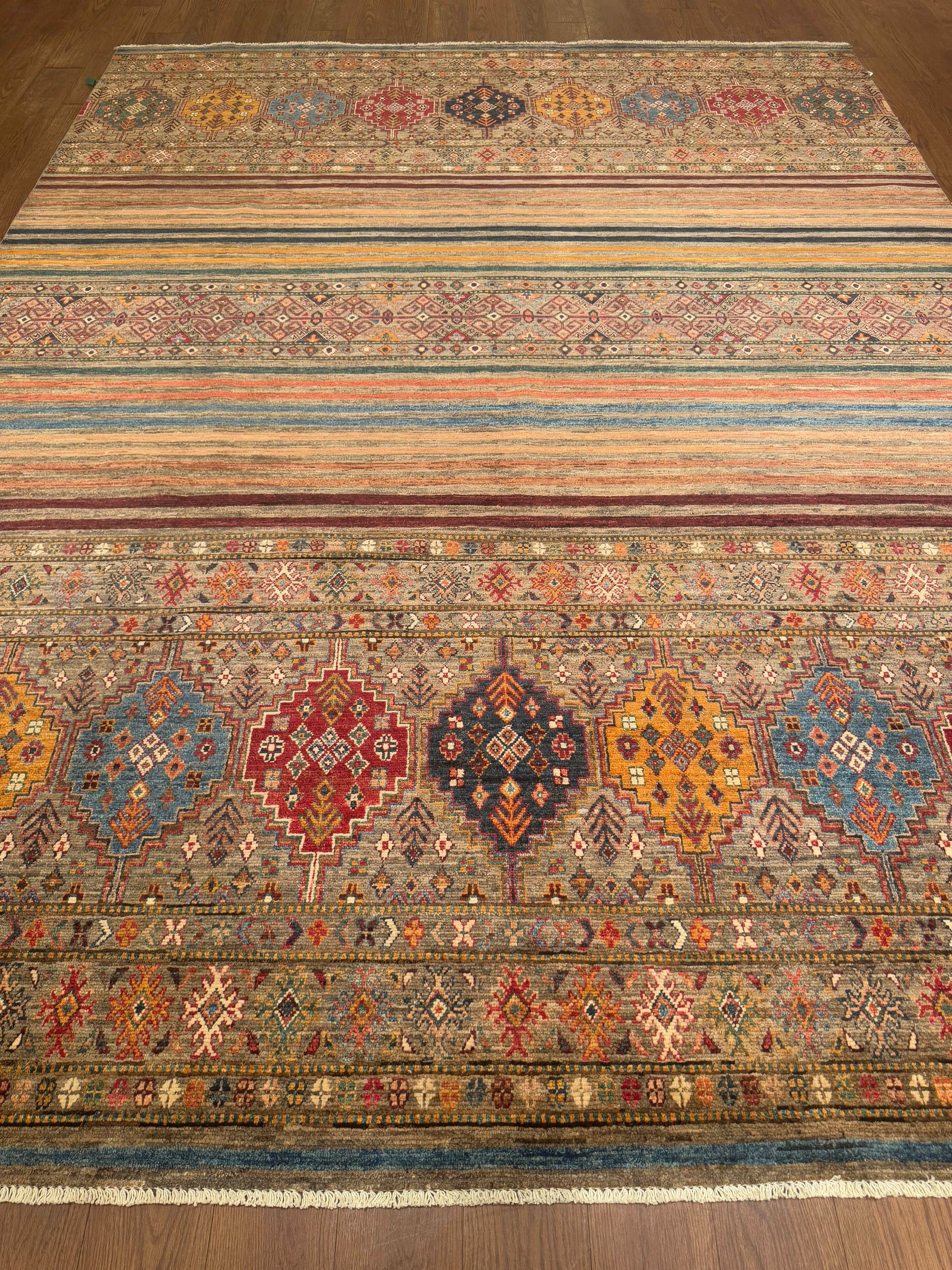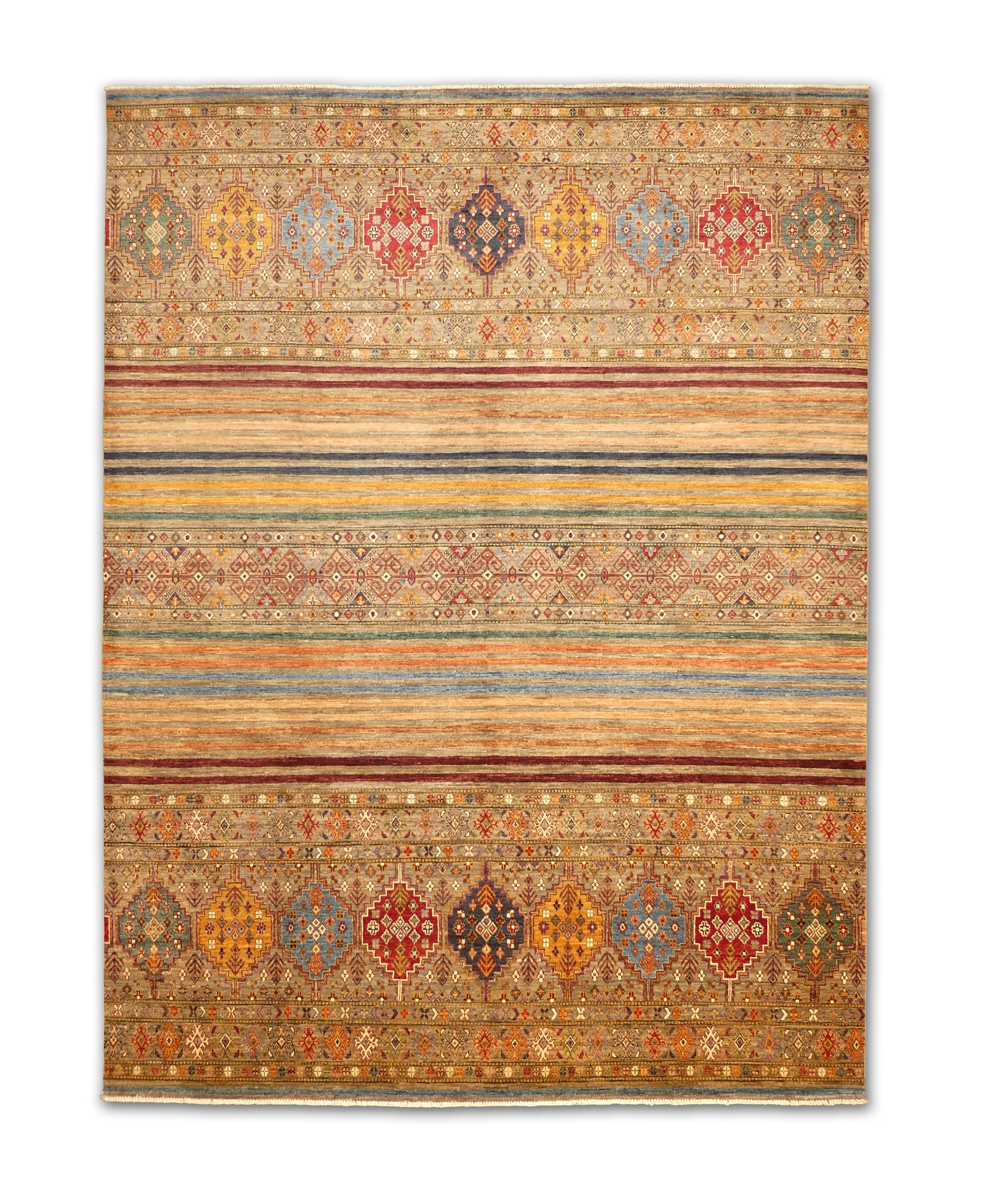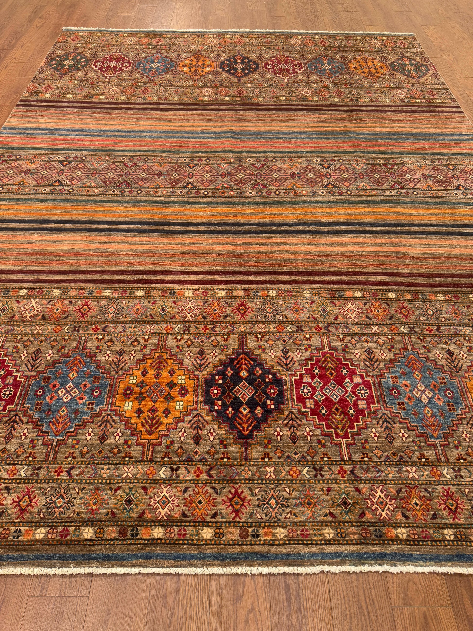 This handwoven rug displays a stunning combination of tribal motifs and horizontal stripe patterns, blending geometric medallions with a rhythmic play of color and texture. Warm earth tones of rust, gold, and brown intertwine with accents of blue and coral, creating a balanced and inviting look. Its artisanal character and vibrant palette make it a perfect statement piece for eclectic, bohemian, or rustic interiors.