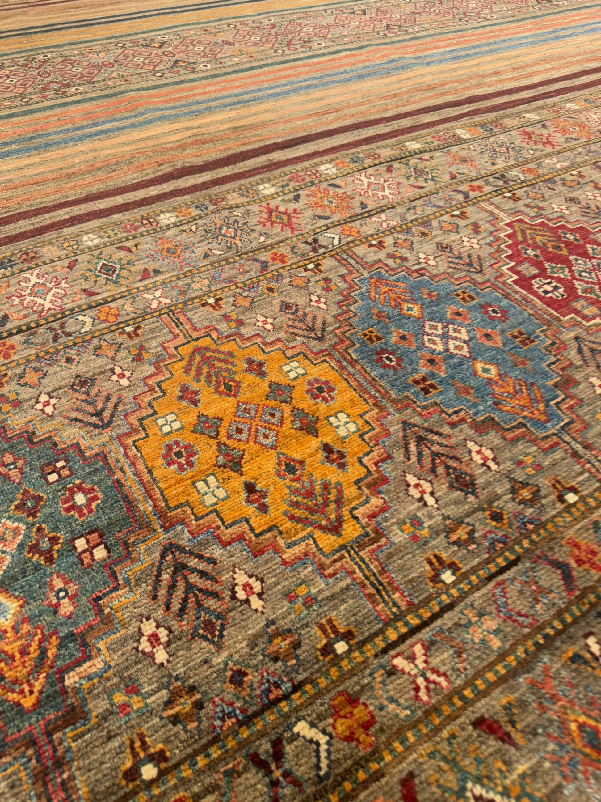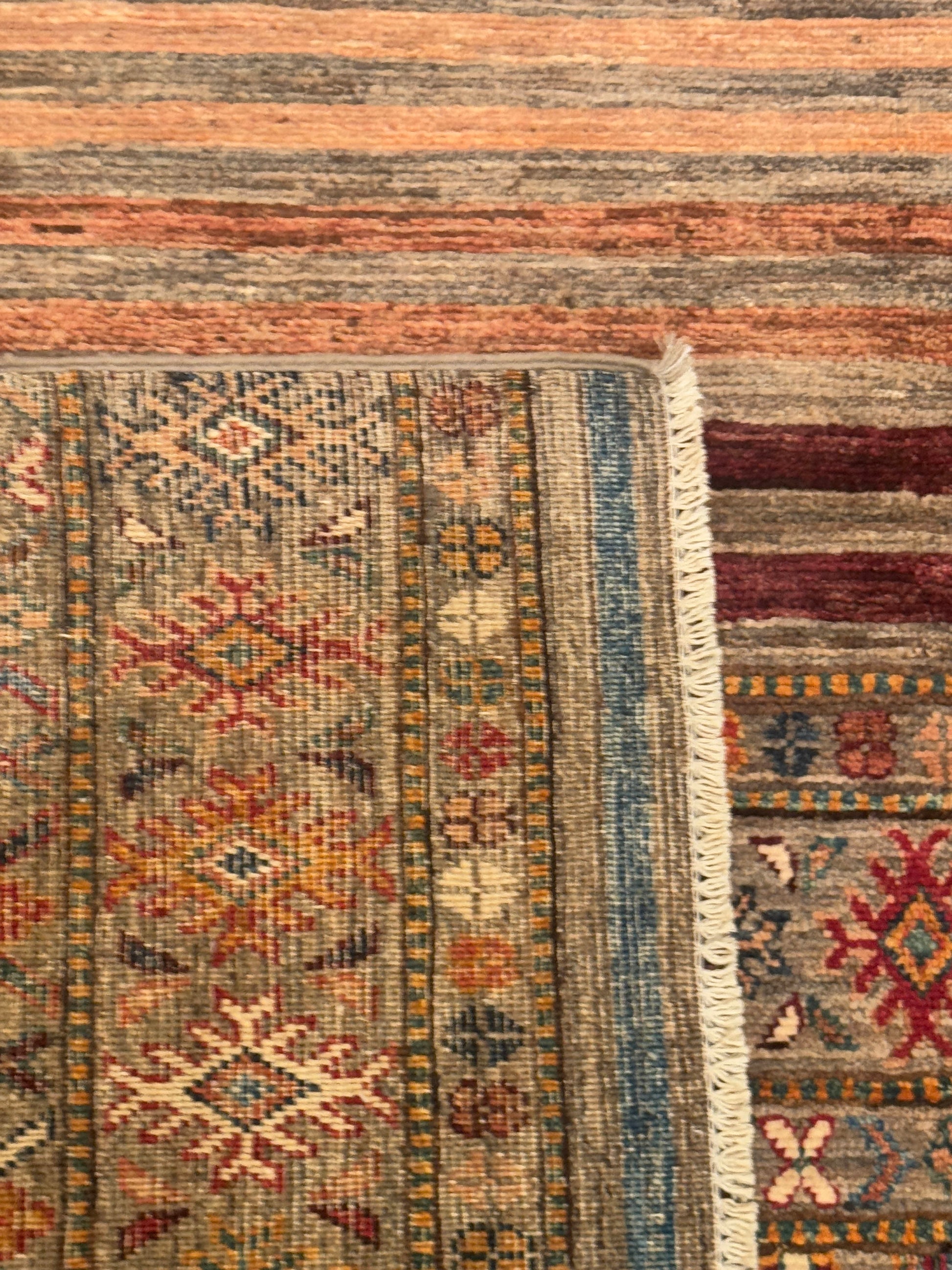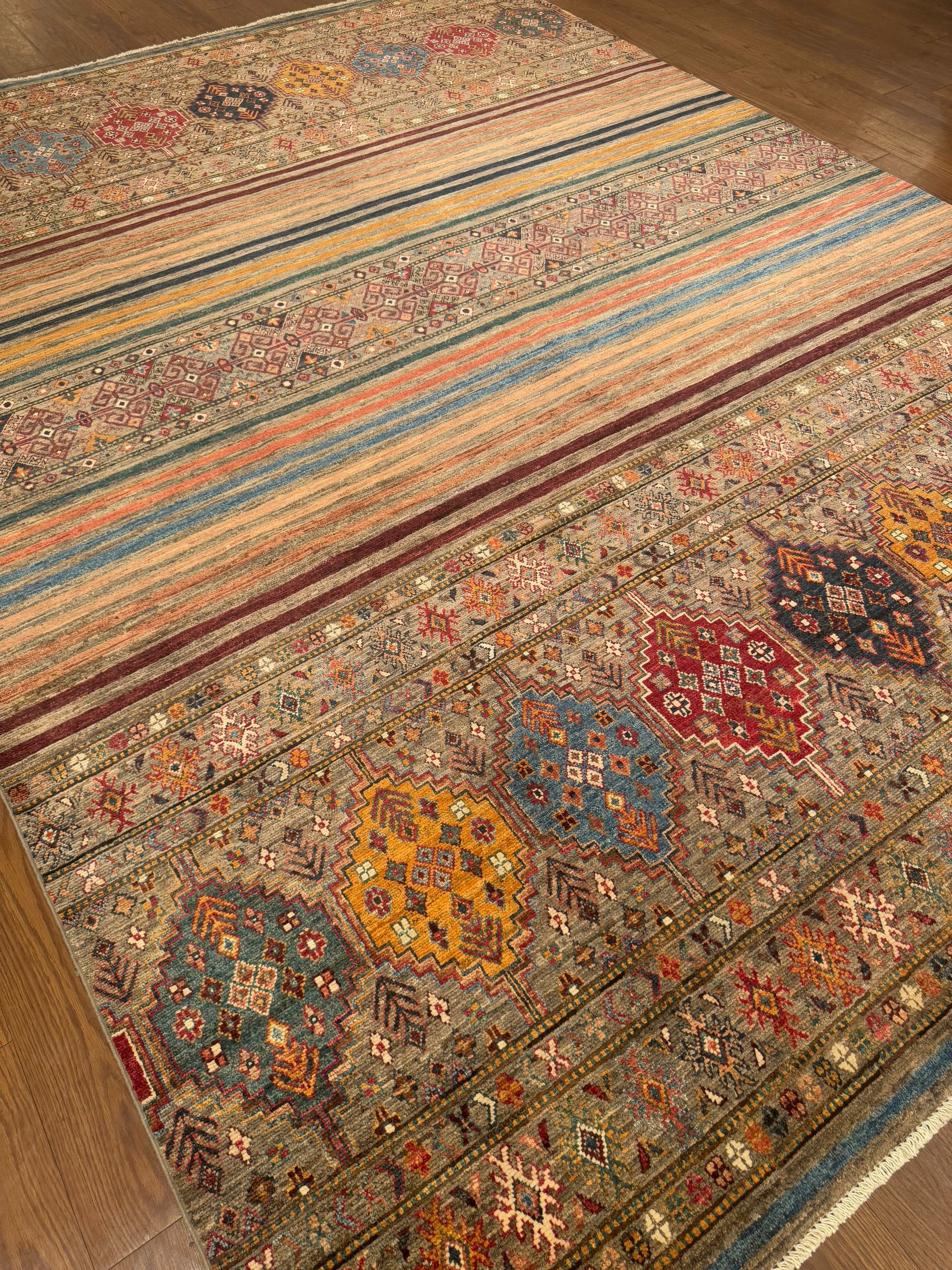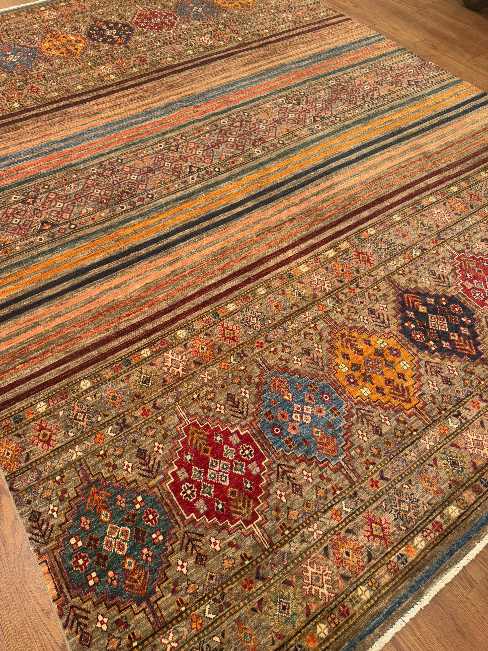This handwoven rug displays a stunning combination of tribal motifs and horizontal stripe patterns, blending geometric medallions with a rhythmic play of color and texture. Warm earth tones of rust, gold, and brown intertwine with accents of blue and coral, creating a balanced and inviting look. Its artisanal character and vibrant palette make it a perfect statement piece for eclectic, bohemian, or rustic interiors.