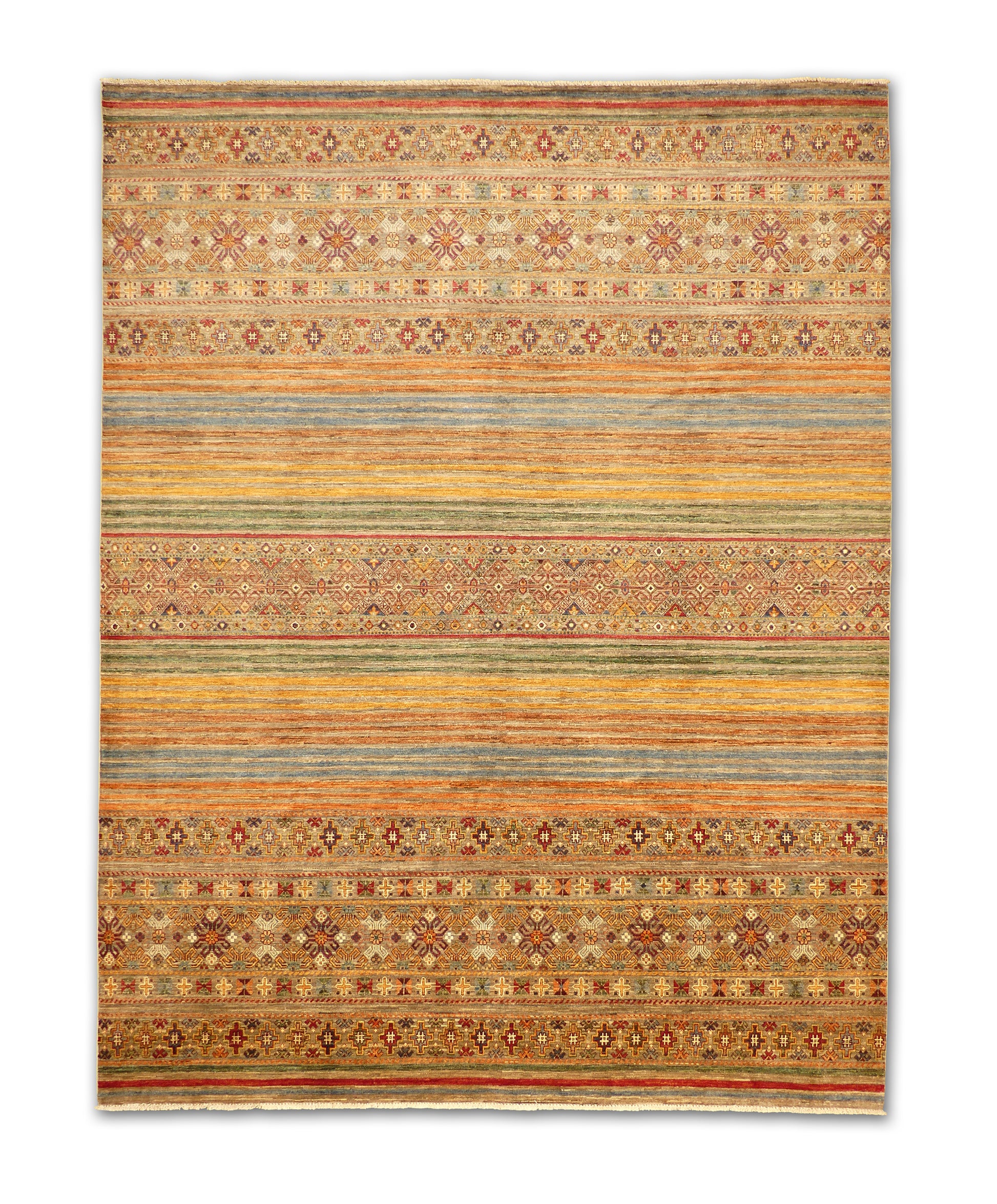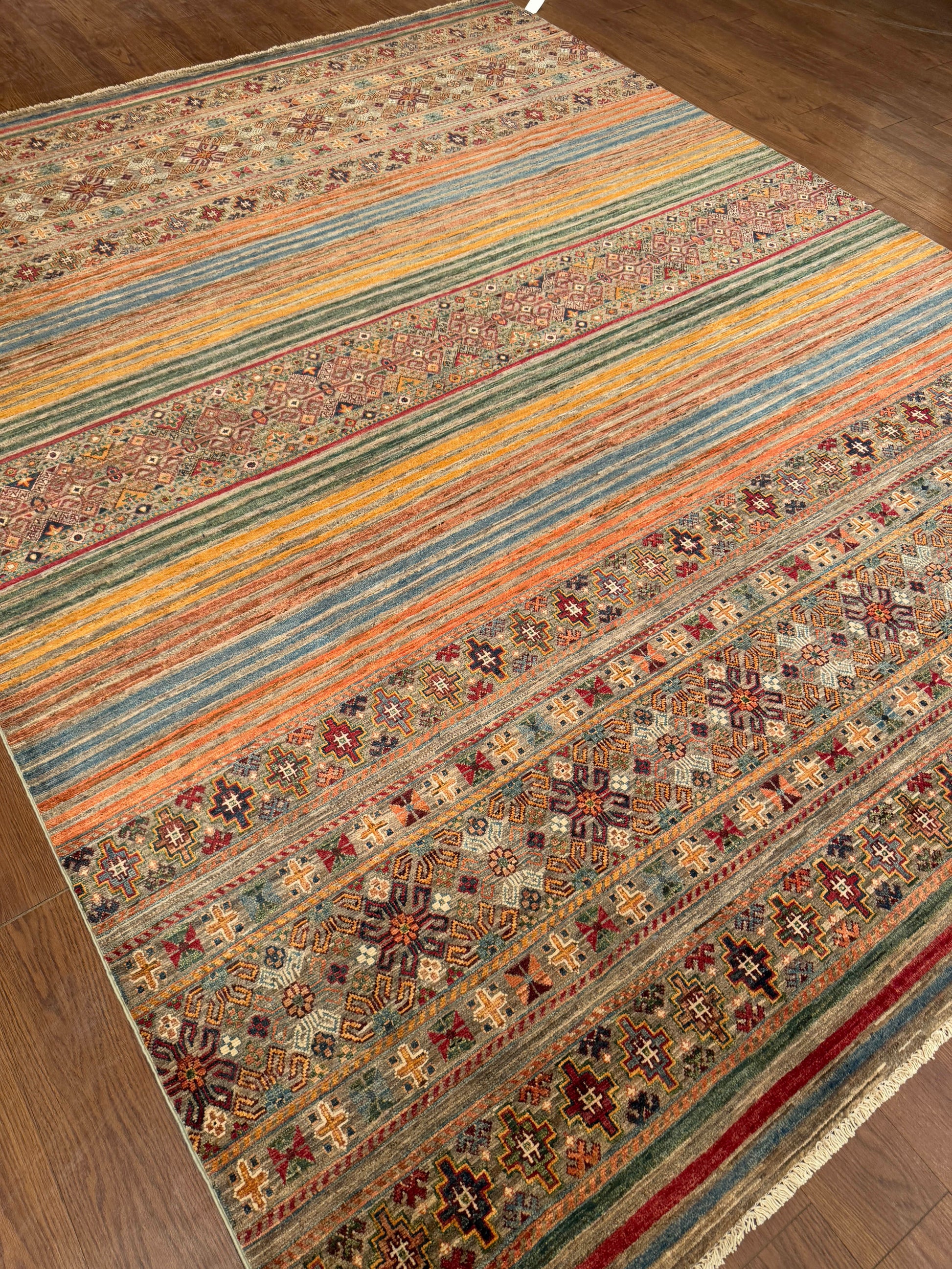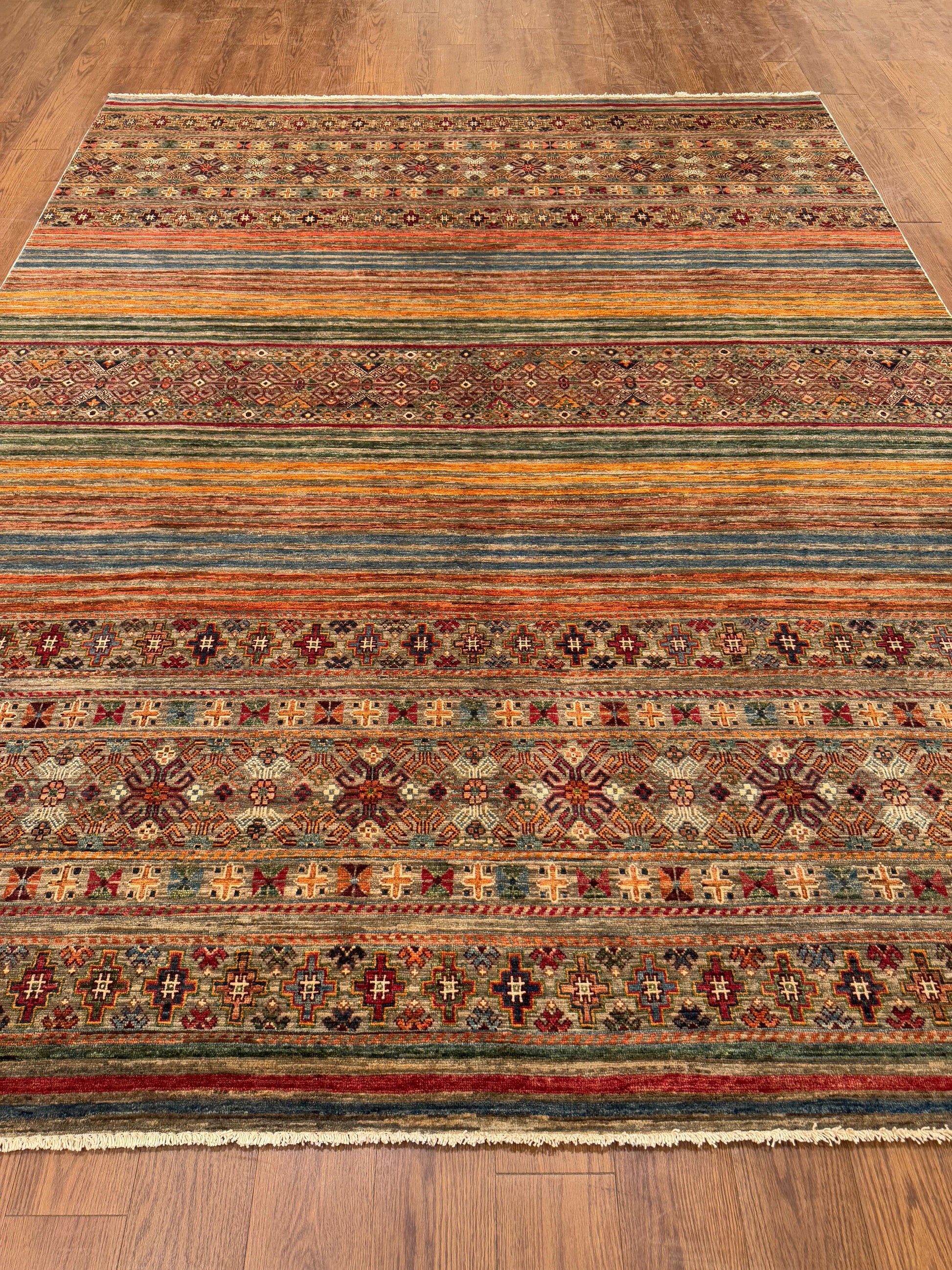 This handmade rug features a captivating blend of horizontal bands filled with geometric motifs and tribal-inspired patterns. The earthy palette of terracotta, olive, gold, and soft blue tones creates a warm and inviting aesthetic that radiates character and depth. Its intricate symmetry and textural richness make it a versatile foundation piece for eclectic or bohemian interiors.